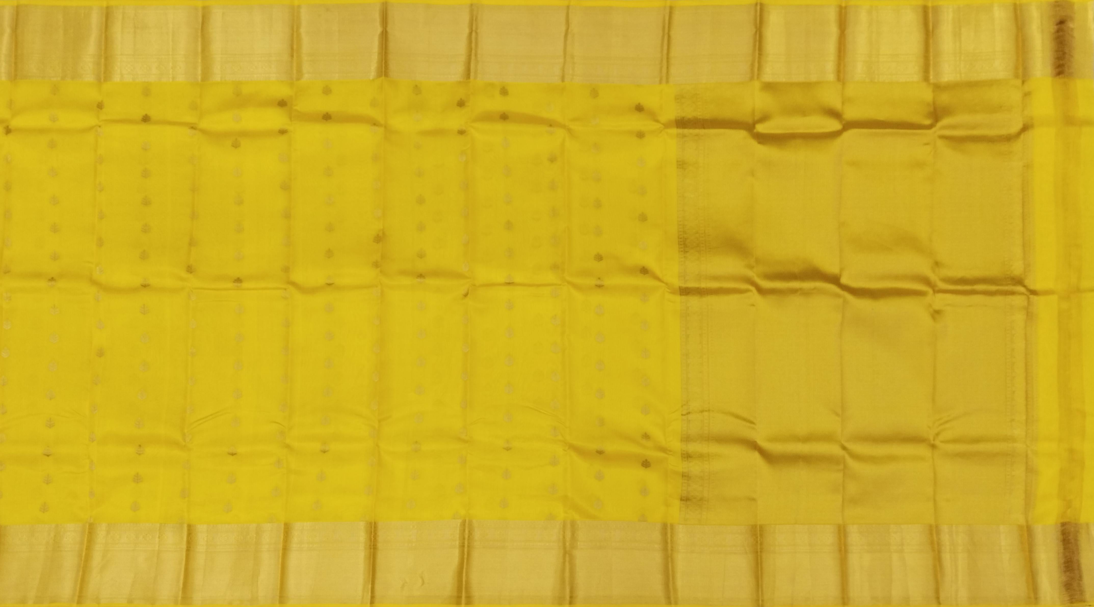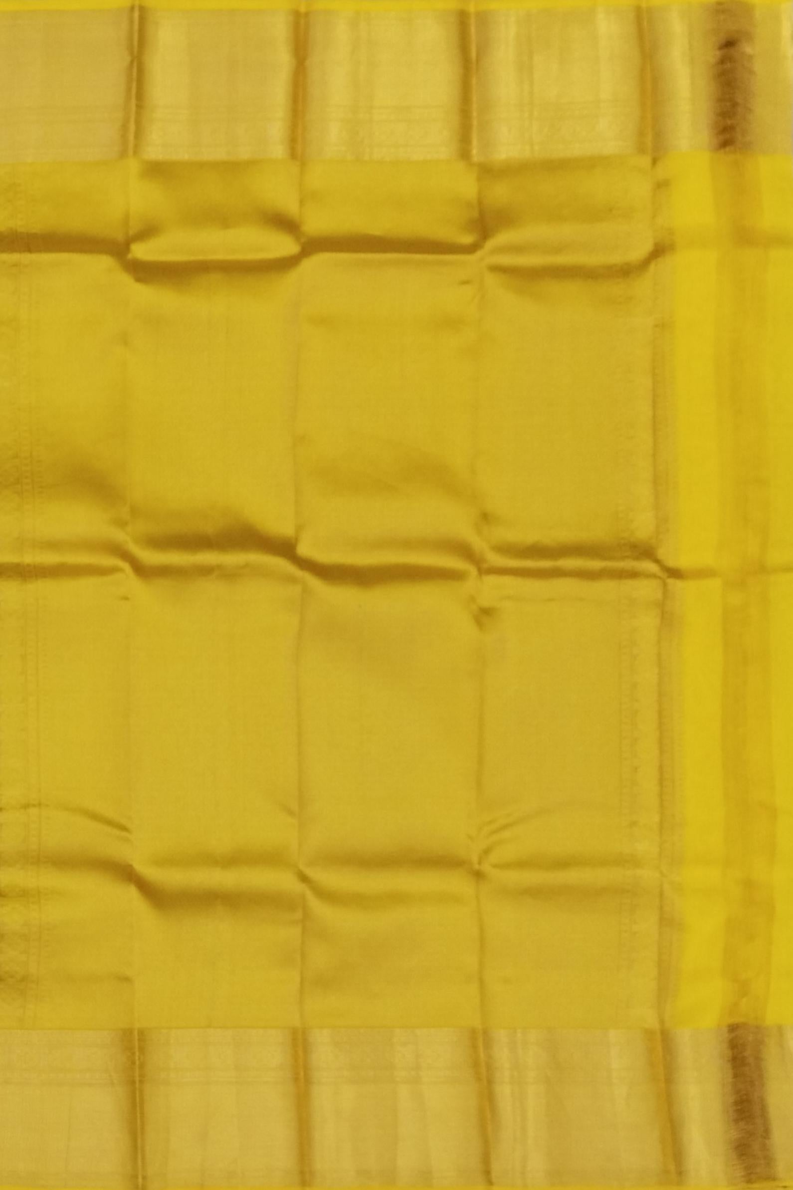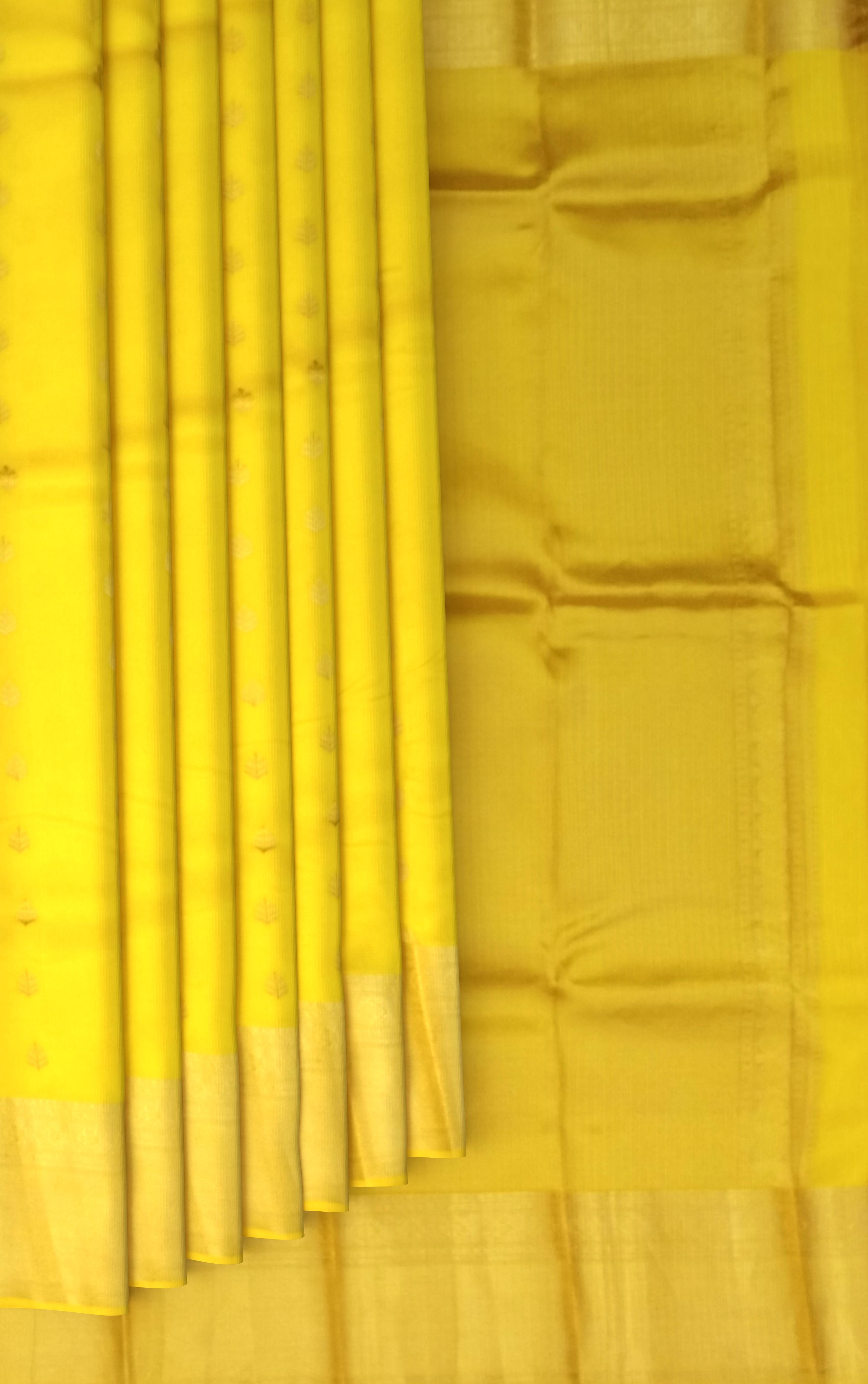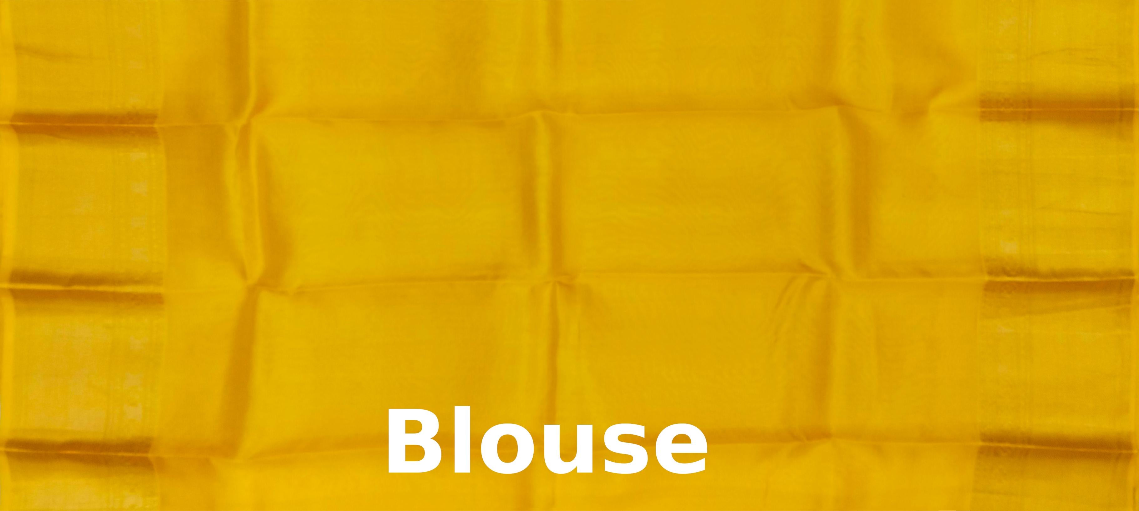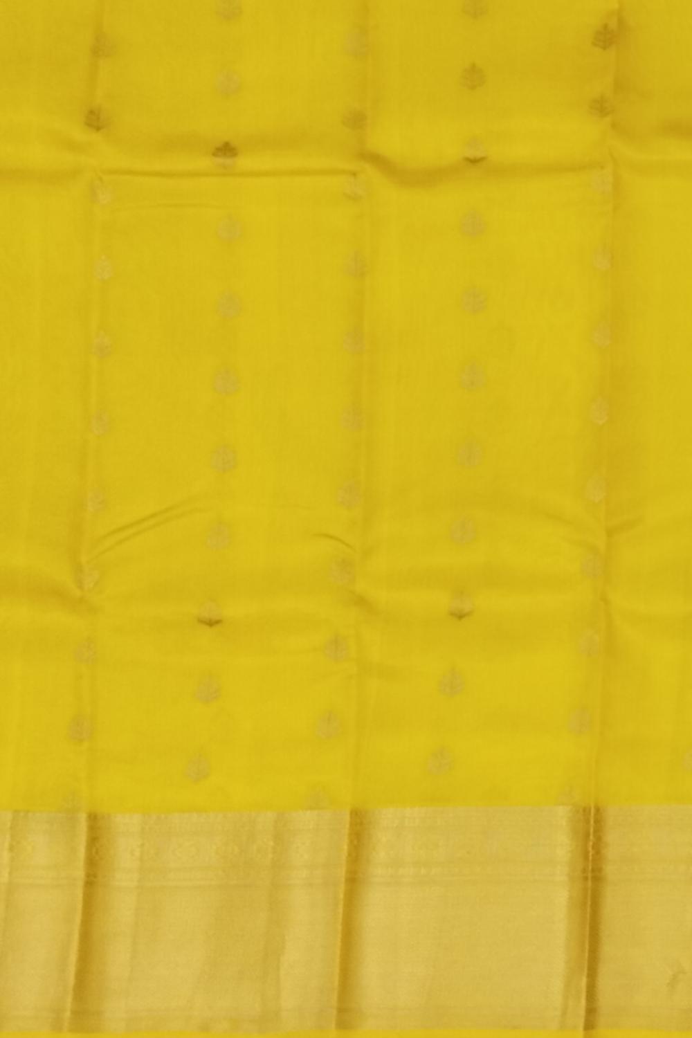 Radiate a golden glow with this Luminous Mango Yellow Kanchipuram Silk Saree, gracefully adorned with delicate small bhuttas. The vibrant mango yellow body of the saree embodies joy and festivity, while the tiny, meticulously woven bhuttas add a subtle texture and shimmer. This saree is a celebration of cheerful hues and refined craftsmanship, perfect for illuminating any occasion.