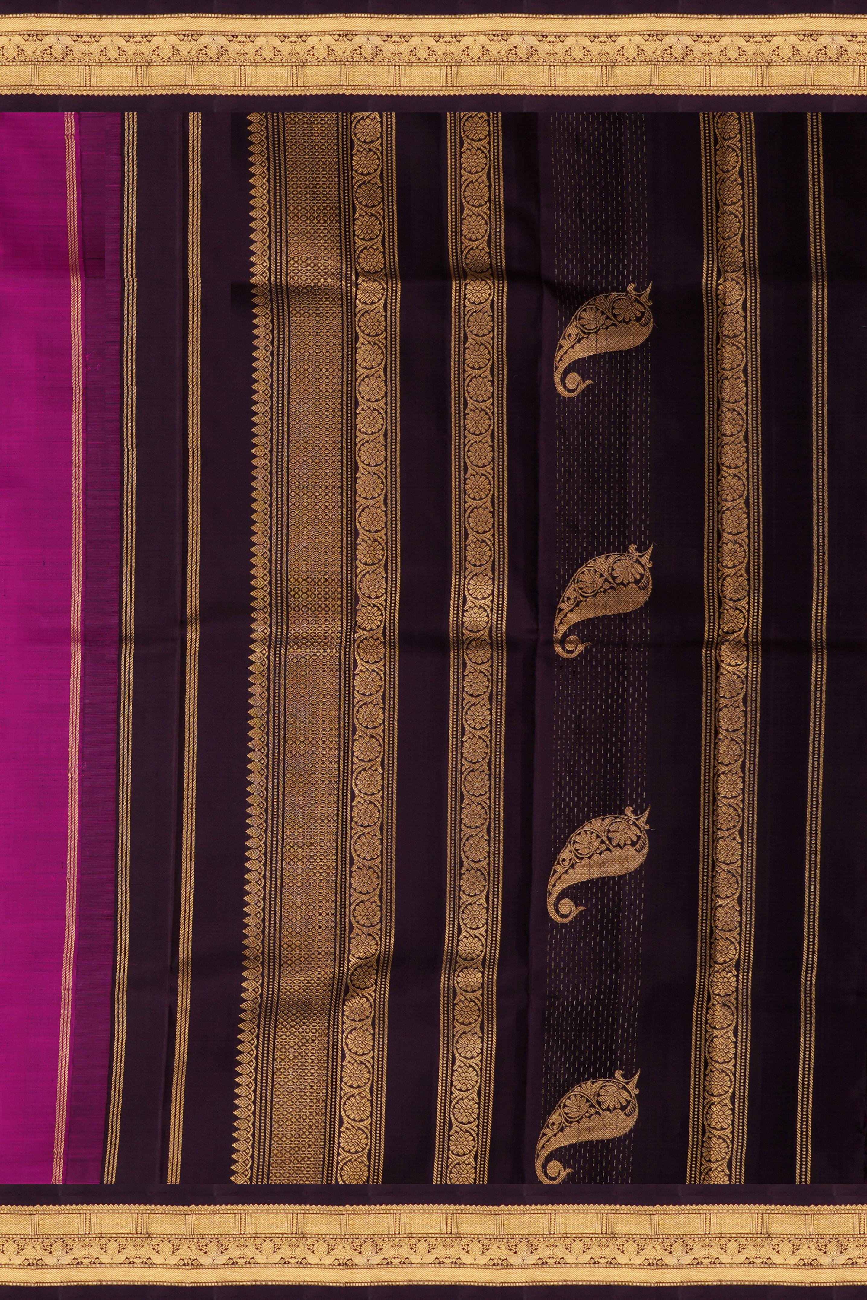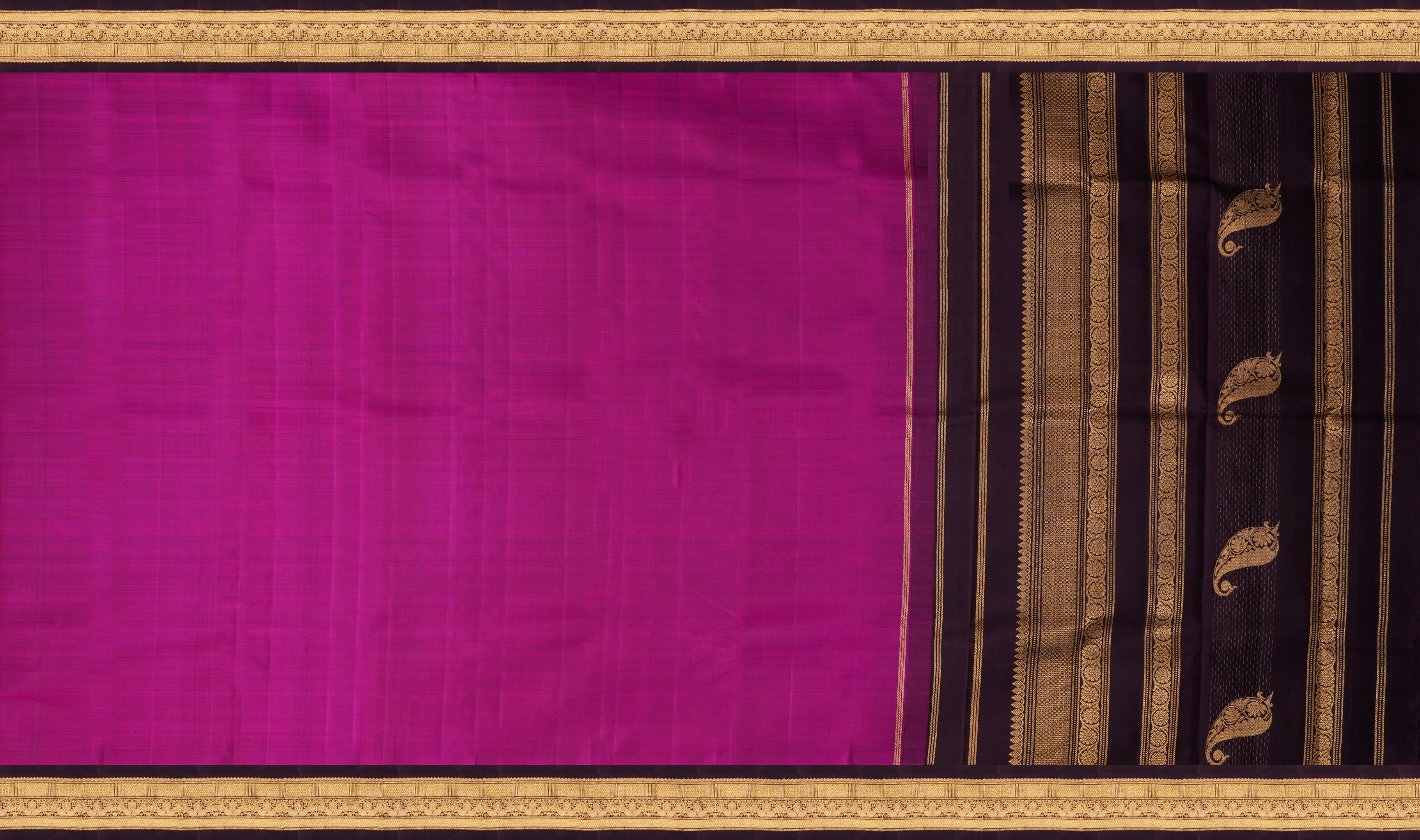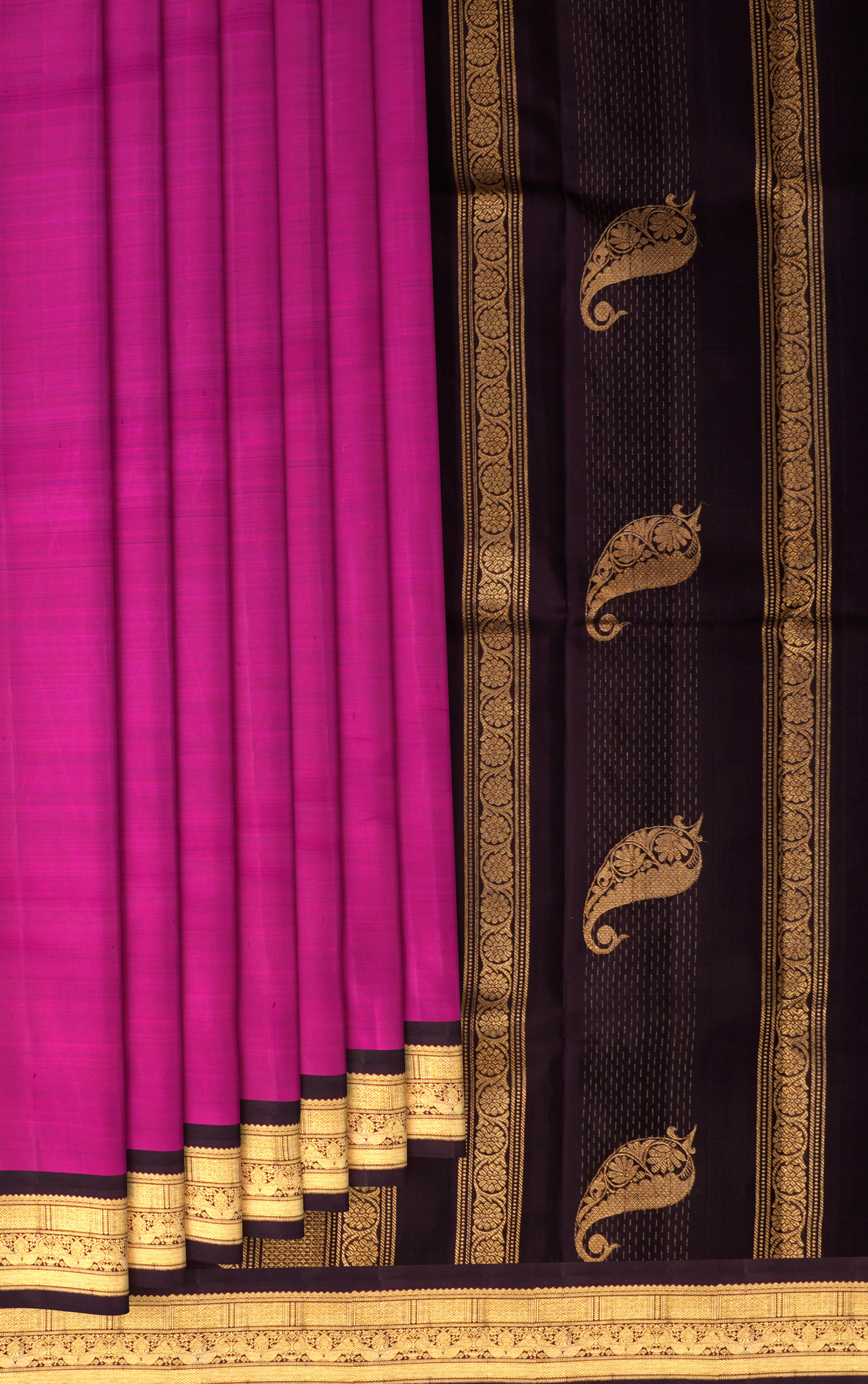 The contrast between the magenta body and the brown border creates a visually interesting and dynamic effect. Kanchipuram sarees, renowned for their quality and durability, have been cherished by generations for their elegance and timeless appeal. The intricate weaving techniques, passed down through generations, ensure that each saree is a unique work of art.