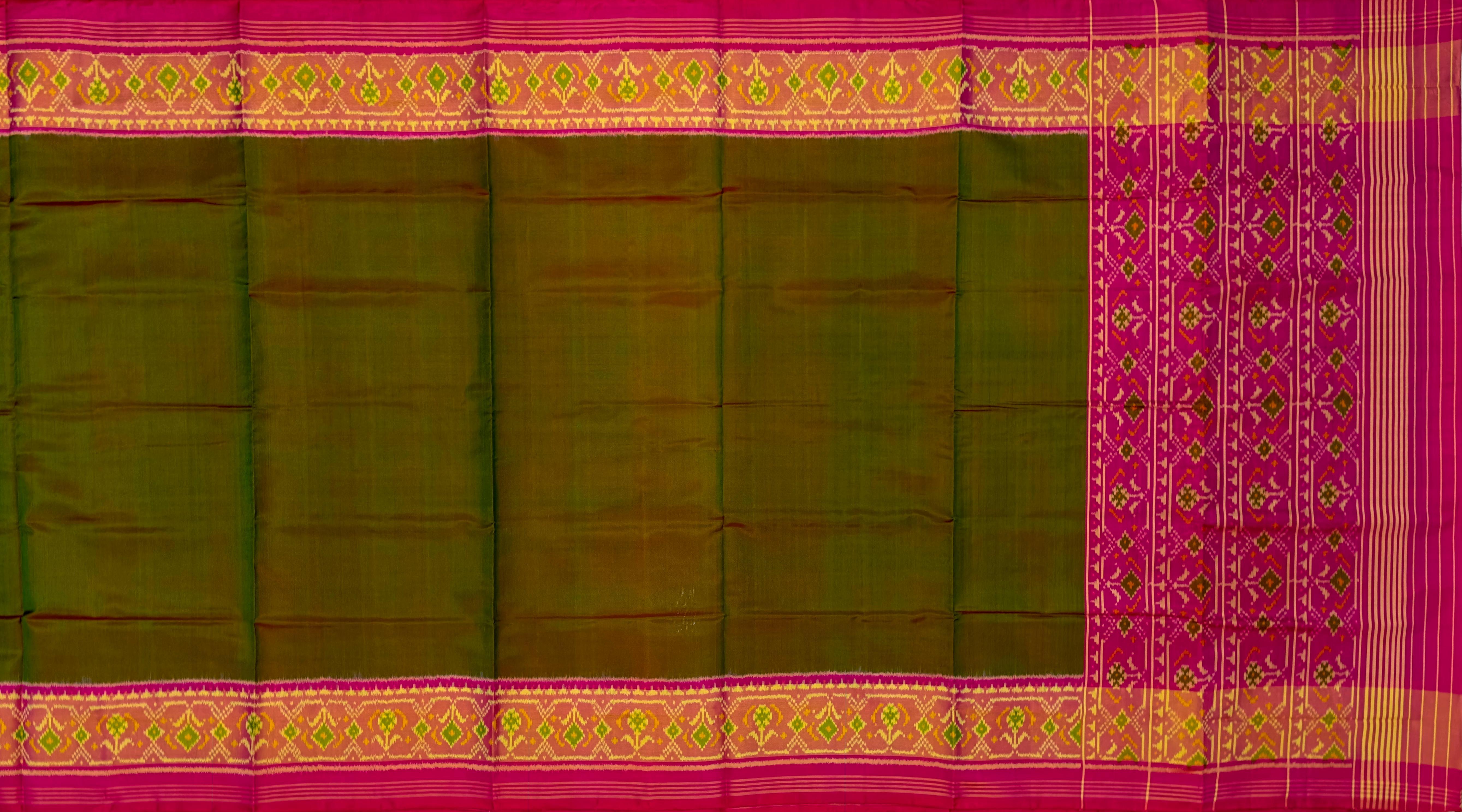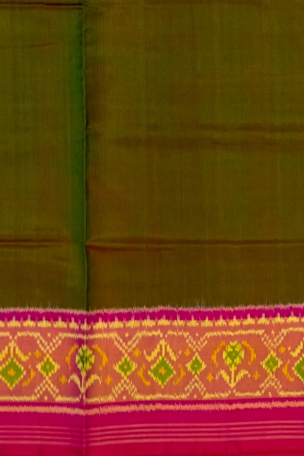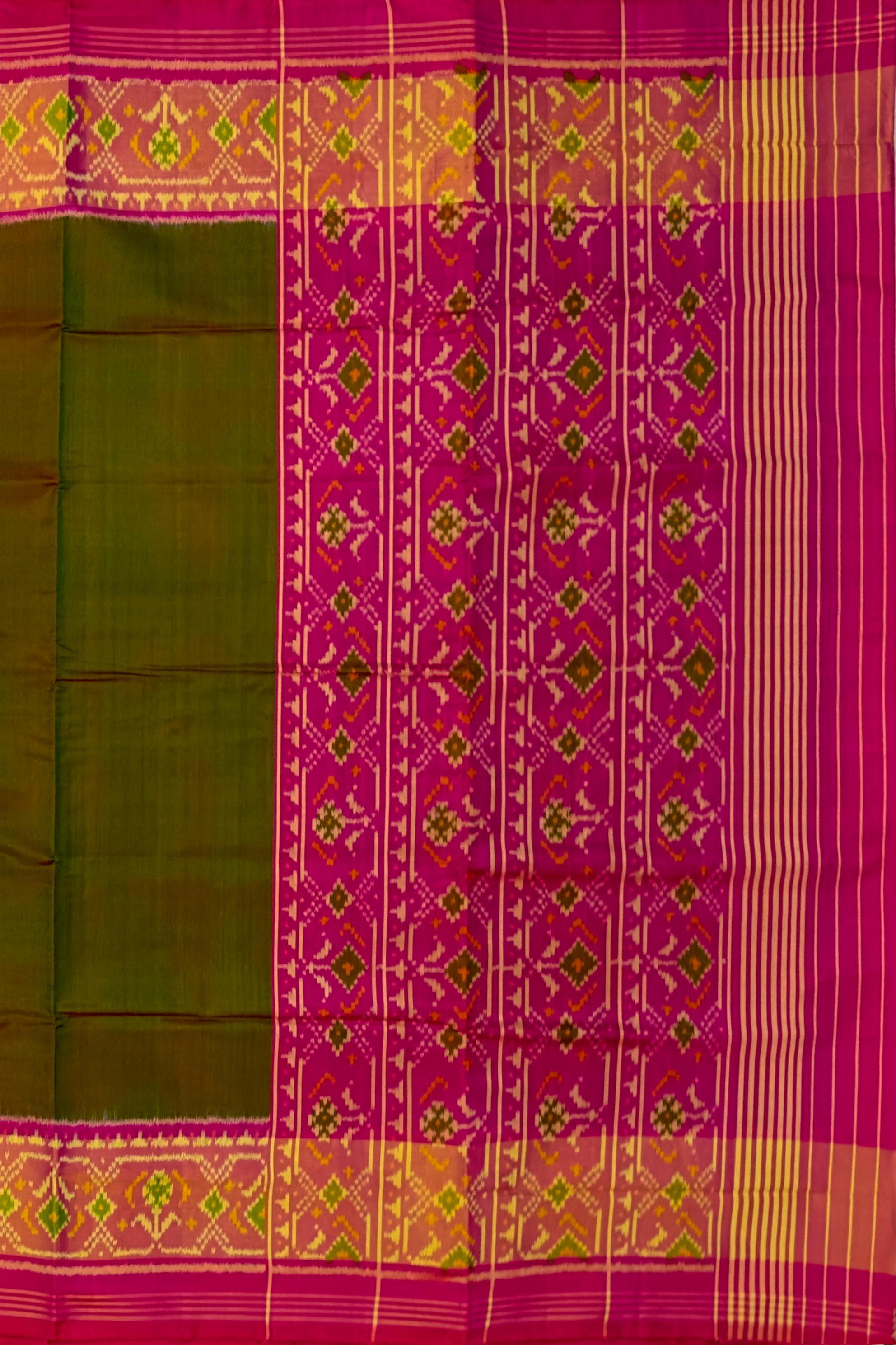 Immerse yourself in the beauty of traditional Indian textiles with the Mahendi Green Galo Border Pallu Pink Ghughro Design Single Ikat Rajkot Patola Saree. The soothing Mahendi green base, paired with the vibrant pink Ghughro design on the border and pallu, creates a stunning contrast that is both elegant and eye-catching.