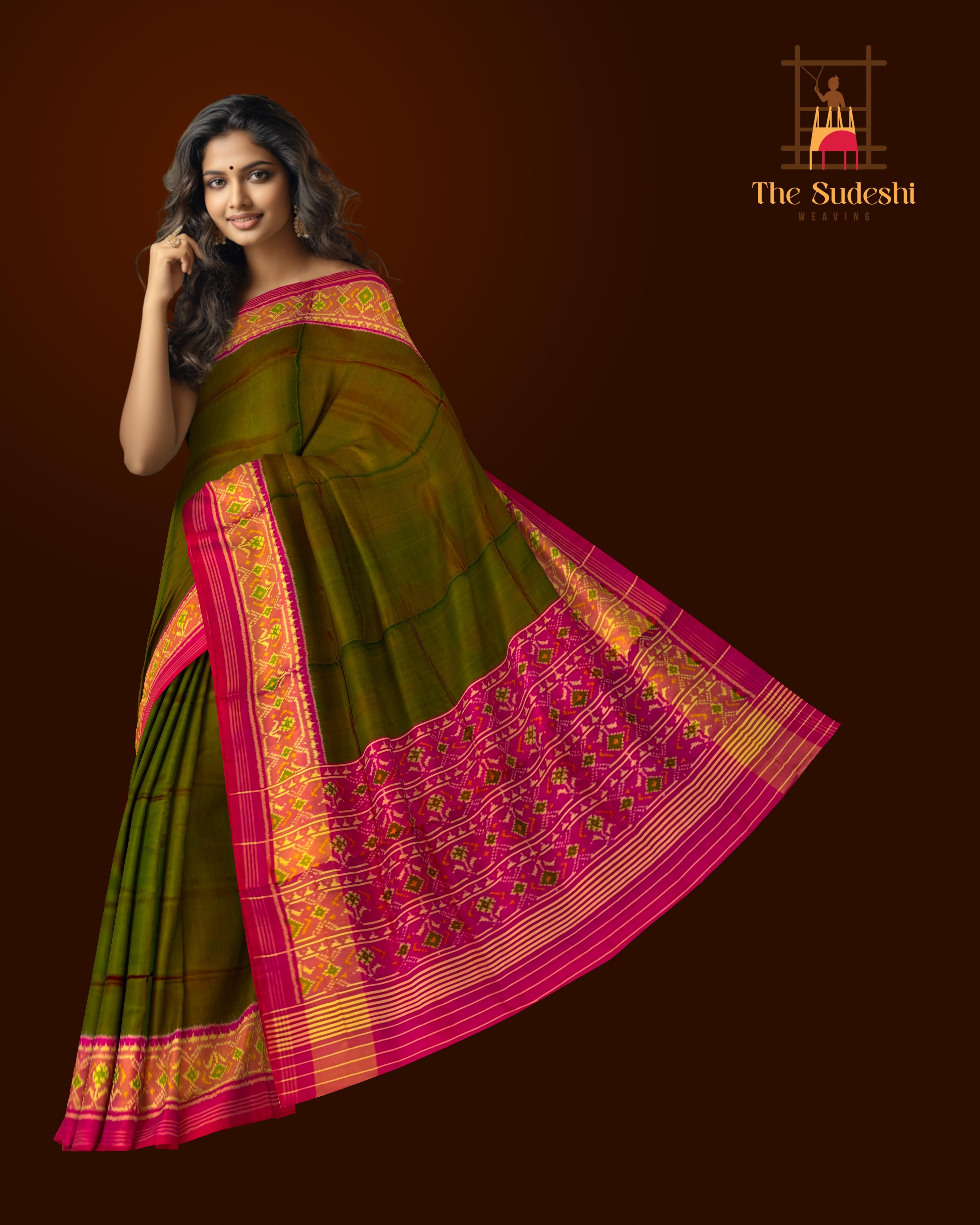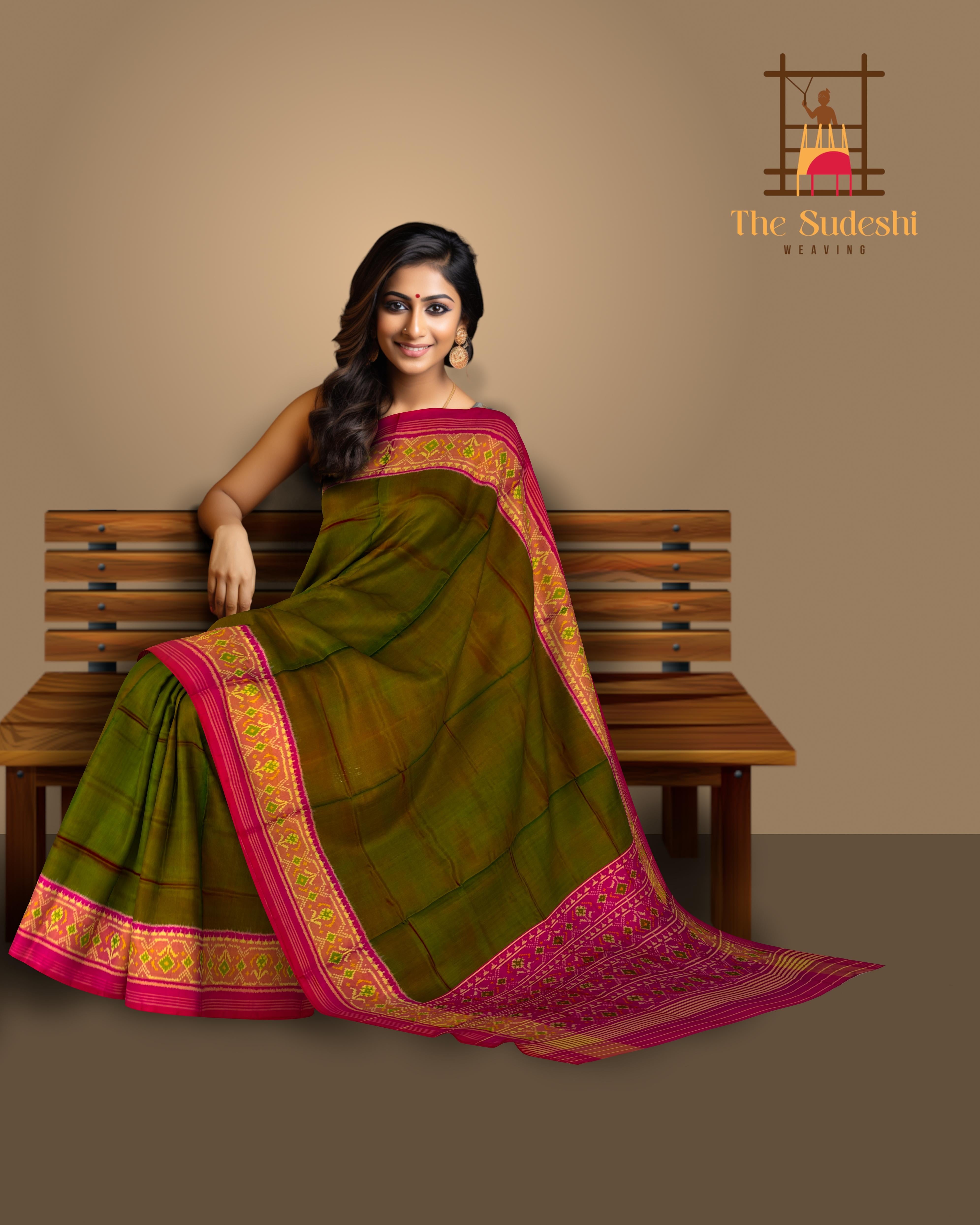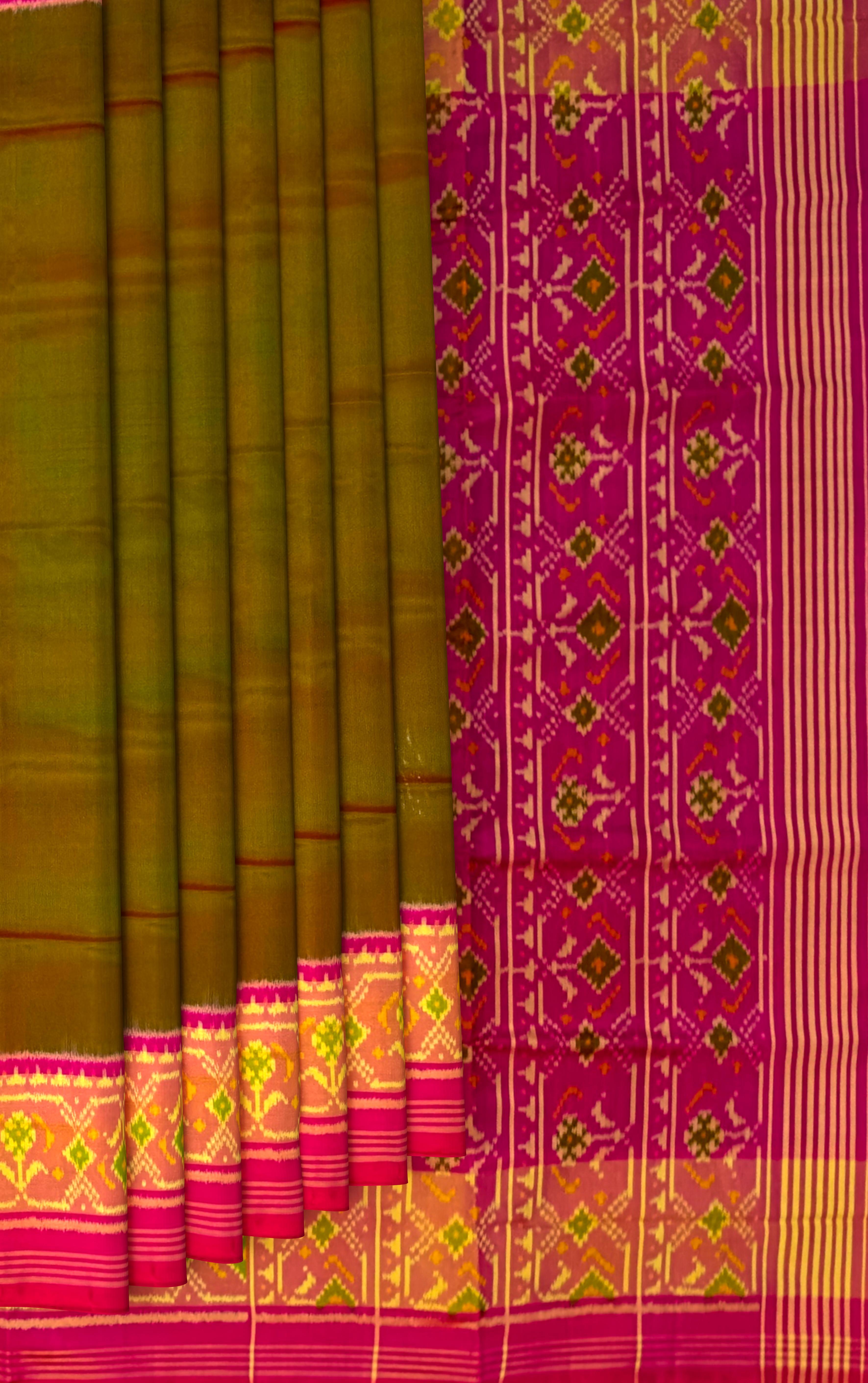 Immerse yourself in the beauty of traditional Indian textiles with the Mahendi Green Galo Border Pallu Pink Ghughro Design Single Ikat Rajkot Patola Saree. The soothing Mahendi green base, paired with the vibrant pink Ghughro design on the border and pallu, creates a stunning contrast that is both elegant and eye-catching.