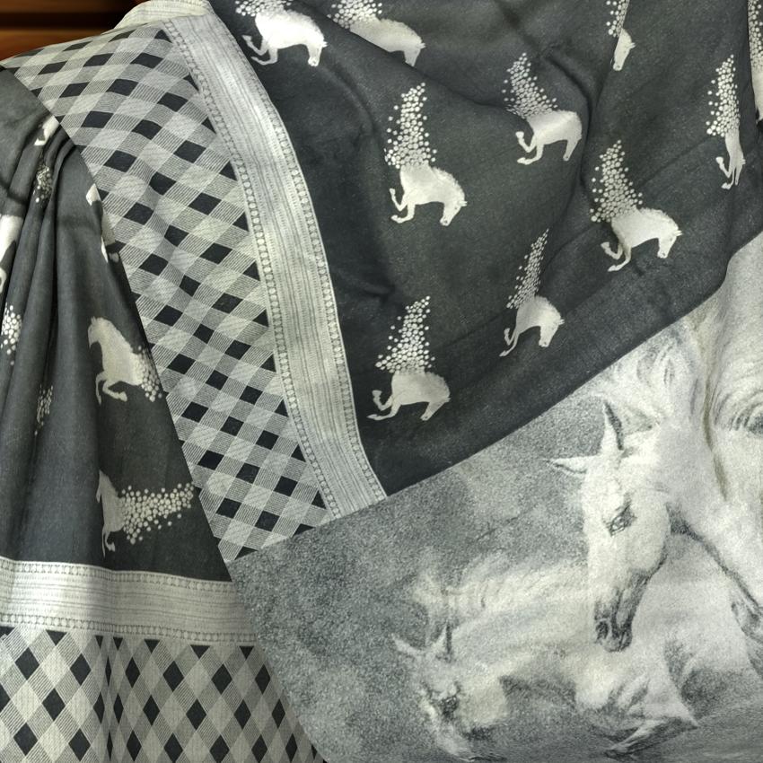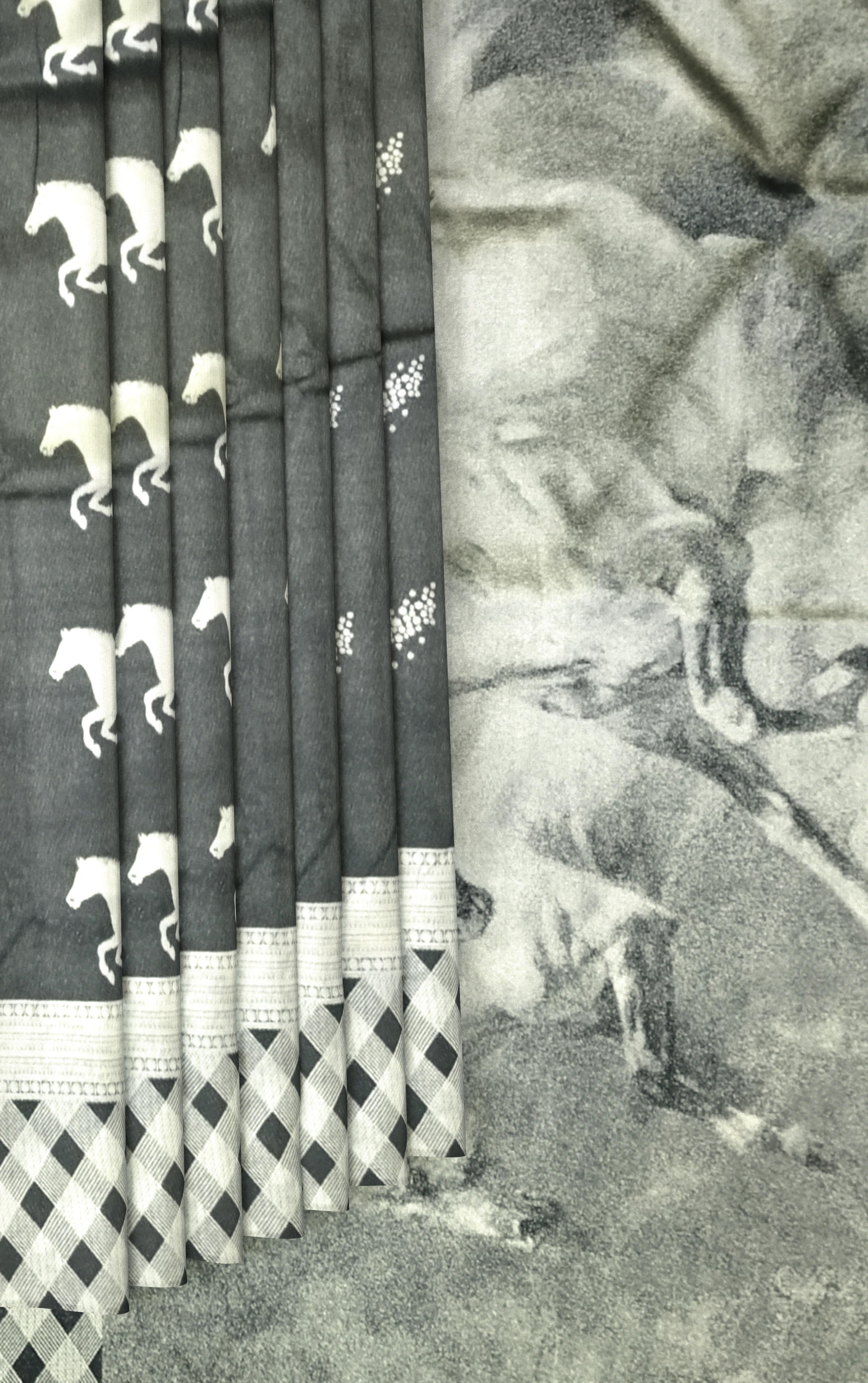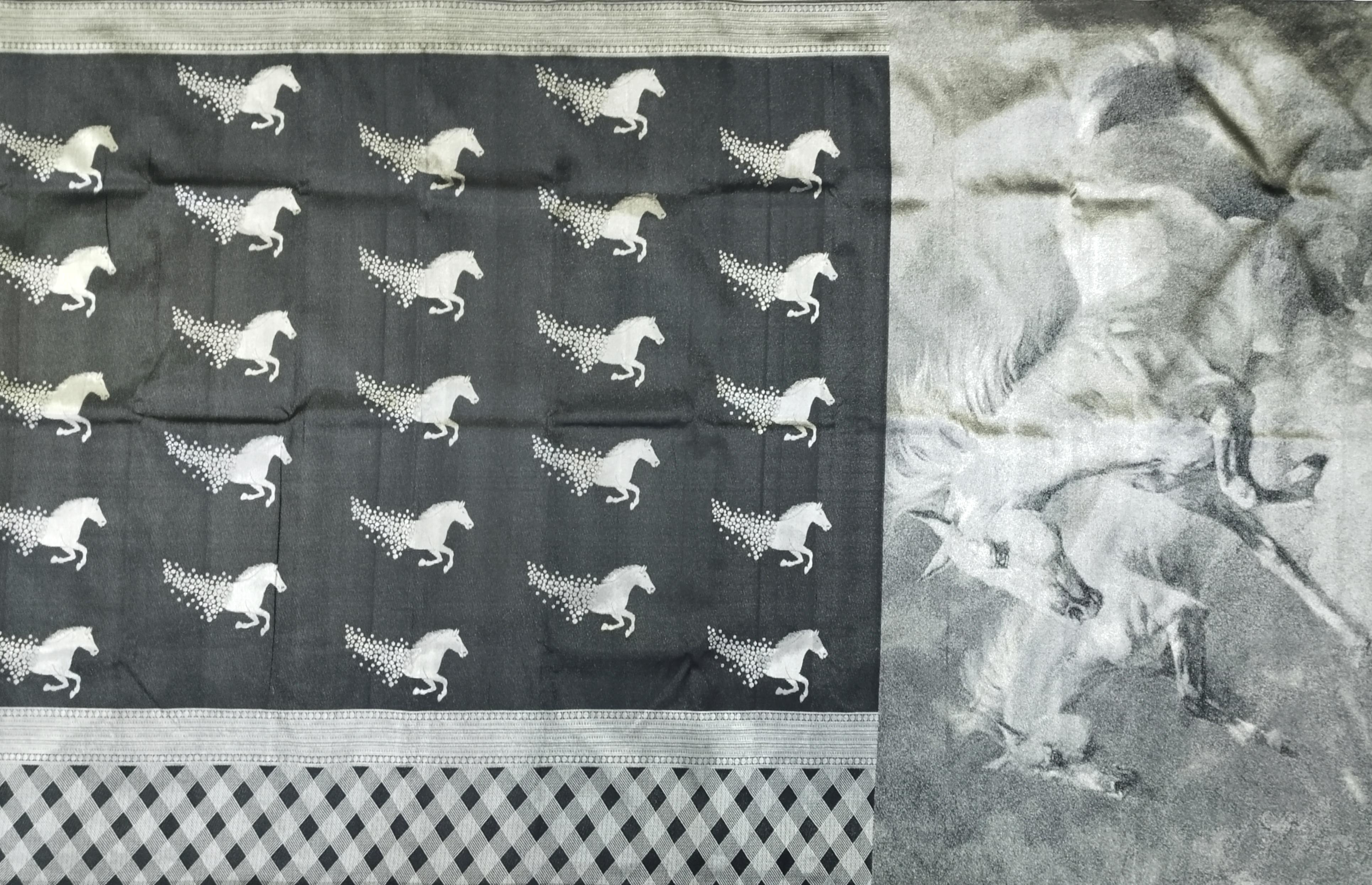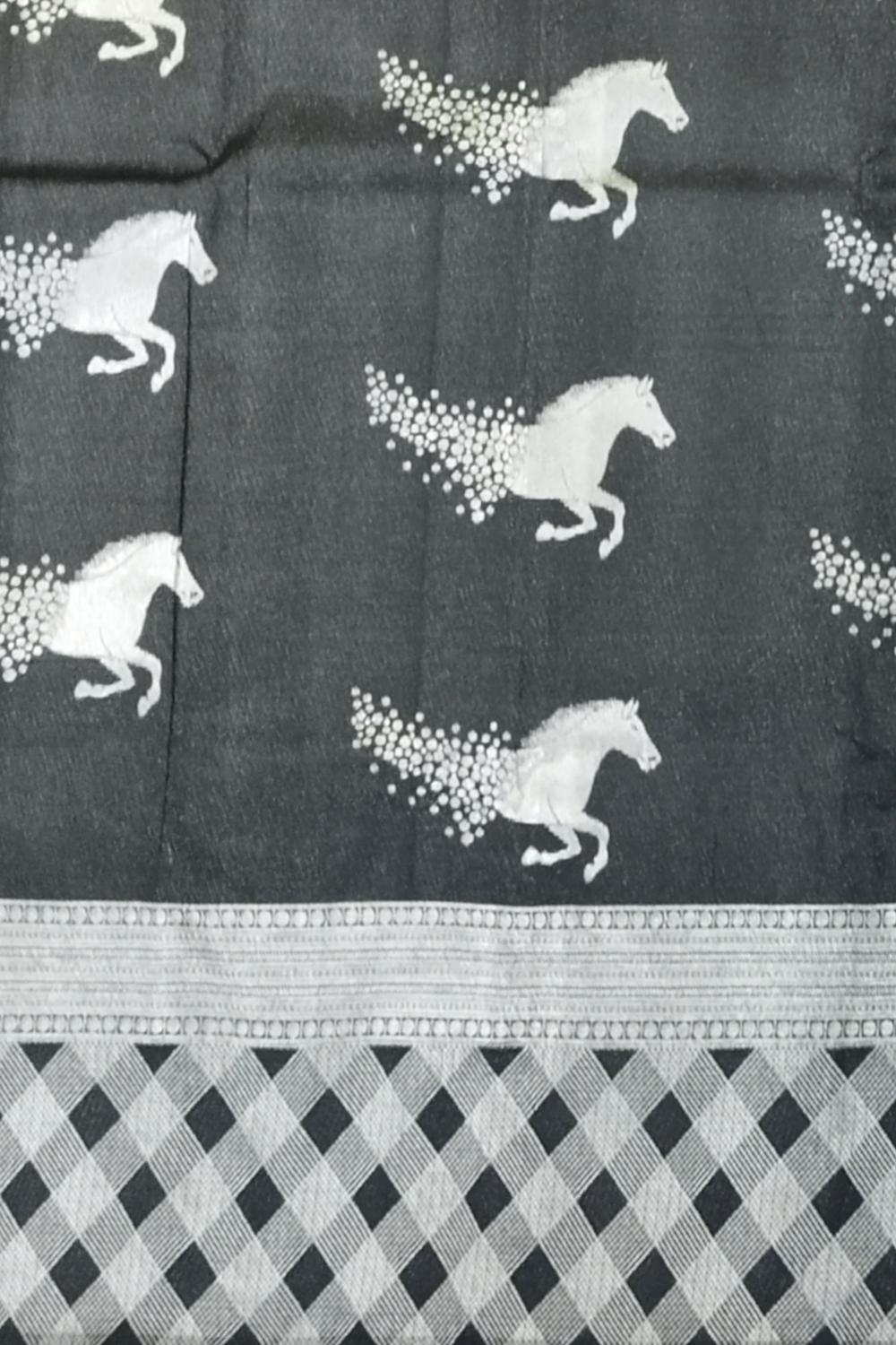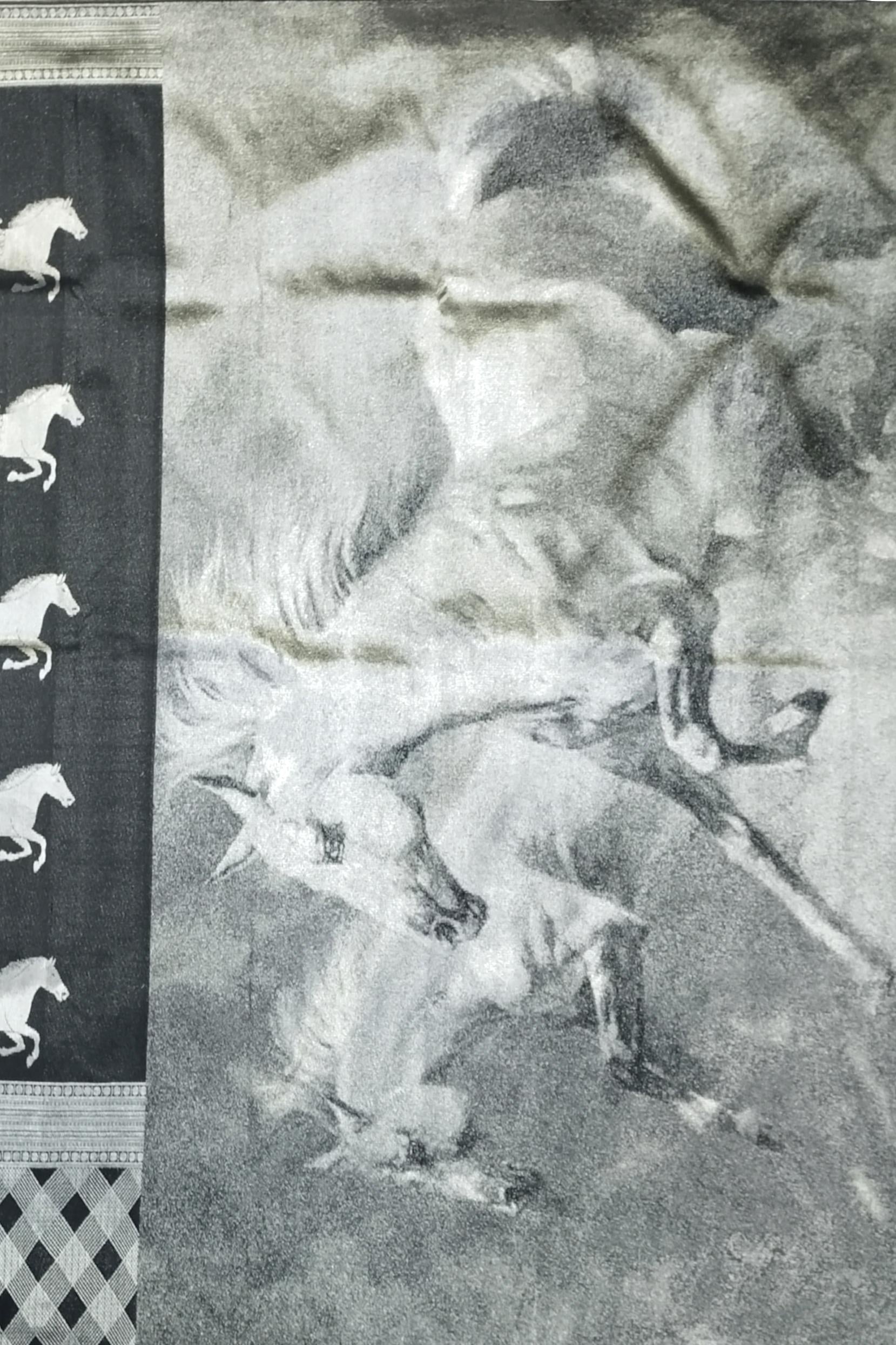 Channel royal elegance with this stunning black Kanchipuram silk saree, exquisitely woven with ashwa (horse) motif digital designs. The silver-hued pallu and blouse add a contemporary touch, creating a captivating contrast against the deep black base. This saree beautifully represents strength, grace, and tradition in one seamless drape.