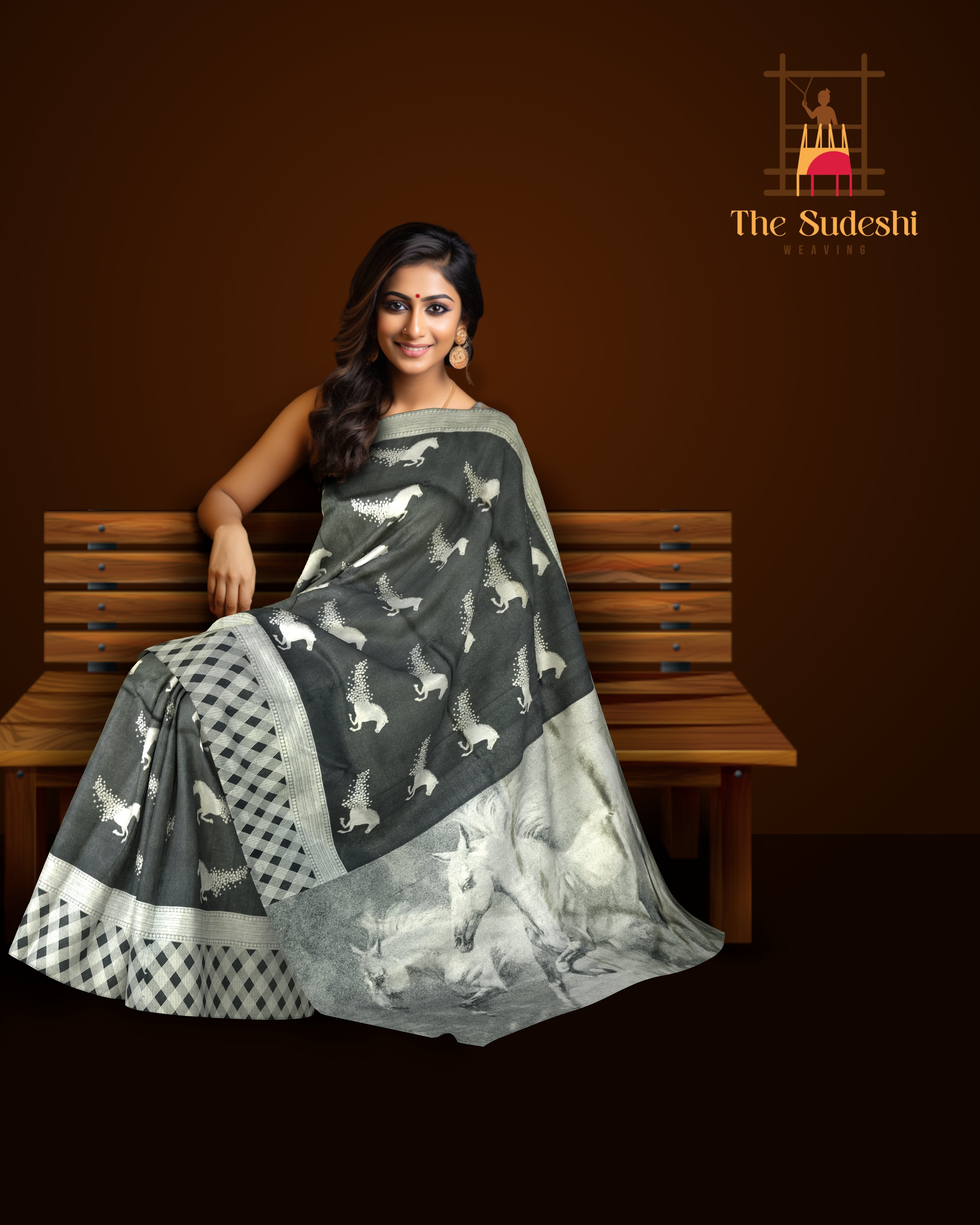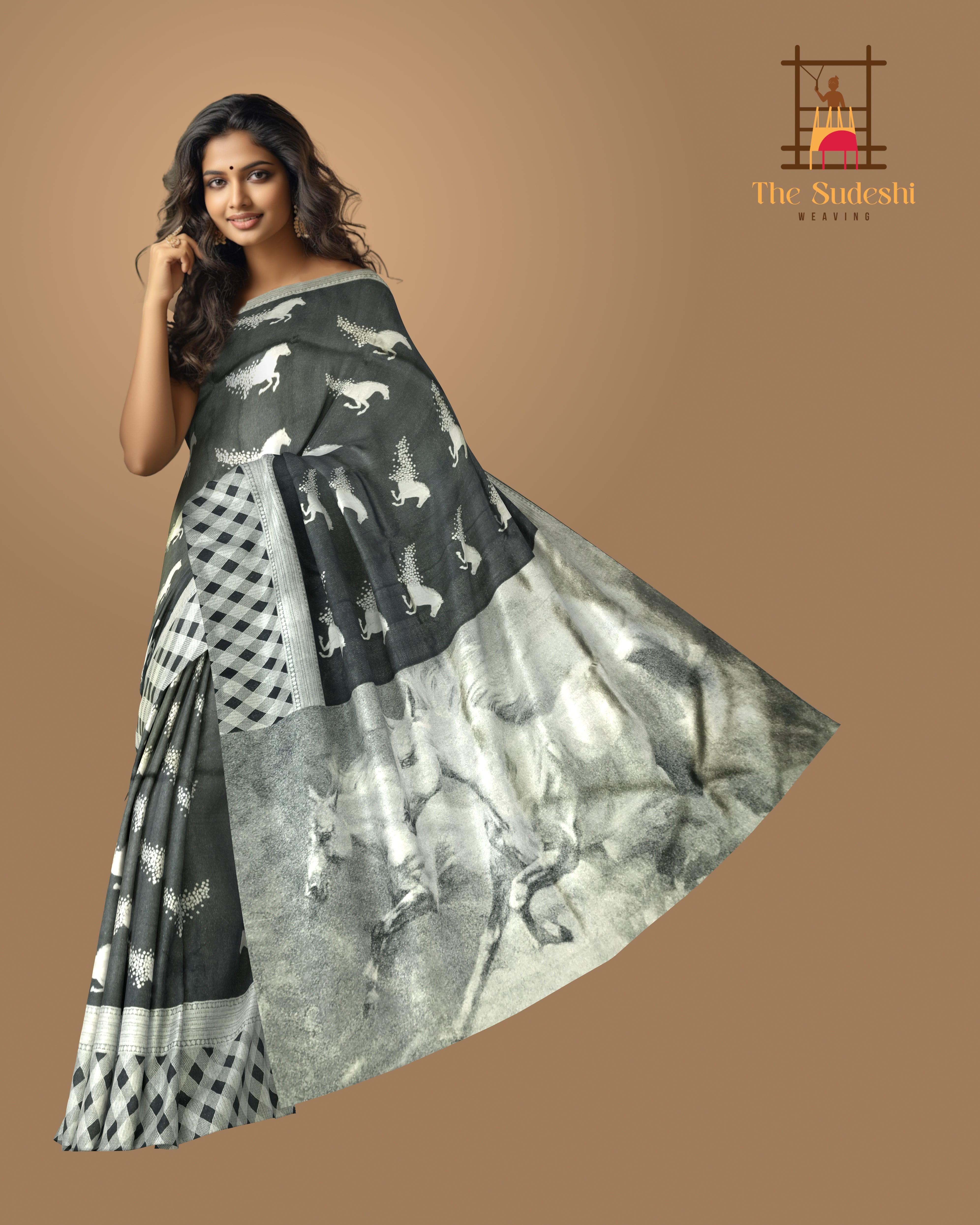 The ashwa motif, historically found in South Indian textiles and temple sculptures, symbolizes power, speed, and nobility. The intricate digital weaving technique elevates the design, making this saree a true work of art. Crafted in pure Kanchipuram silk, it promises a rich texture, graceful drape, and long-lasting durability.