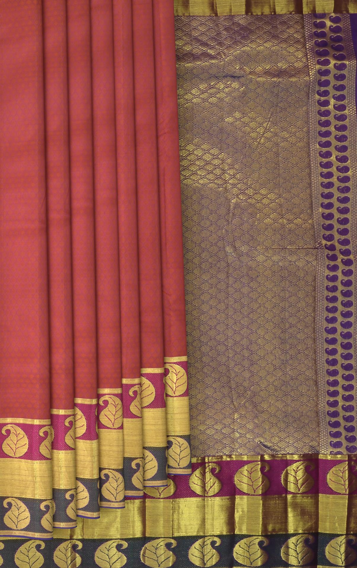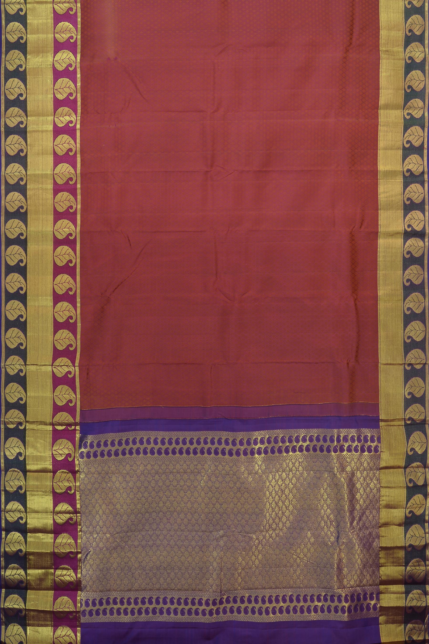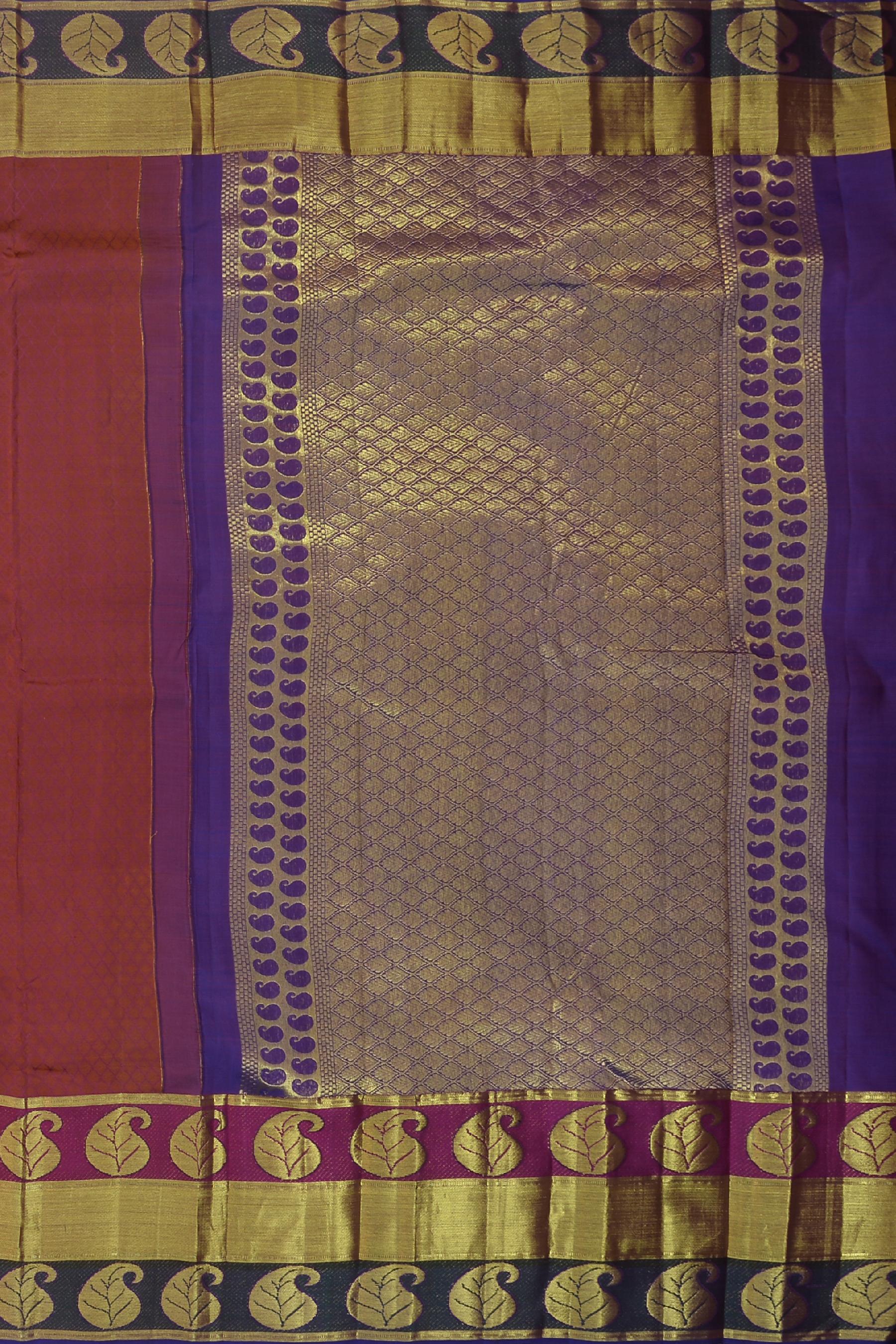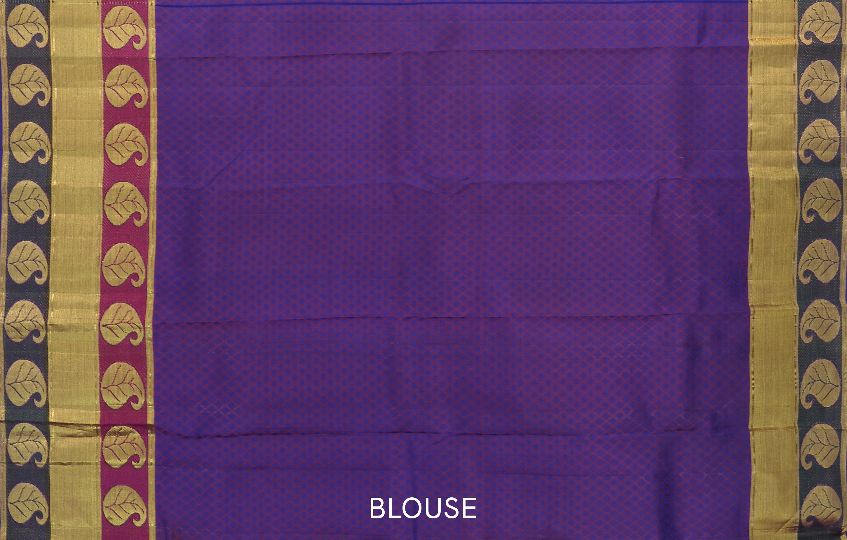 The pallu of this exquisite saree is a masterpiece in violet, showcasing intricate designs that are a testament to the meticulous work and dedication of the weavers. This pallu is not just a piece of fabric but a canvas where every thread narrates a story of beauty, tradition, and the timeless allure of Kancheevaram silk.
