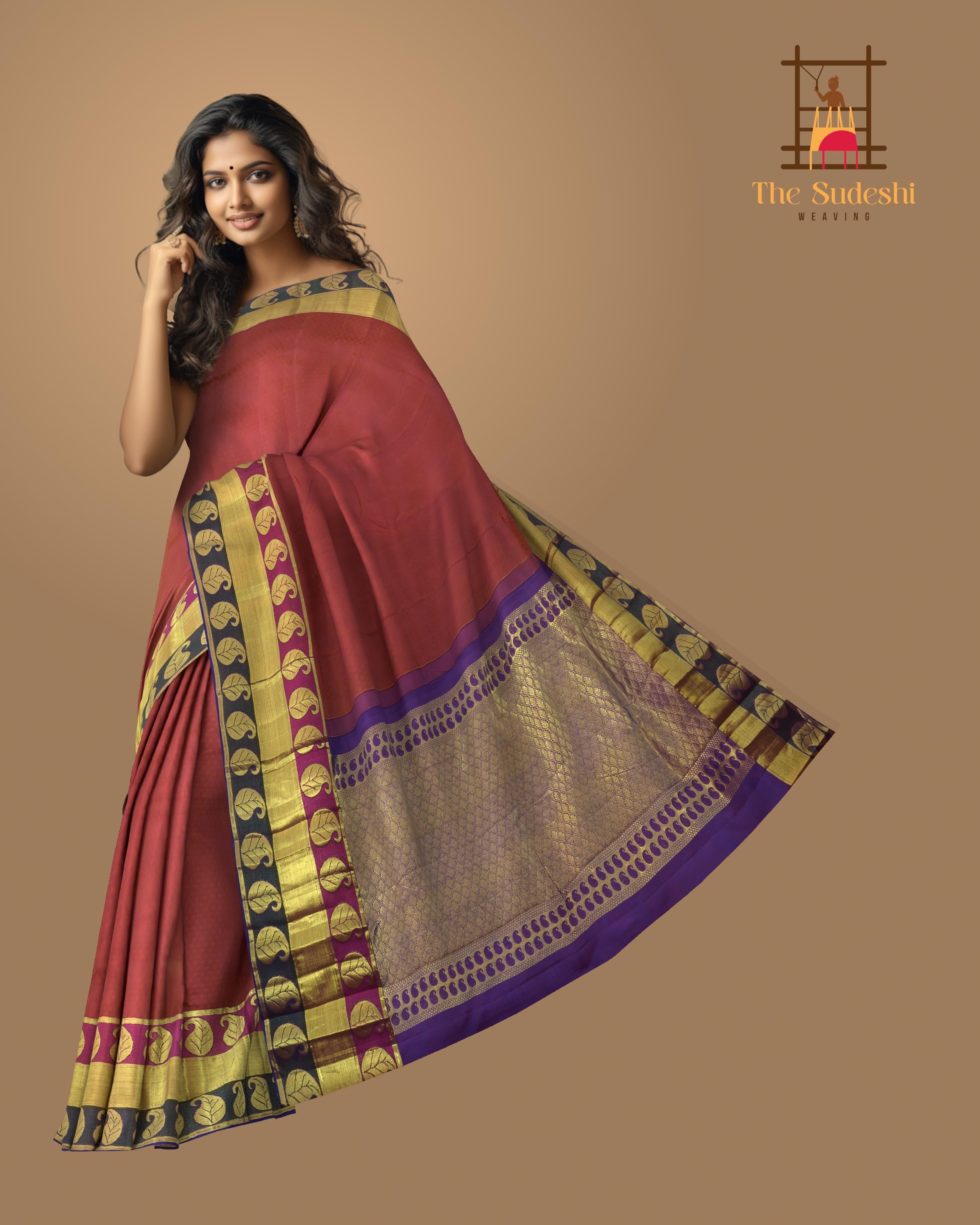 The saree flaunts a striking contrast border, blending shades of purple and violet, adorned with a two-tone border featuring the mango Bavanshi design, a motif that symbolizes love, fertility, and prosperity in Indian culture. The vibrancy of the border perfectly complements the maroon body, creating a visual symphony that is both captivating and enchanting.