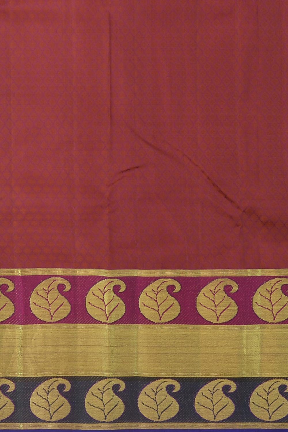 Dive deep into the heritage of Kancheevaram with this pure silk marvel, a saree that beautifully encapsulates the essence of tradition fused with a touch of contemporary elegance. The rich maroon body of this saree is intricately woven using the Jacquard technique, presenting a self-jacquard design that whispers tales of ancient craftsmanship and artistry.