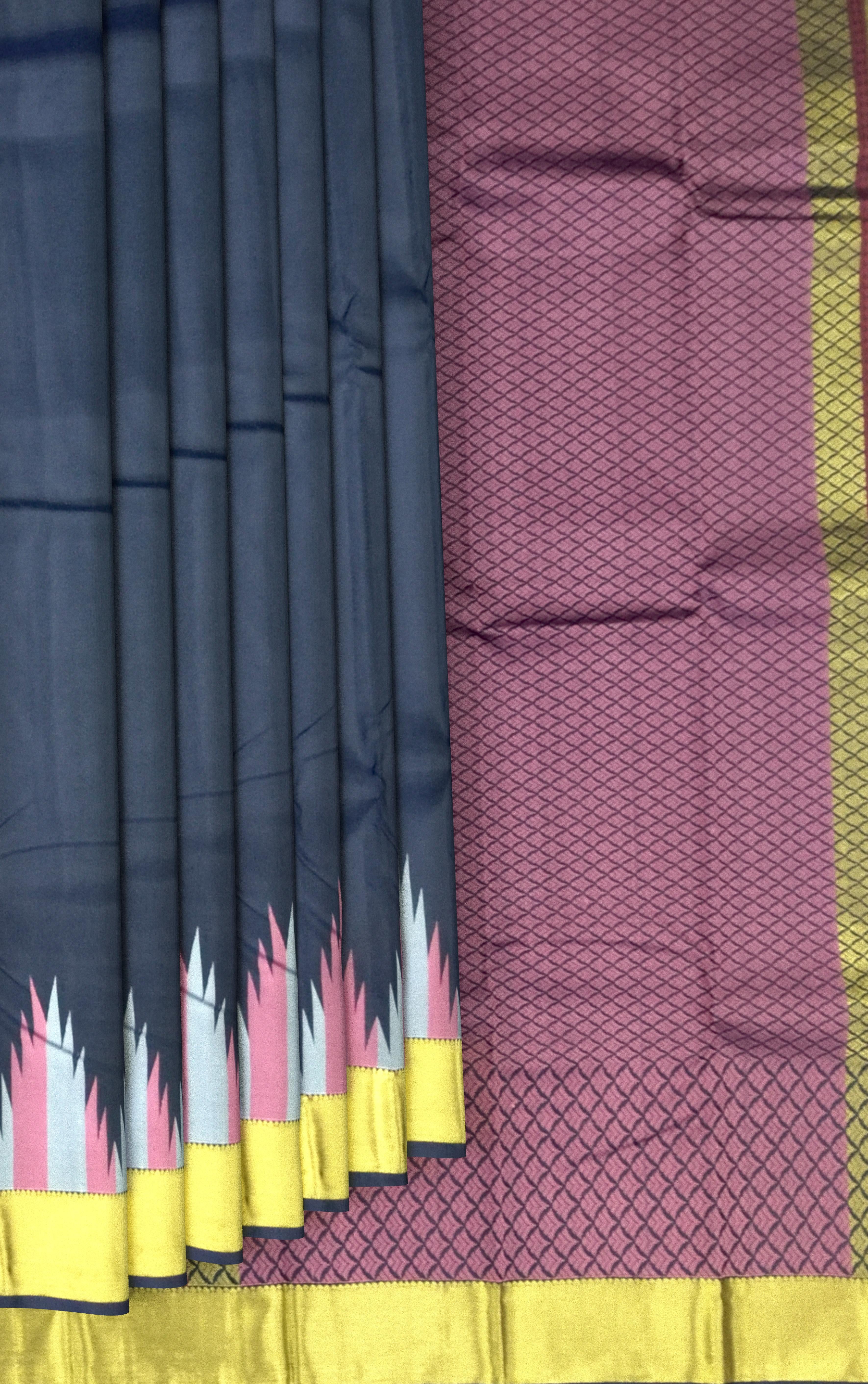 Perfect for weddings, formal gatherings, and religious ceremonies, this saree pairs beautifully with traditional gold jewelry, especially antique or temple-style designs. Opt for an embroidered navy blue blouse with gold accents and complete the look with a bold red bindi and a set of elegant bangles.