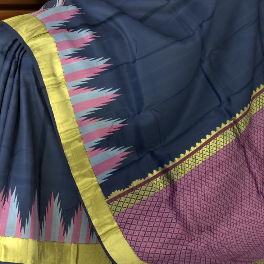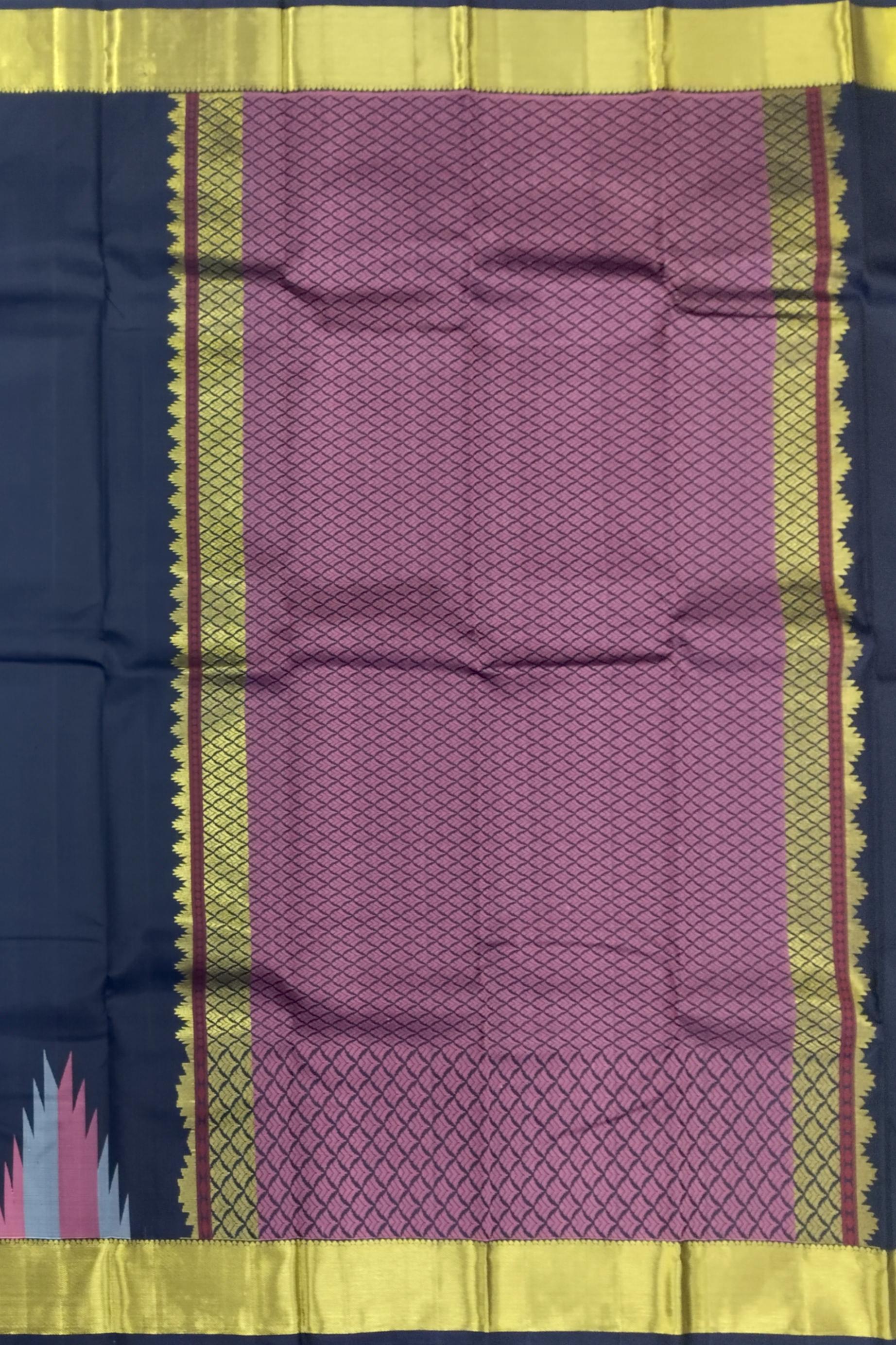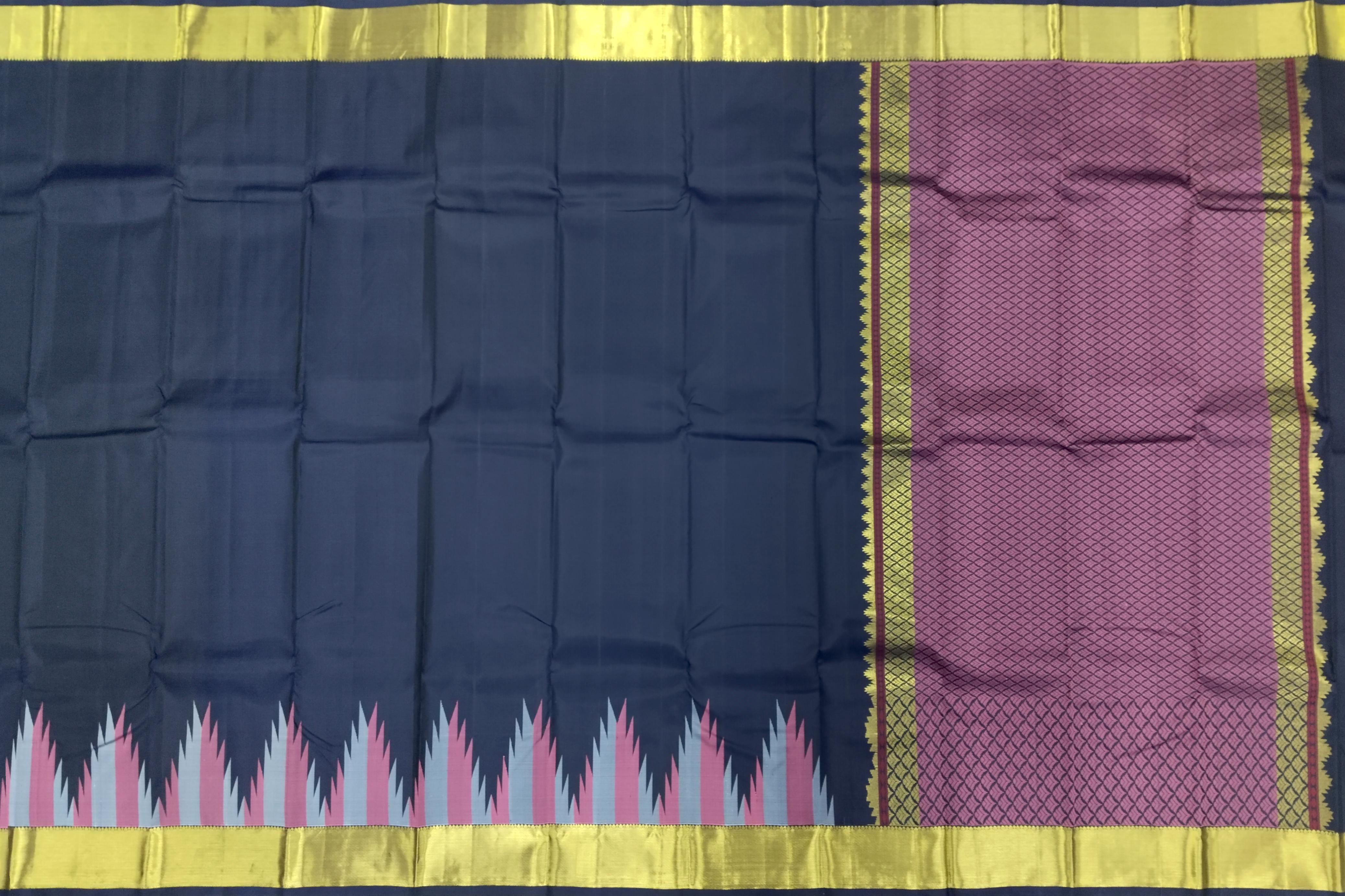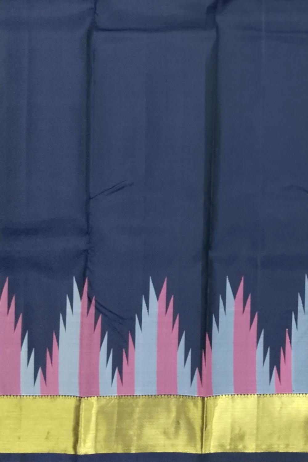 This navy blue Kanchipuram silk saree is a true representation of regal charm and artistic finesse. Adorned with the intricate ettukol seepurek threadwork, the saree reflects the unparalleled craftsmanship of skilled artisans. The self-colored threadwork on the body creates an elegant textured effect, adding depth and richness to the drape. Paired with a matching navy blue blouse, this saree is a timeless choice for any grand celebration.