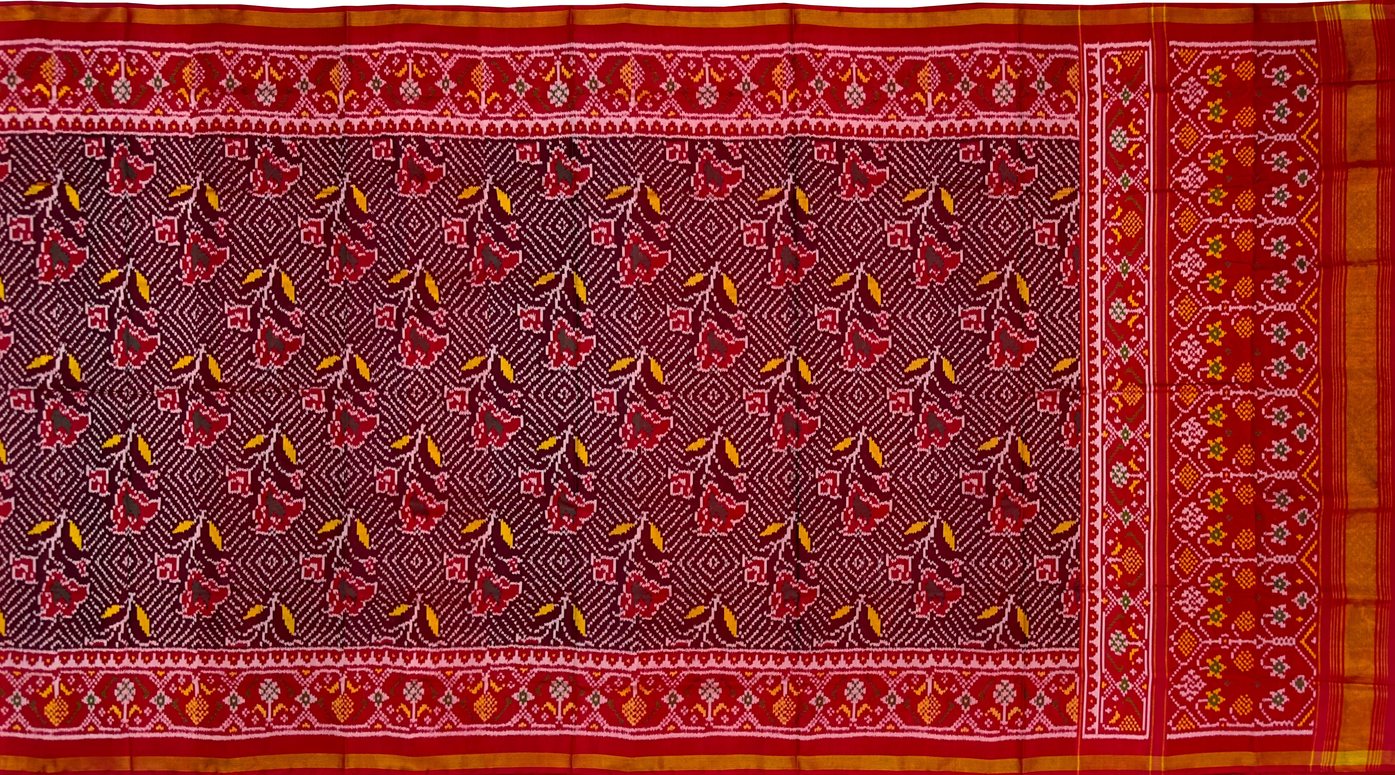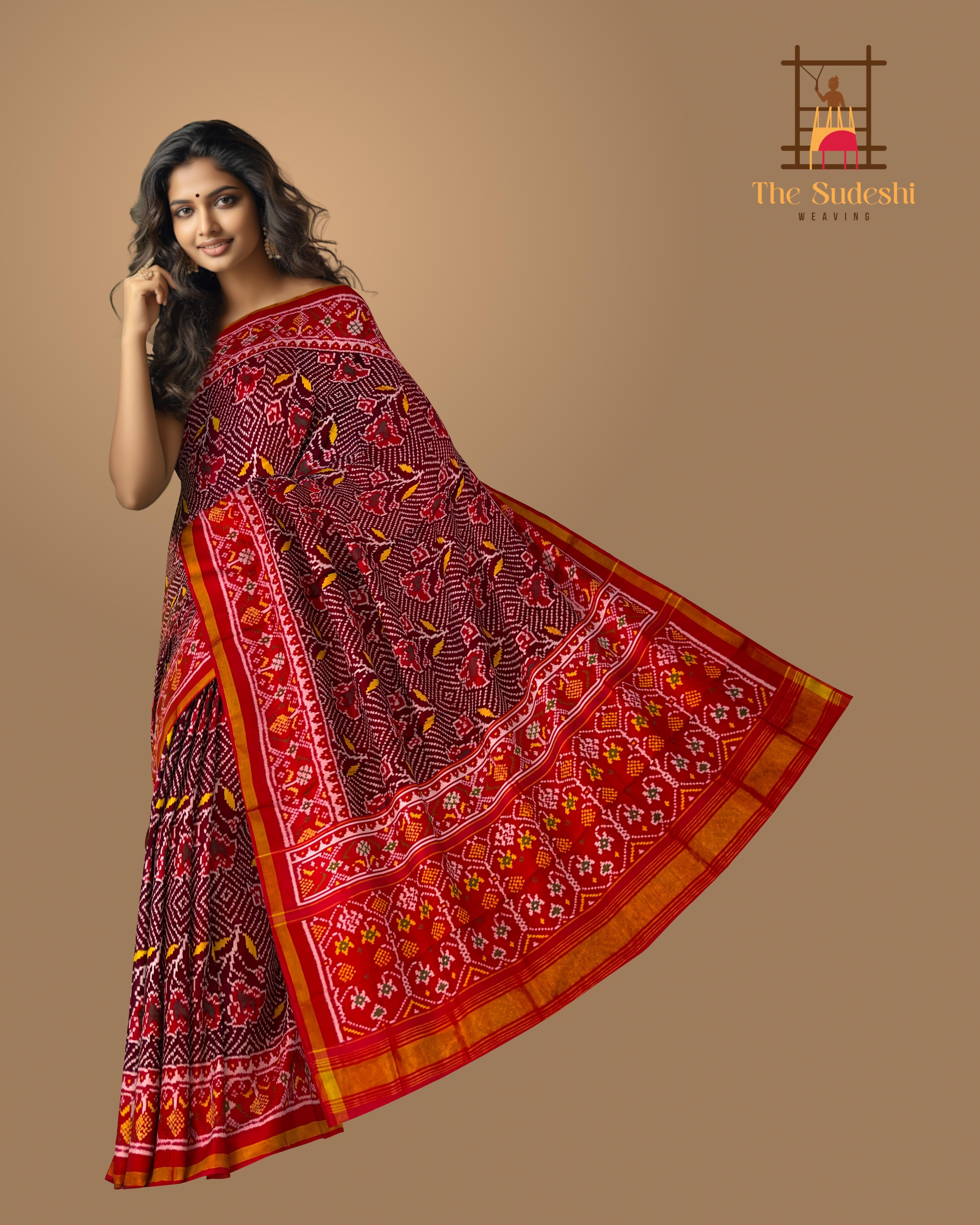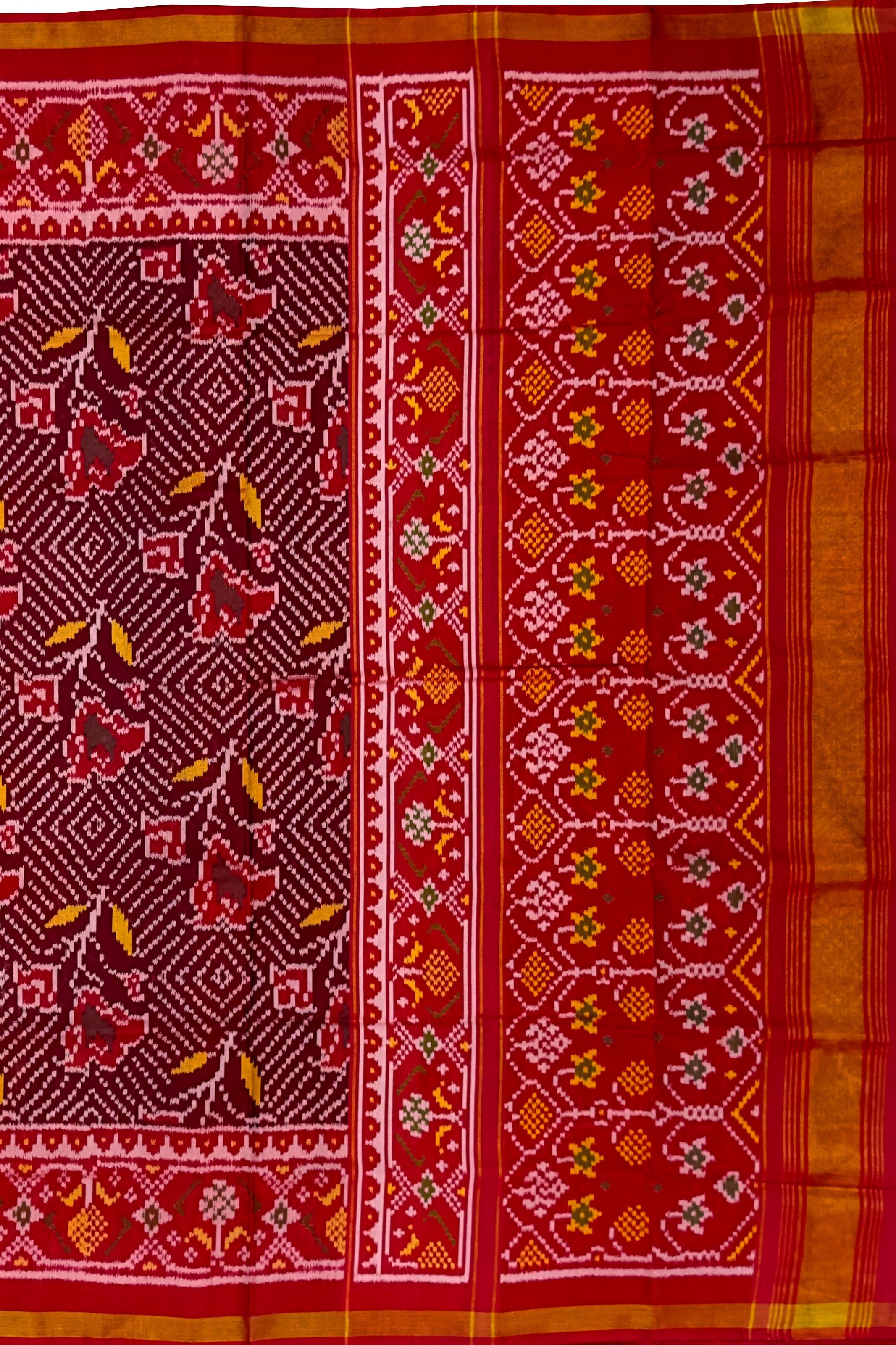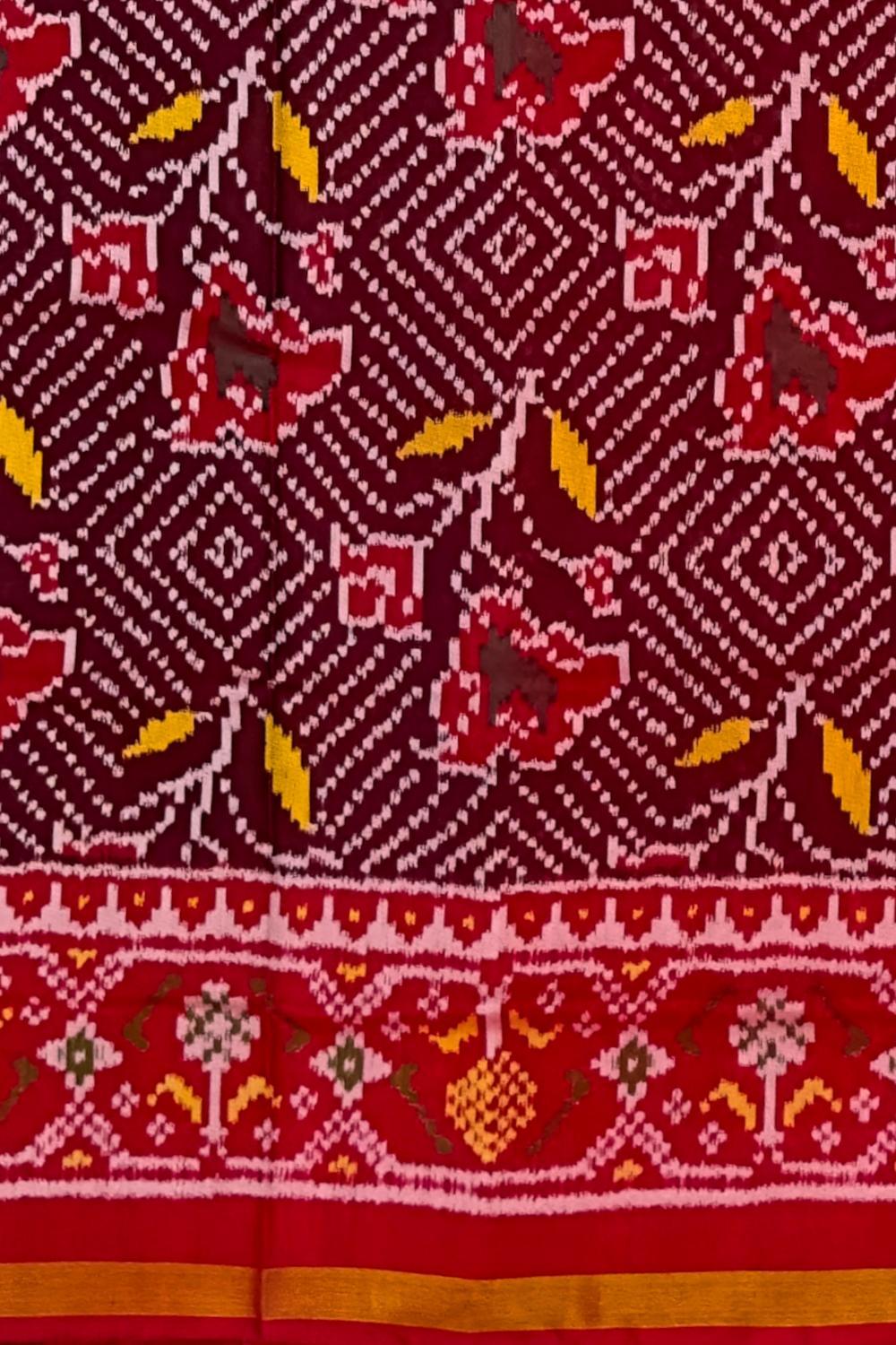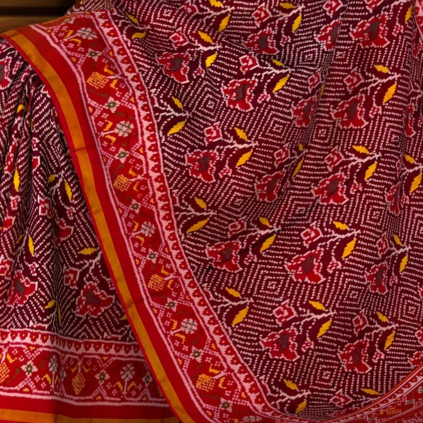 Indulge in the timeless elegance of the Maroon Bandhani Design Flower Single Ikat Semi Patan Patola Saree, where tradition meets modern craftsmanship. The deep maroon hue adorned with intricate Bandhani flower patterns speaks volumes about the artisanal expertise of the Patola weavers. Each flower motif is meticulously crafted, symbolizing purity and grace, making this saree a true work of art.