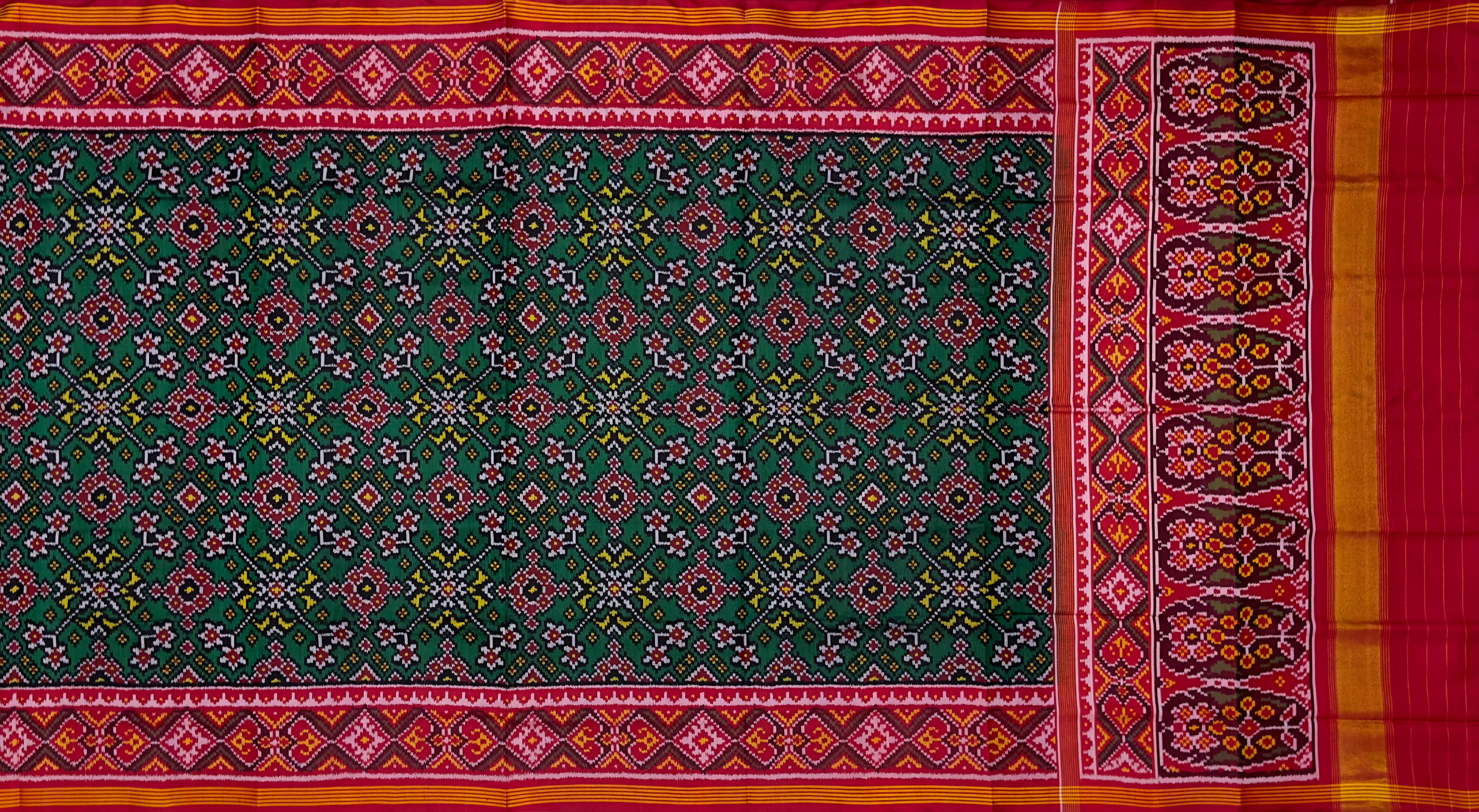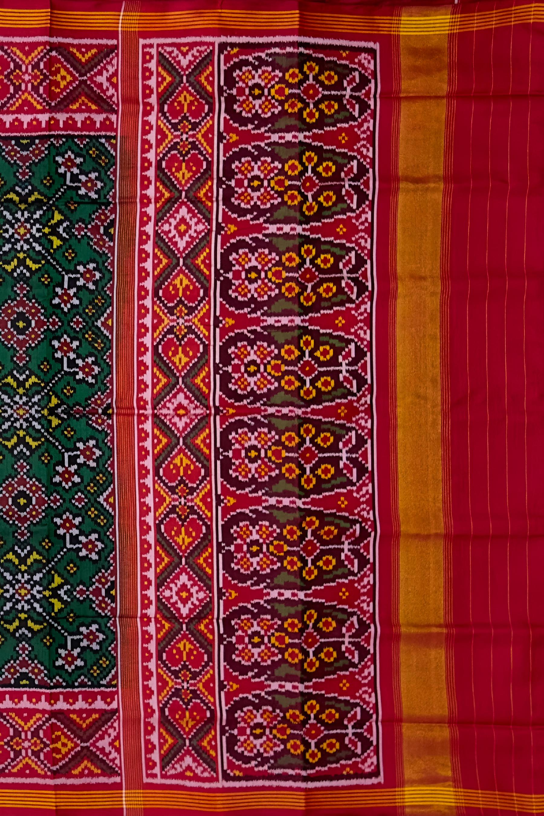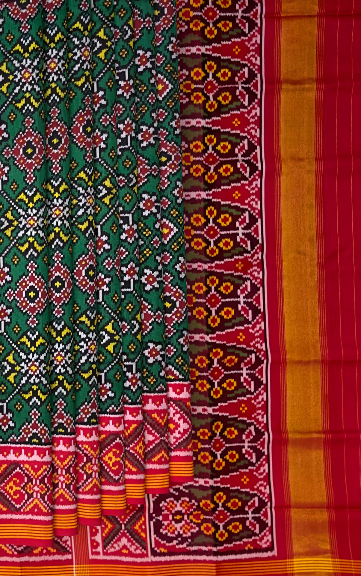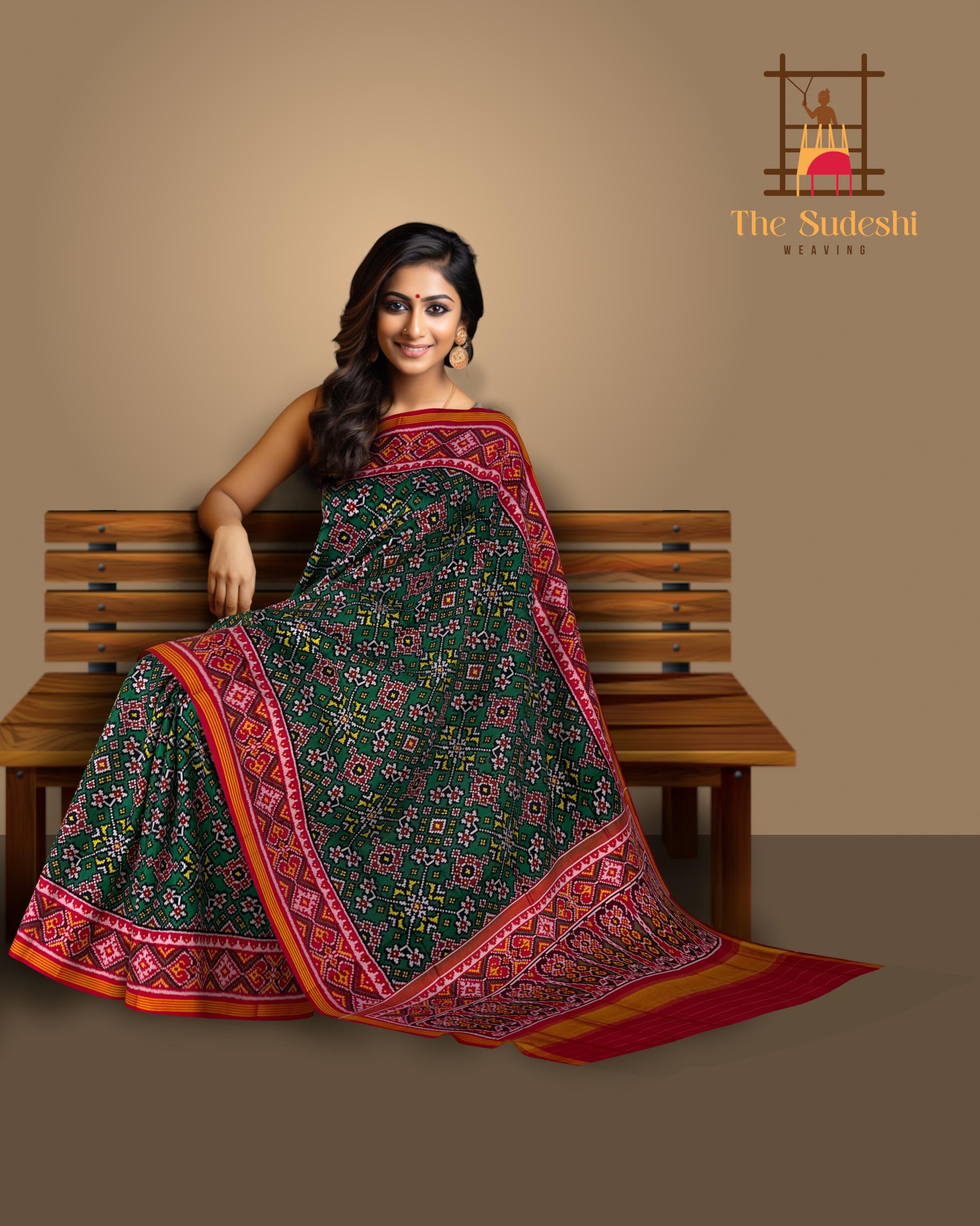 Experience the vibrant elegance of the Maroon Dark Green Navratna Patola Saree, a stunning representation of traditional Indian craftsmanship. Utilizing the single ikat technique, this saree features the intricate Navratna design, known for its detailed and elaborate patterns. The unique maroon and dark green combination provides a striking backdrop for the motifs that extend from the body to the pallu. The semi-lustrous finish adds a touch of sophistication, making it perfect for festive and cultural occasions. This saree is ideal for grand weddings, cultural festivities, and social gatherings. It embodies the rich heritage of Rajkot Patola, making each piece a unique narrative of tradition and pride. Adorn yourself with the Maroon Dark Green Navratna Patola Saree, a timeless addition to your wardrobe that celebrates your roots with grace and elegance.