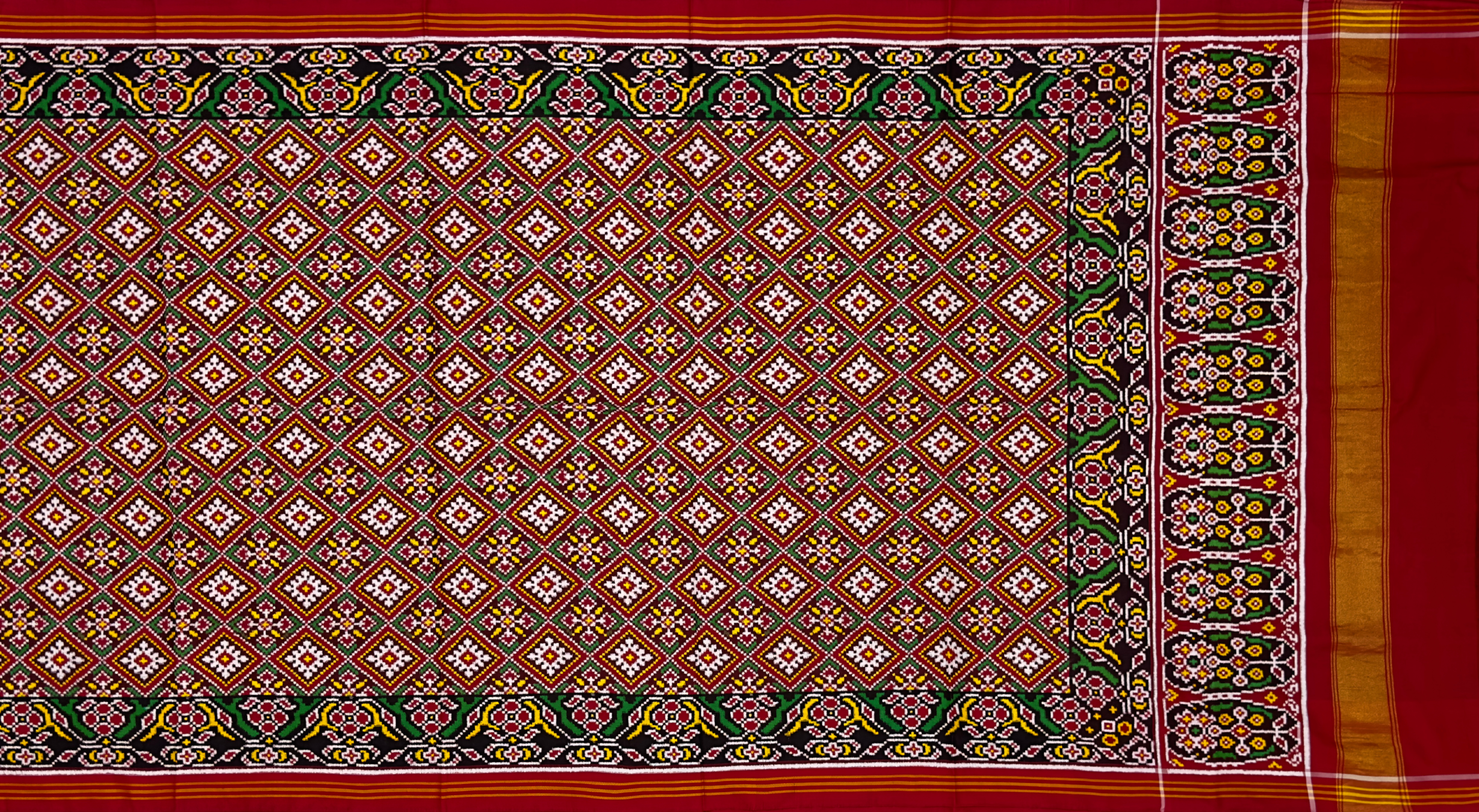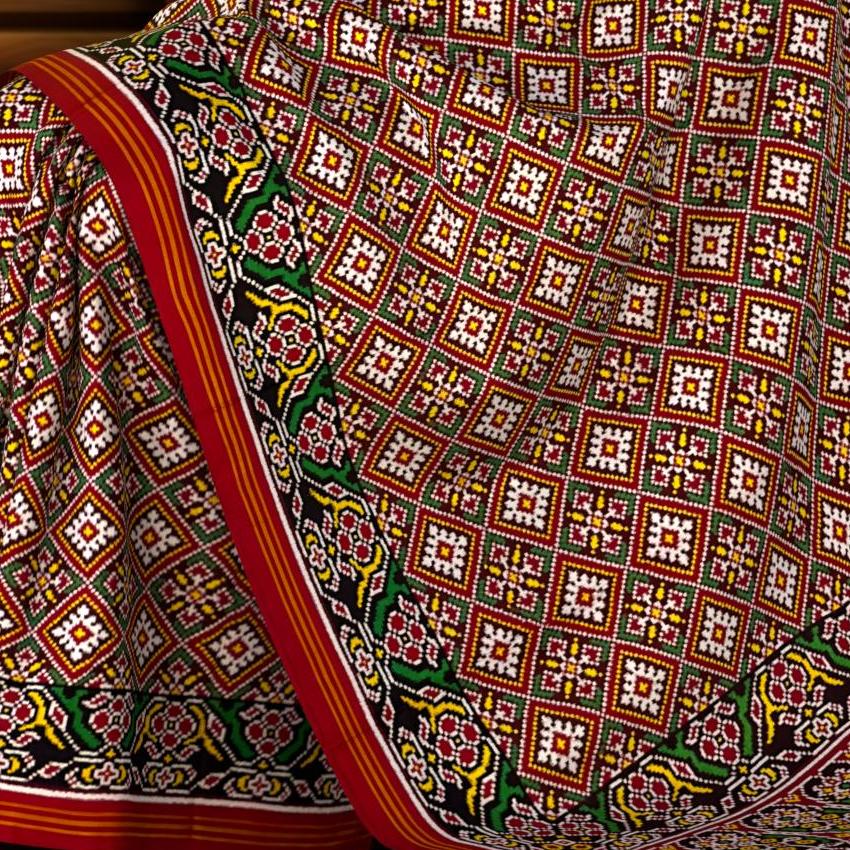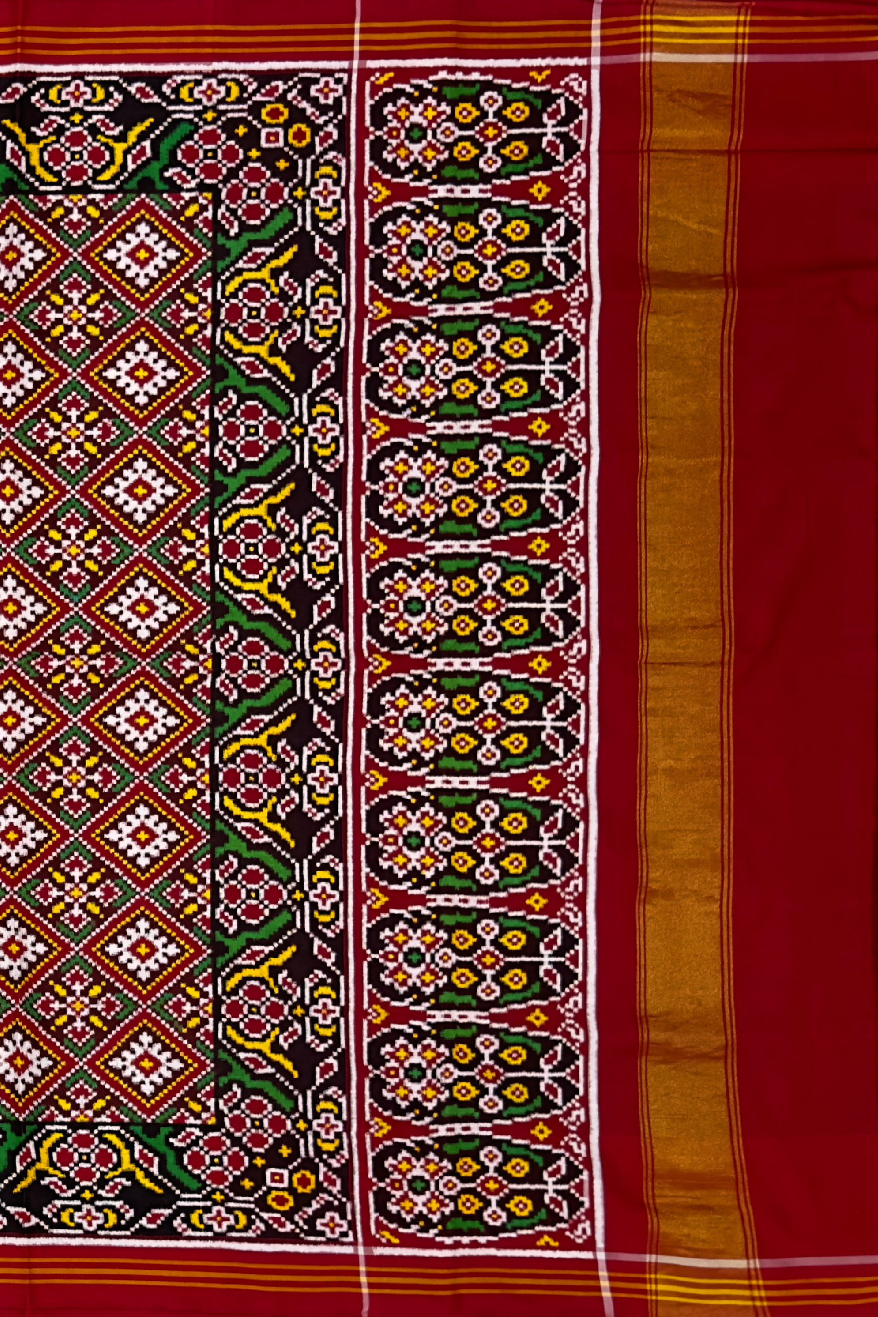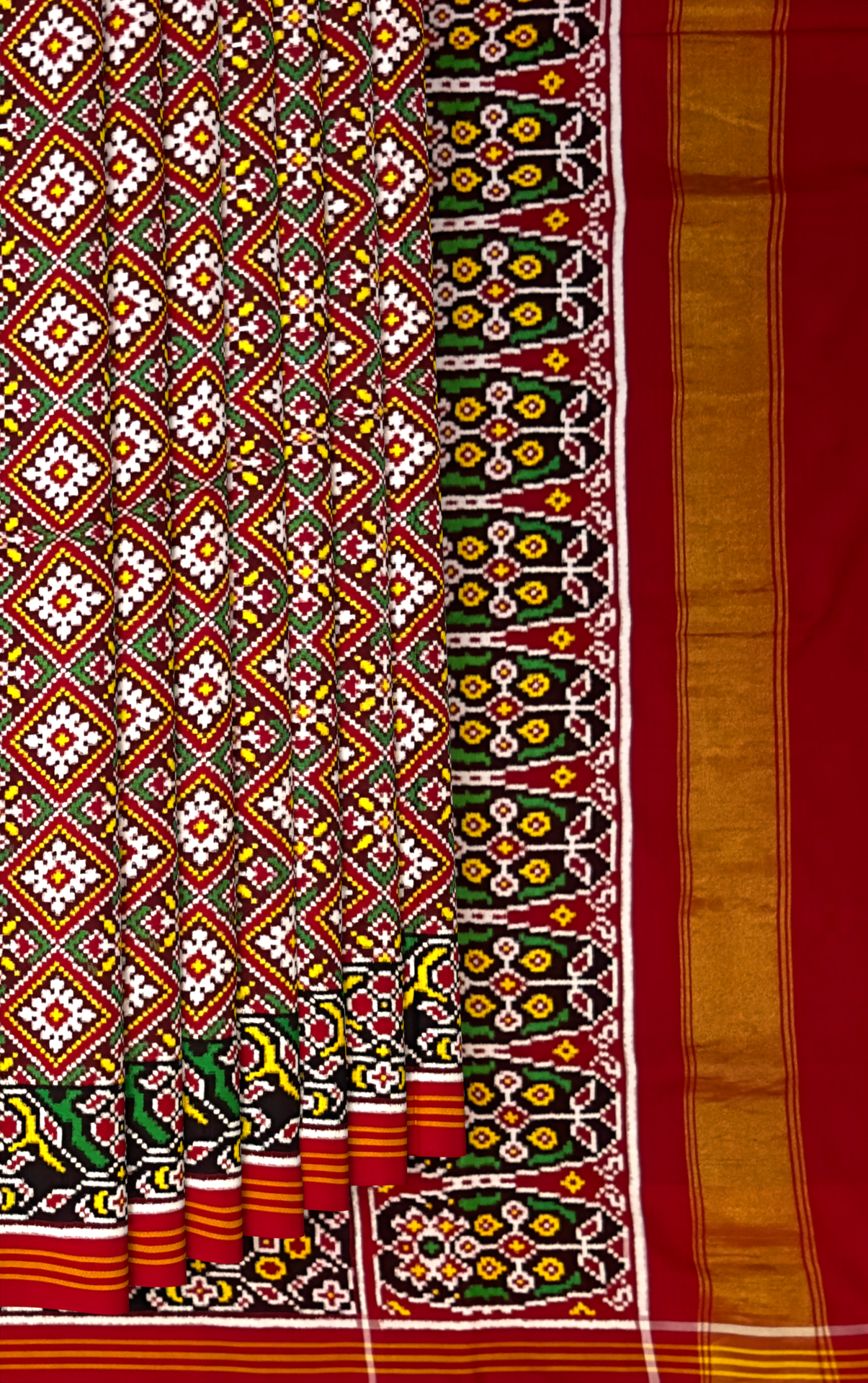 The Chanda Bhat and Tri Phool designs, visible on both sides of the saree, are classic patterns in Double Ikat Patola sarees. The intricate motifs and vibrant colors reflect the skilled craftsmanship and cultural heritage of Gujarat. The luxurious feel and detailed design make this saree ideal for weddings, festive celebrations, and cultural events.
