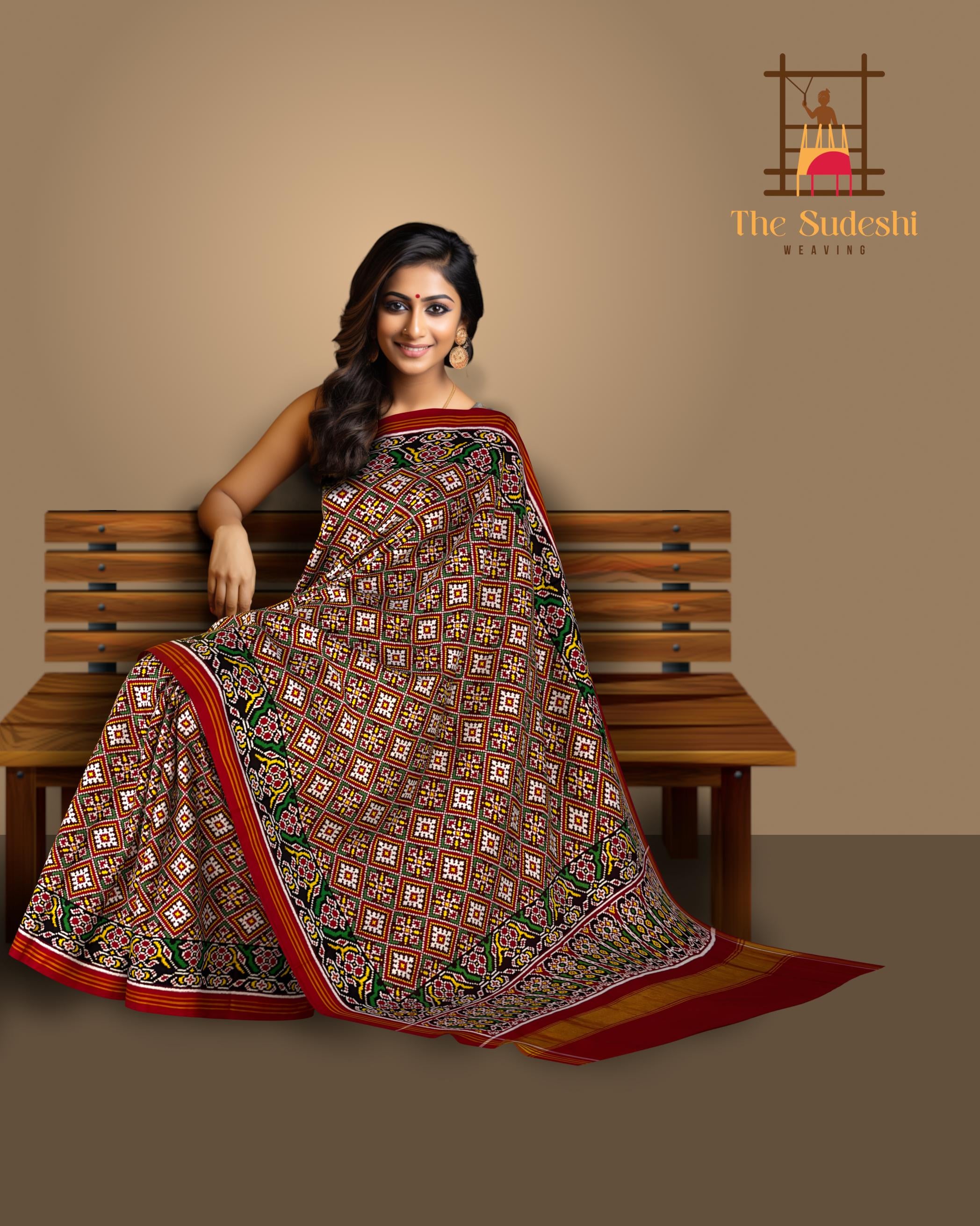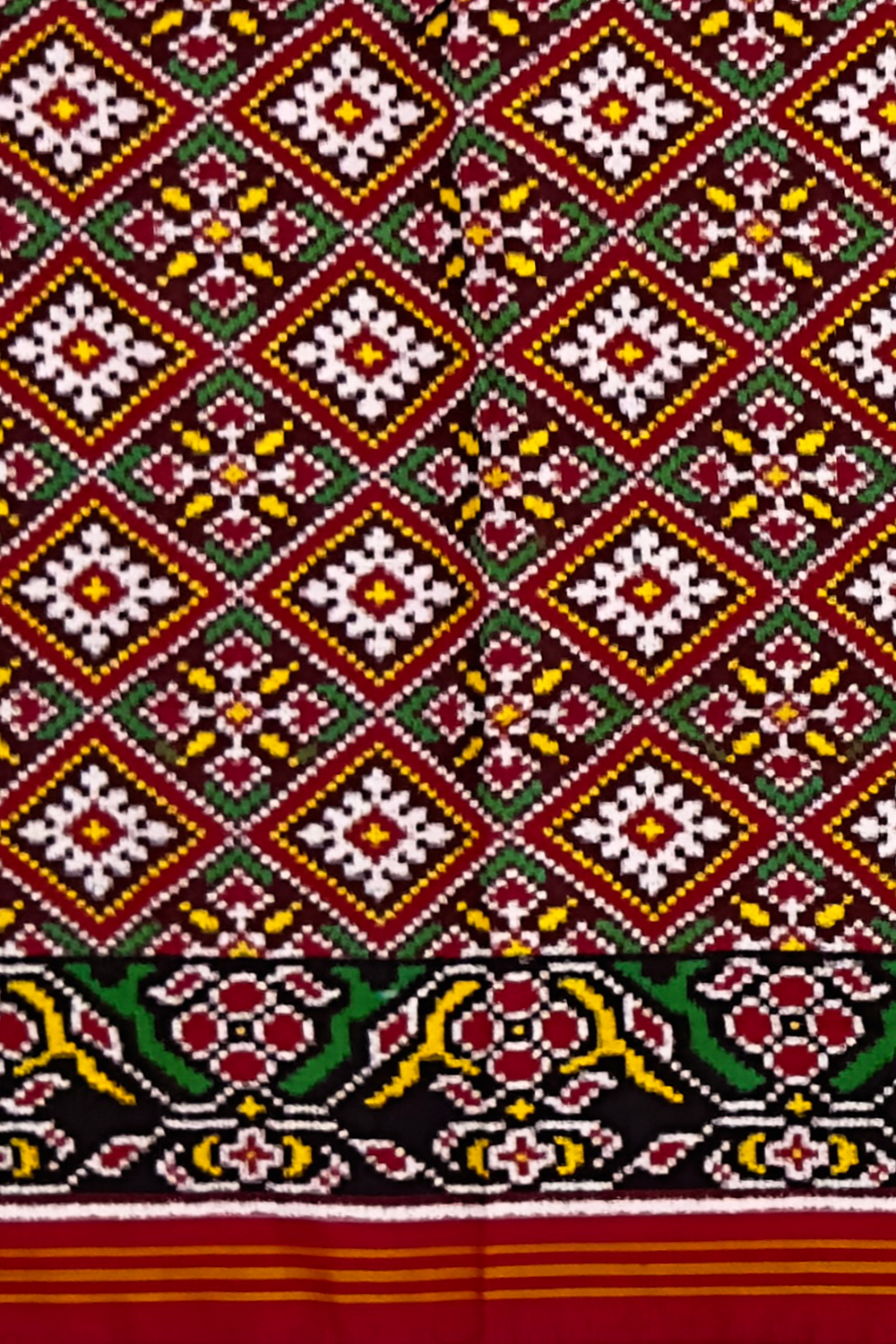 Experience the unmatched elegance of our Maroon Double Ikat Patola Saree, featuring the exquisite Chanda Bhat and Tri Phool designs. This lustrous saree is a testament to the exceptional artistry and tradition of the Double Ikat Patola weaving technique. The maroon color symbolizes passion and royalty, making it a perfect choice for grand occasions.
