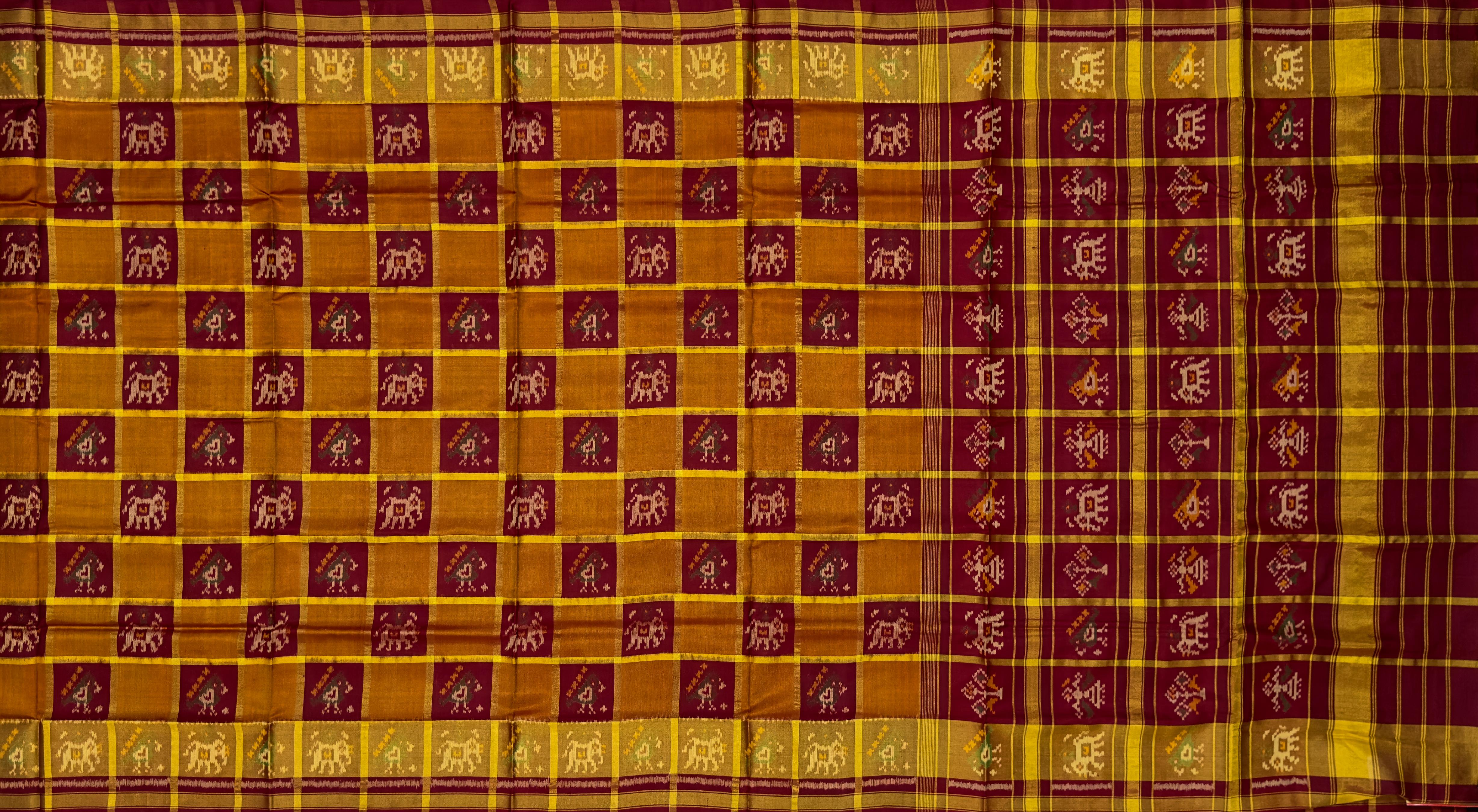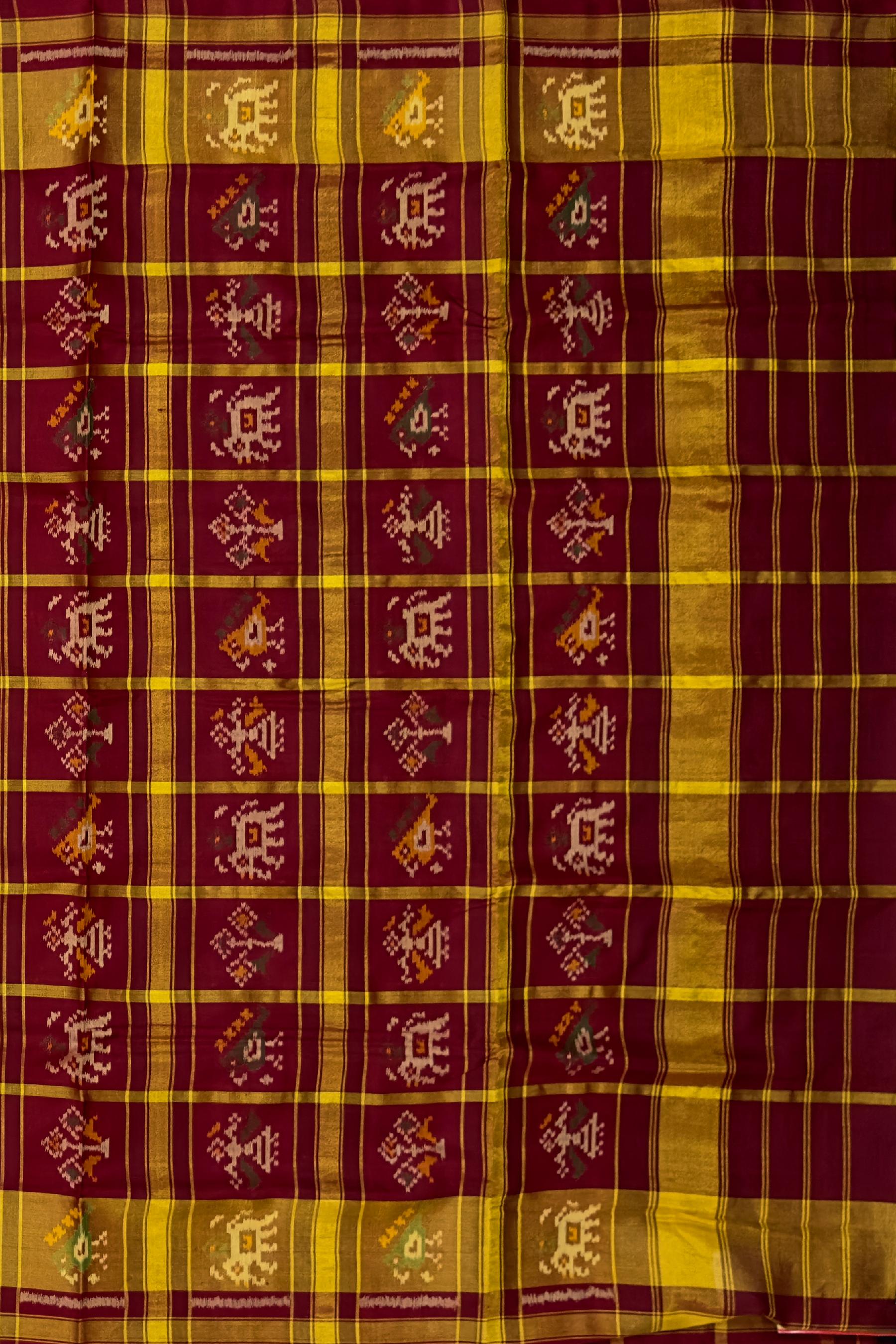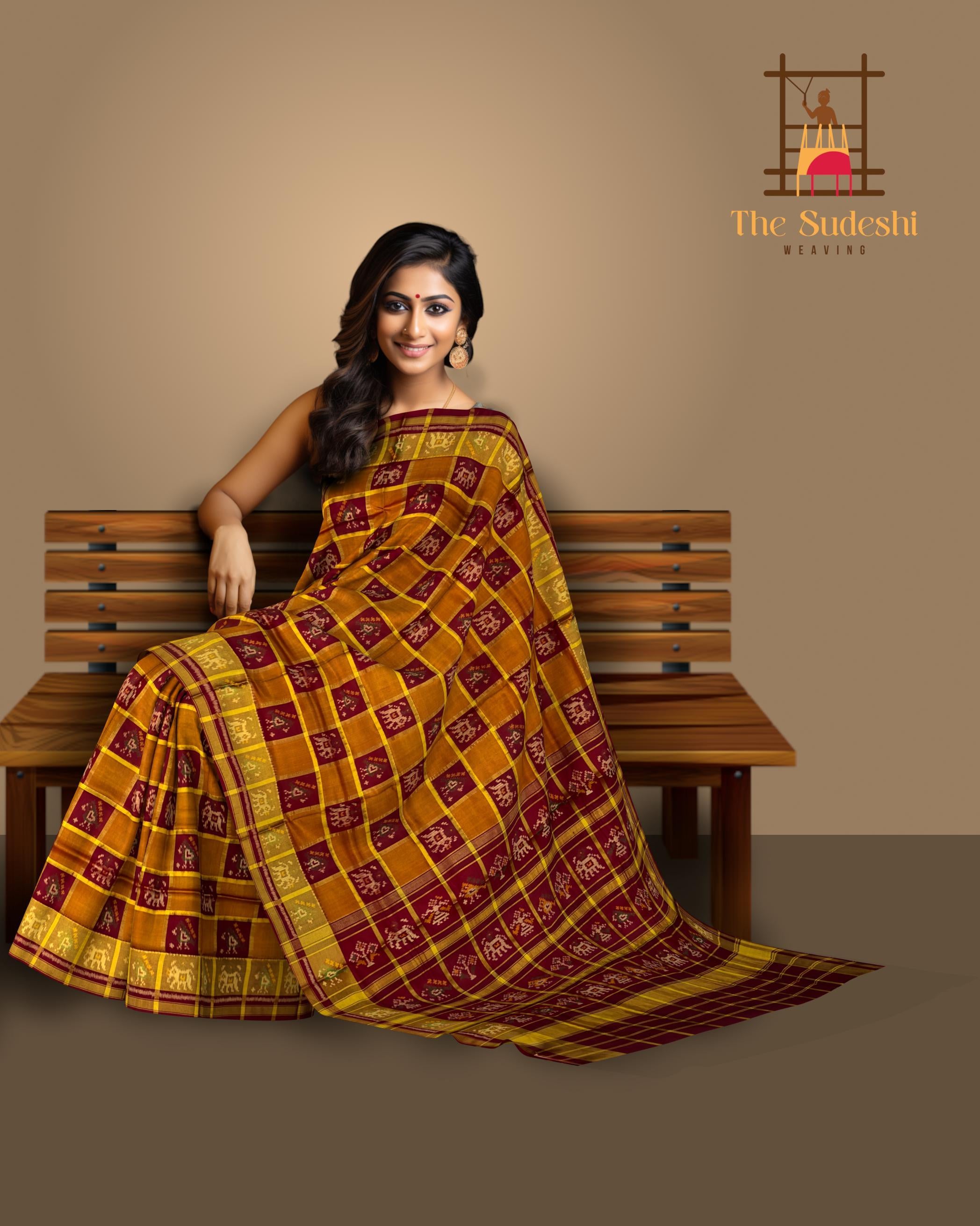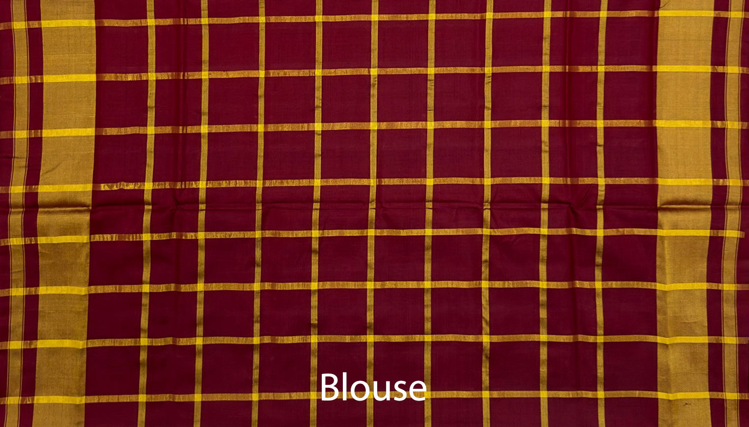 Embrace tradition with the Maroon Jari Checks Saree, a rich combination of maroon and mustard hues. This saree features spaced Hathi Popat figures, ideal for cultural festivities where heritage and elegance are celebrated.