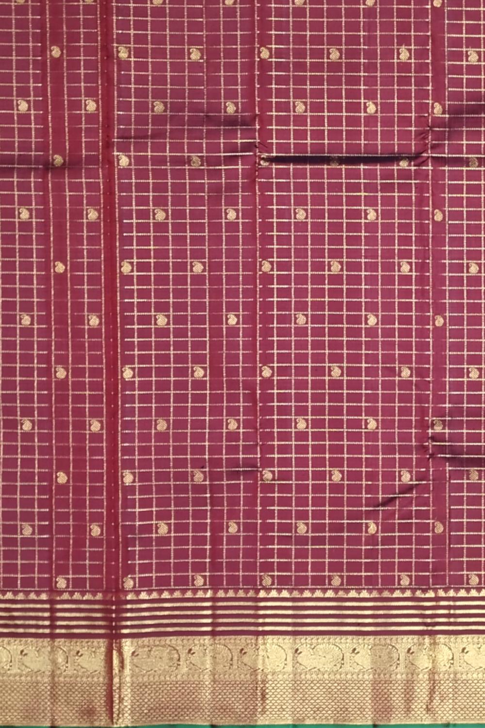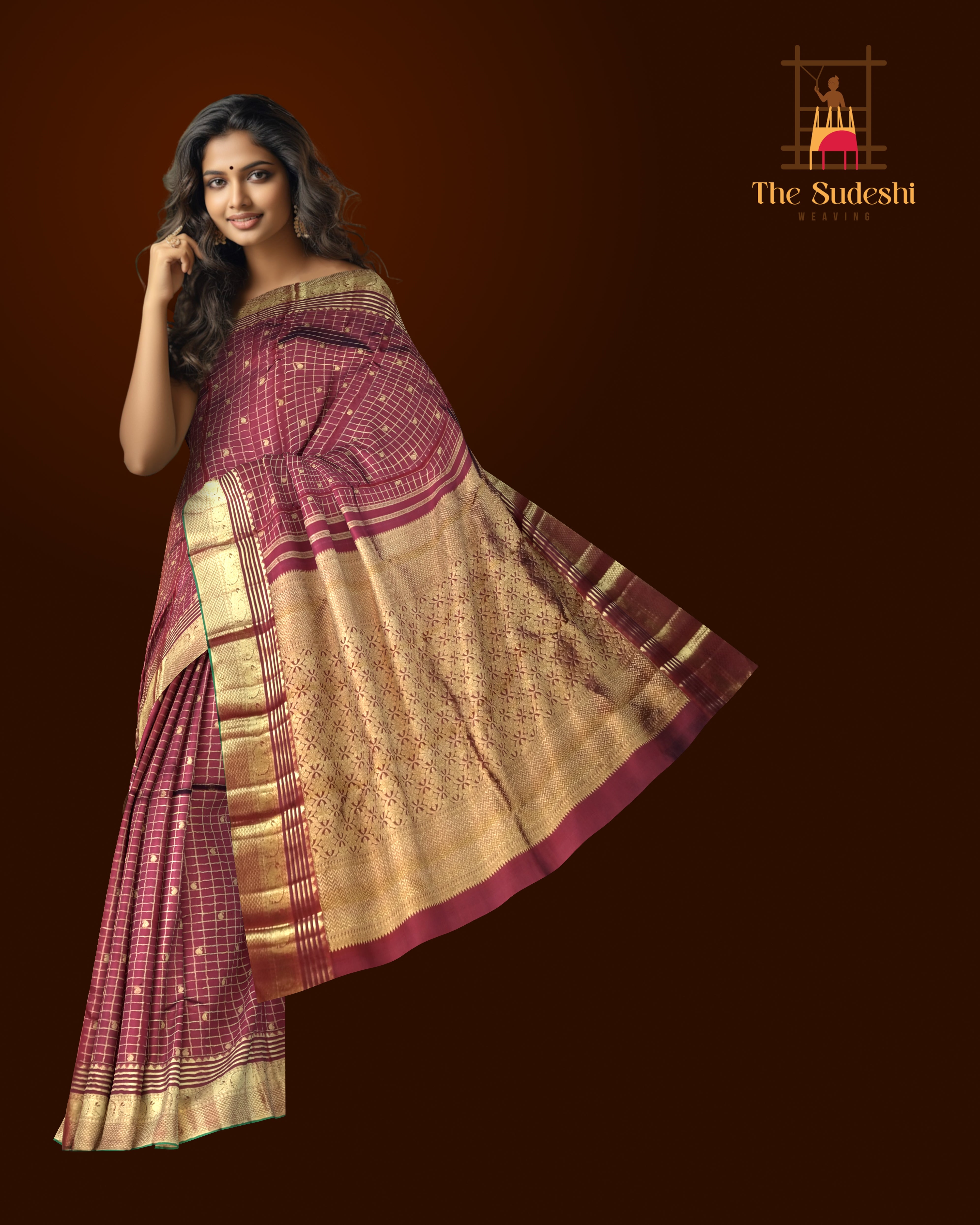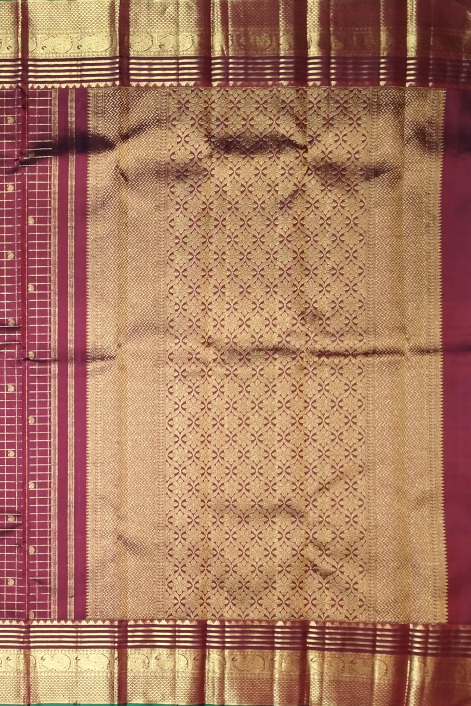 Dignified and deeply rooted in heritage, this maroon Kanchipuram silk saree is designed with a classic checked pattern infused with mango motifs, symbolizing prosperity and abundance. The saree’s elegance is further elevated by the annam (swan) motif border—a revered symbol of purity and divine grace in South Indian tradition. The matching self-colored blouse enhances the seamless elegance of the ensemble.