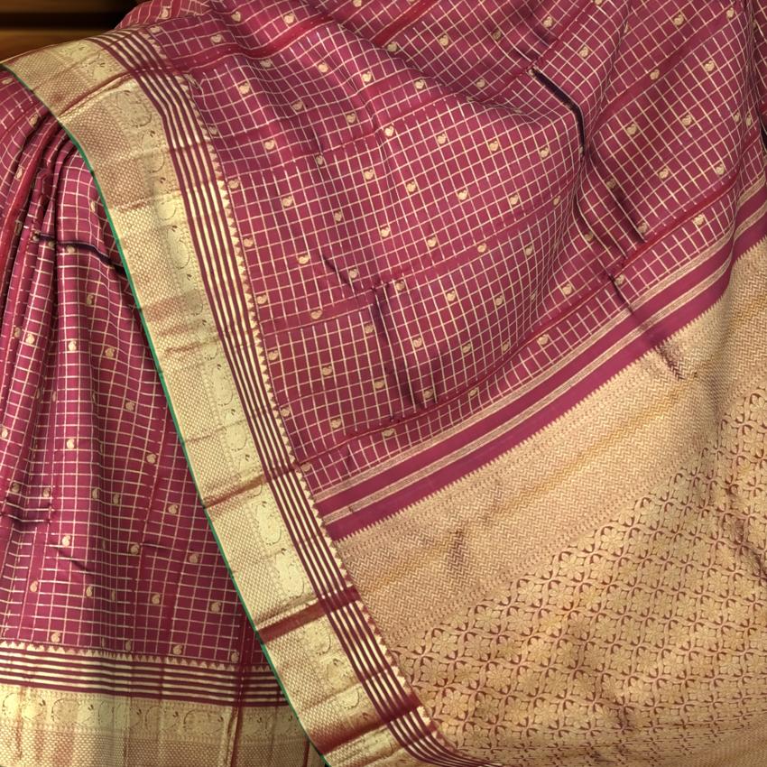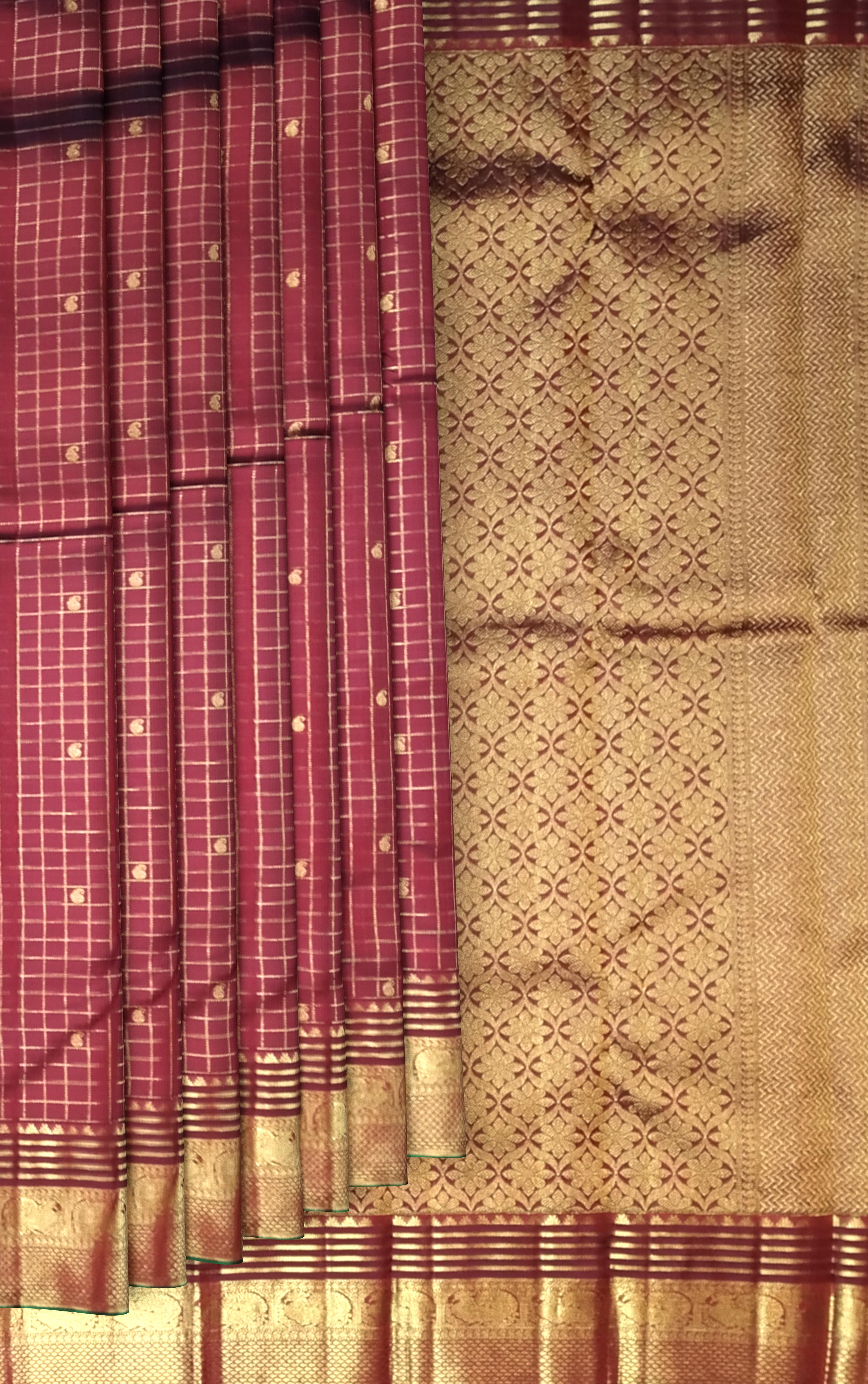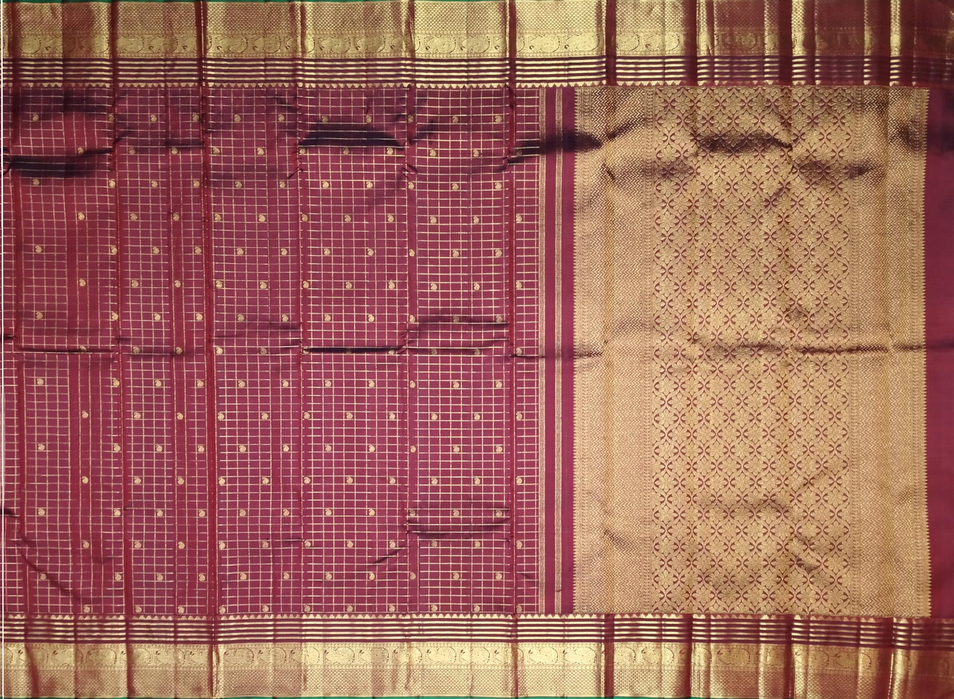 Dignified and deeply rooted in heritage, this maroon Kanchipuram silk saree is designed with a classic checked pattern infused with mango motifs, symbolizing prosperity and abundance. The saree’s elegance is further elevated by the annam (swan) motif border—a revered symbol of purity and divine grace in South Indian tradition. The matching self-colored blouse enhances the seamless elegance of the ensemble.