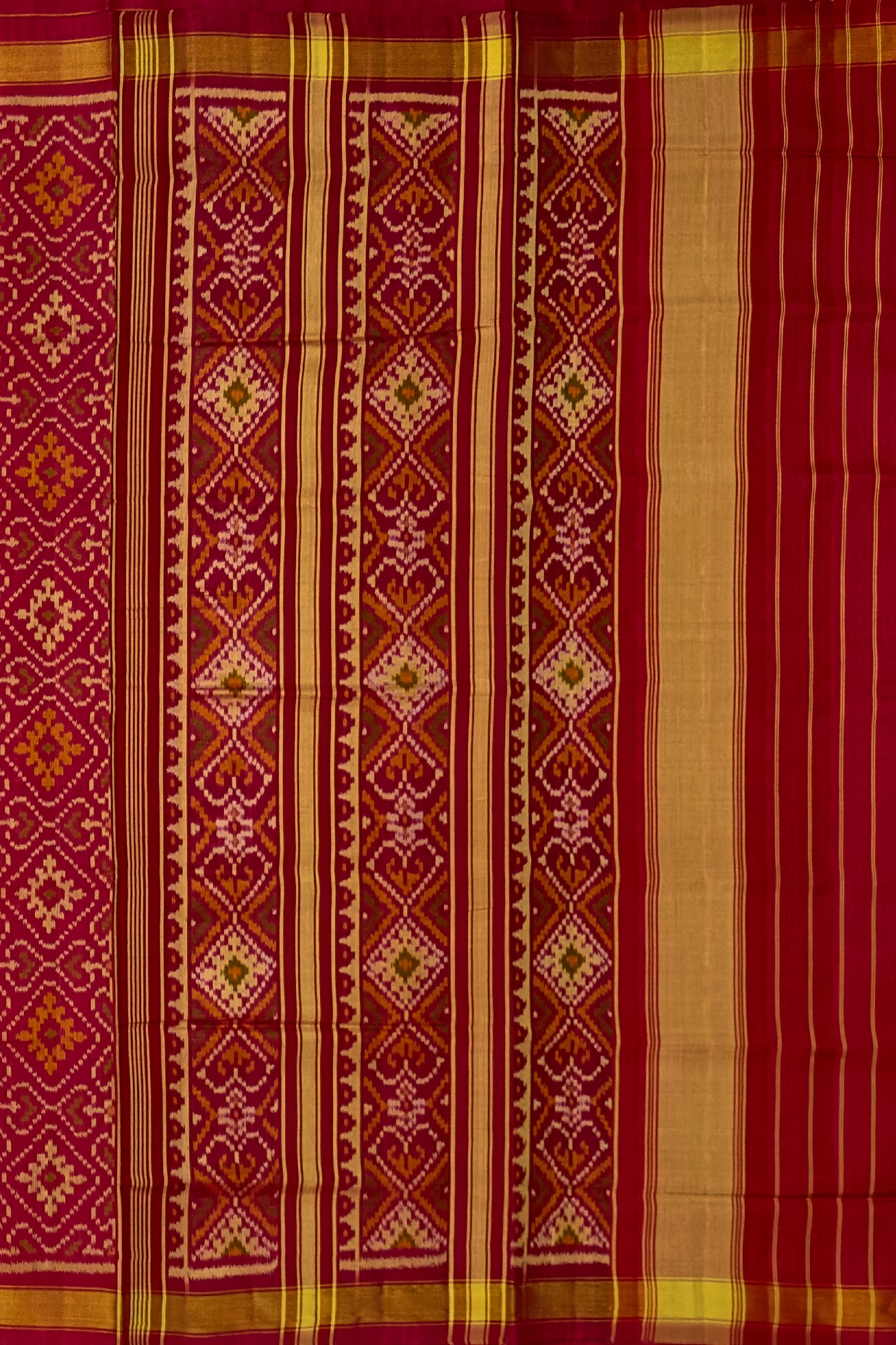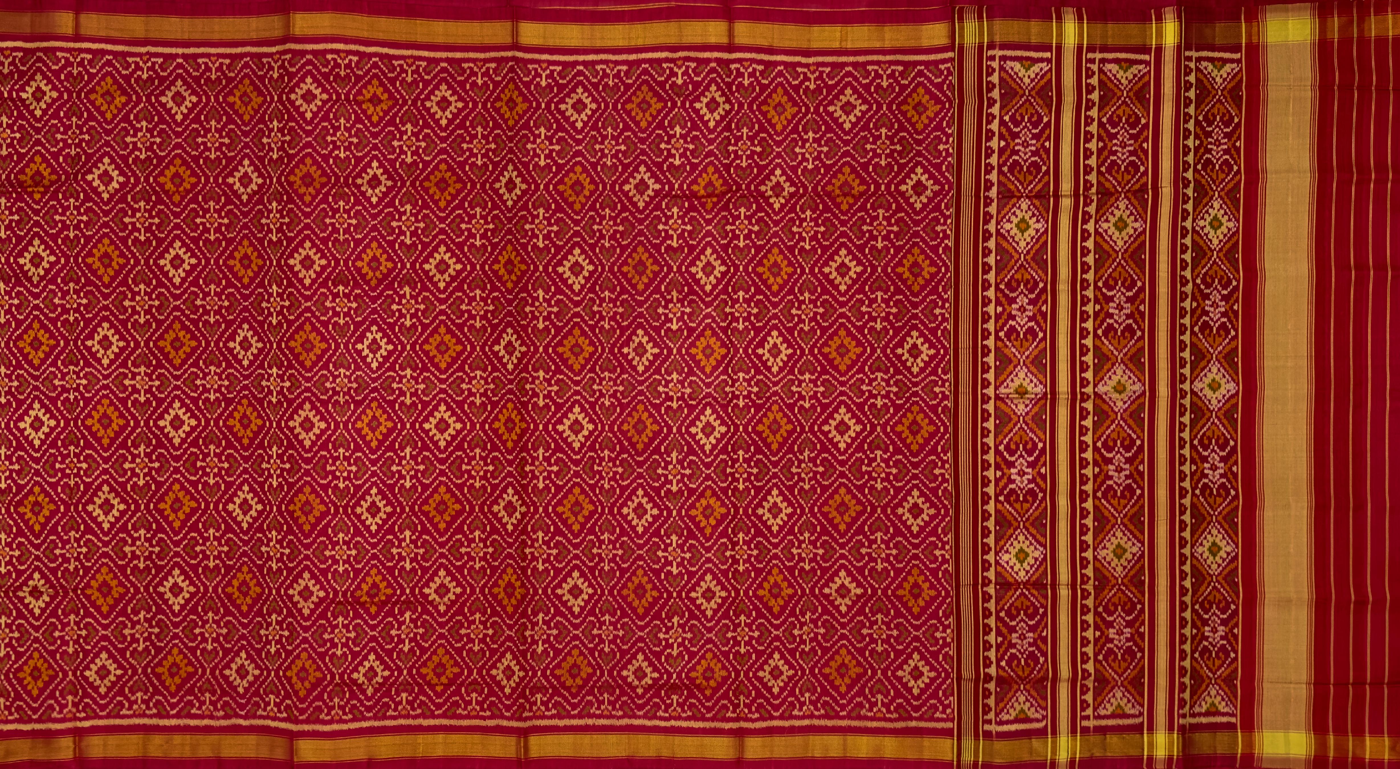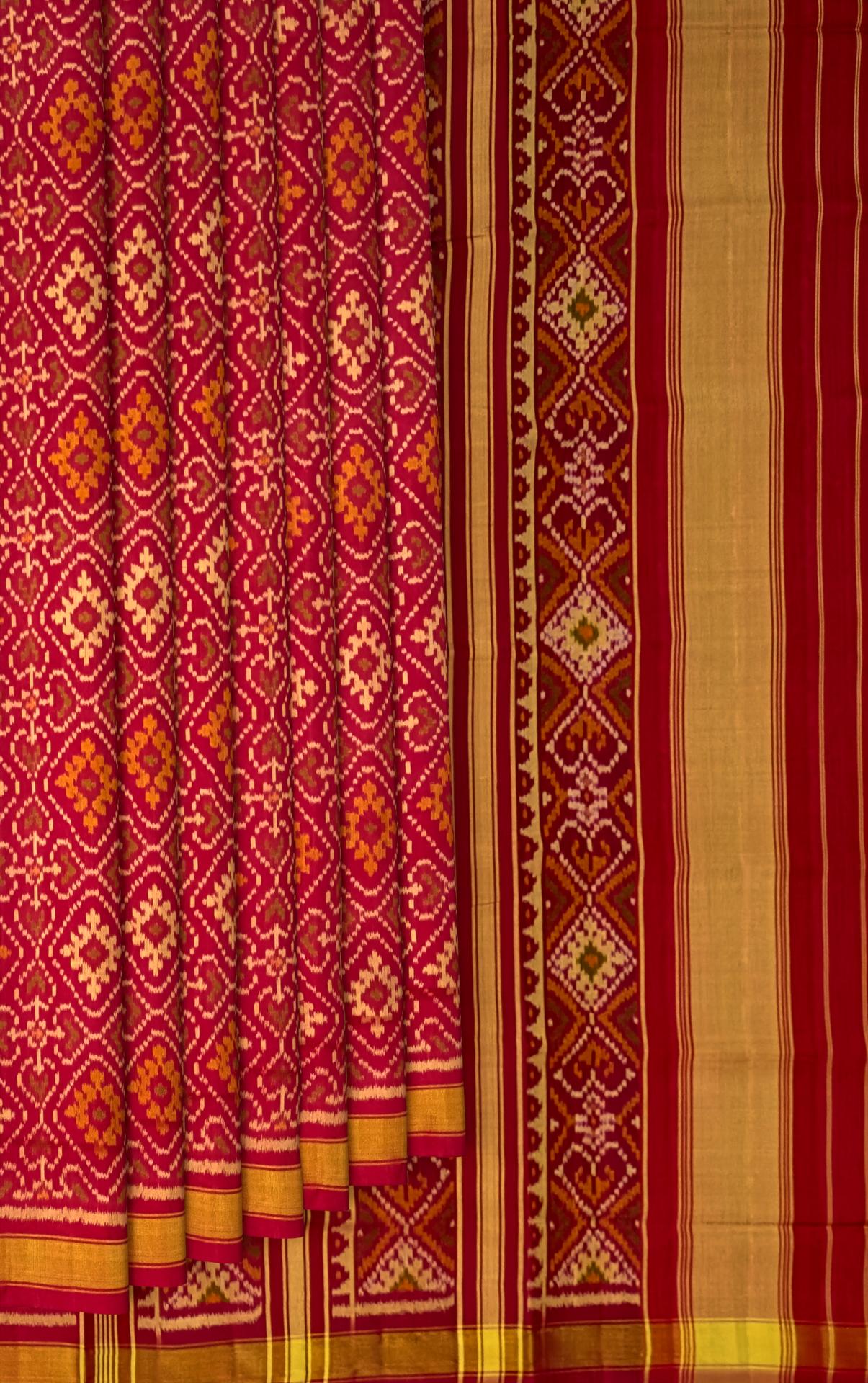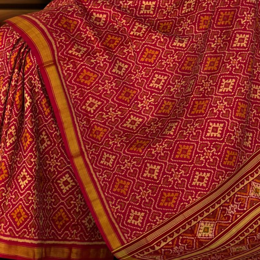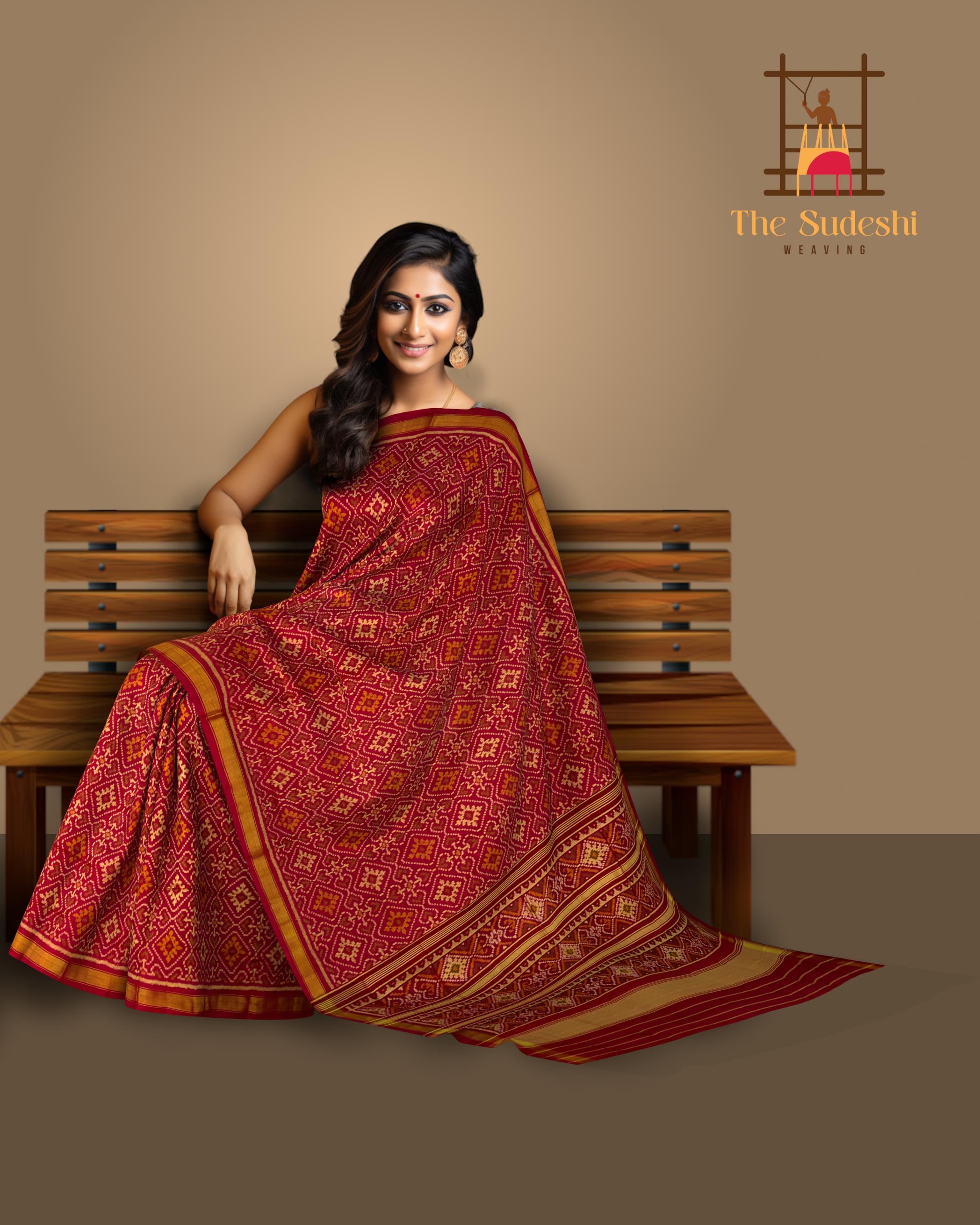Discover the elegance of the Maroon Pan Chanda Patola Saree, a stunning representation of Indian heritage. Crafted using the single ikat technique, this saree features the Pan Chanda design, showcasing intricate patterns and luxurious motifs. The deep maroon color enhances the beauty of the detailed designs that flow from the body to the pallu. The semi-lustrous finish adds a touch of modern elegance, making it a versatile choice for various occasions. Ideal for grand weddings, cultural celebrations, and formal gatherings, this saree is perfect for the modern NRI woman who values her Indian heritage. It represents centuries of artisan tradition, making each piece a unique work of art. Celebrate your heritage with the Maroon Pan Chanda Patola Saree, a timeless addition to your wardrobe that exudes tradition and elegance.