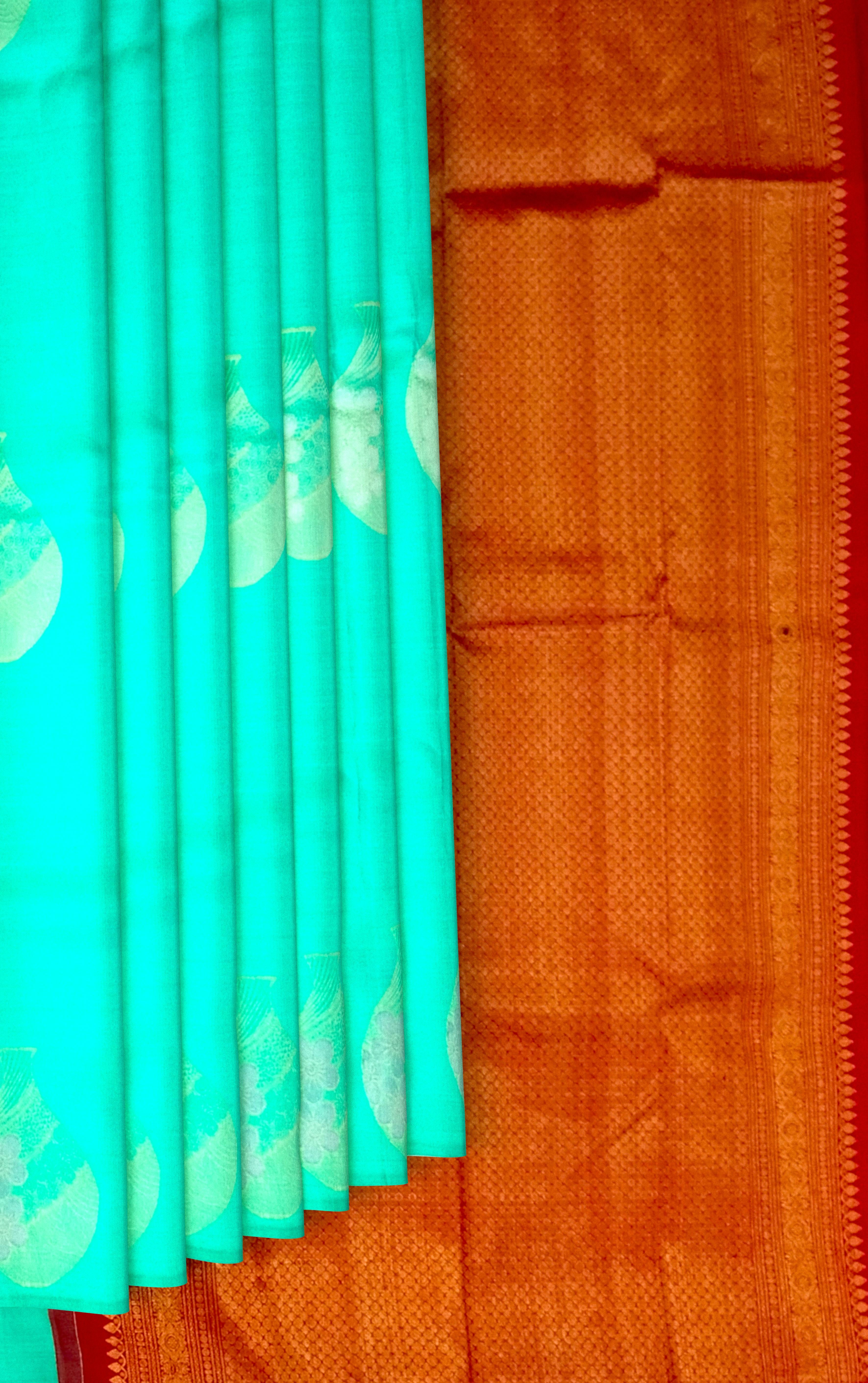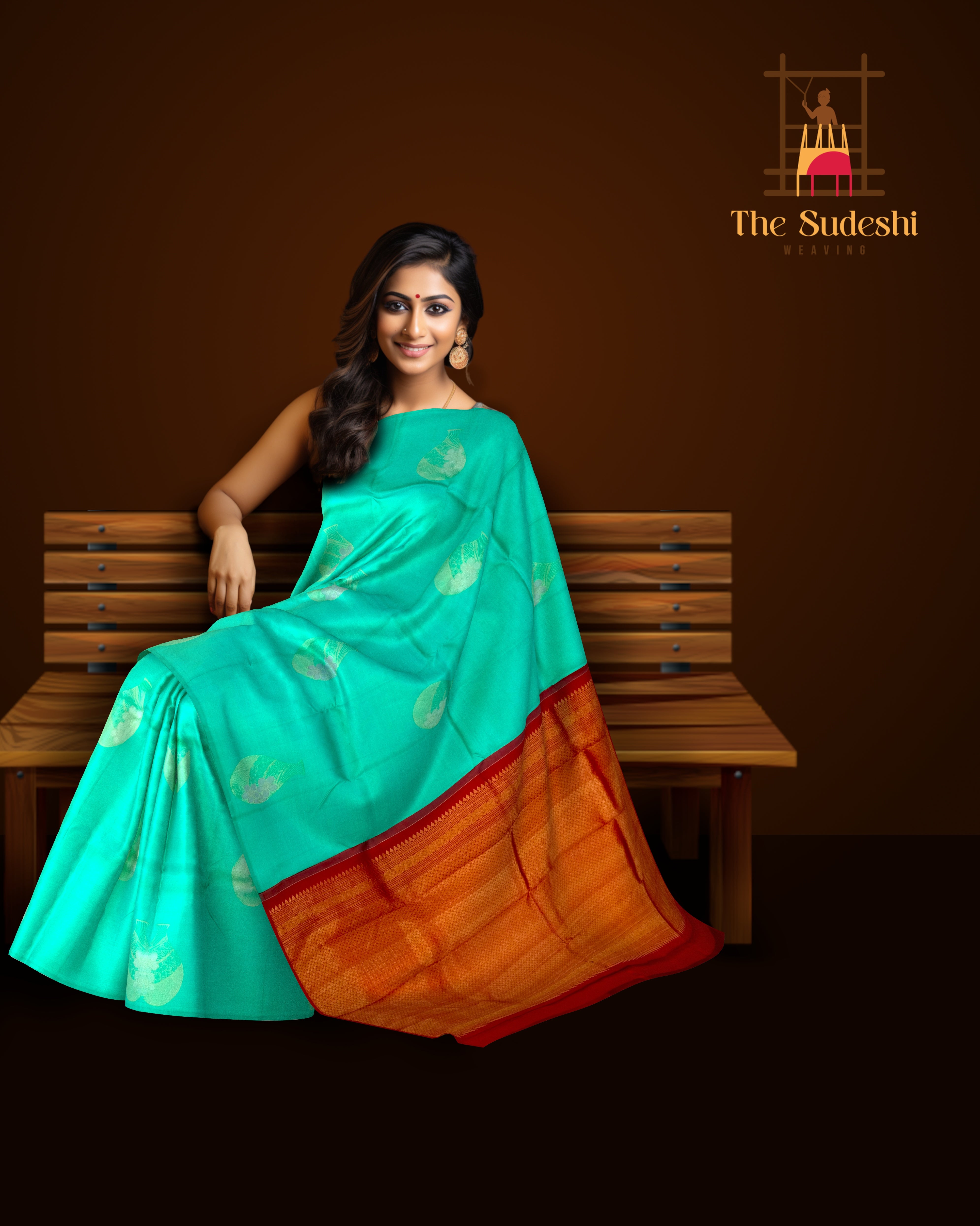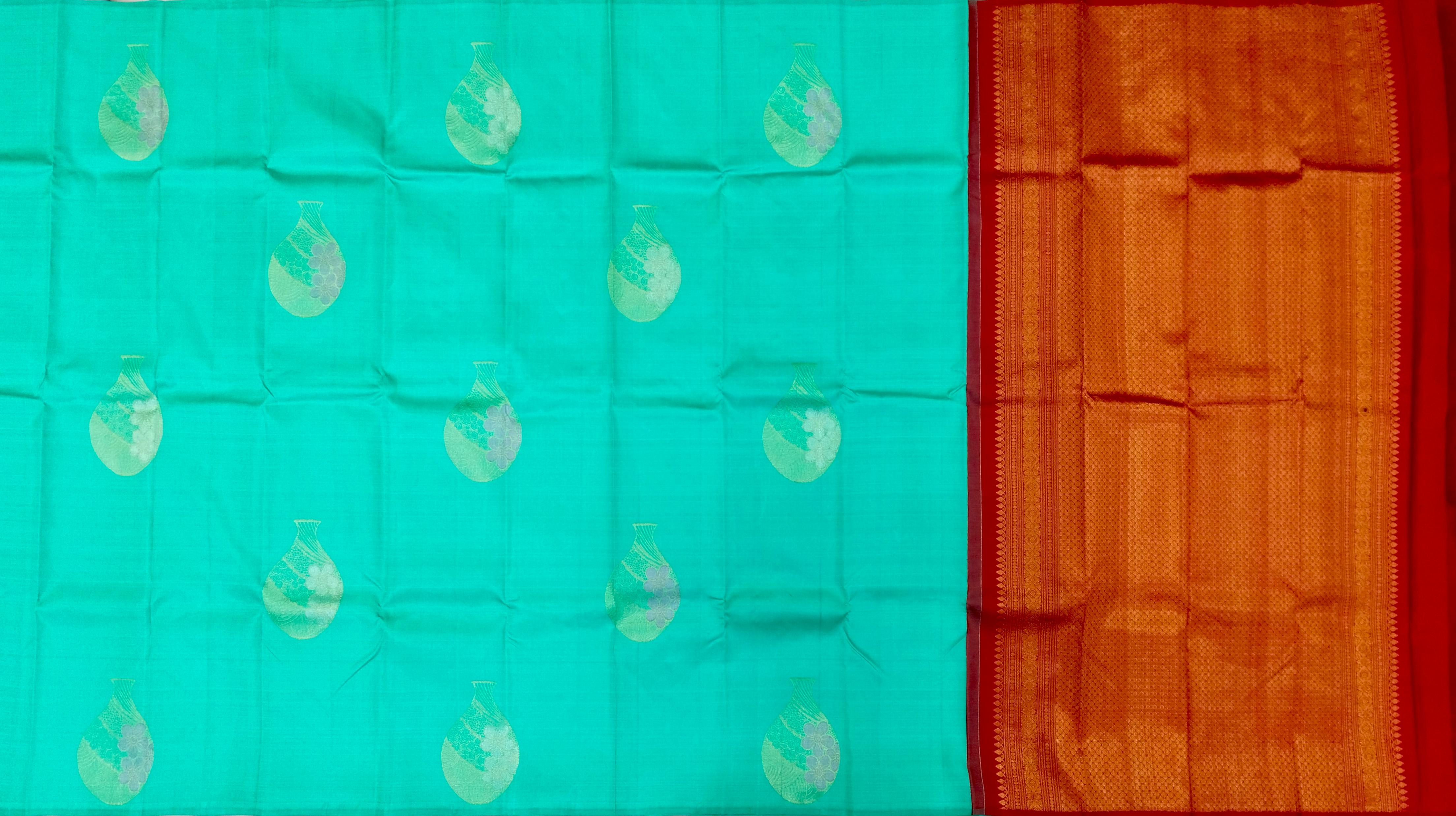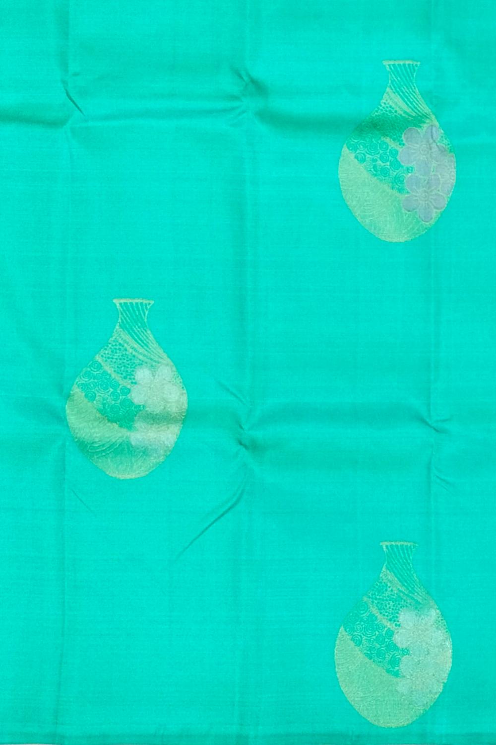 Drape yourself in elegance with this stunning turquoise blue Kanchipuram silk saree, exquisitely designed with intricate motifs woven seamlessly into the fabric. The borderless design enhances the continuity of the weave, allowing the rich motifs to take center stage. The vibrant contrast of the red pallu and blouse adds an extra layer of sophistication, making this saree a striking choice for special occasions.