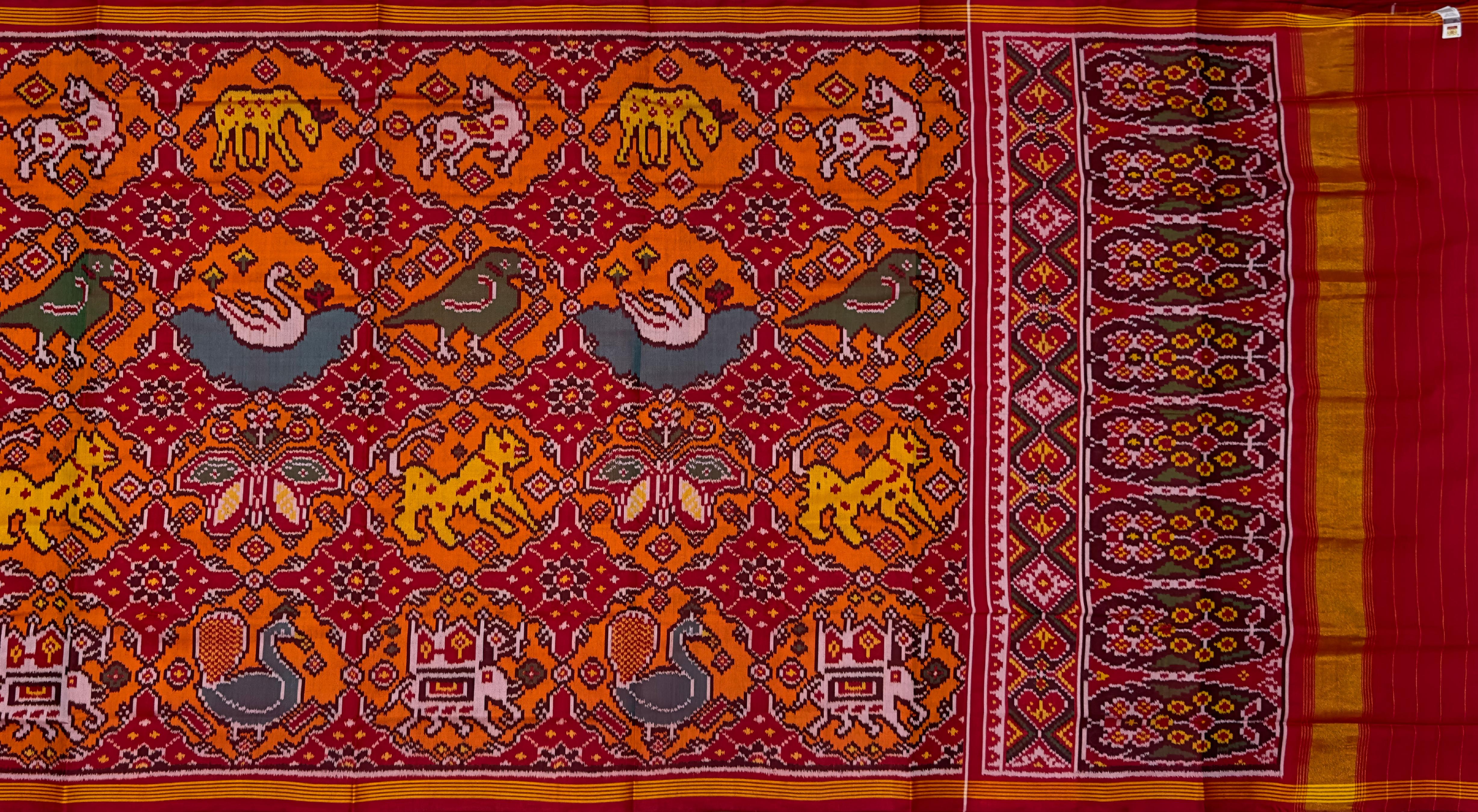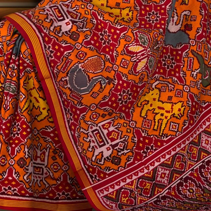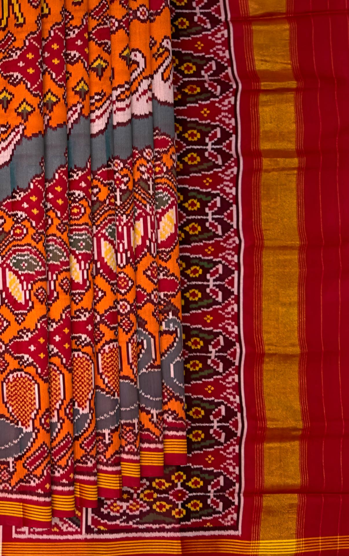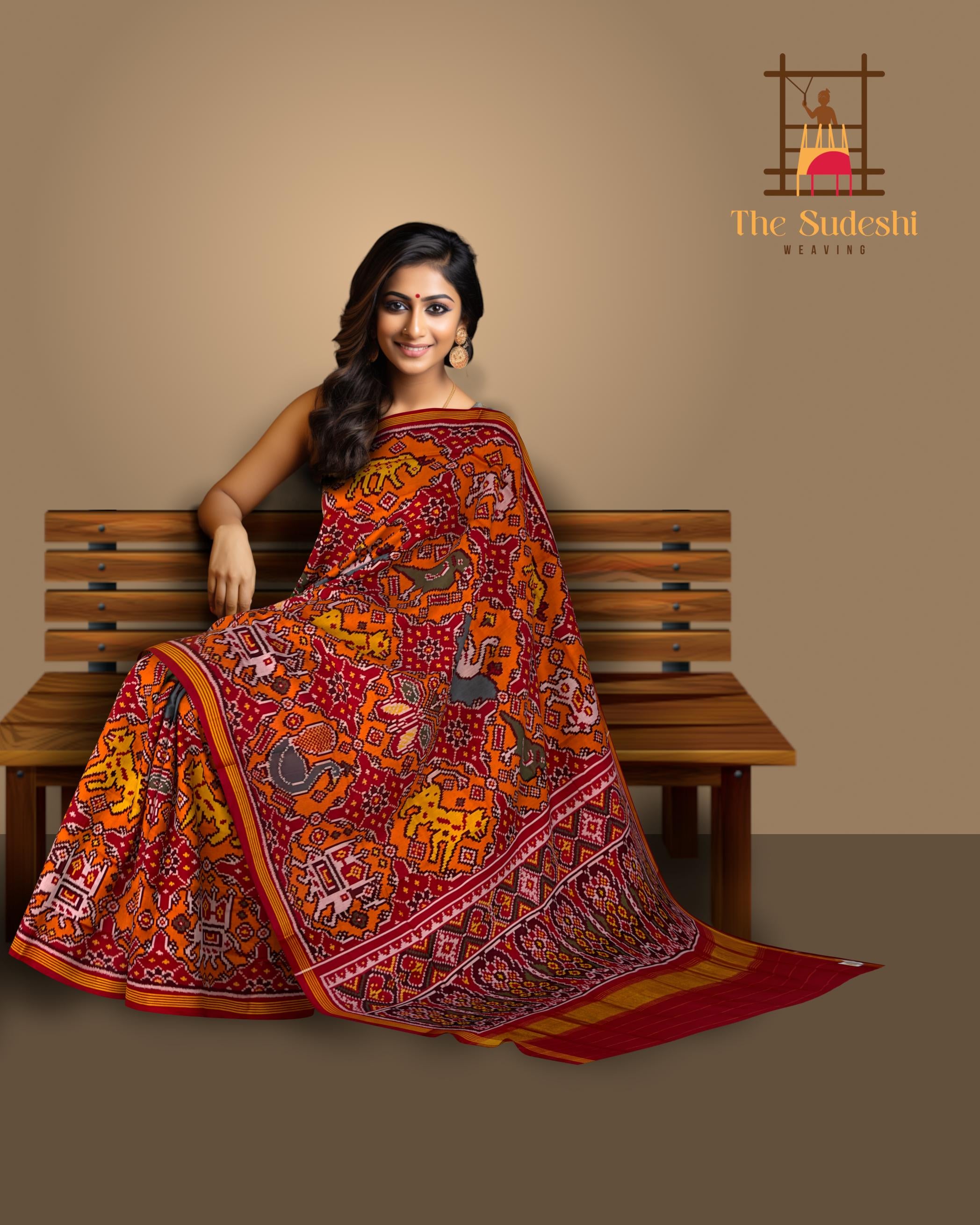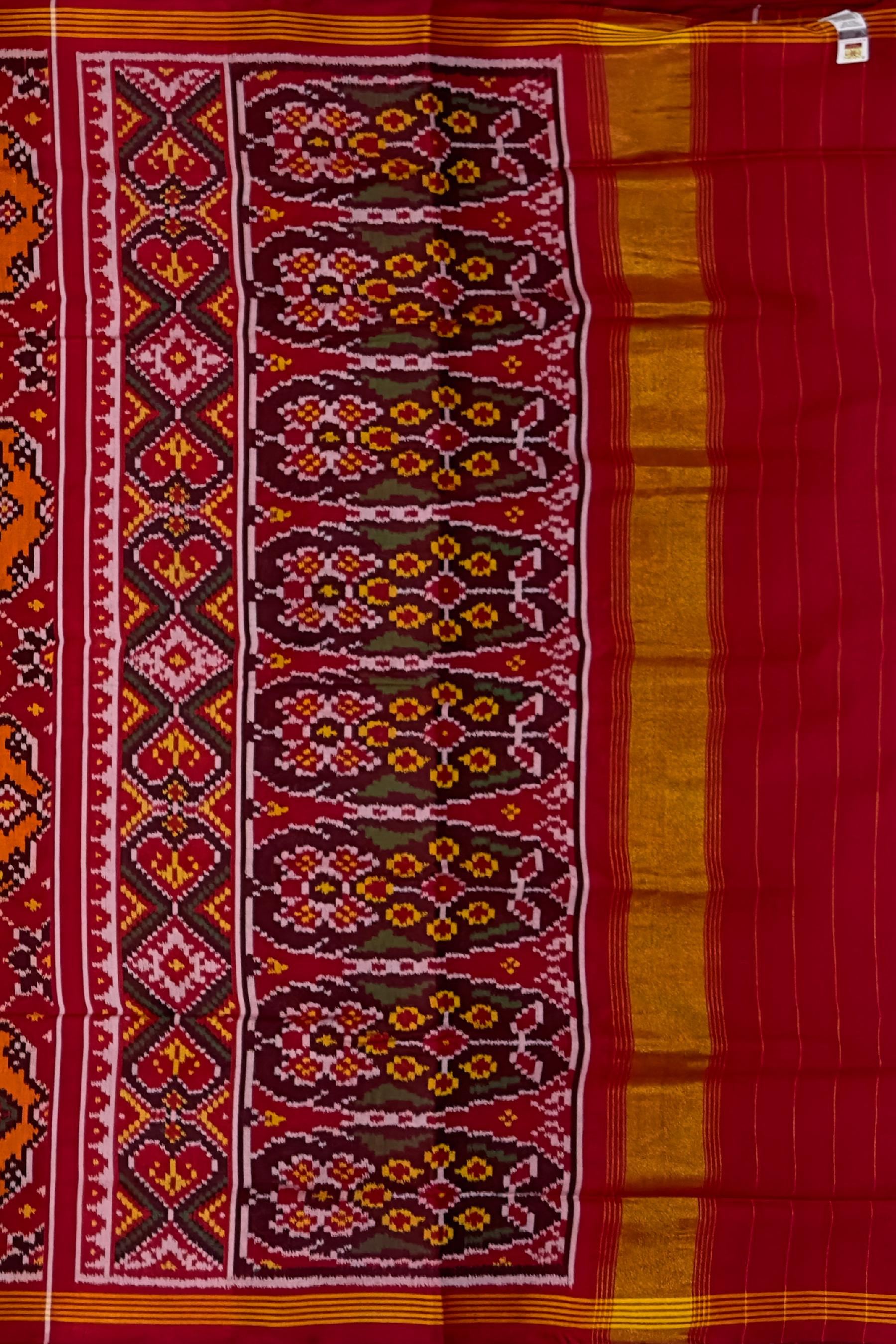 The Mixed Orange Tal 8 Figure Semi Patan Saree is a bold statement piece, ideal for those who value standout traditional attire. Its orange and maroon palette is perfect for major cultural festivities.