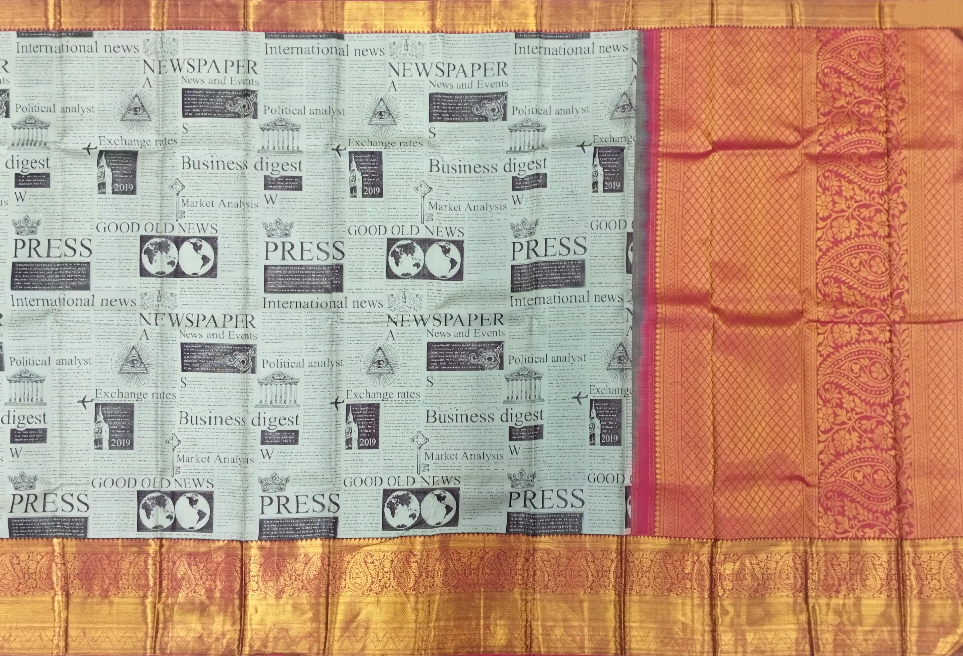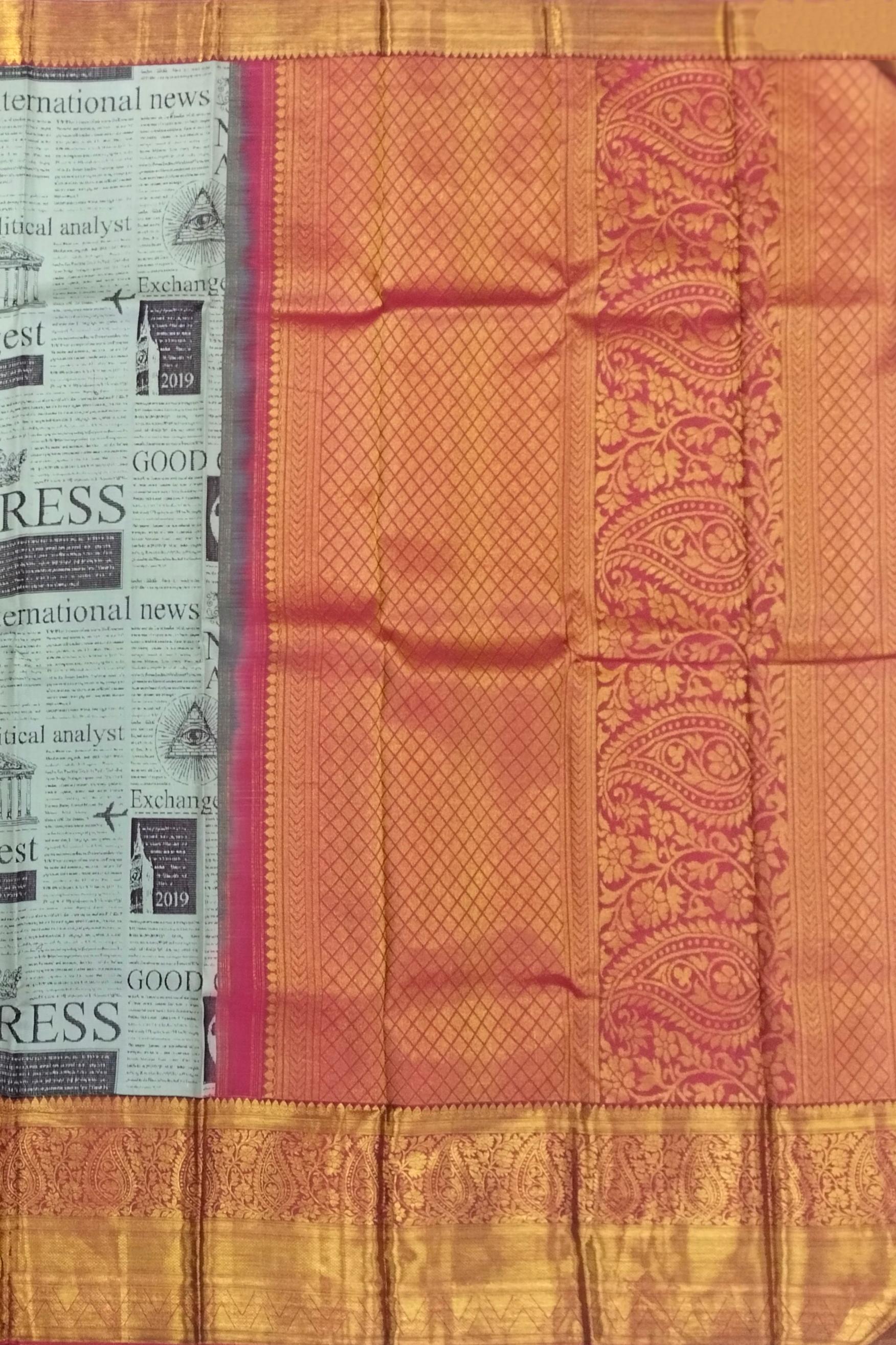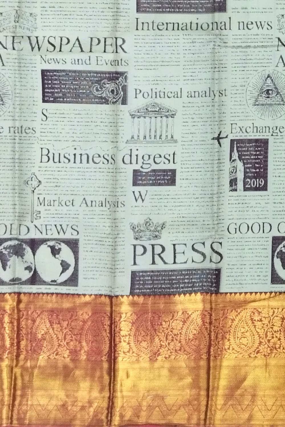 Newspaper prints in textiles are a statement of individuality and storytelling, making this saree a unique conversation piece. The seamless weaving of traditional silk with digital artistry showcases the innovation of Kanchipuram weavers, blending centuries-old craftsmanship with modern aesthetics. The contrast red details enhance its vibrancy, making it a standout choice.
