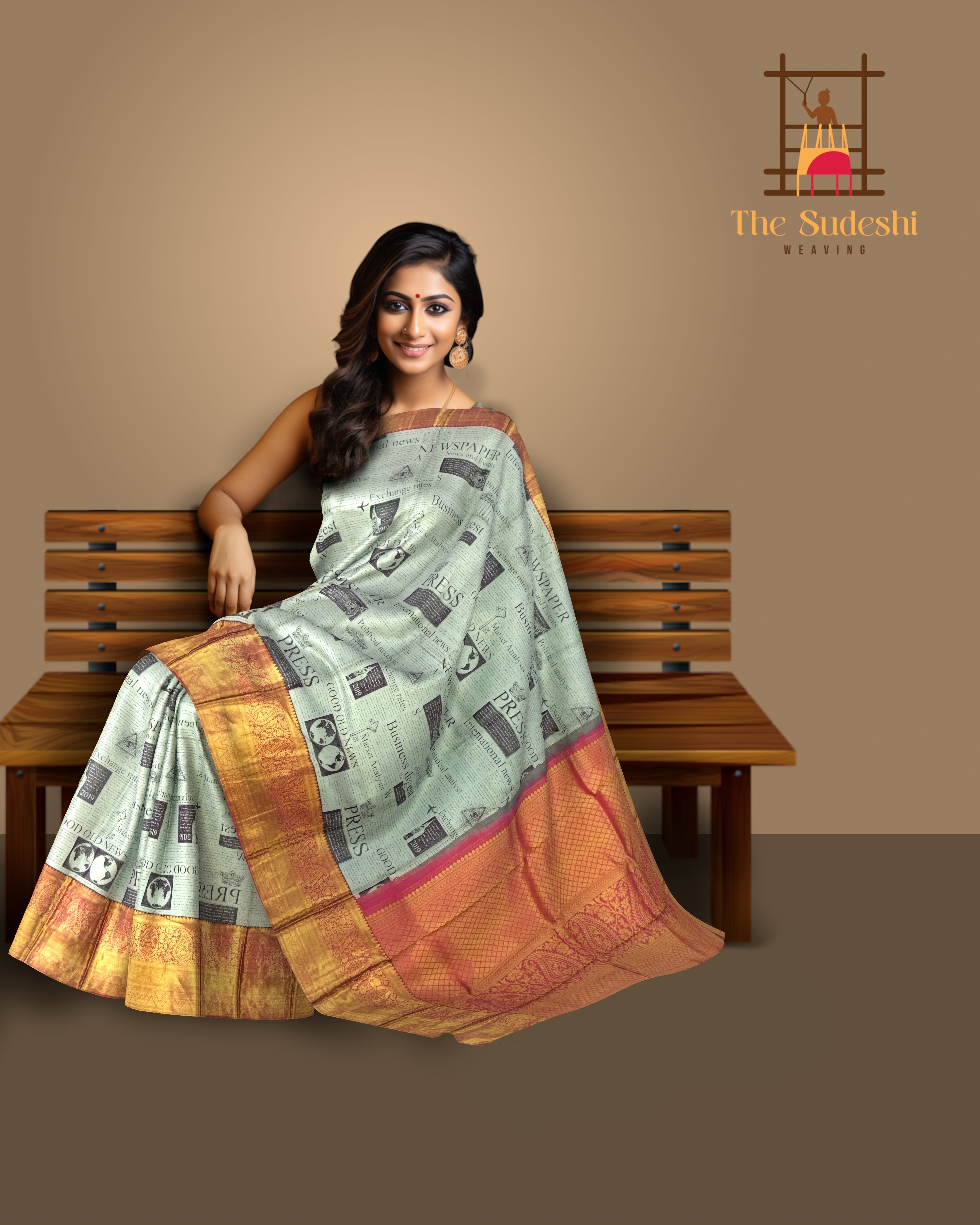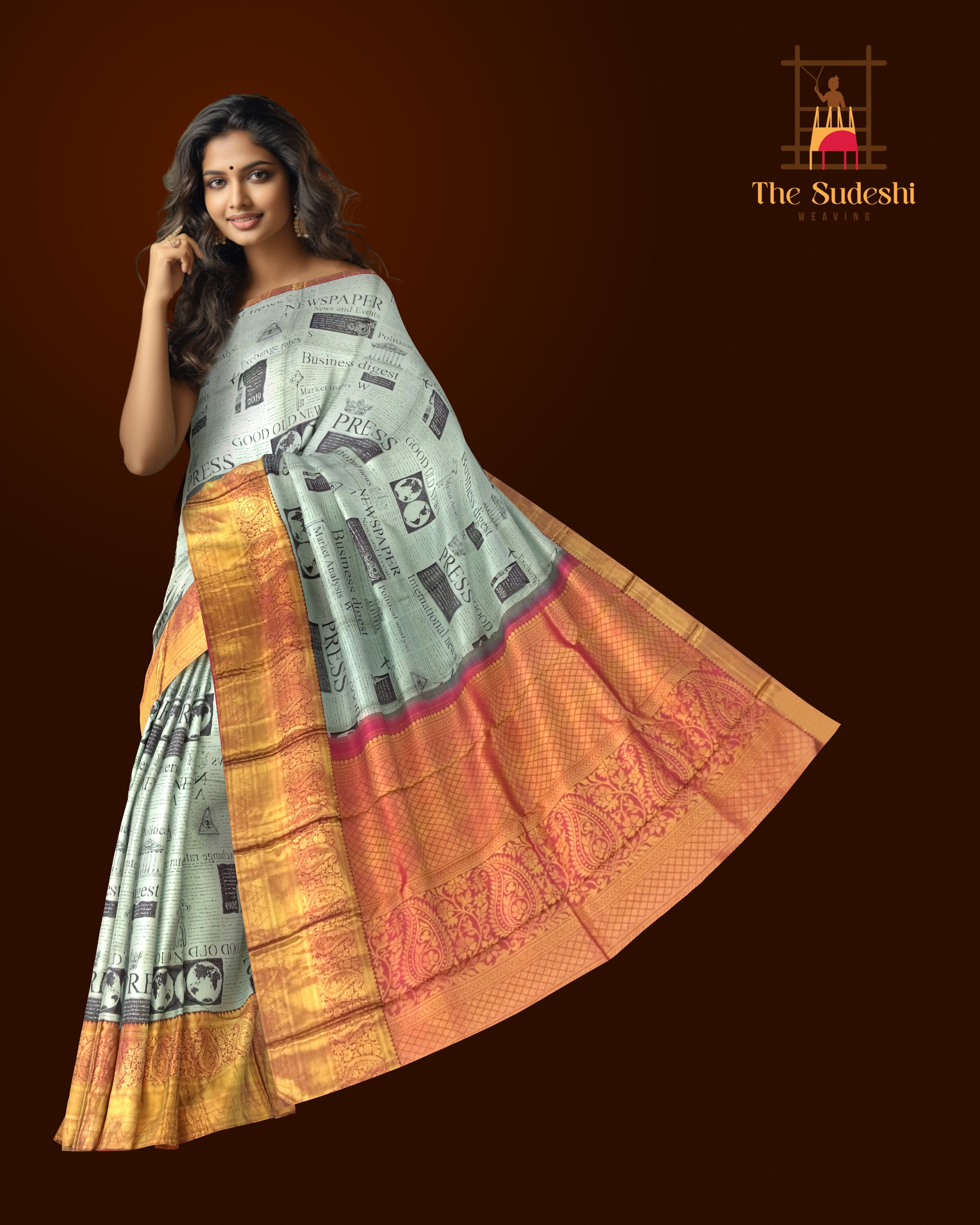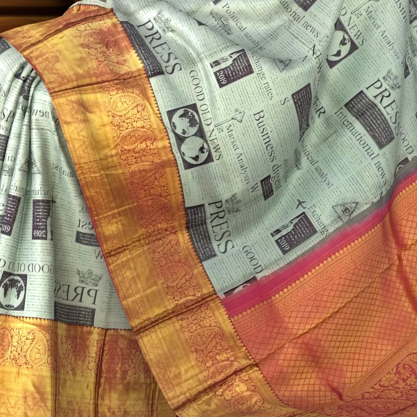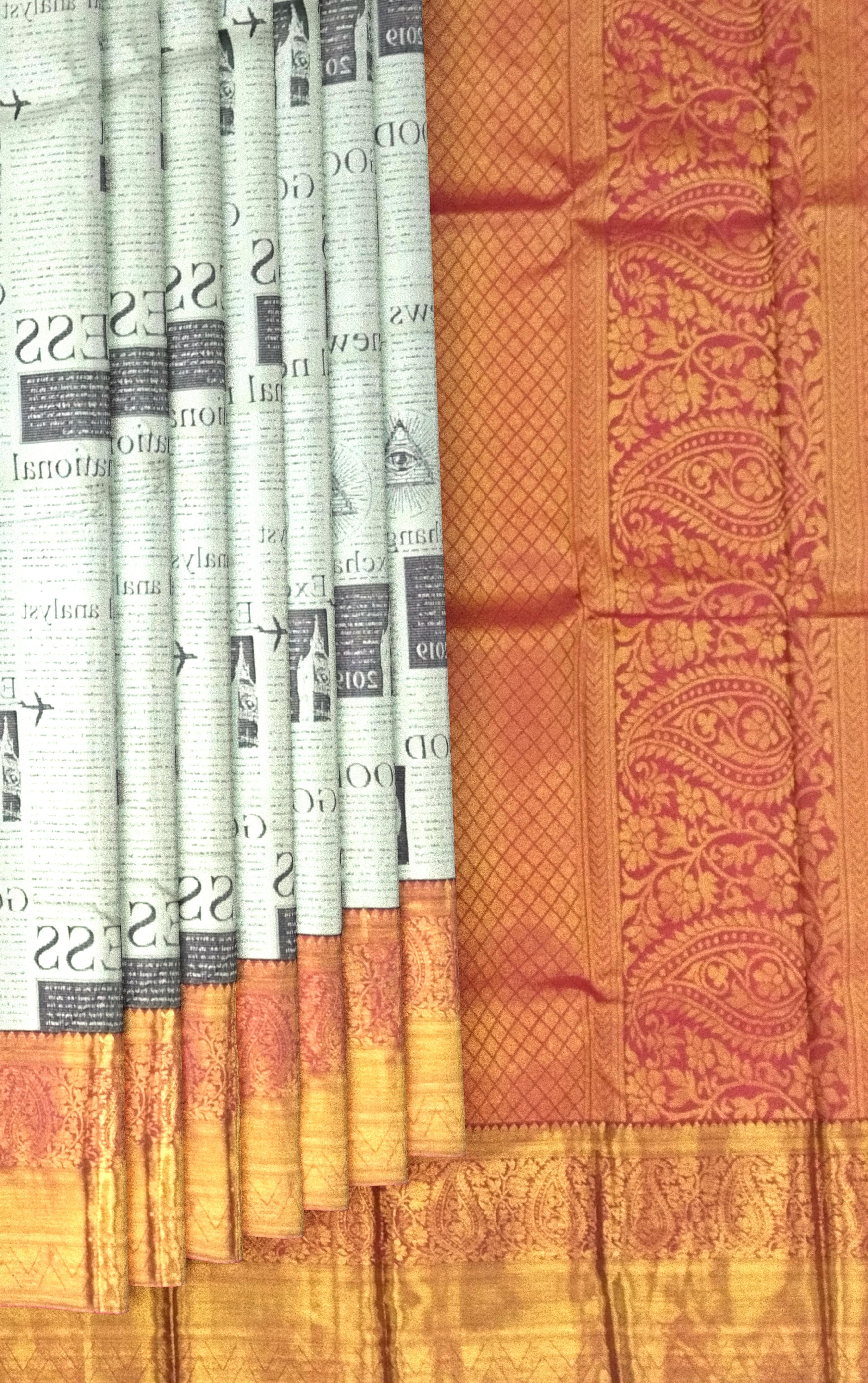 Newspaper prints in textiles are a statement of individuality and storytelling, making this saree a unique conversation piece. The seamless weaving of traditional silk with digital artistry showcases the innovation of Kanchipuram weavers, blending centuries-old craftsmanship with modern aesthetics. The contrast red details enhance its vibrancy, making it a standout choice.