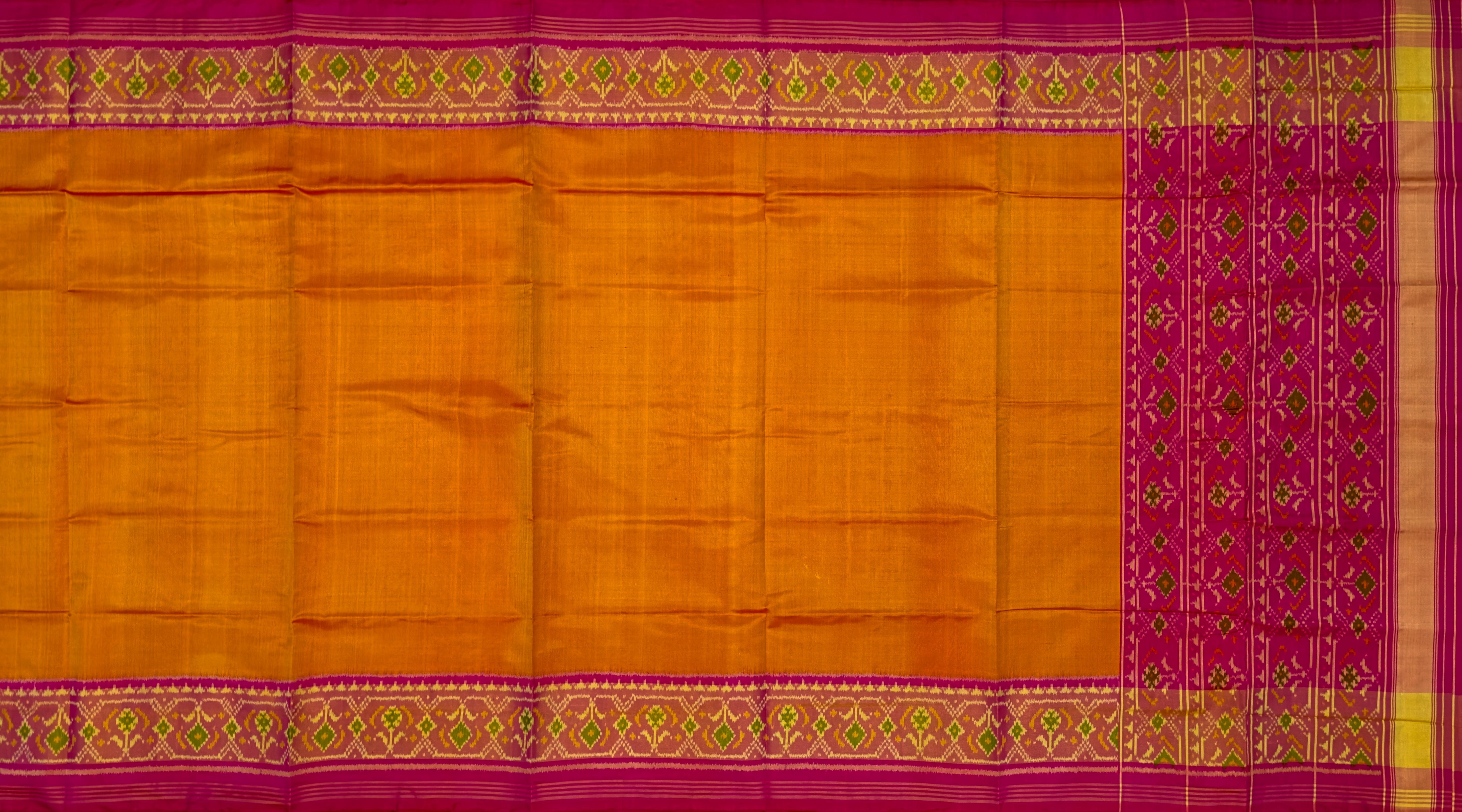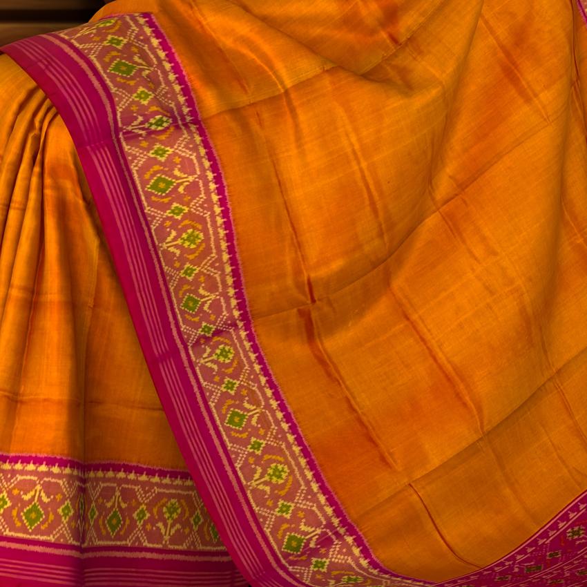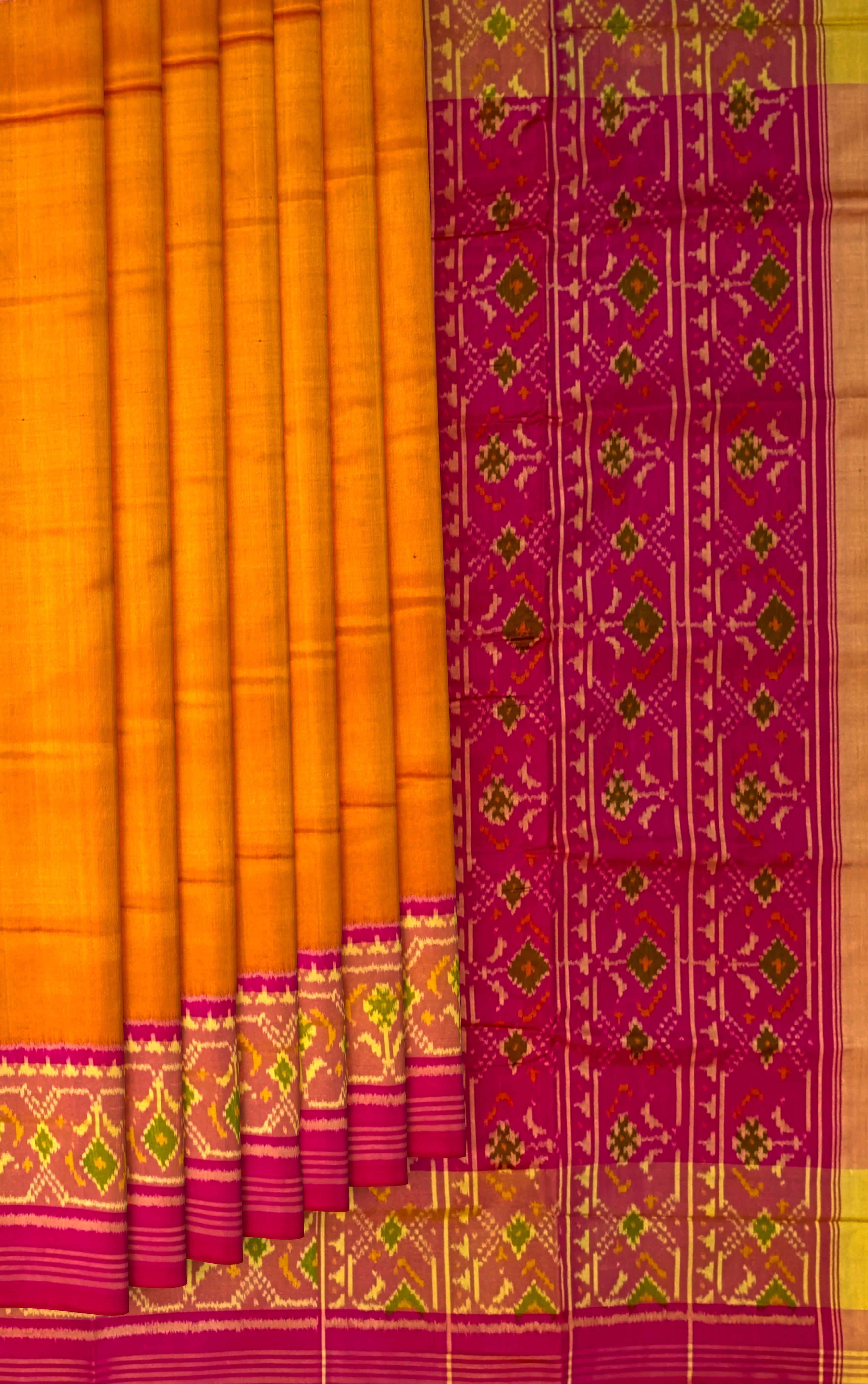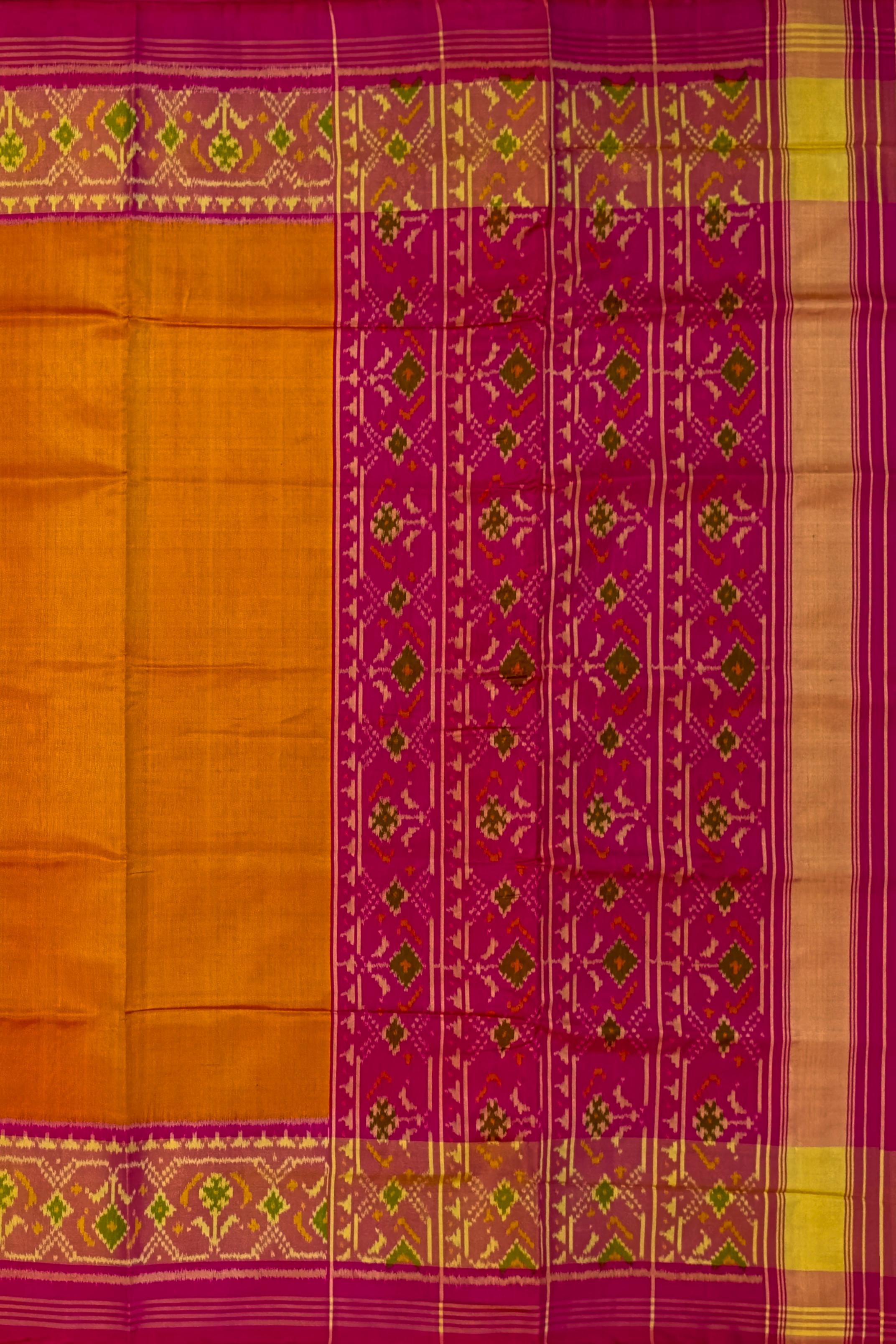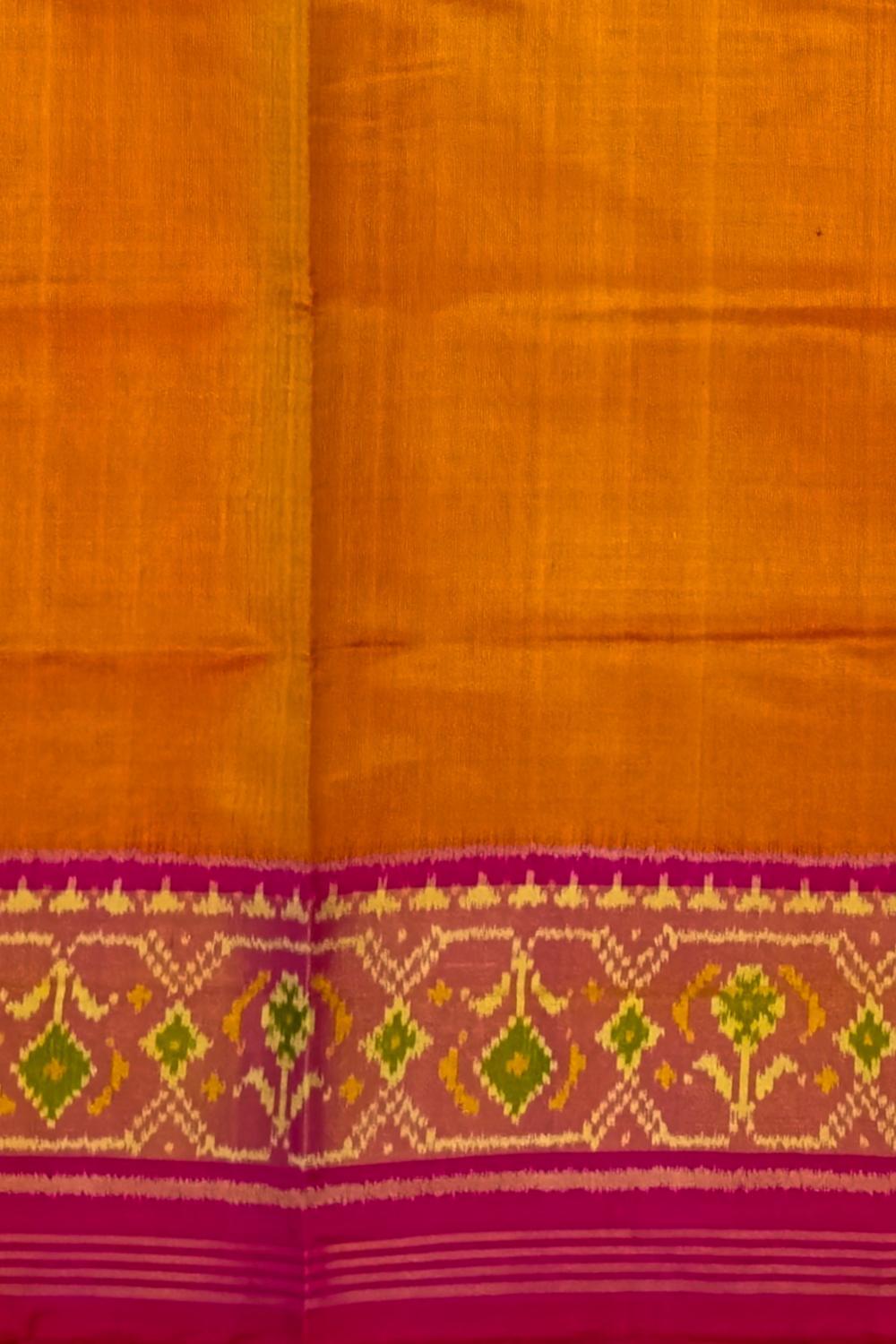 The Mustard Yellow Galo Border Pallu Pink Ghughro Design Single Ikat Rajkot Patola Saree is a celebration of vibrant color and intricate design. The bright mustard yellow base, adorned with the traditional Galo motifs, exudes femininity and grace. The detailed work on the border and pallu showcases the artistry that goes into creating each Rajkot Patola saree, making it a timeless piece of wearable art.