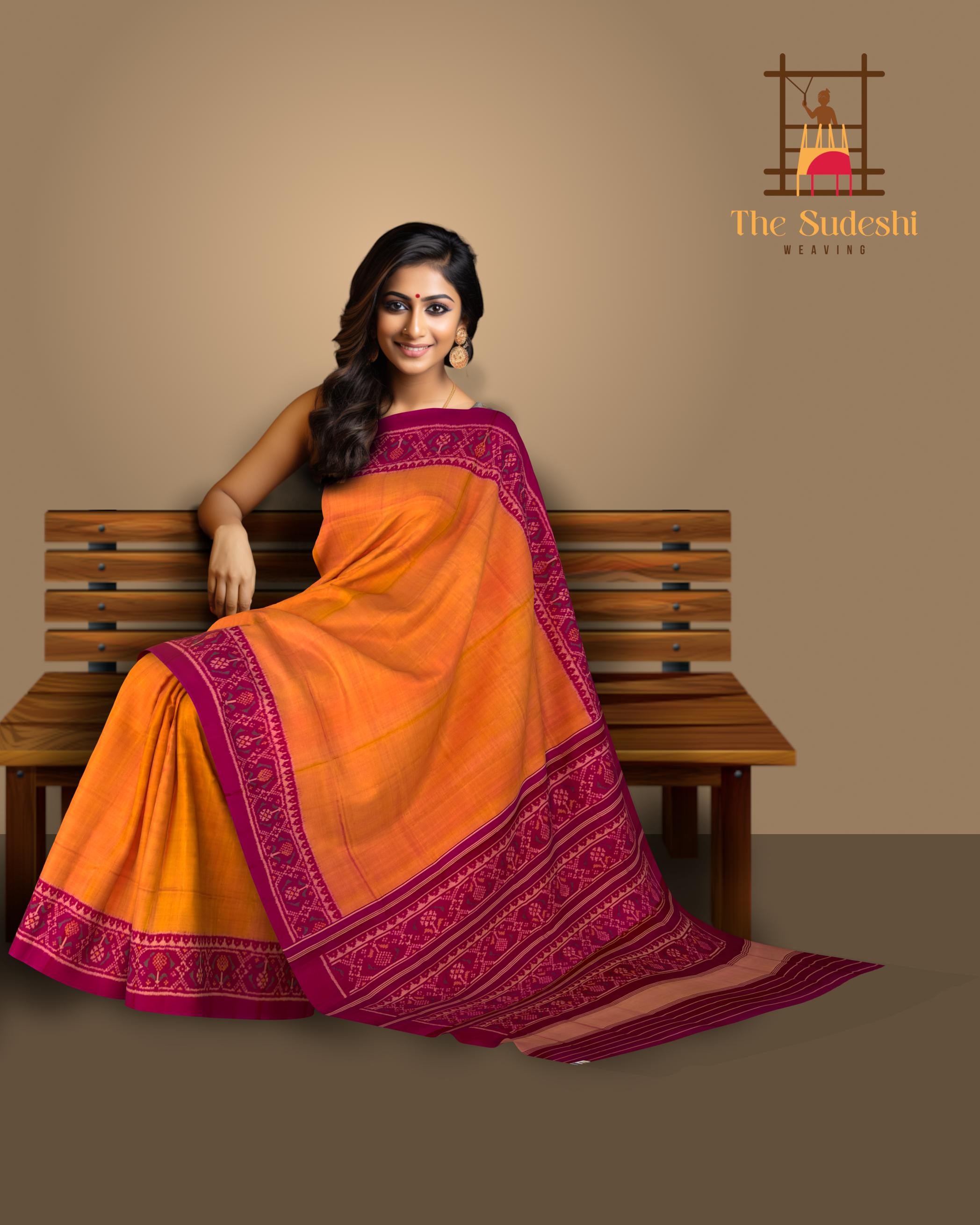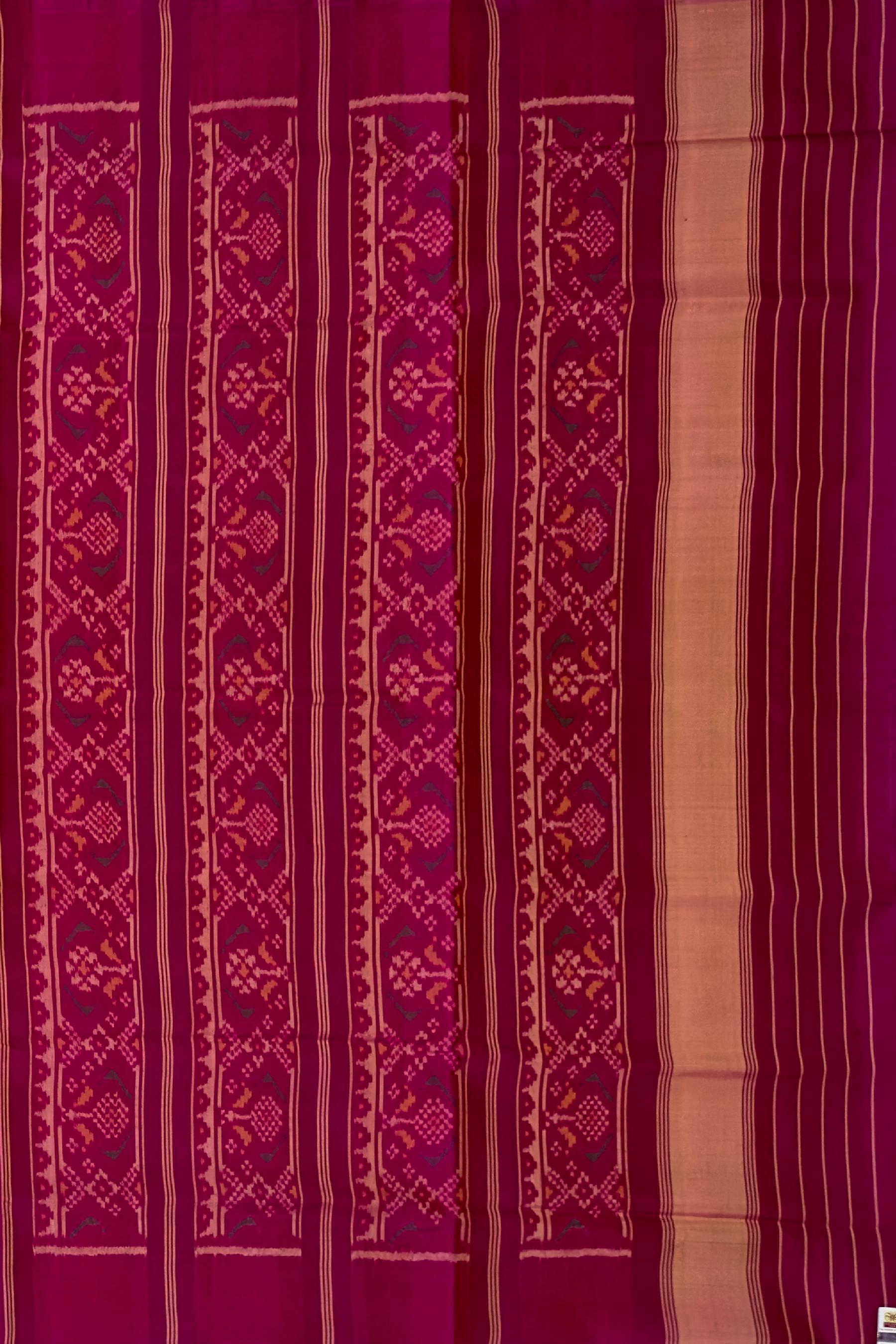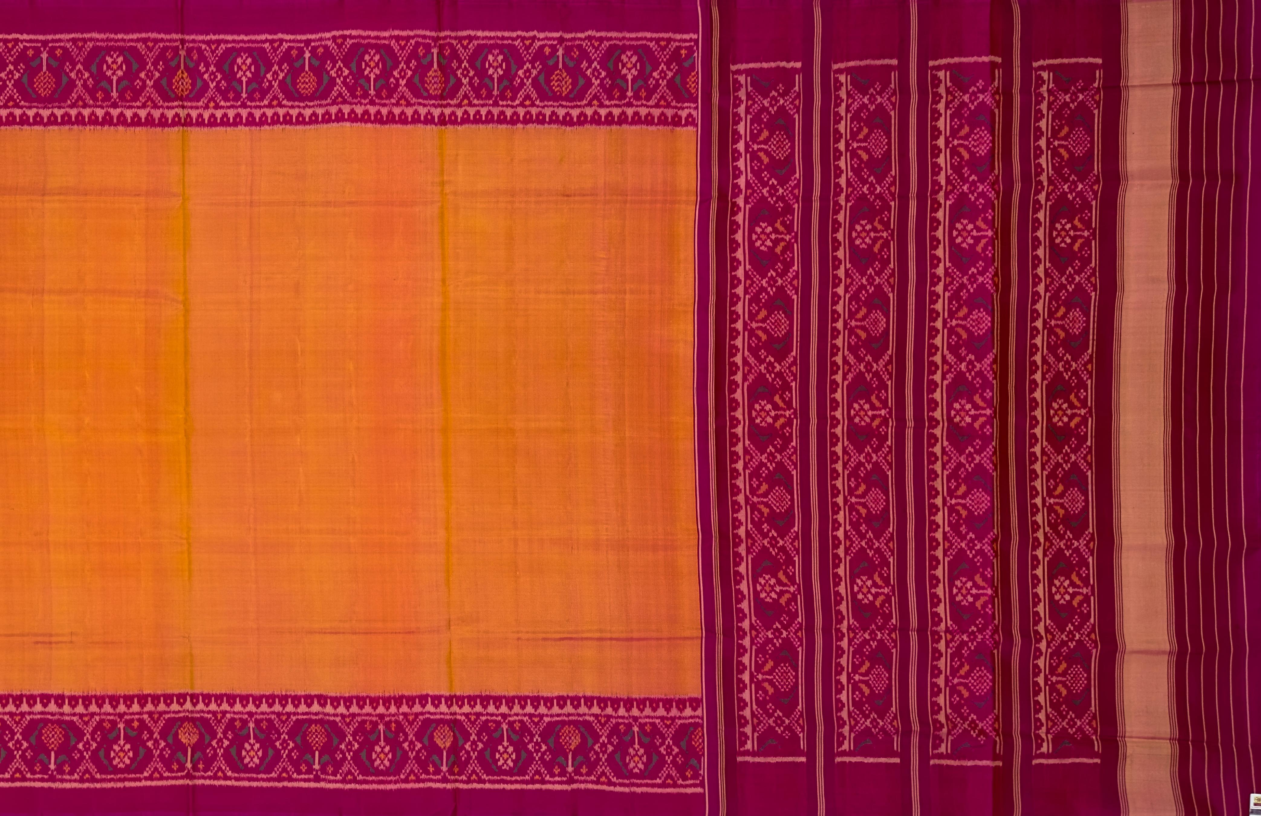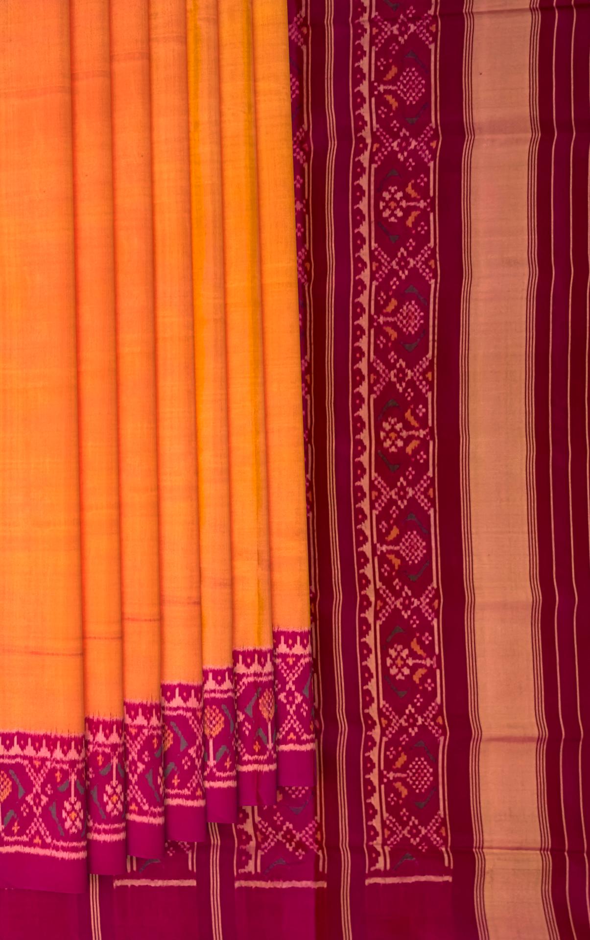 The Mustard Yellow Galo Regular Rajkot Patola Saree with pink accents offers a vibrant look. Ideal for festive seasons and special gatherings, it combines traditional art with festive colors.