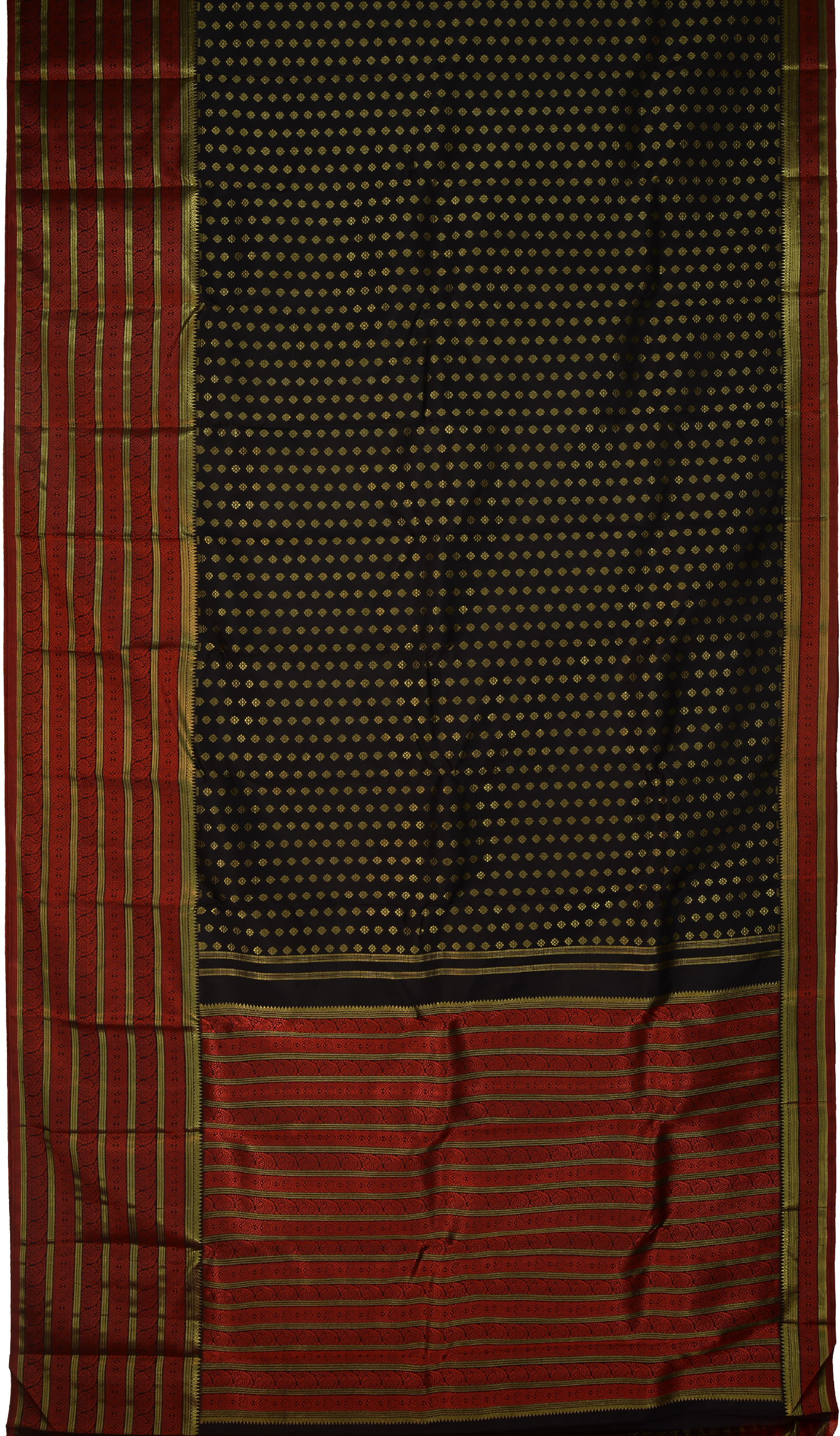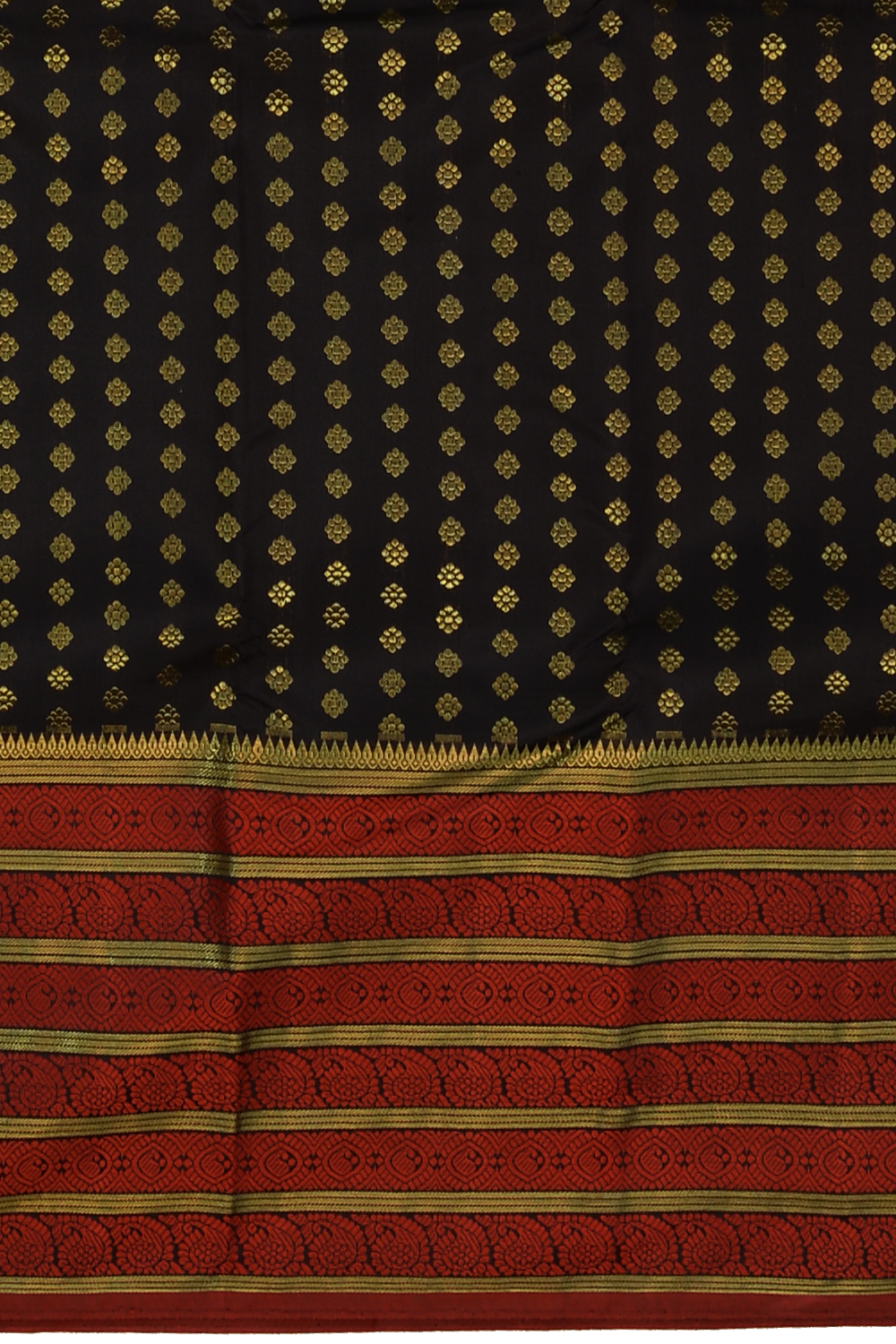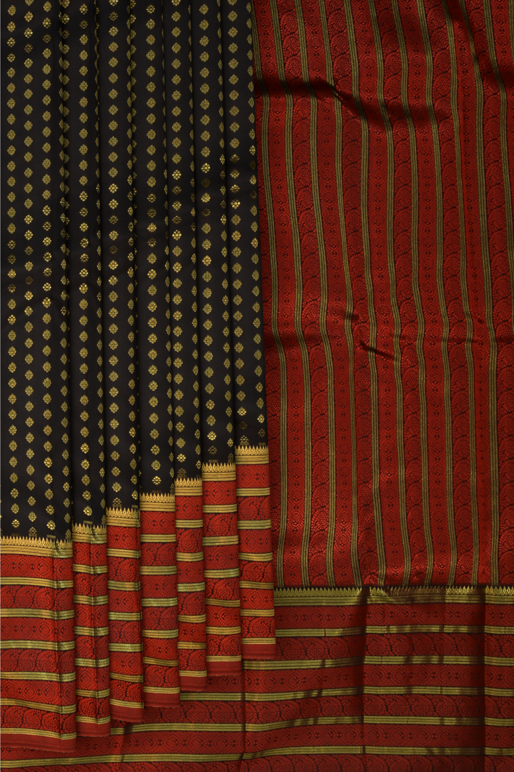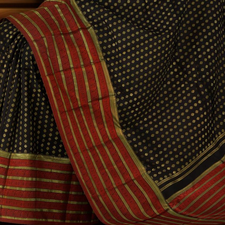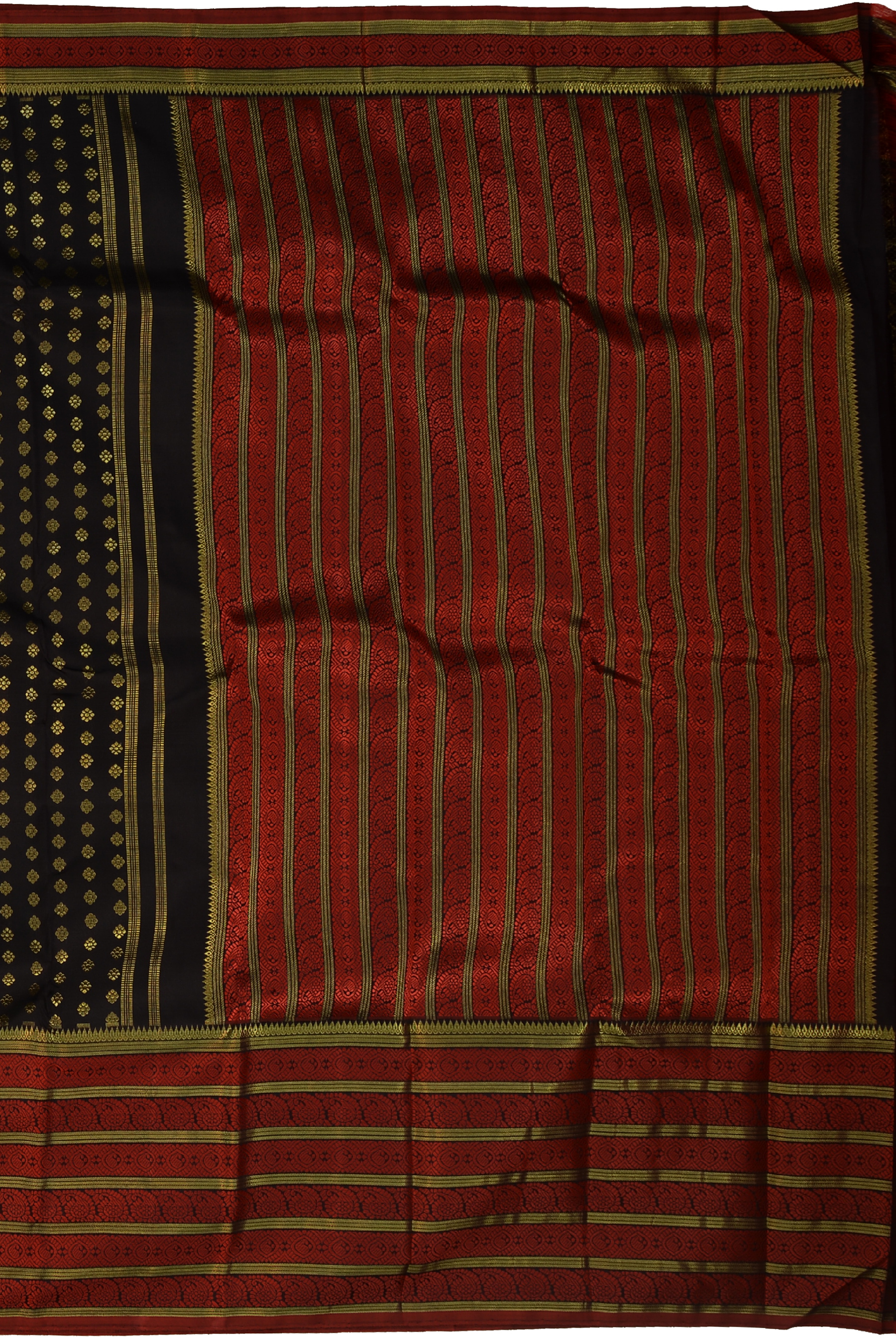 Step into the enigmatic world of the night with this black Kanchipuram silk saree, a reflection of the mysteries that lie beneath the veil of darkness. Each drape is a journey into tales of midnight soirees and star-crossed lovers.