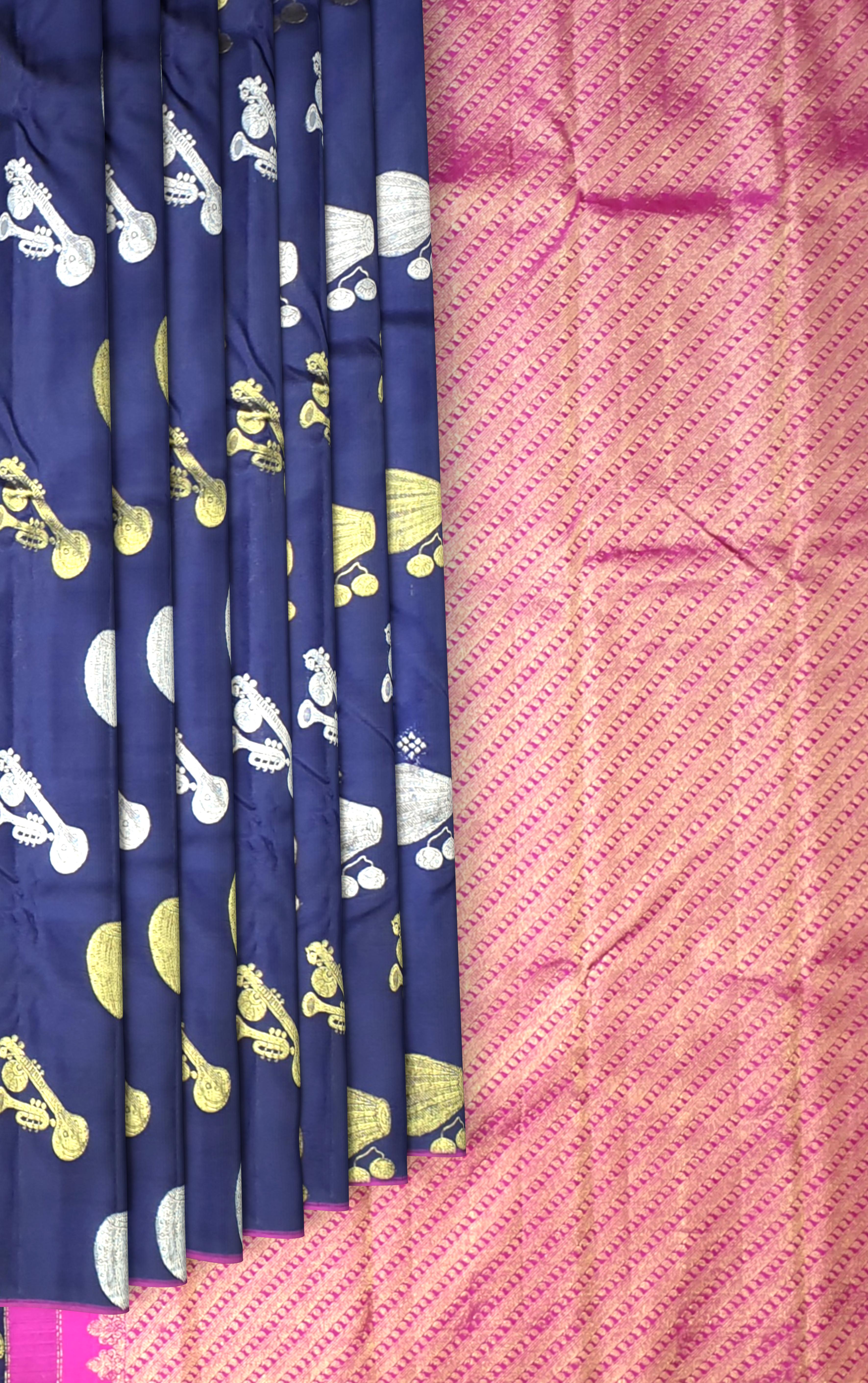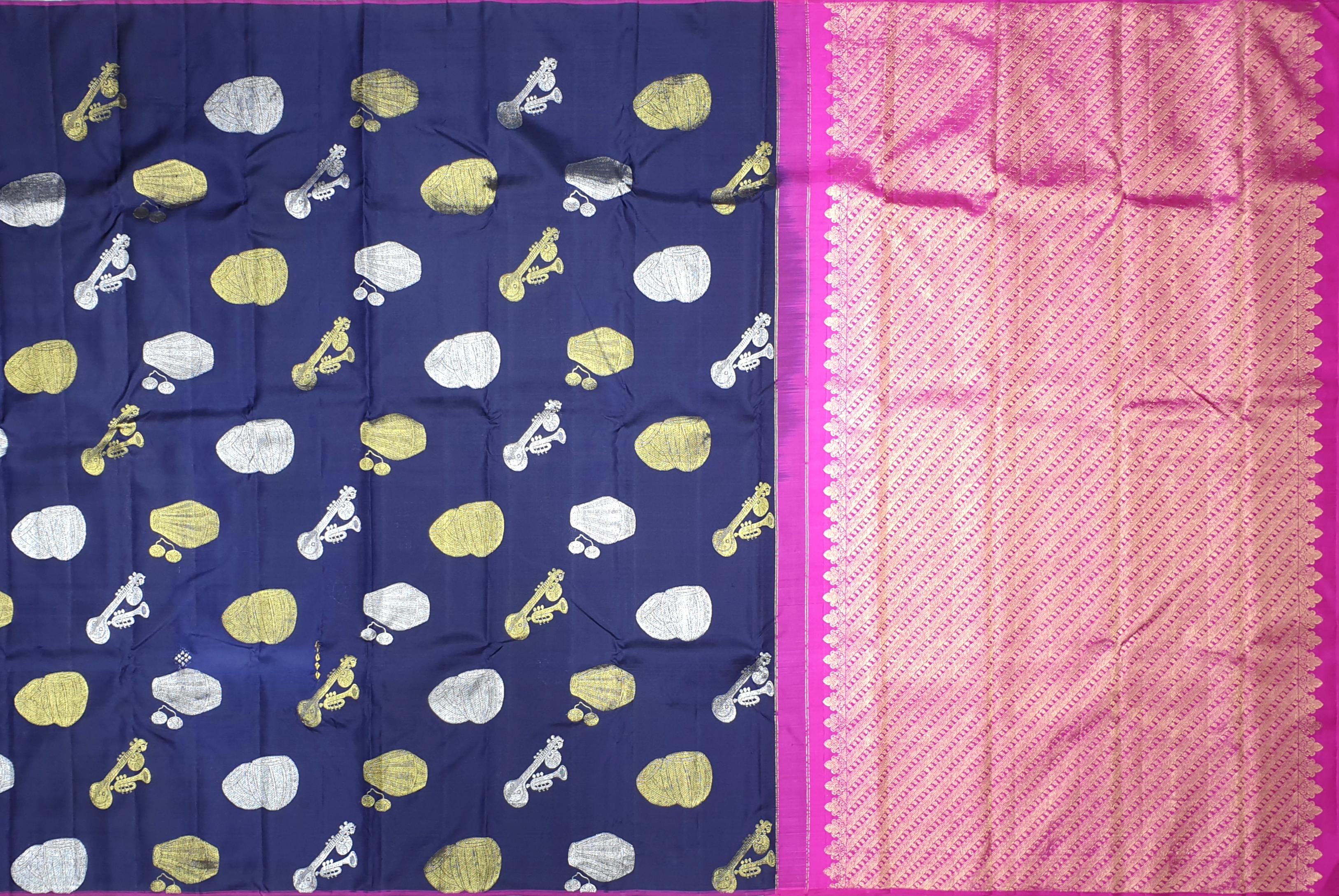 Strike a chord with tradition in this stunning navy blue Kanchipuram silk saree, adorned with intricate motifs of musical instruments. The deep, rich hue serves as the perfect canvas for the delicate zari work, while the borderless design allows the motifs to flow uninterrupted across the saree, giving it a modern flair within a classical setting. The pink pallu and blouse add a soft contrast, enhancing the overall elegance without overpowering the saree’s artistic focus.