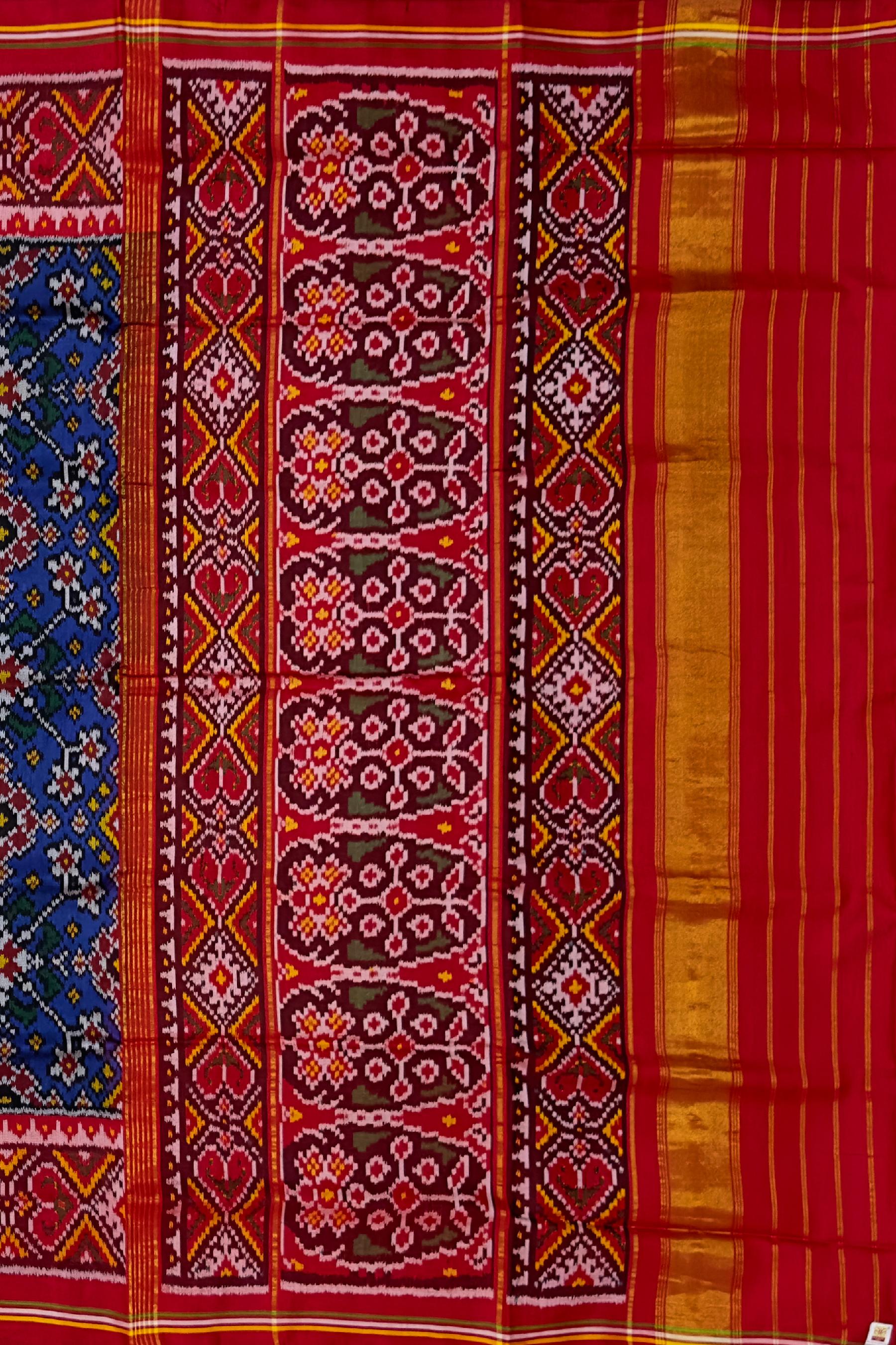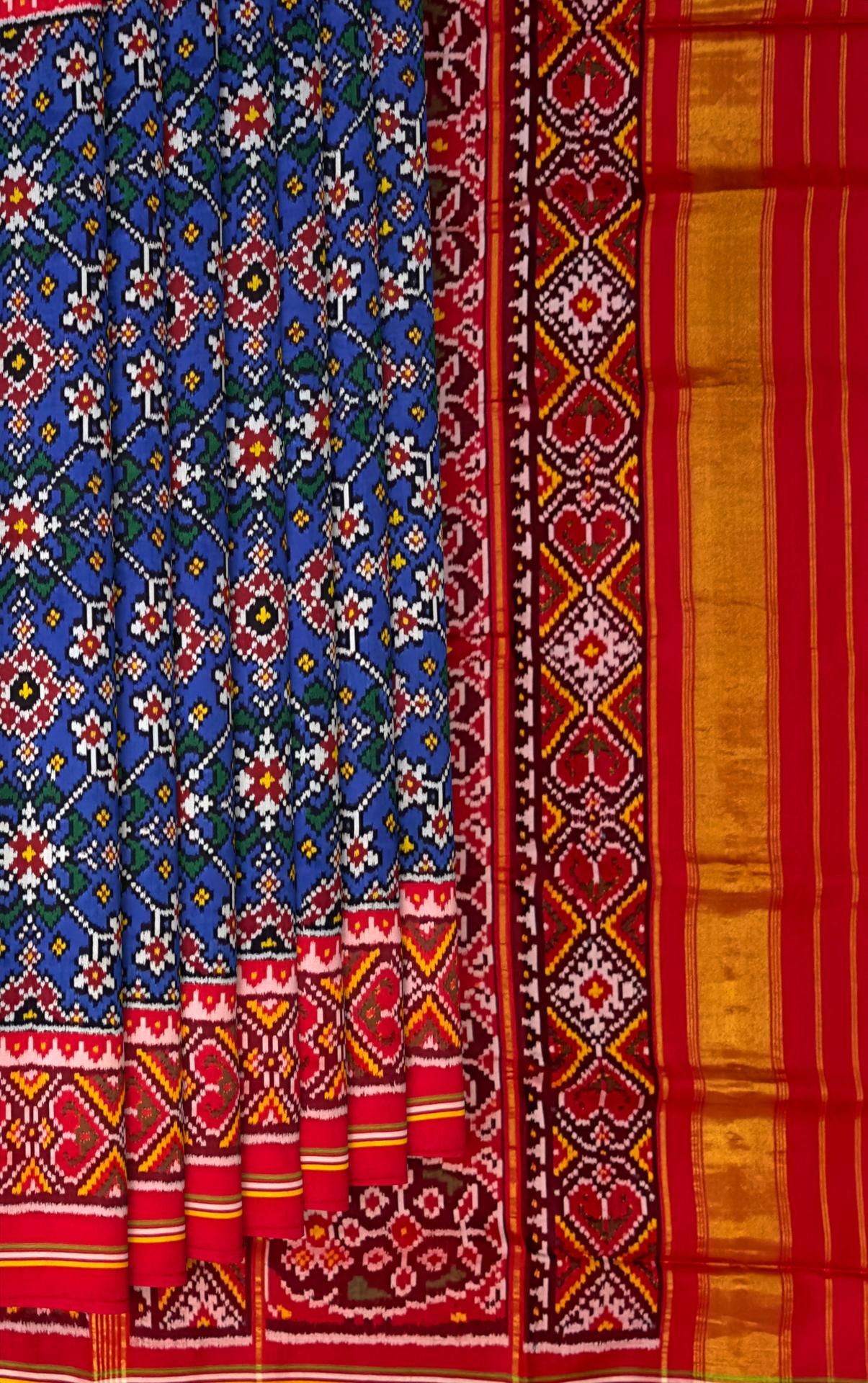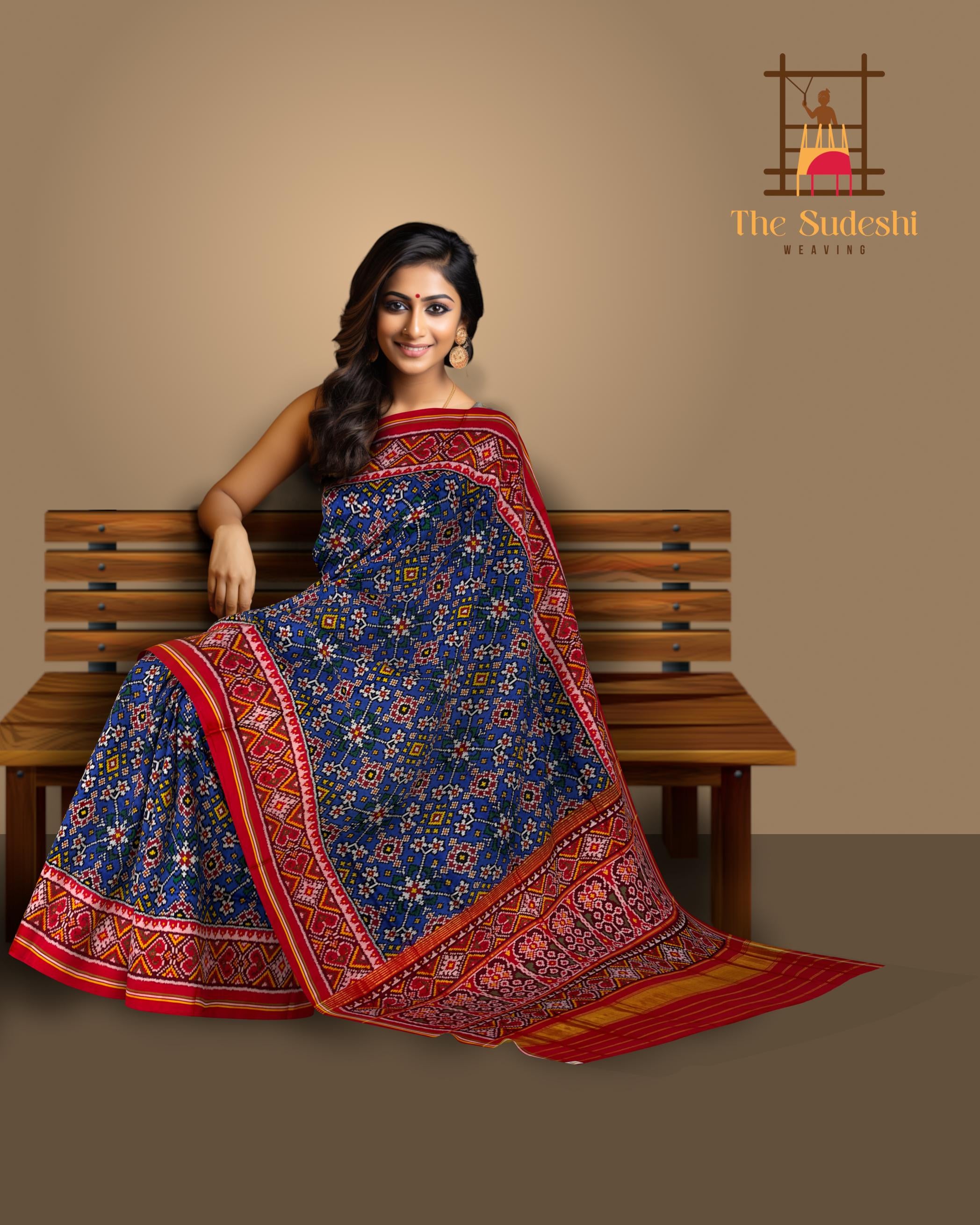Adorn yourself in the Navy Blue Semi Patan Saree, featuring 'Navratna' borders and a maroon pallu. This piece is a testament to enduring artistry, suitable for both festive and formal occasions.