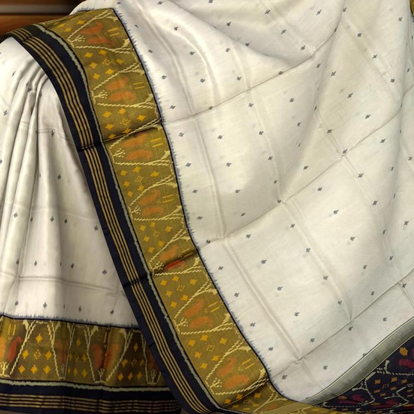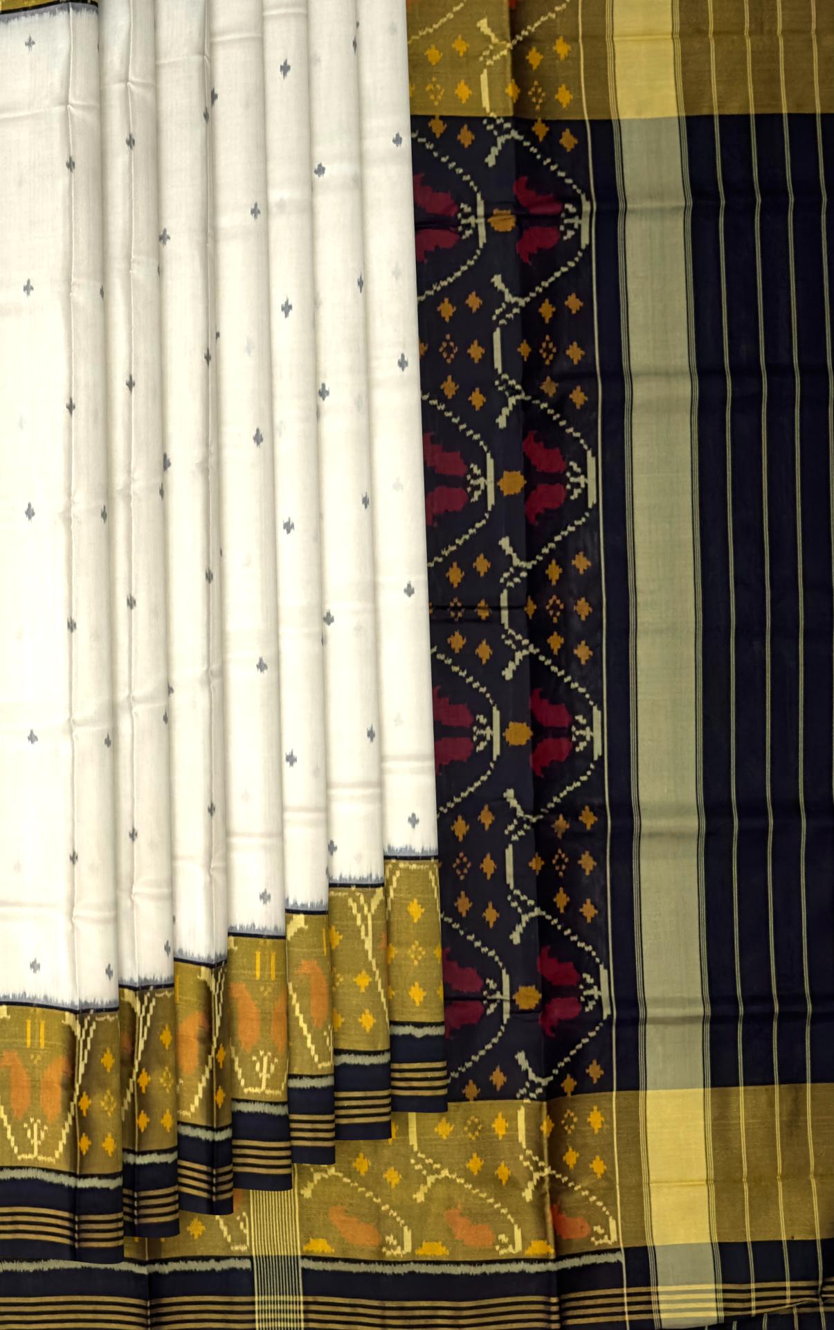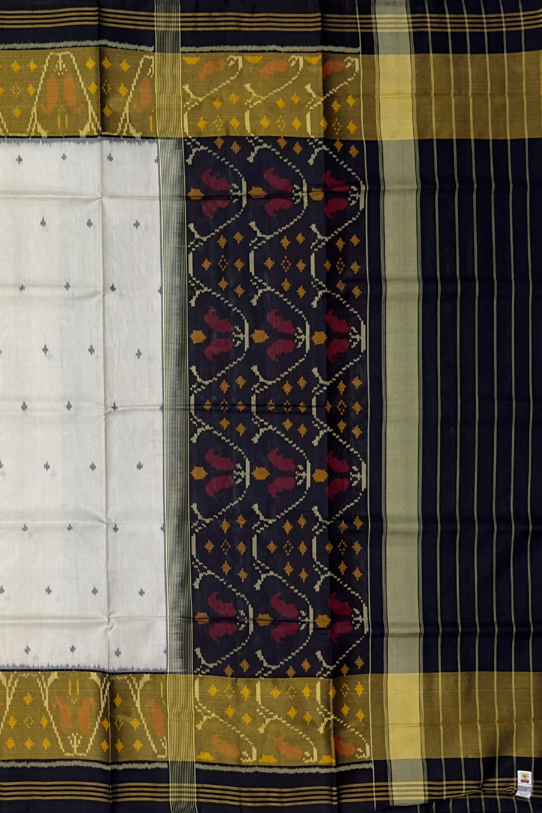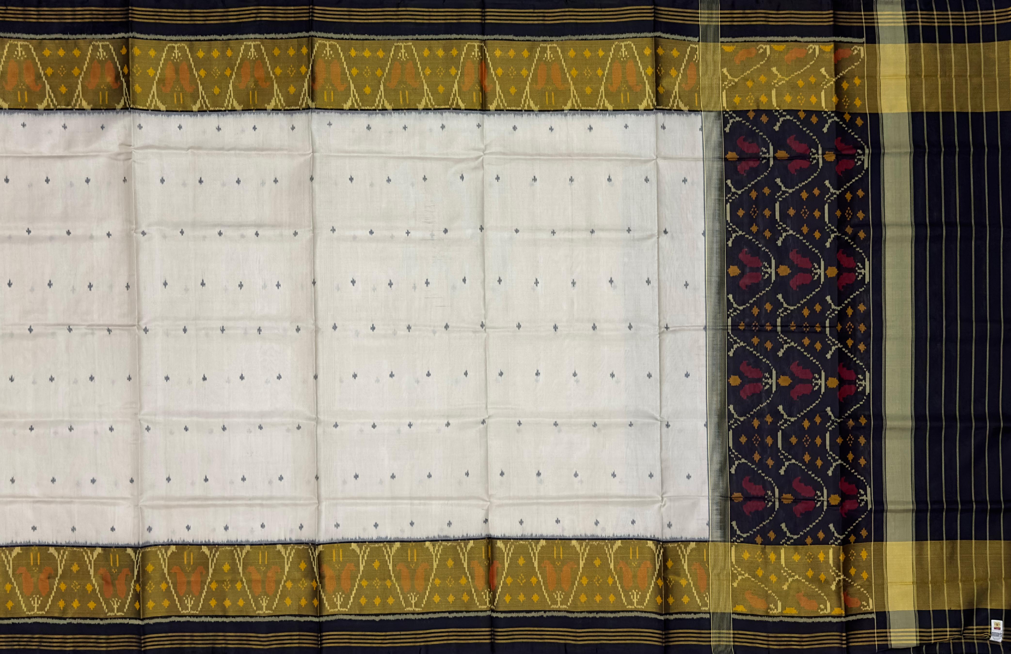 The Off White Black Contrast Rajkot Patola Saree, featuring 'Galo Butti' motifs, offers a classic look with a contemporary twist. It’s ideal for those seeking a sophisticated yet traditional look for special occasions.