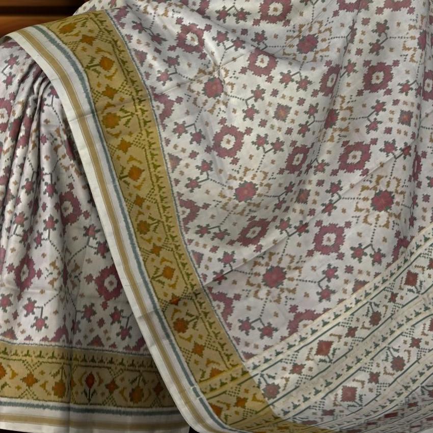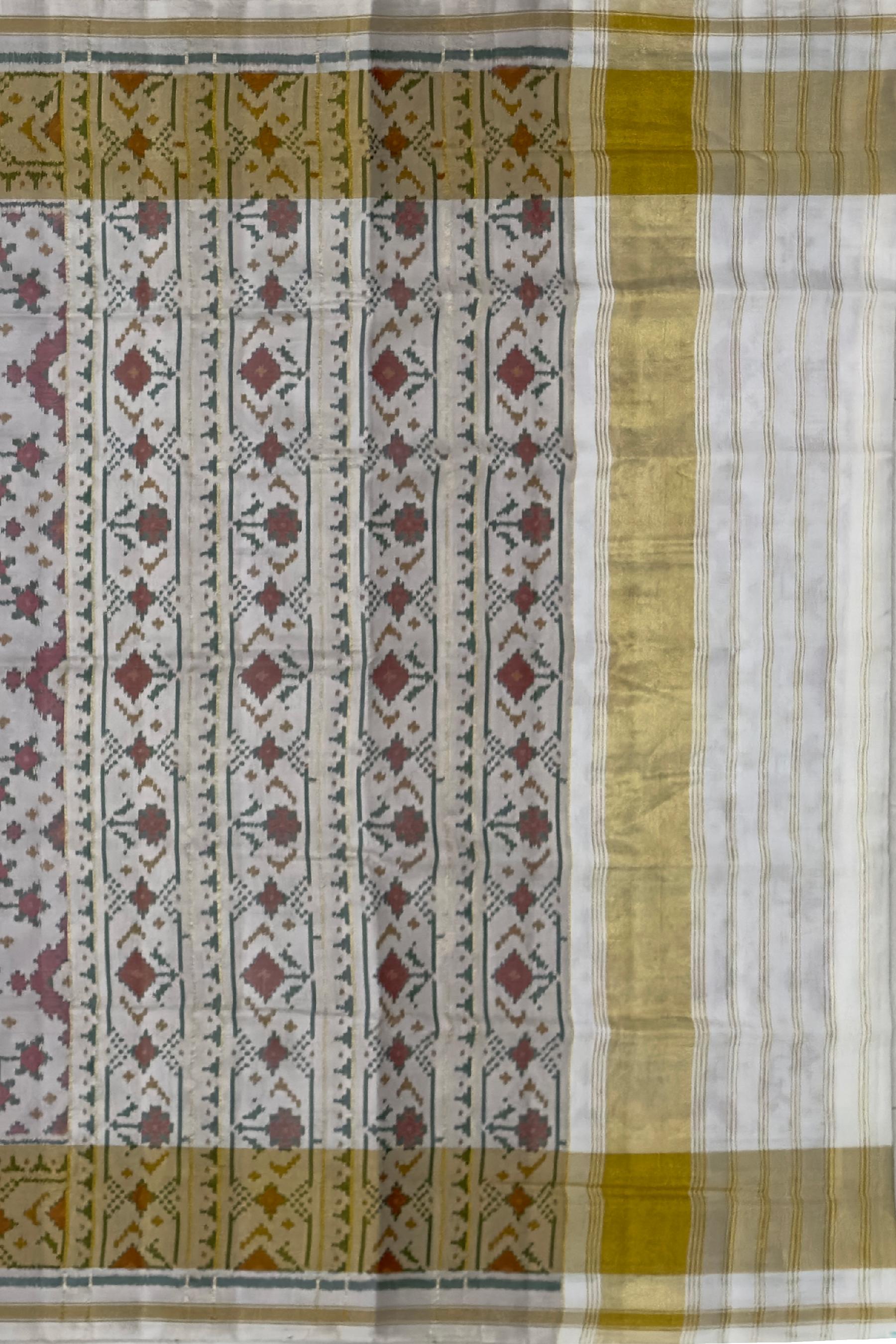 Experience the classic elegance of the Off White Navratna Patola Saree, a stunning embodiment of traditional Indian craftsmanship. Utilizing the single ikat technique, this saree features the intricate Navratna design, known for its detailed and elaborate patterns. The pristine off-white color provides a striking backdrop for the motifs that extend from the body to the pallu. The semi-lustrous finish adds a touch of sophistication, making it perfect for festive and cultural occasions. This saree is ideal for grand weddings, cultural festivities, and social gatherings. It embodies the rich heritage of Rajkot Patola, making each piece a unique narrative of tradition and pride. Adorn yourself with the Off White Navratna Patola Saree, a timeless addition to your wardrobe that celebrates your roots with grace and elegance.