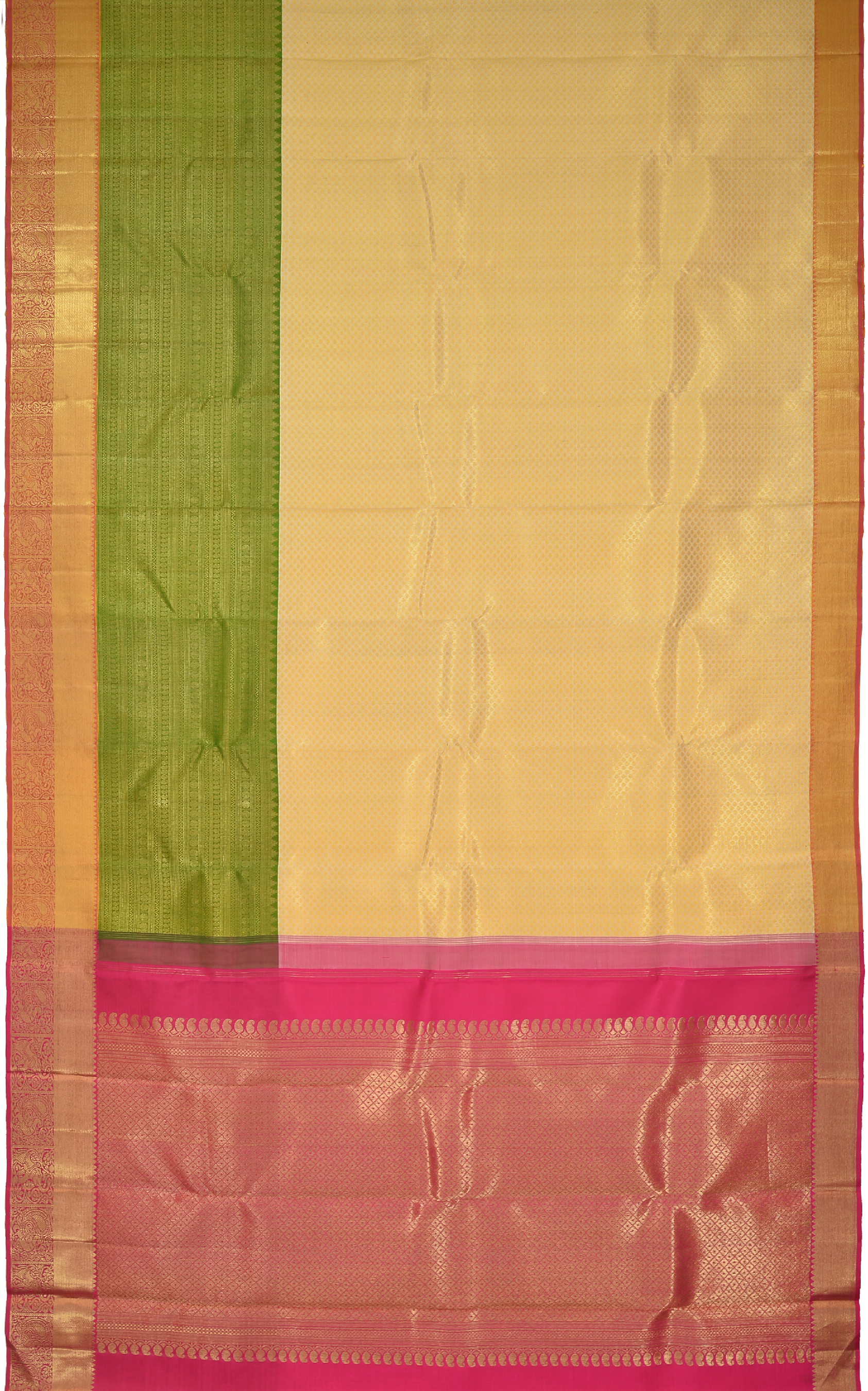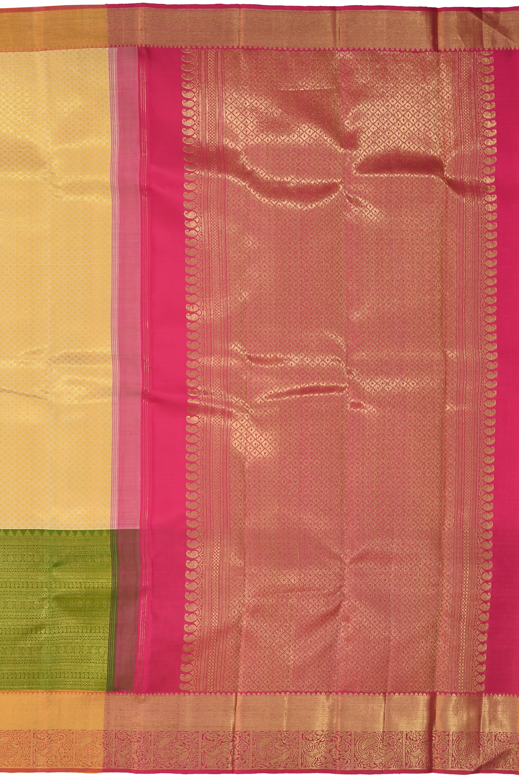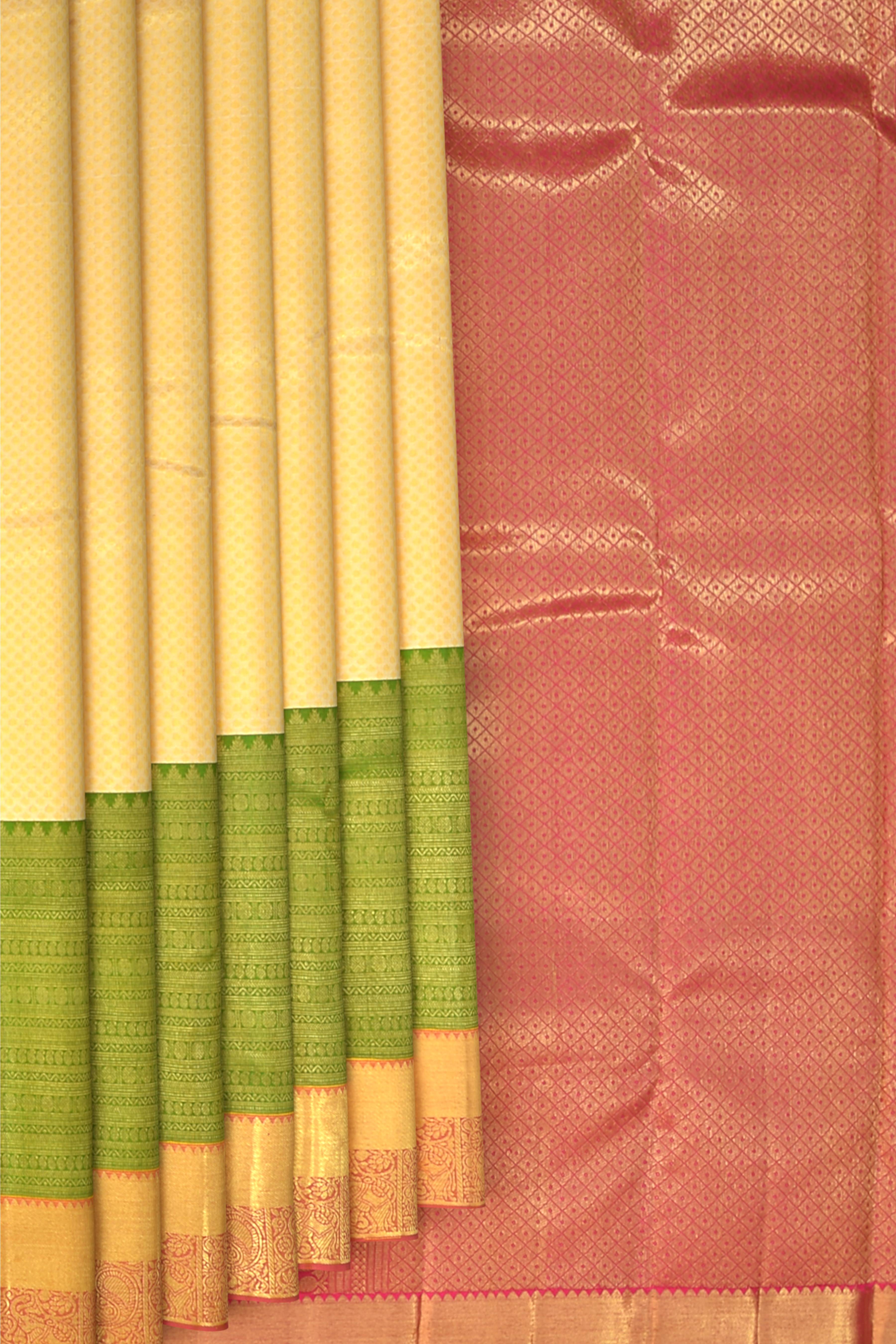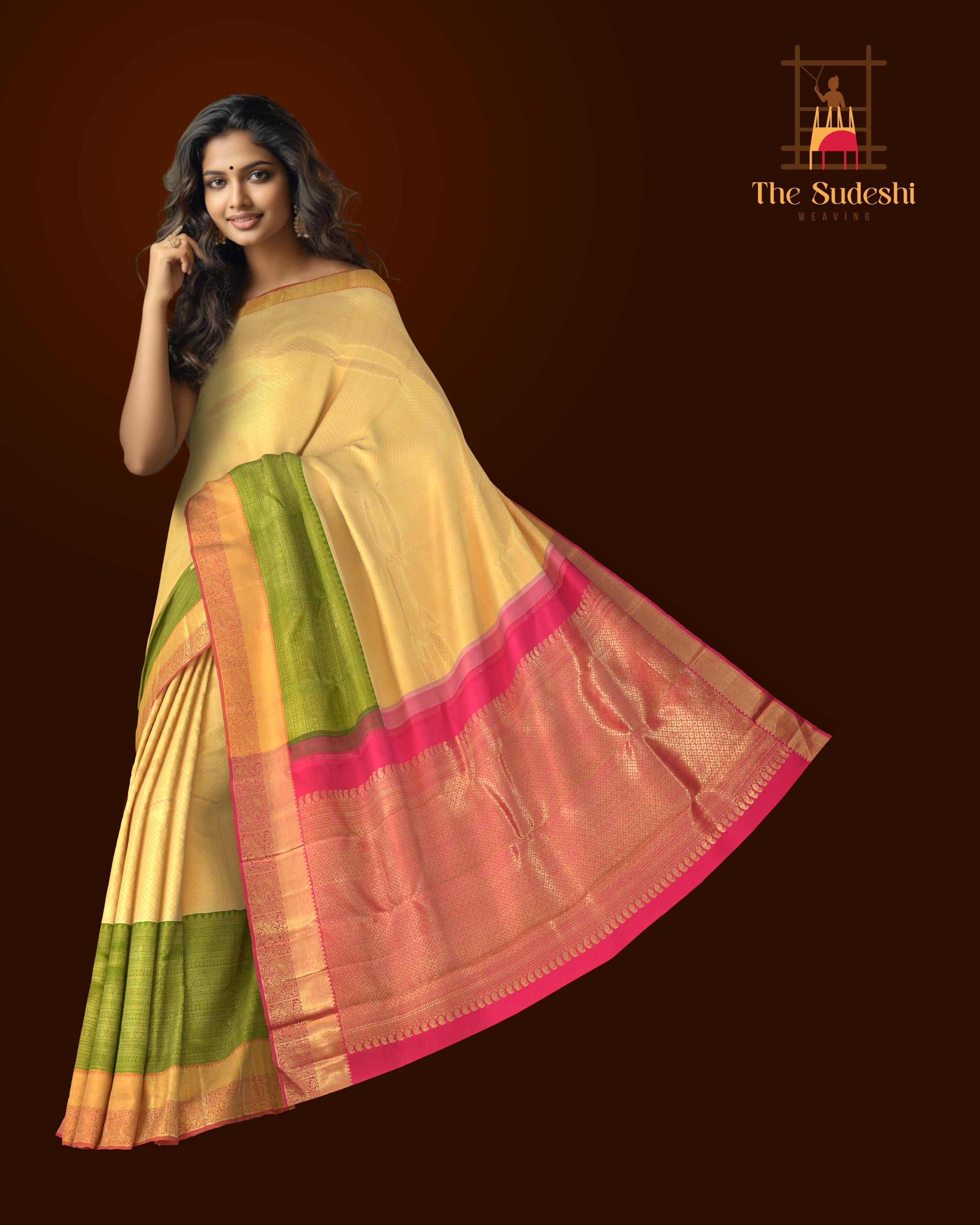 Completing this masterpiece is the Pink pallu, gleaming with grand Mango and Diamond designs, celebrating the sheer beauty of Kanchipuram's weaving prowess.