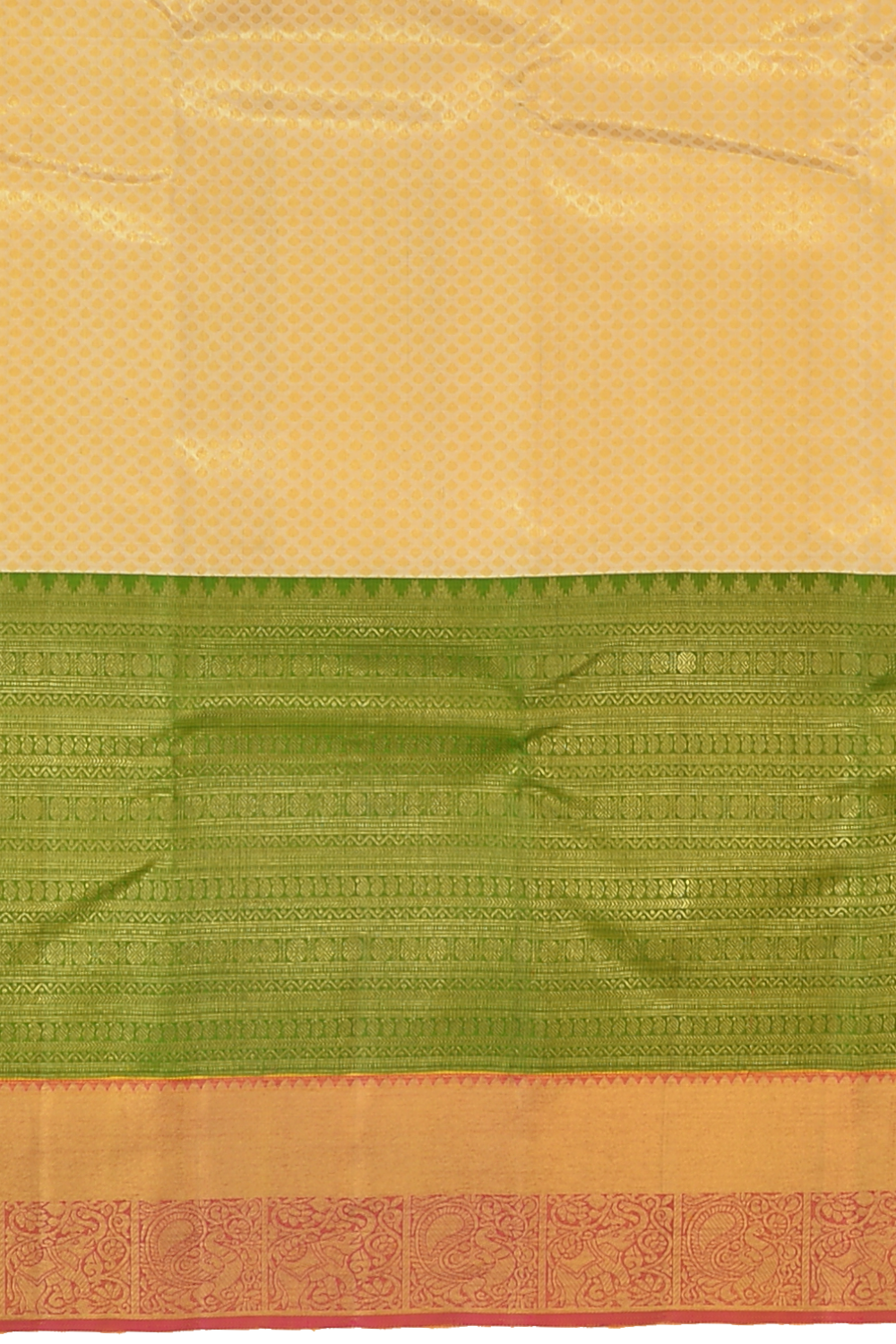 The saree's Double Border in Red and Green unveils a panorama of Layered Elephants, Rudraksha, and Annam motifs, symbols of strength, protection, and grace, respectively.