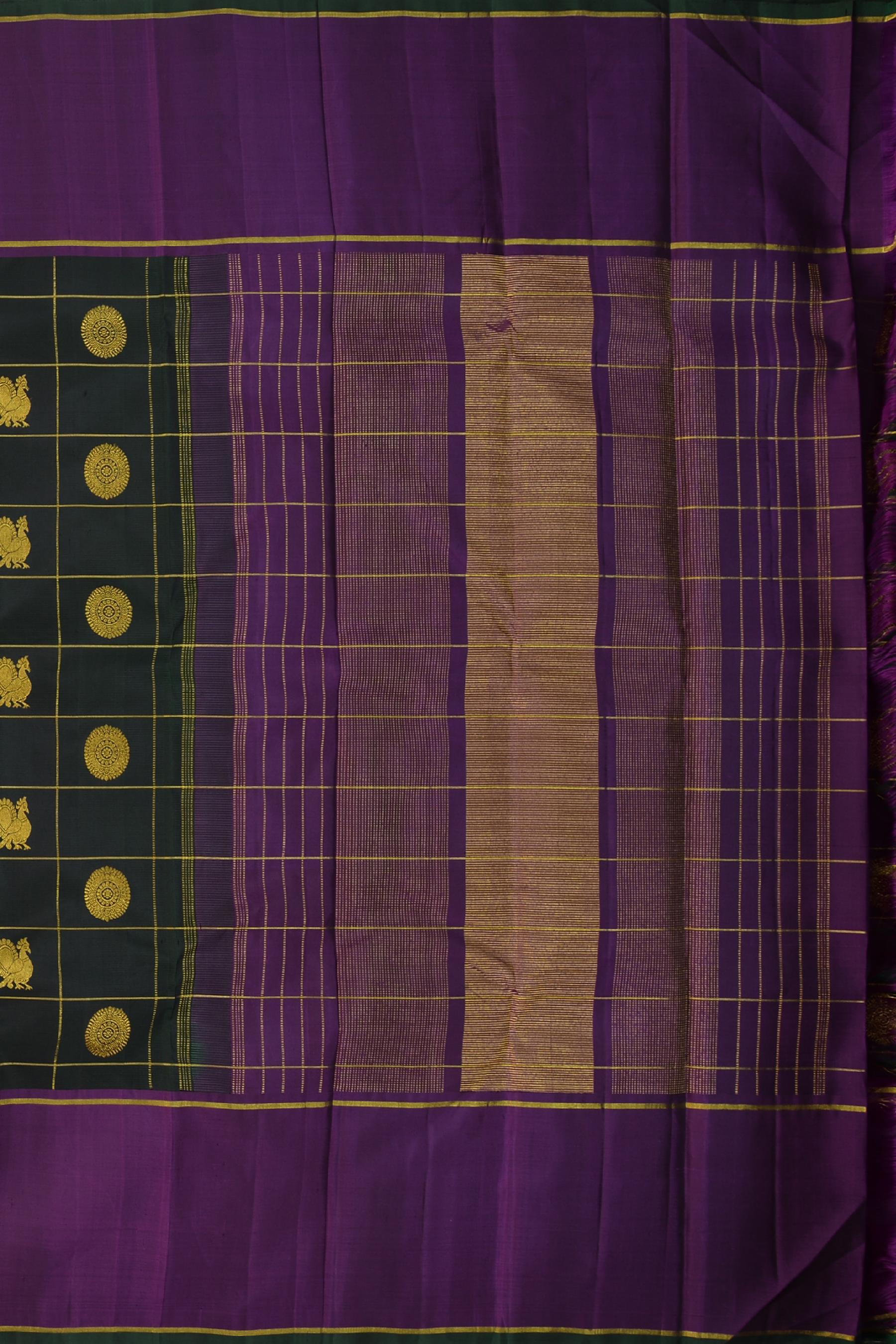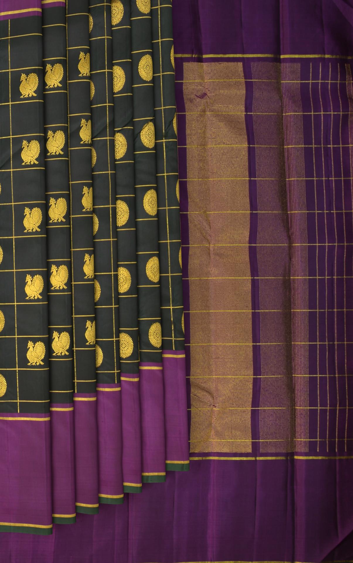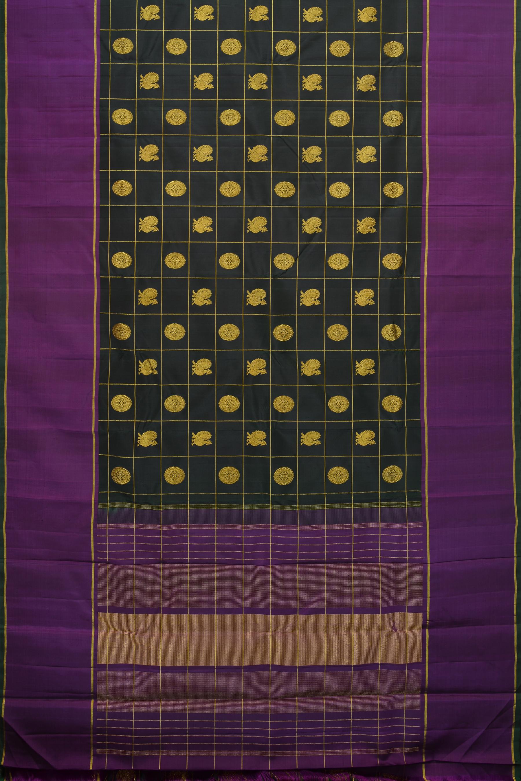 Adorned with a traditional checkered design, the saree body is interlaced with the iconic motifs of Annam (the divine swan) and Chakram, encased within golden butta accents, creating a tapestry of timeless elegance. The checks are a nod to the sacred geometry that is inherent in Indian artistry, each square a space of convergence for myths and craftsmanship.
