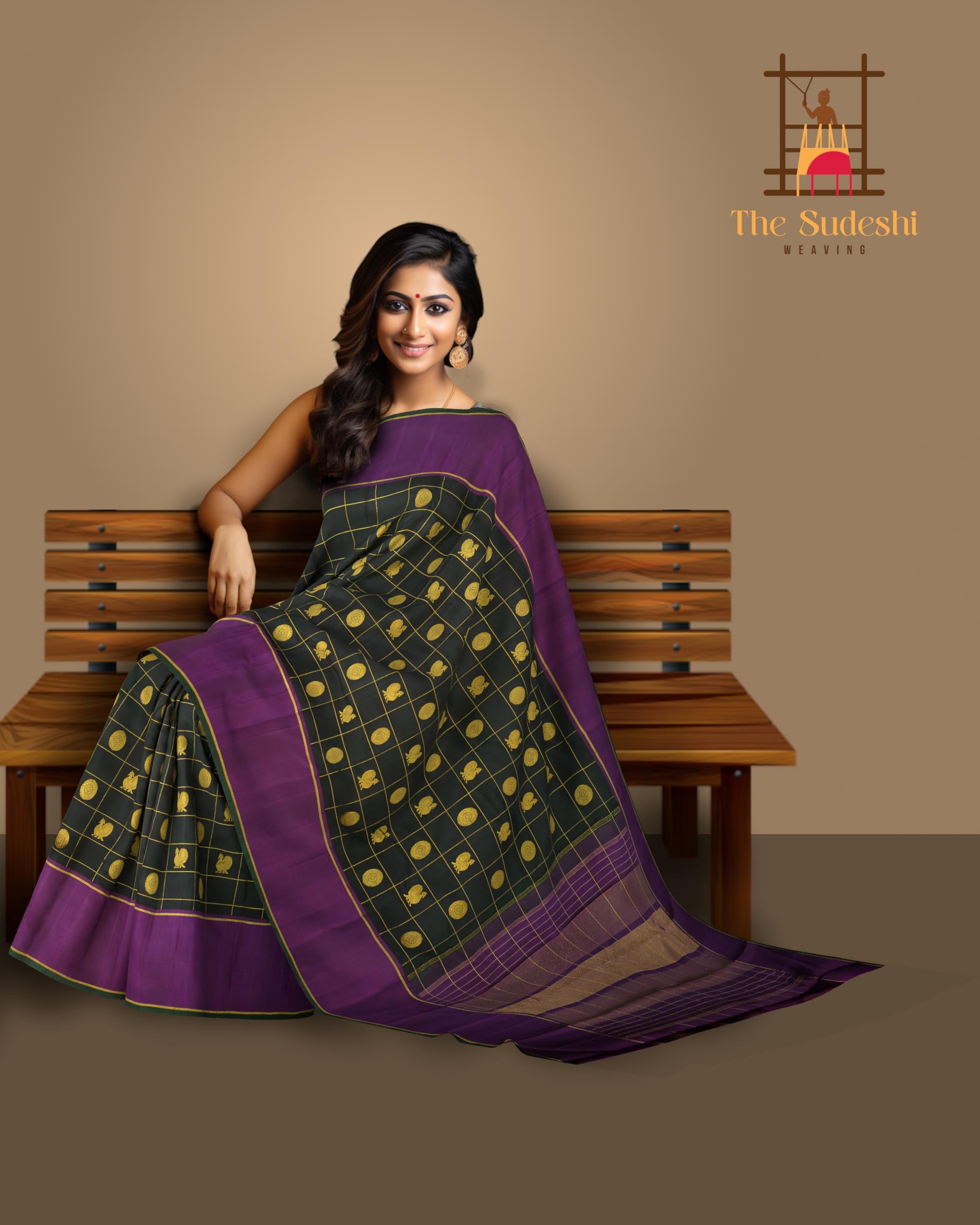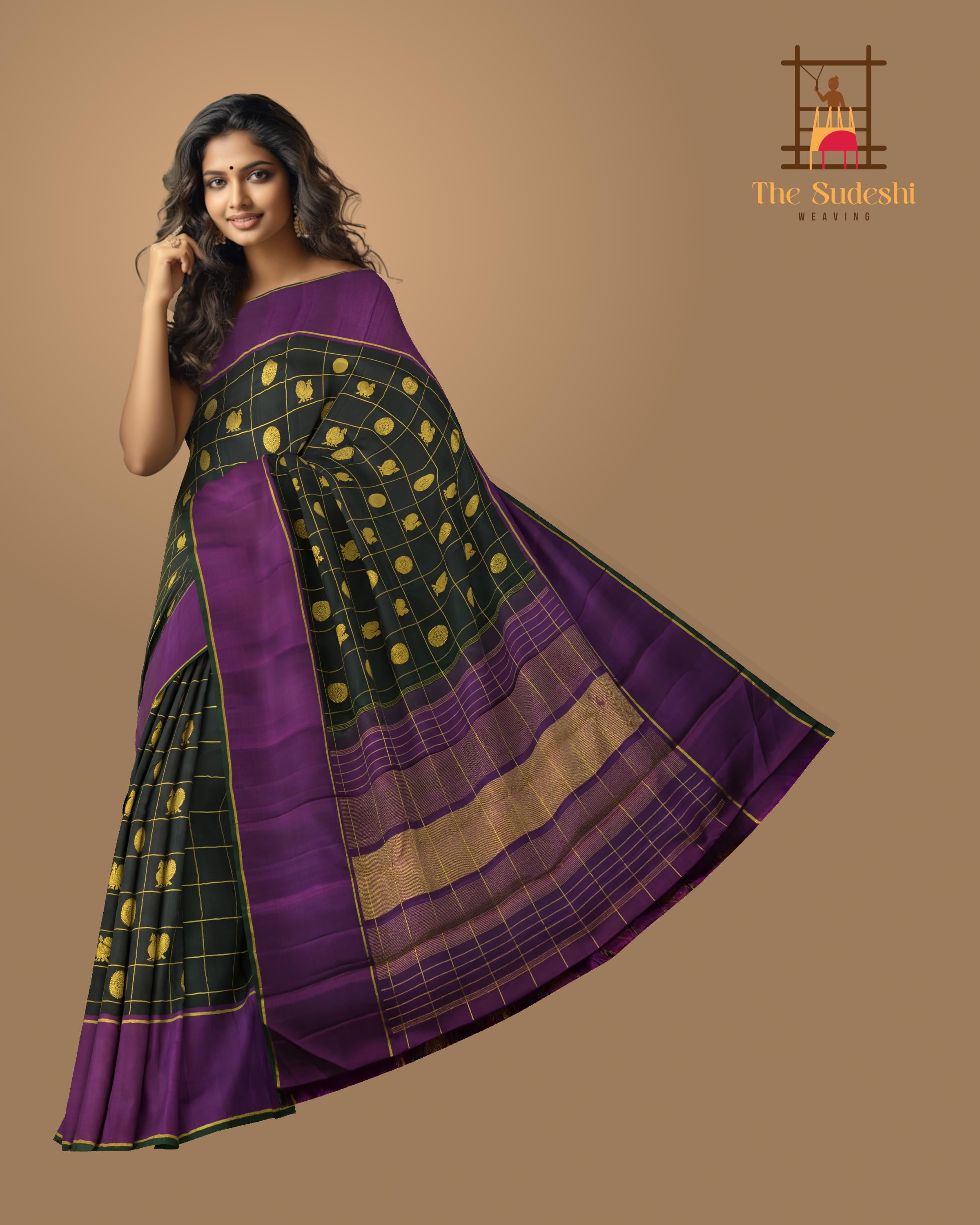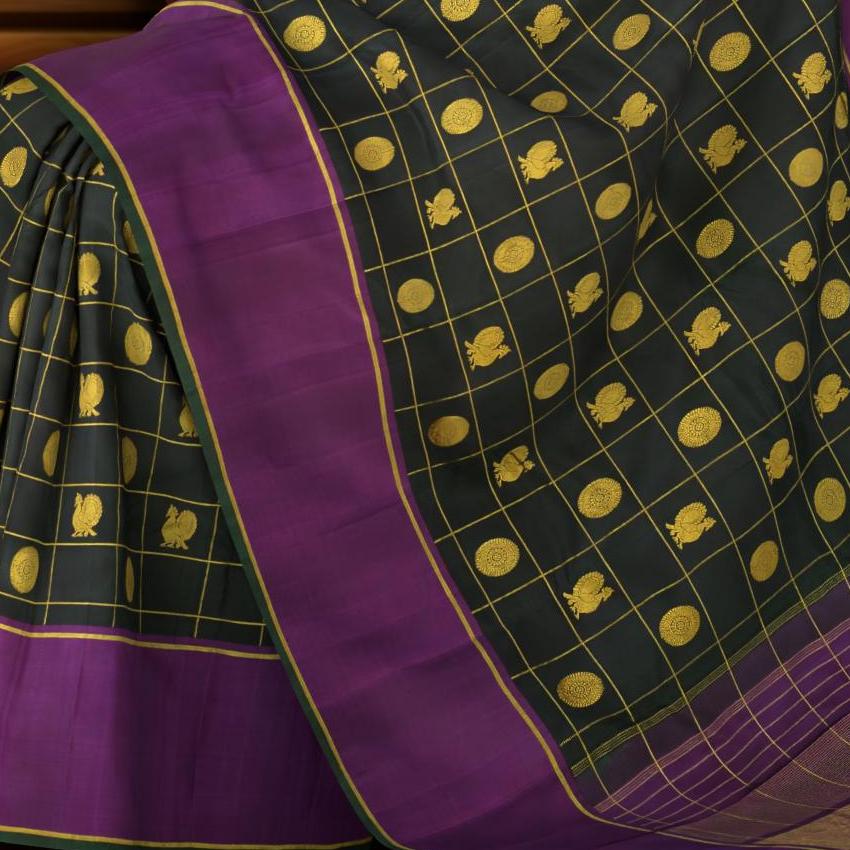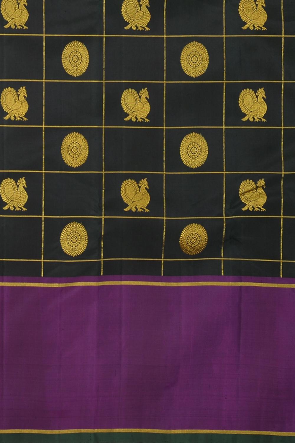 Adorned with a traditional checkered design, the saree body is interlaced with the iconic motifs of Annam (the divine swan) and Chakram, encased within golden butta accents, creating a tapestry of timeless elegance. The checks are a nod to the sacred geometry that is inherent in Indian artistry, each square a space of convergence for myths and craftsmanship.