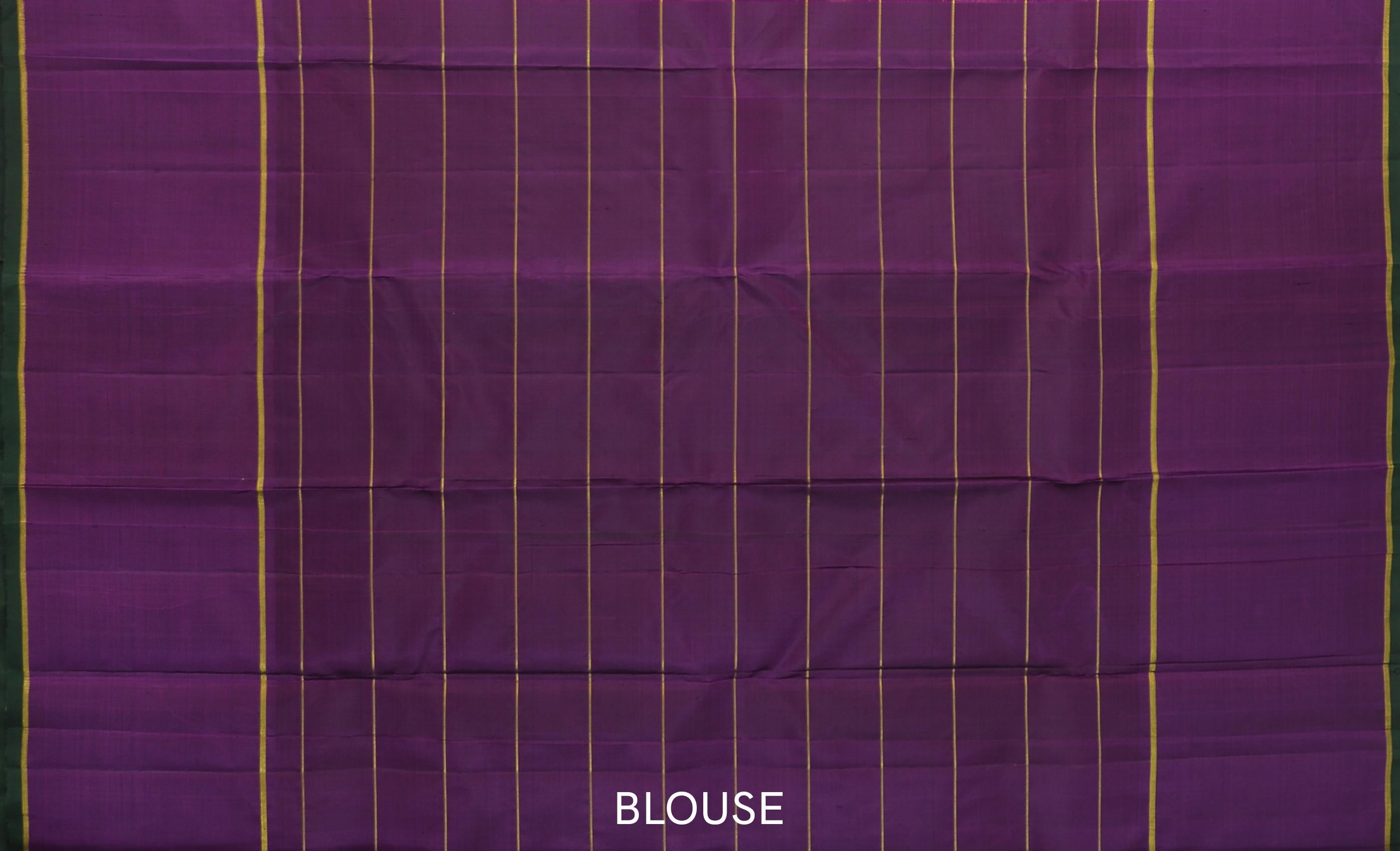 Accompanied by a matching blouse in the same noble purple, this Kancheevaram silk saree stands as a testament to the sartorial legacy of India. It is an impeccable choice for those who carry within them the spirit of the land and its looms, a perfect ensemble for celebrations that call for a touch of solemnity and an embrace of cultural magnificence.