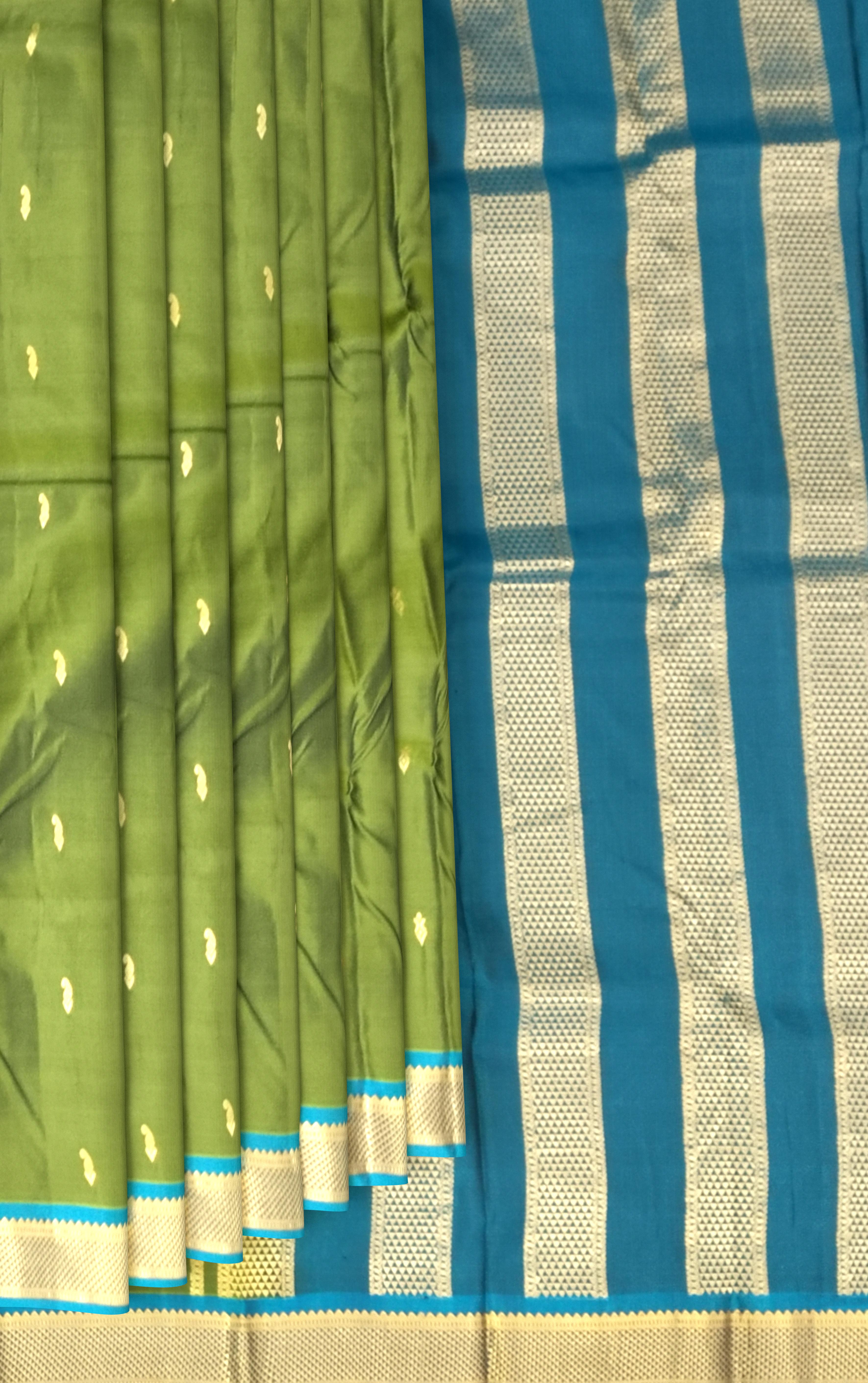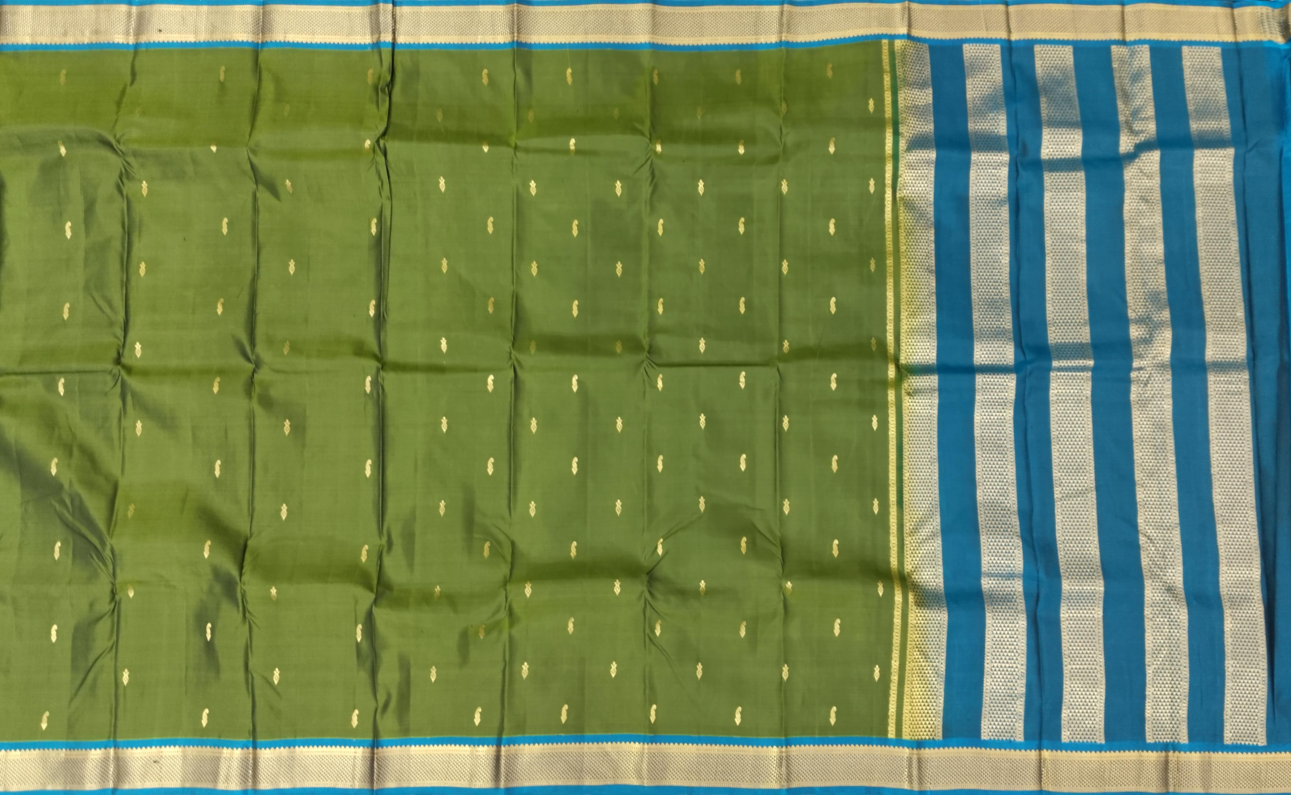 Symbolizing prosperity and renewal, this Olive Green Kanchipuram Silk Saree adorned with Mango Buttas captures the essence of timeless tradition. The Rama Green border and pallu add a refreshing vibrance, creating a harmonious blend of earthy elegance and festive charm. Each mango butta, or “mankolam,” is a sacred motif representing fertility, abundance, and divine grace. Handwoven in the historic town of Kanchipuram, these Pure Silk Sarees are the result of centuries of refined craftsmanship. Using fine mulberry silk and lustrous zari, artisans bring mythological and natural elements to life, weaving stories of devotion and cultural pride into every thread. This saree is perfect for weddings, temple visits, and festive occasions. Pair it with a matching green blouse and antique gold jewelry for a regal look. Complete the ensemble with a sleek bun, gajra, and traditional bangles for an effortlessly elegant finish. Note: The appearance of the product’s colors may vary due to lighting conditions or your device’s screen calibration. For further assistance or additional images/videos, feel free to contact us at +91 97897 60367 or email at wecare@thesudeshiweaving.com.