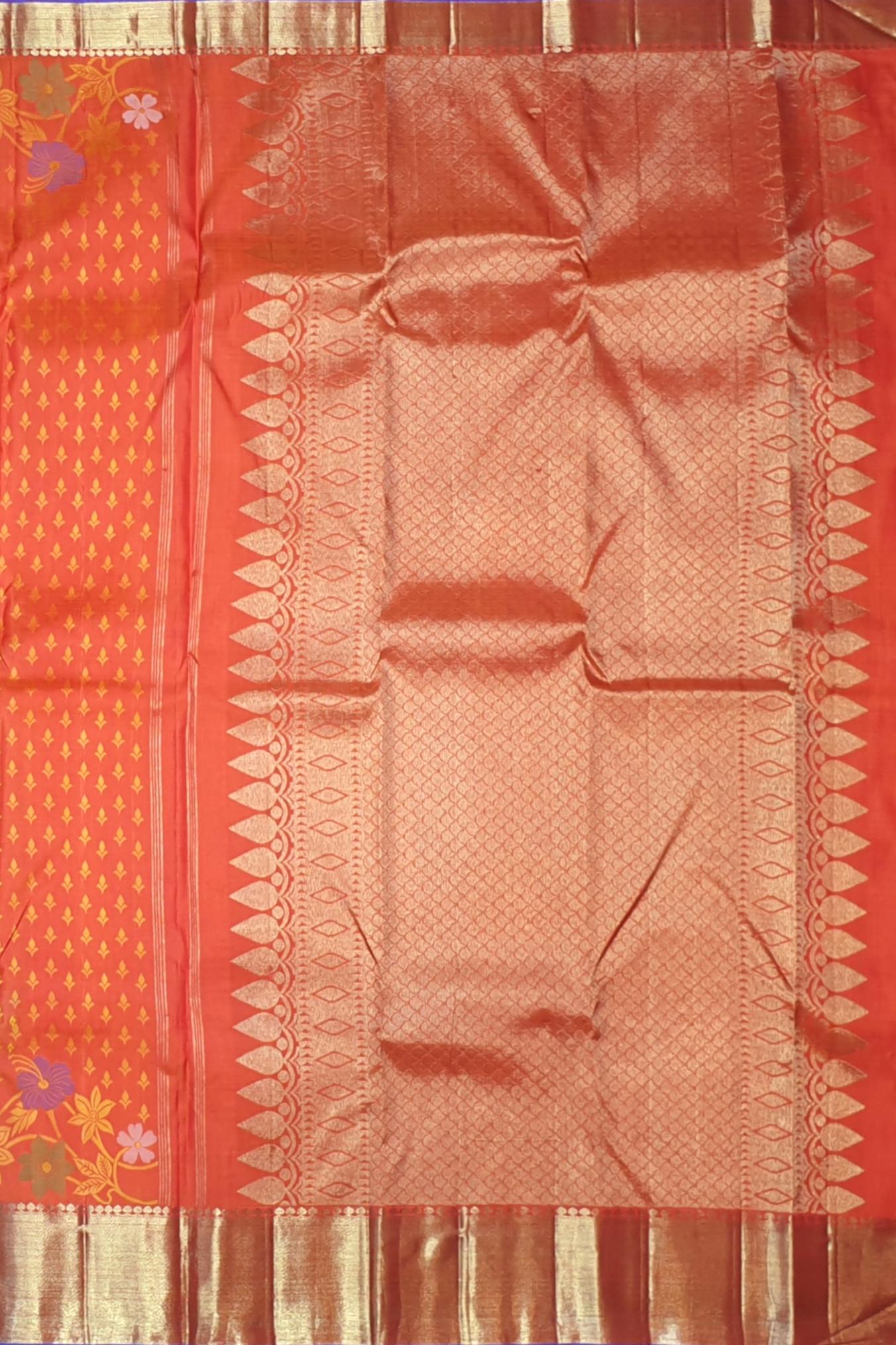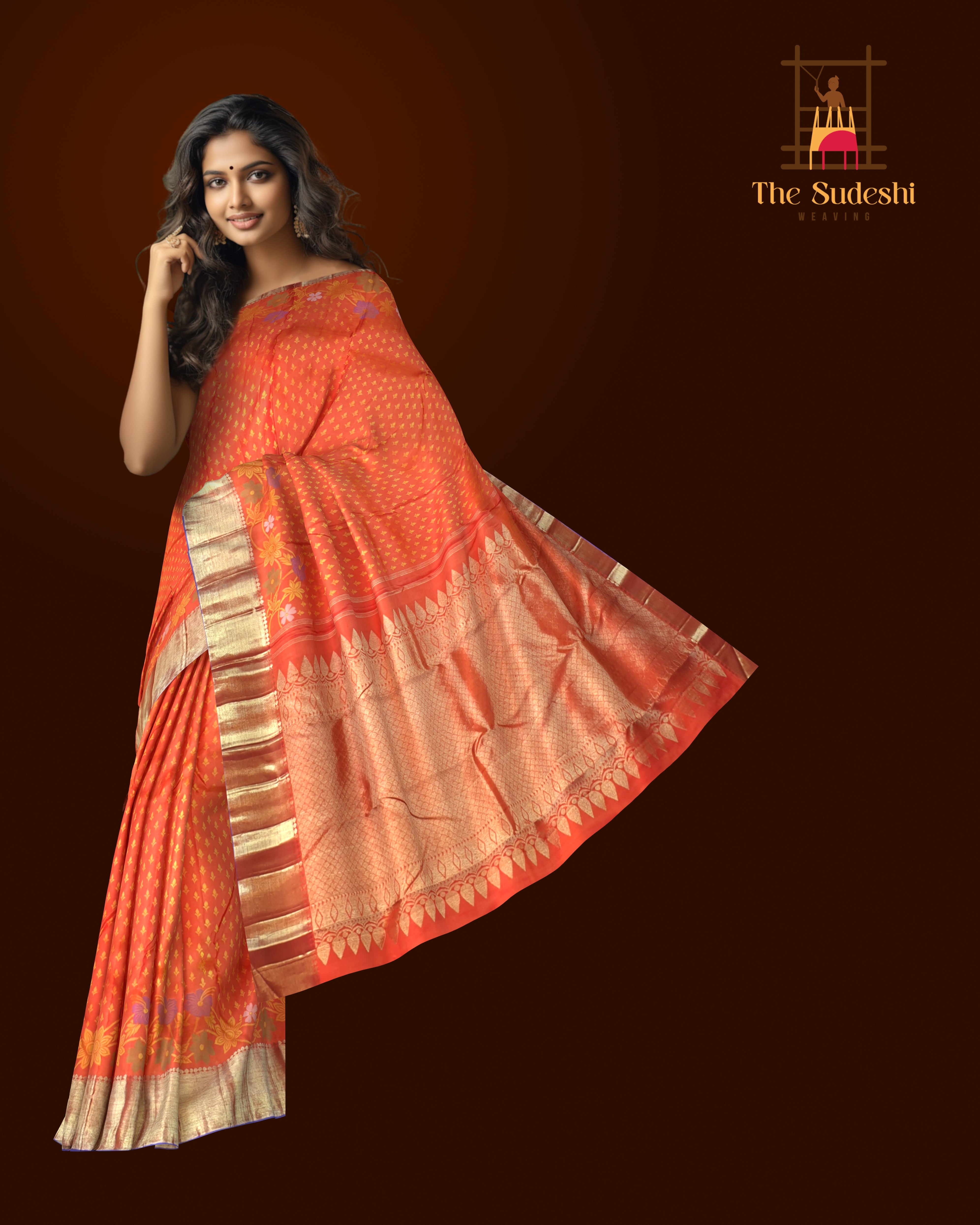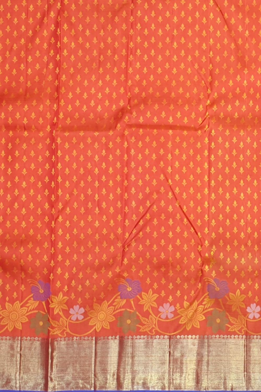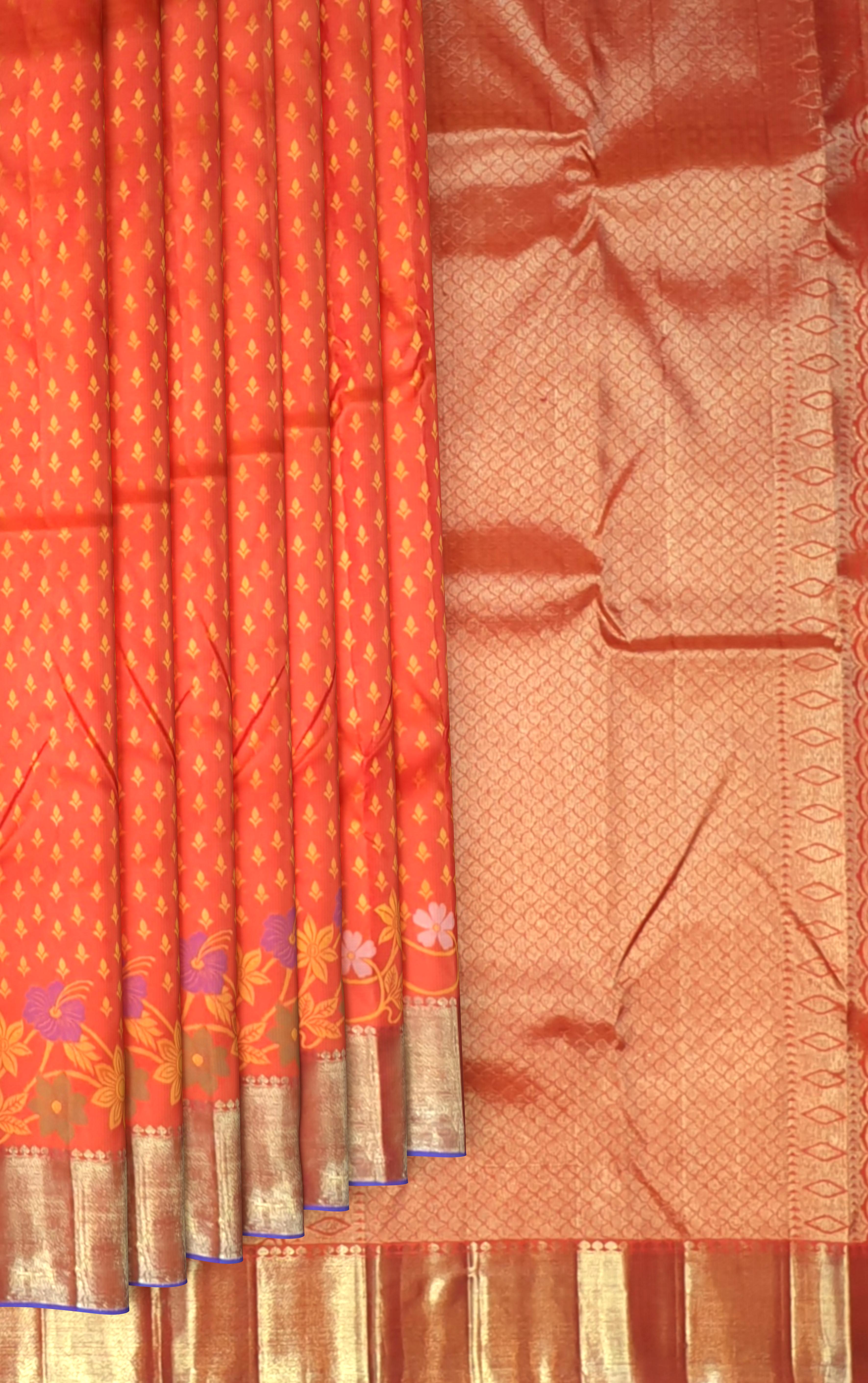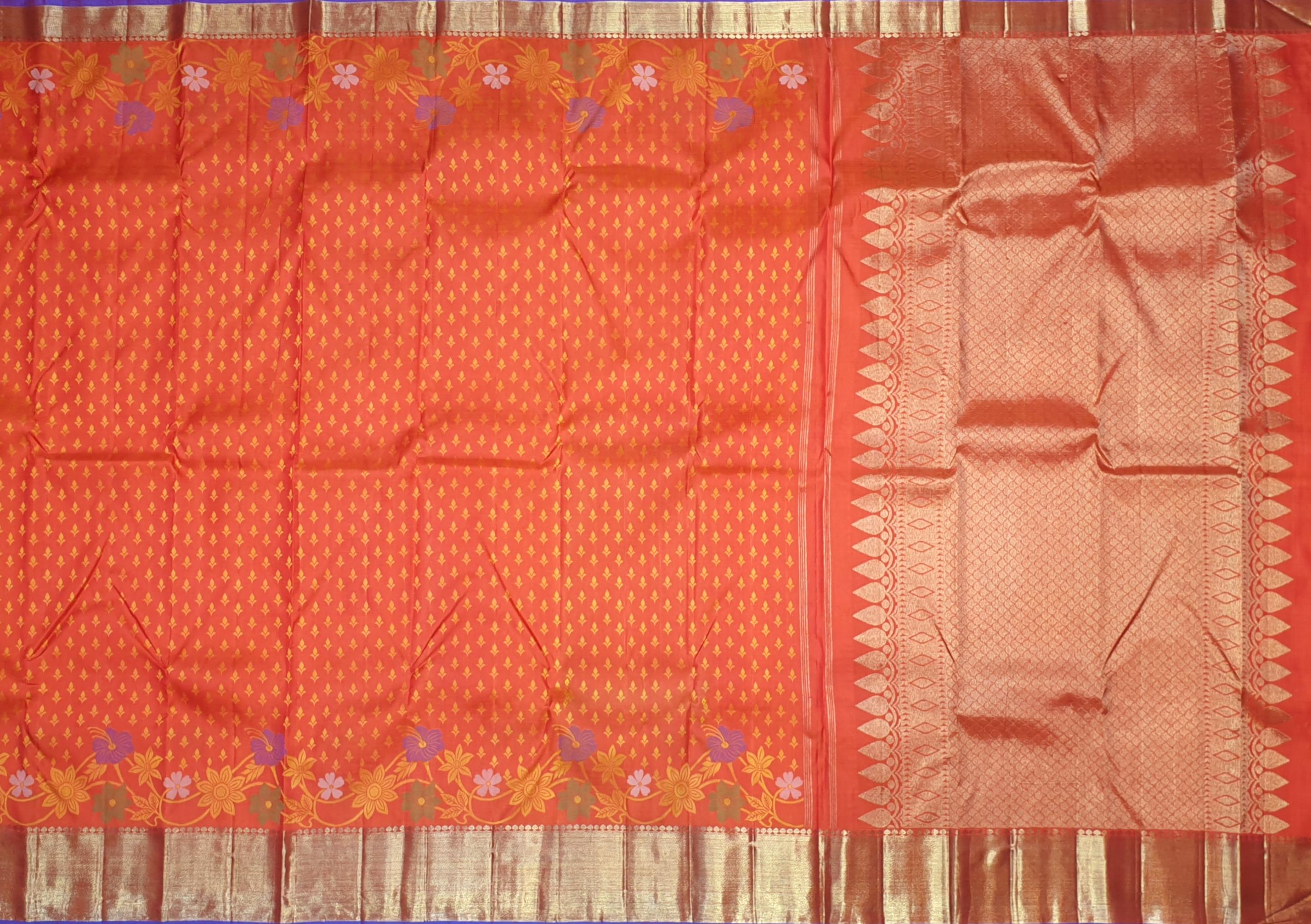 This vibrant orange Kanchipuram silk saree captures the spirit of festivity with its intricate jacquard weaving and delicate butta motifs strewn across the body. The subtle shimmer of the small designs adds depth and richness to the vibrant base, while the elegant purple selvedge floral border enhances its traditional appeal. The self-colored pallu and coordinating orange blouse bring cohesion to the ensemble, making it as refined as it is radiant.