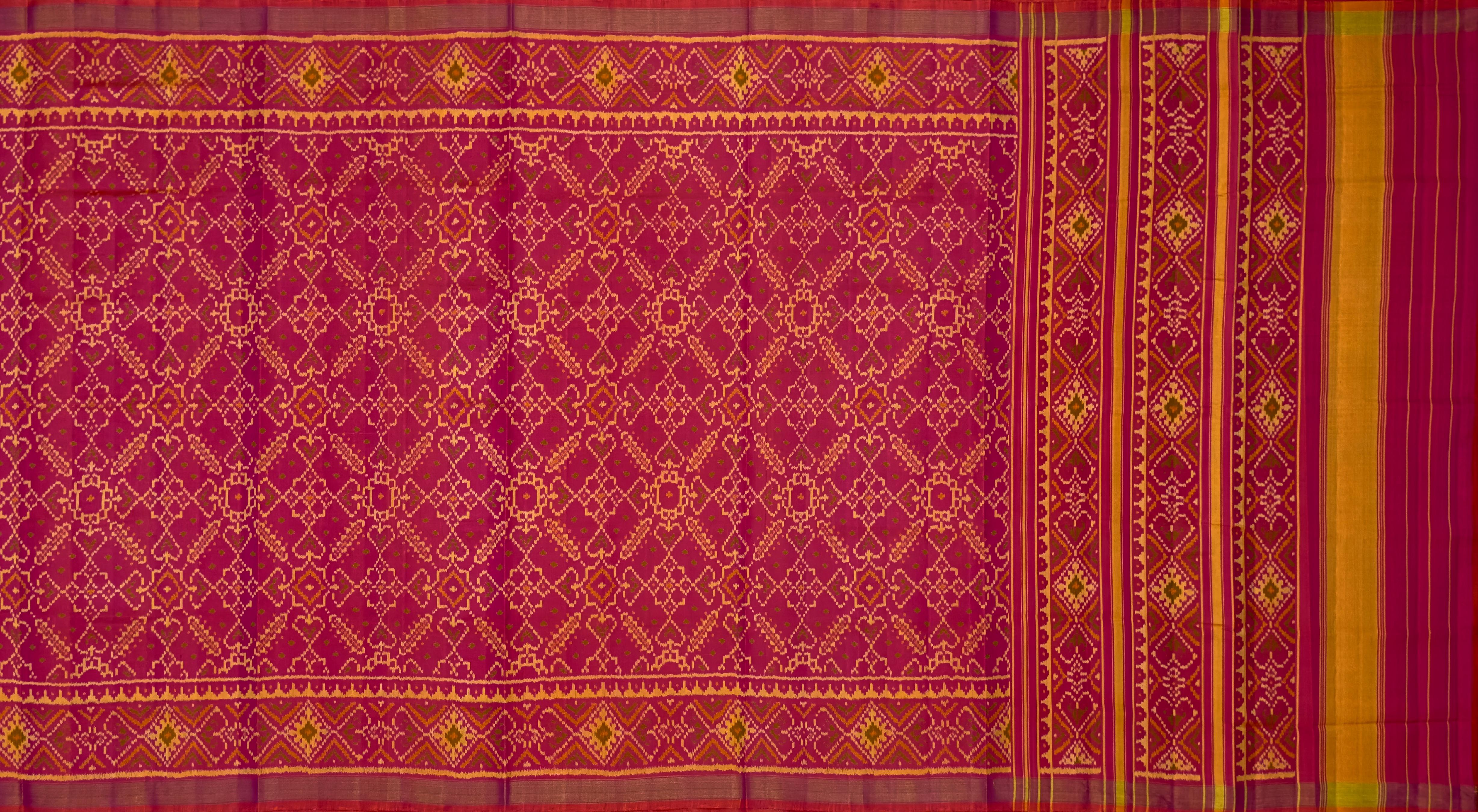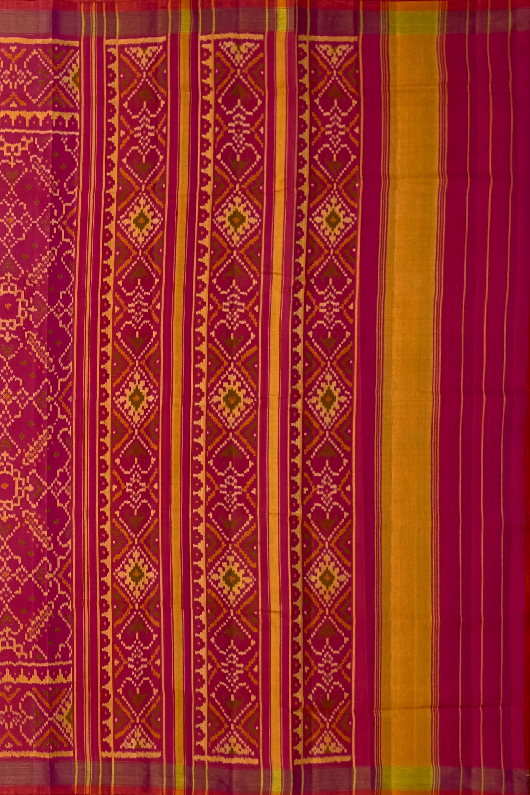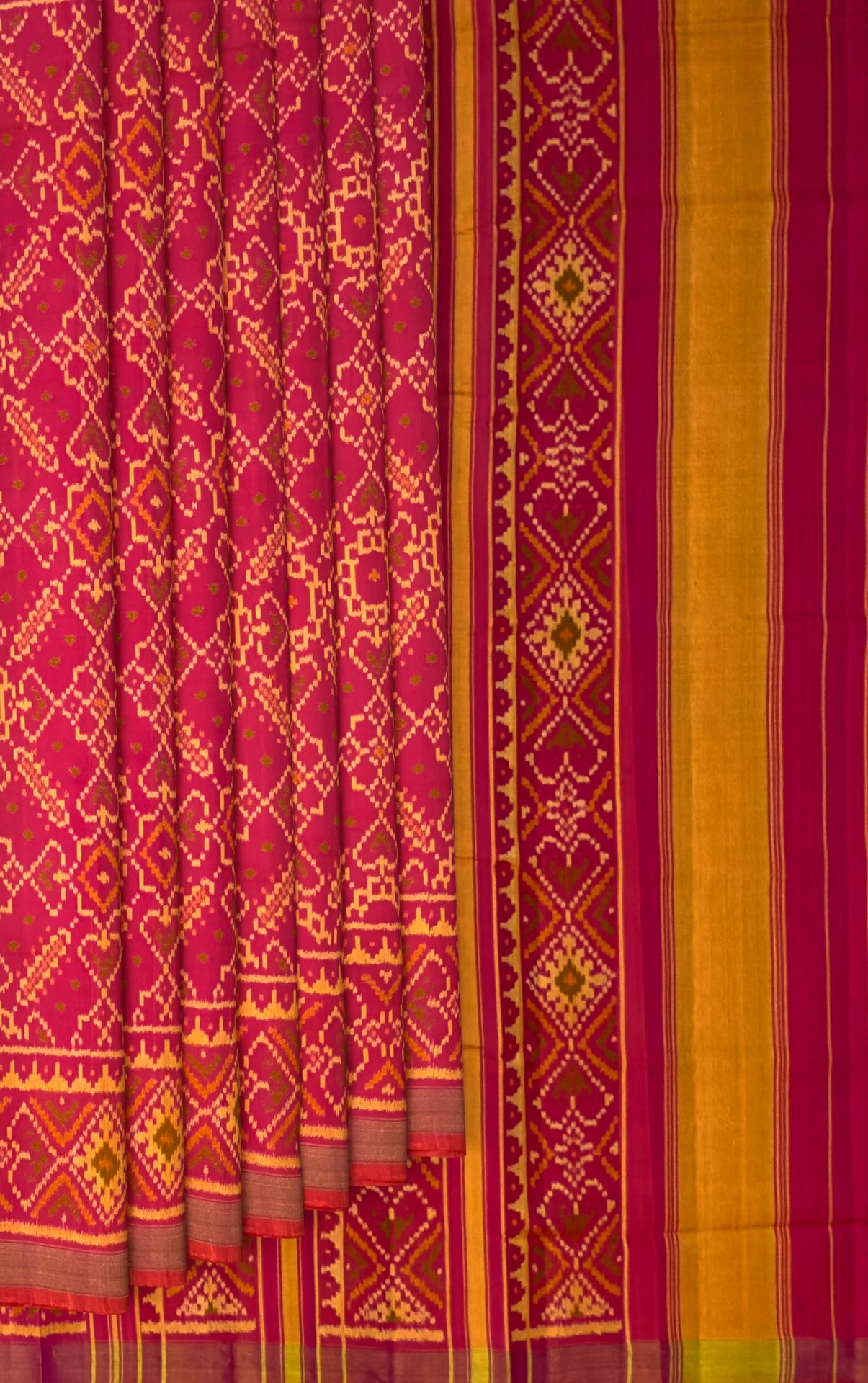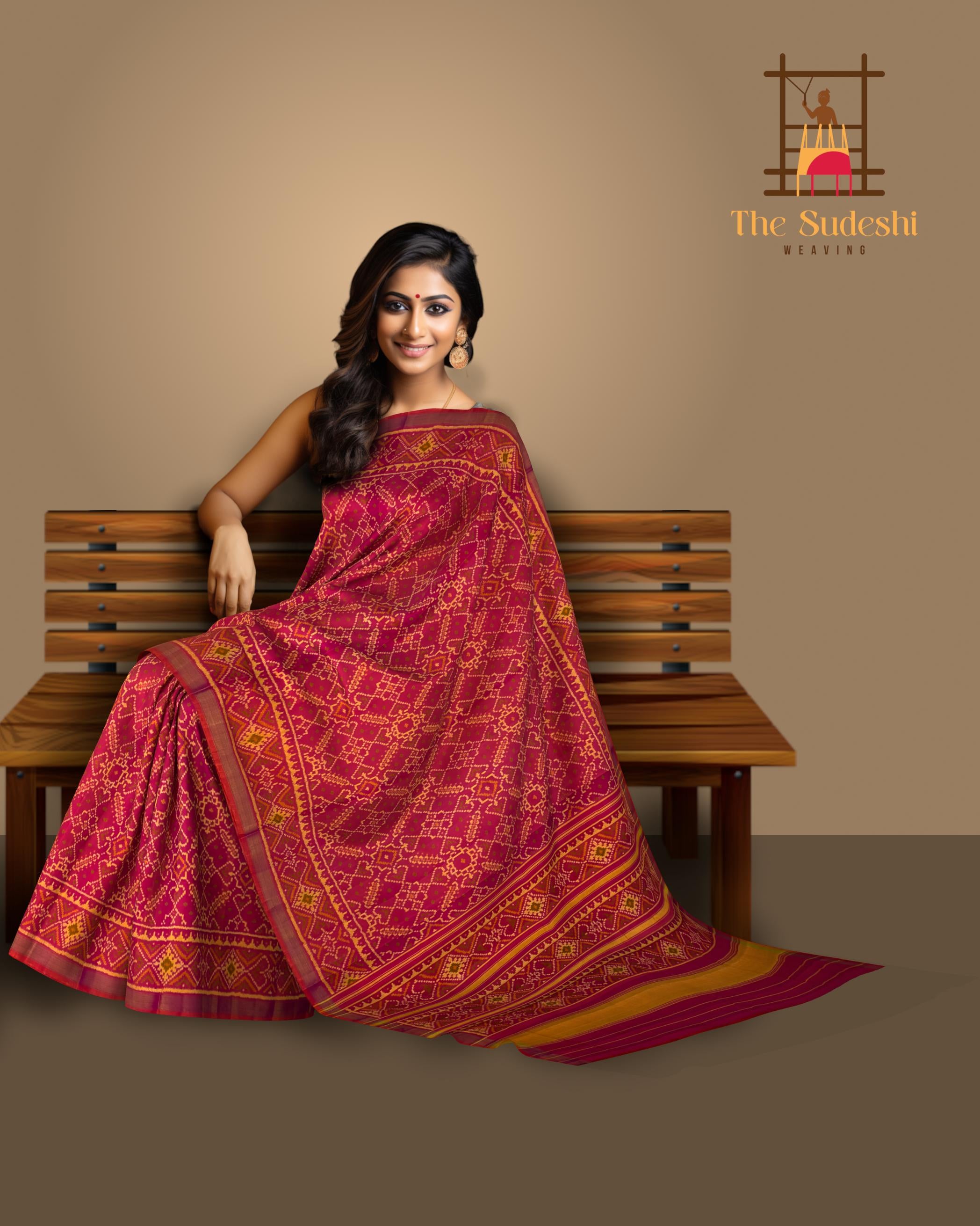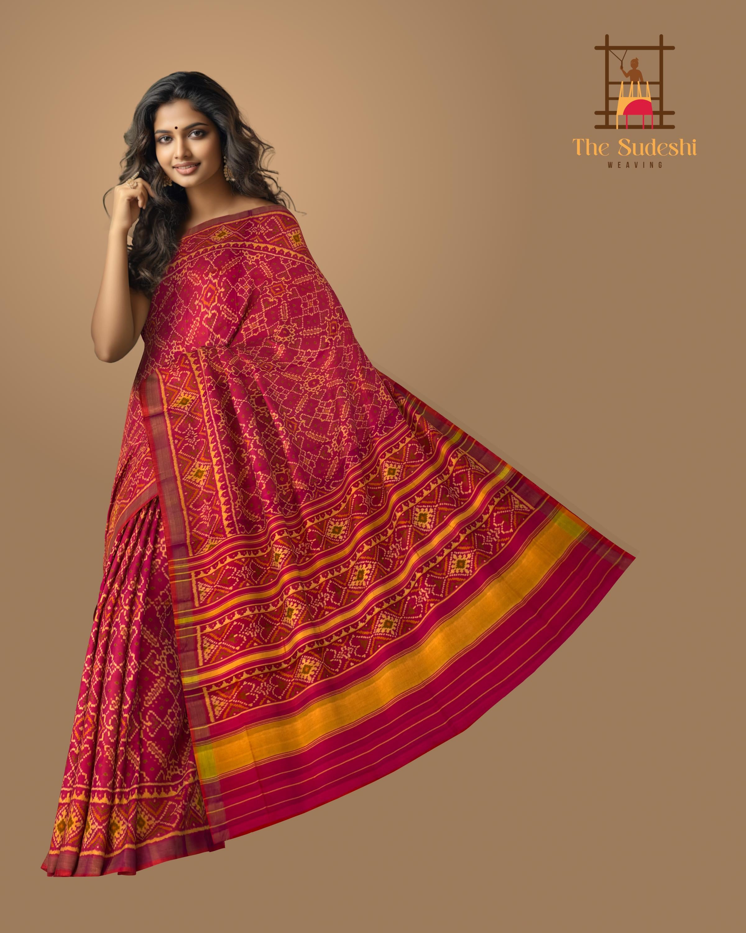 Experience the vibrant allure of the Orange Pink Manekchowk Patola Saree, a stunning representation of traditional Indian craftsmanship. Utilizing the single ikat technique, this saree features the intricate Manekchowk design, known for its detailed and elaborate patterns. The unique orange-pink two-tone effect provides a mesmerizing backdrop for the motifs that extend from the body to the pallu. The semi-lustrous finish adds a touch of sophistication, making it perfect for festive and cultural occasions. This saree is ideal for grand weddings, cultural festivities, and social gatherings. It embodies the rich heritage of Rajkot Patola, making each piece a unique narrative of tradition and pride. Adorn yourself with the Orange Pink Manekchowk Patola Saree, a timeless addition to your wardrobe that celebrates your roots with grace and elegance.