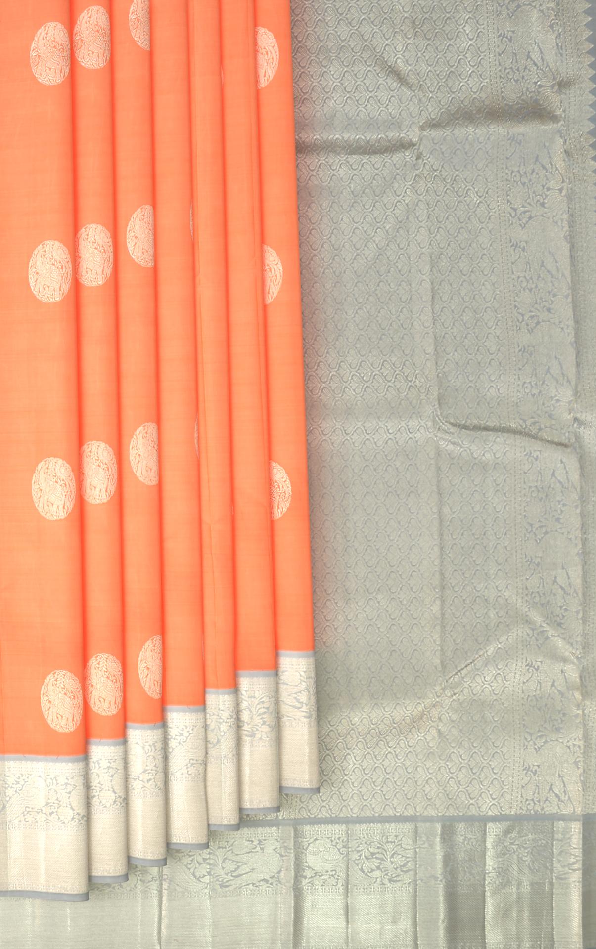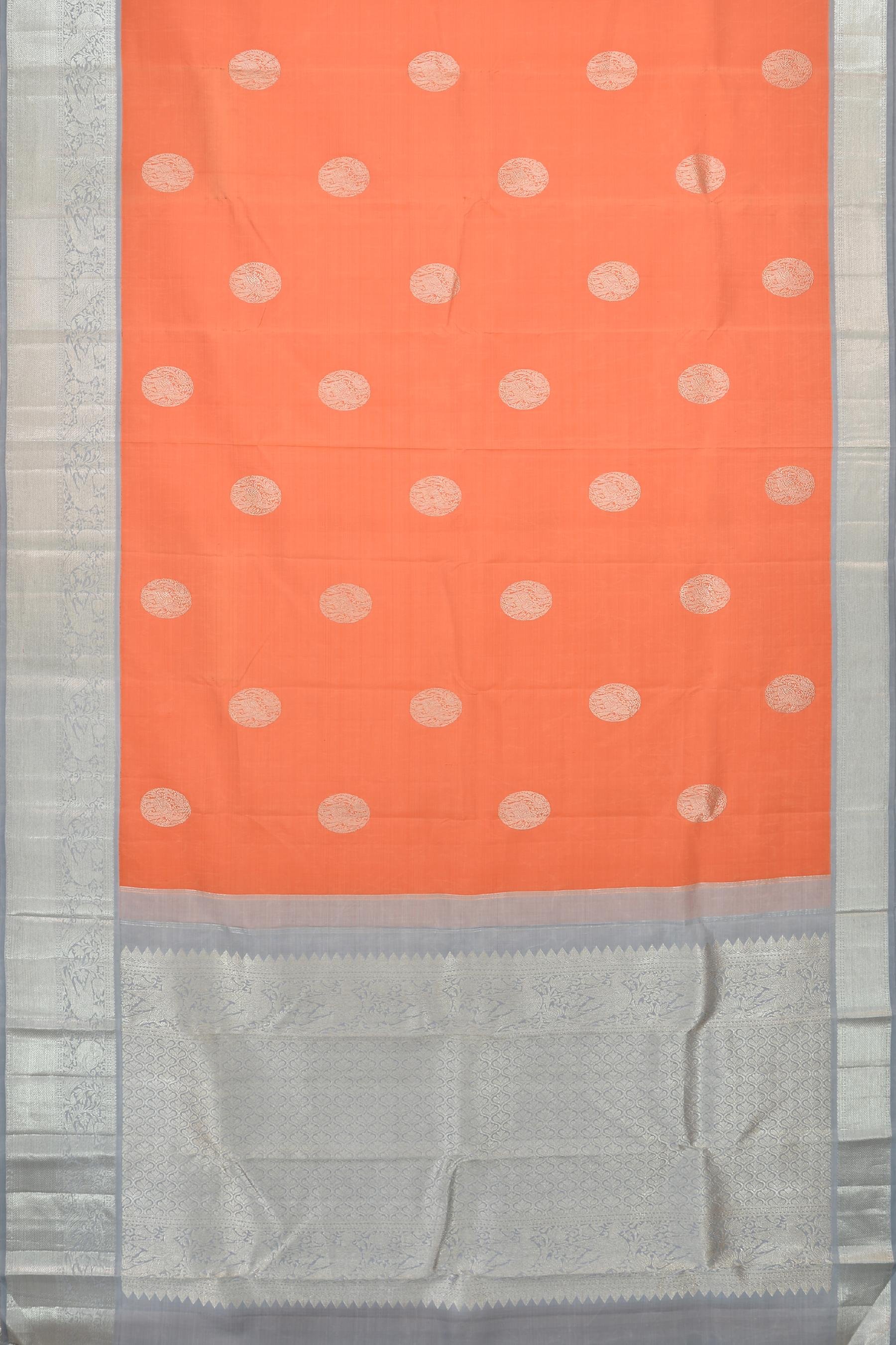 Bask in the glow of sunset captured in the weave of this orange Kanchipuram silk saree, embellished with round buttas in silver zari. This saree is like a canvas painted with the last rays of the sun, warm and inviting, with a touch of celestial glow. The contrast grey border, adorned with Benaraspet featuring peacock and parrot motifs, adds a whimsical charm and a vibrant burst of life to the saree.