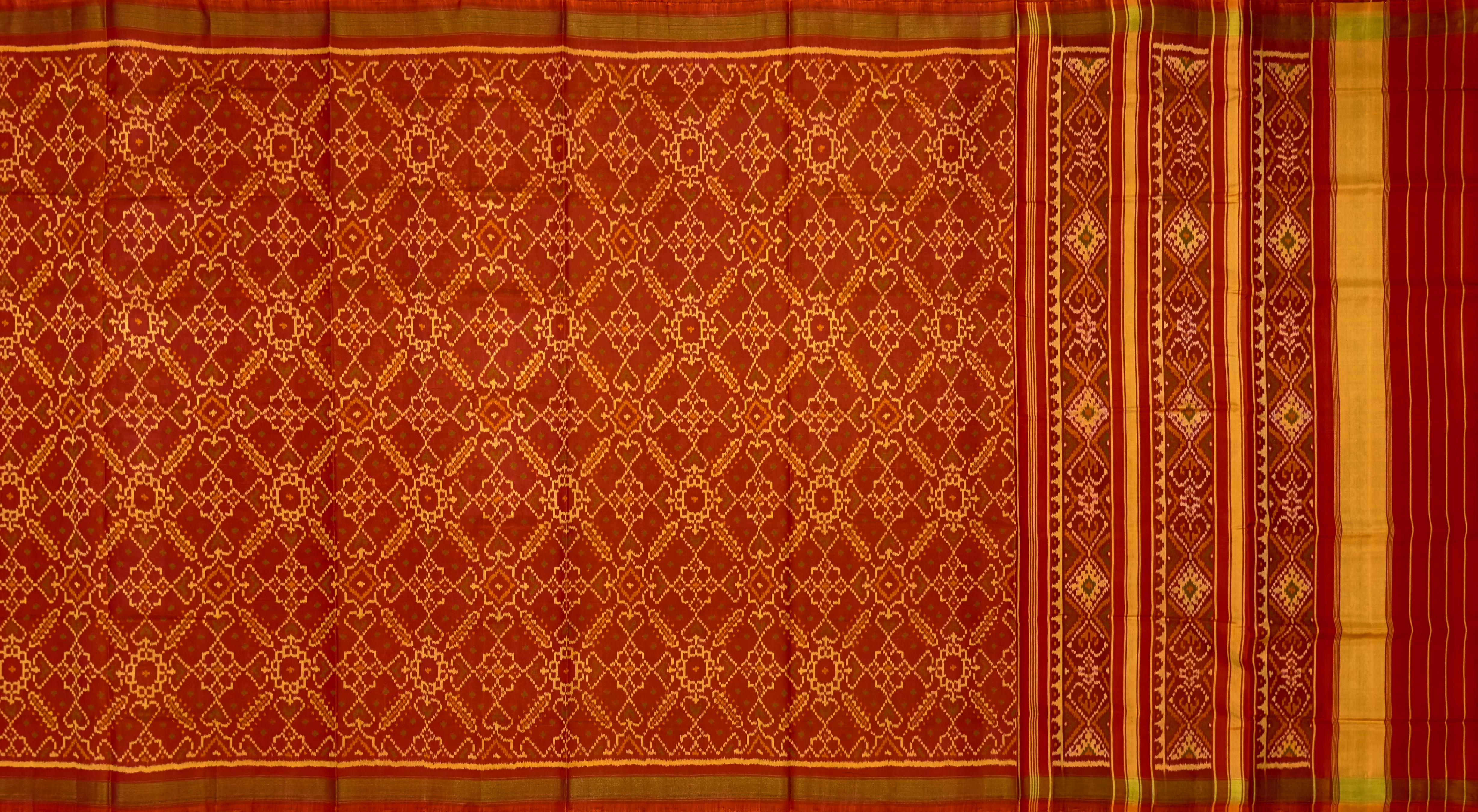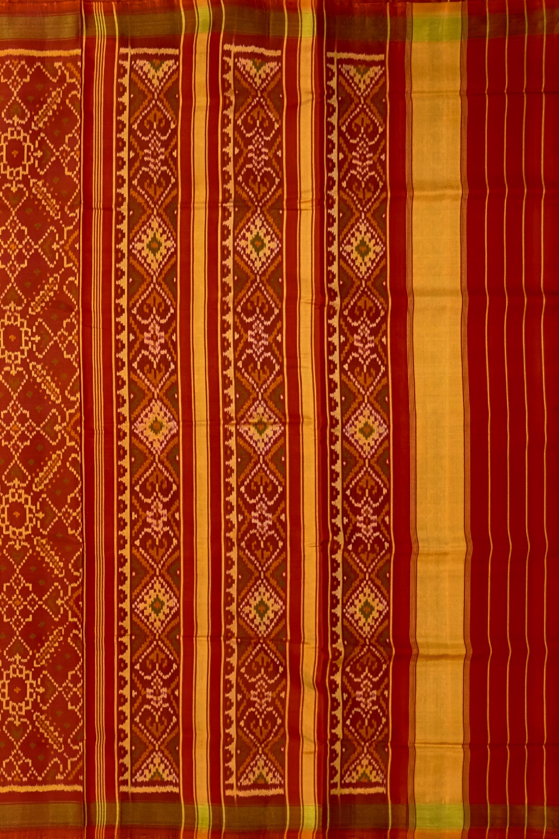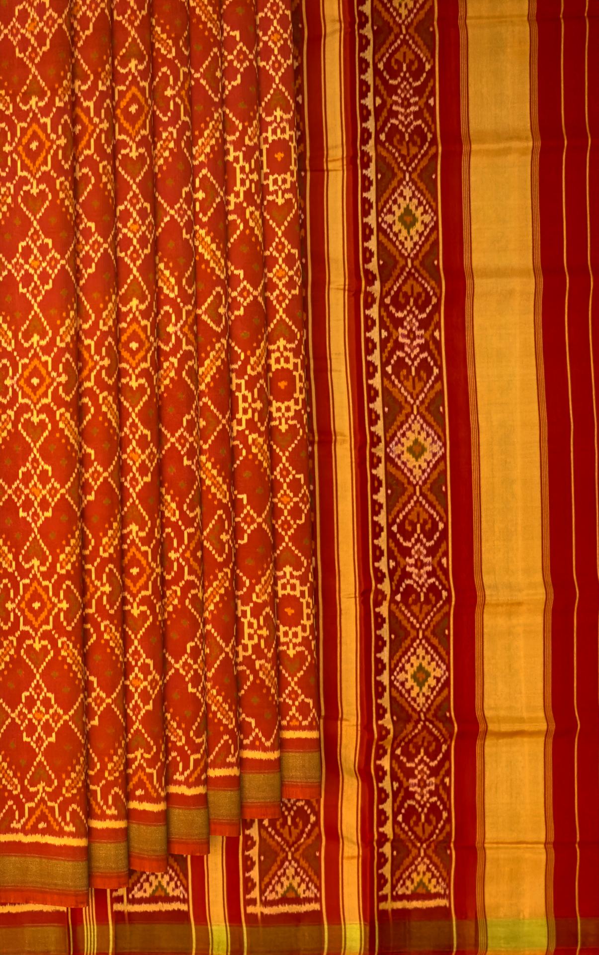 Experience the vibrant beauty of the Orange Red Manekchowk Patola Saree, a stunning representation of traditional Indian craftsmanship. Utilizing the single ikat technique, this saree features the intricate Manekchowk design, known for its detailed and elaborate patterns. The unique orange-red two-tone effect provides a striking backdrop for the motifs that extend from the body to the pallu. The semi-lustrous finish adds a touch of sophistication, making it perfect for festive and cultural occasions. This saree is ideal for grand weddings, cultural festivities, and social gatherings. It embodies the rich heritage of Rajkot Patola, making each piece a unique narrative of tradition and pride. Adorn yourself with the Orange Red Manekchowk Patola Saree, a timeless addition to your wardrobe that celebrates your roots with grace and elegance.