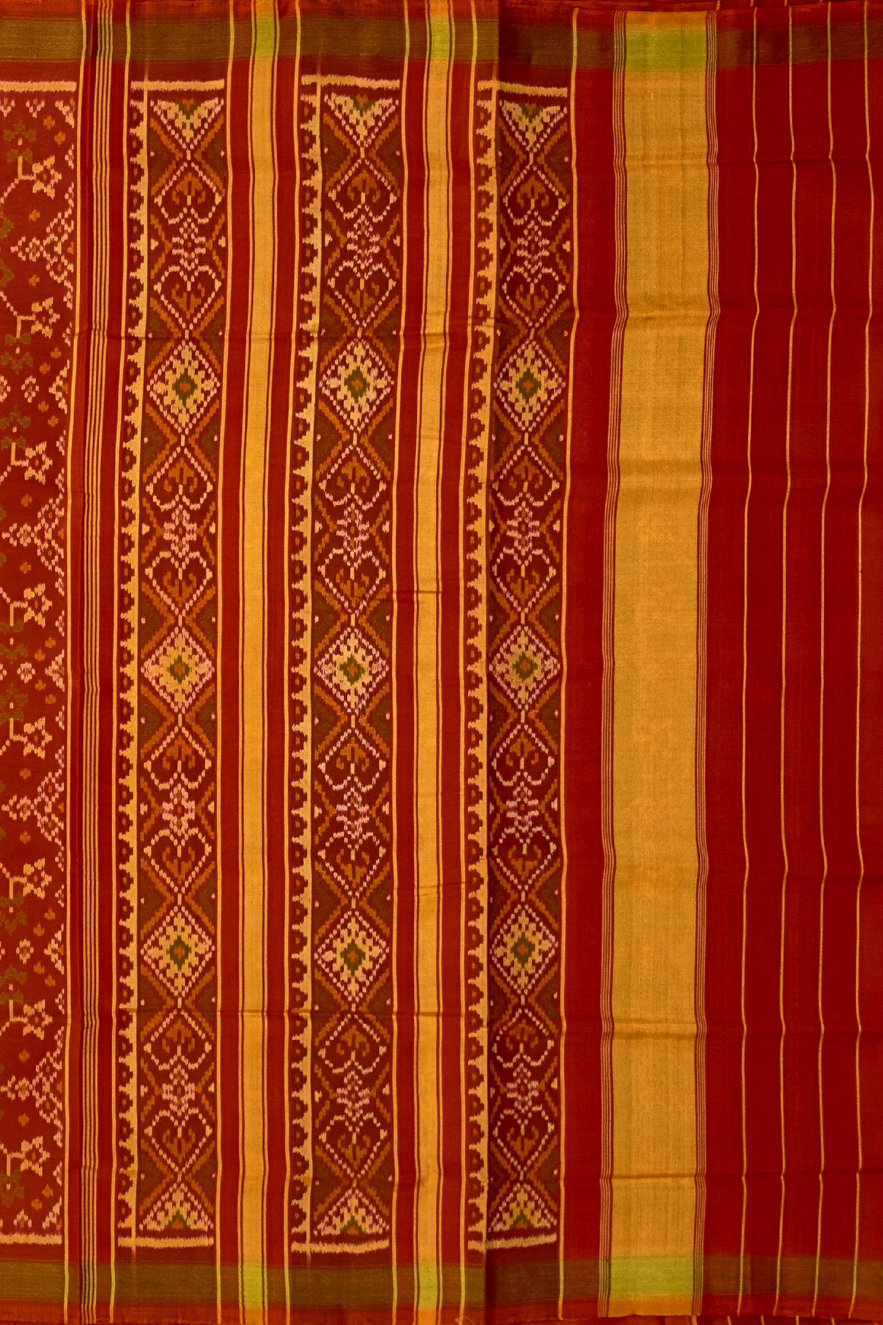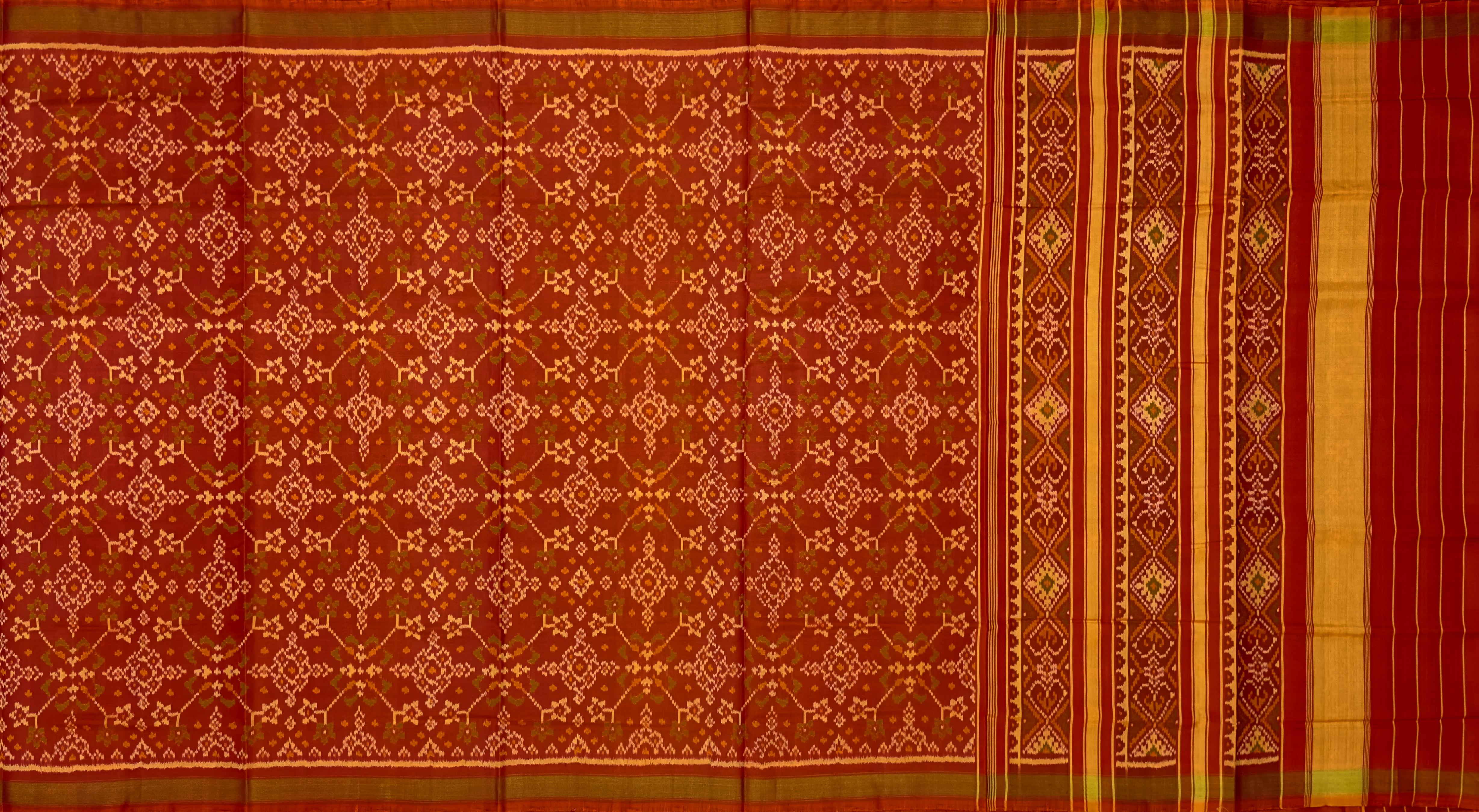 Embrace the vibrant elegance of the Orange Red Navratna Patola Saree, a stunning representation of traditional Indian craftsmanship. Utilizing the single ikat technique, this saree features the intricate Navratna design, known for its detailed and elaborate patterns. The unique orange-red two-tone effect provides a striking backdrop for the motifs that extend from the body to the pallu. The semi-lustrous finish adds a touch of sophistication, making it perfect for festive and cultural occasions. This saree is ideal for grand weddings, cultural festivities, and social gatherings. It embodies the rich heritage of Rajkot Patola, making each piece a unique narrative of tradition and pride. Adorn yourself with the Orange Red Navratna Patola Saree, a timeless addition to your wardrobe that celebrates your roots with grace and elegance.