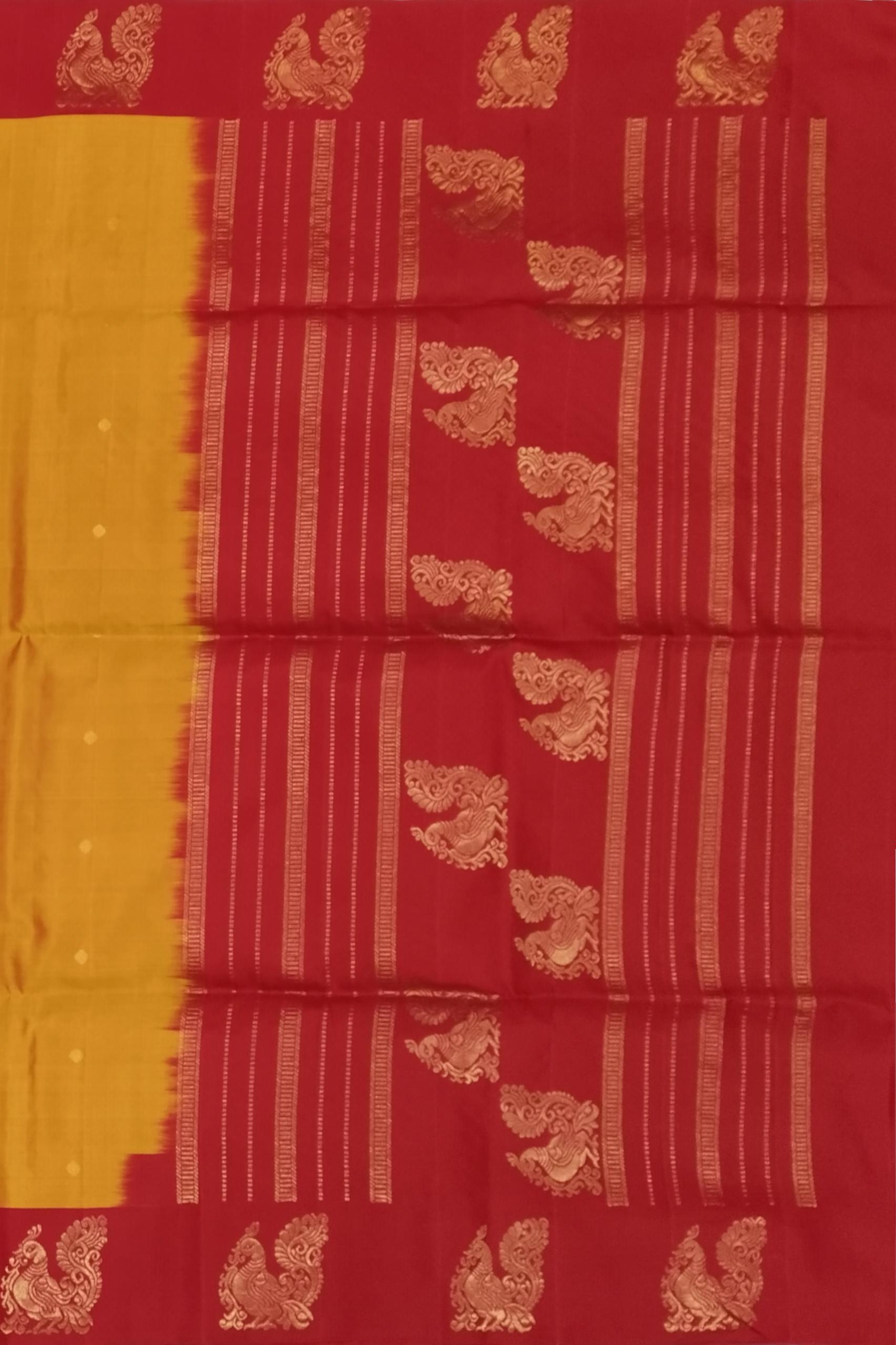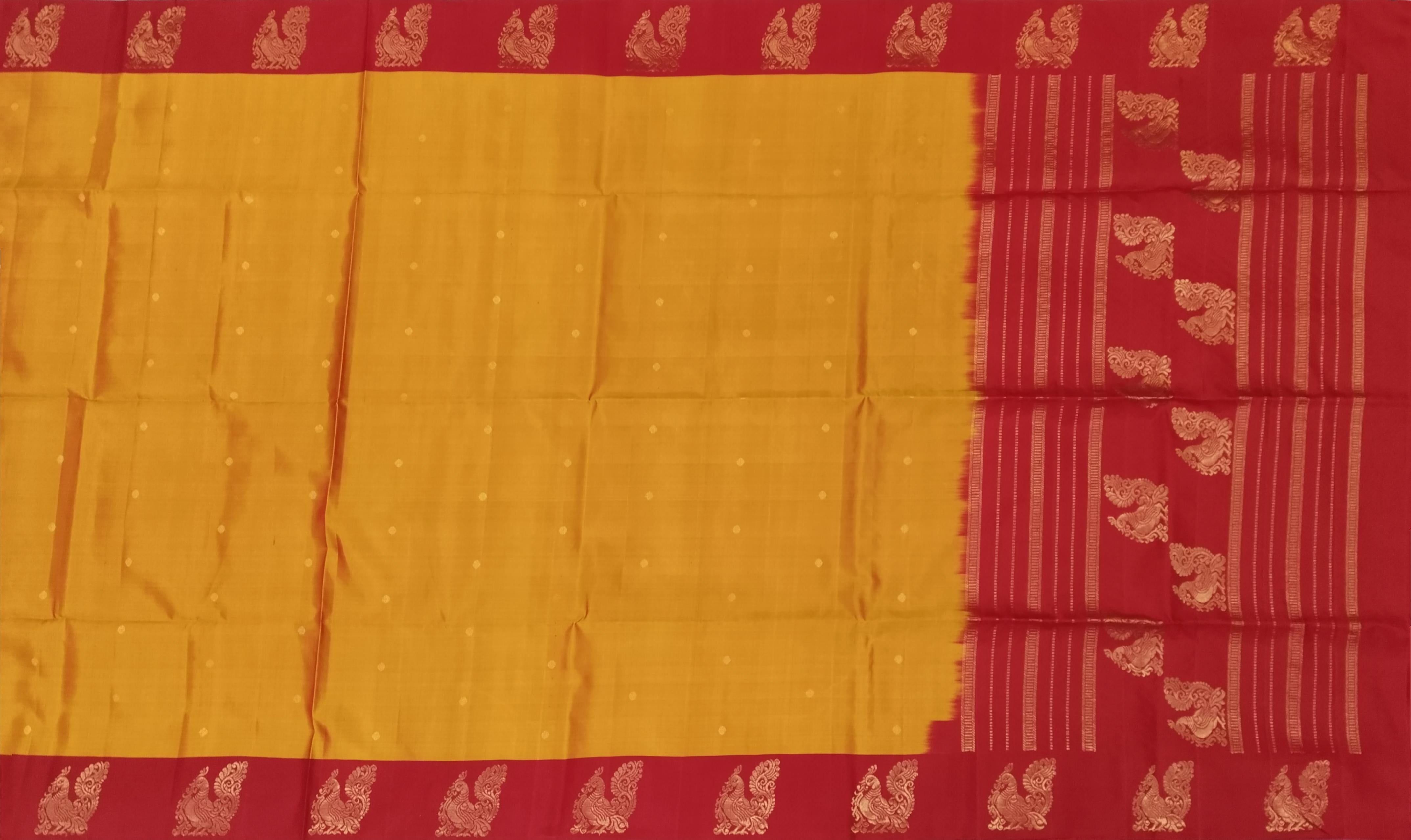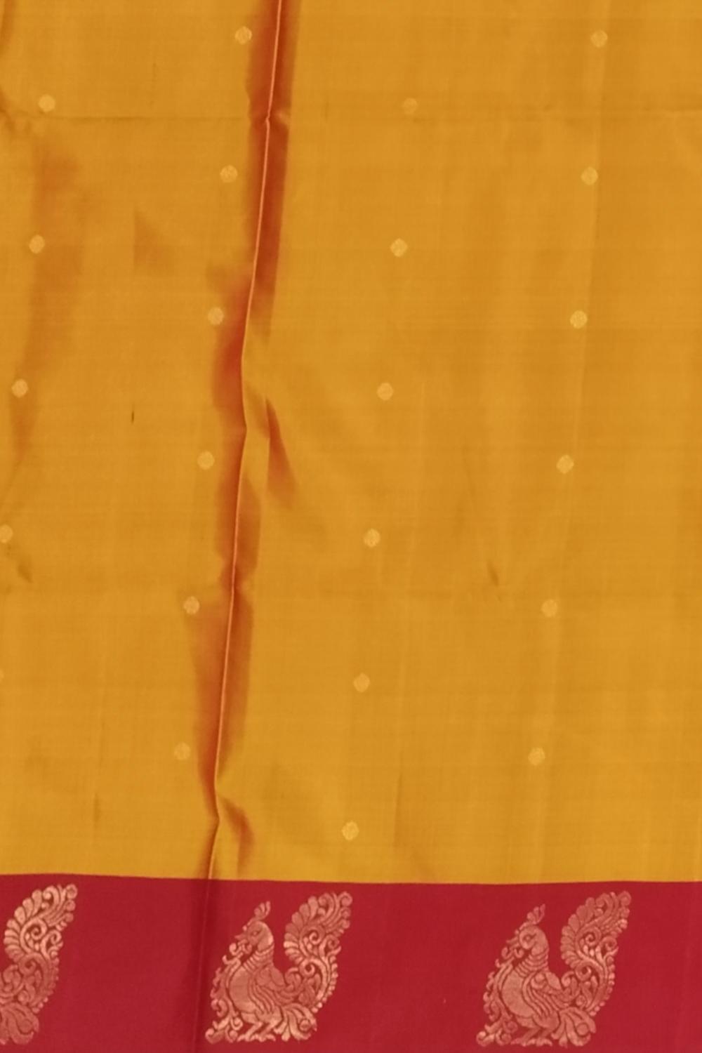 Adorn yourself in auspicious charm with this Orangish Yellow Kanchipuram Silk Saree, featuring a beautiful Annam border and delicate small bhuttas. The vibrant orangish-yellow body exudes warmth and festivity, while the graceful Annam (swan) motif, symbolizing purity and prosperity, is intricately woven into the border. Complementing this elegant border are the subtle small bhuttas spread across the body, adding layers of traditional artistry and cultural significance.
