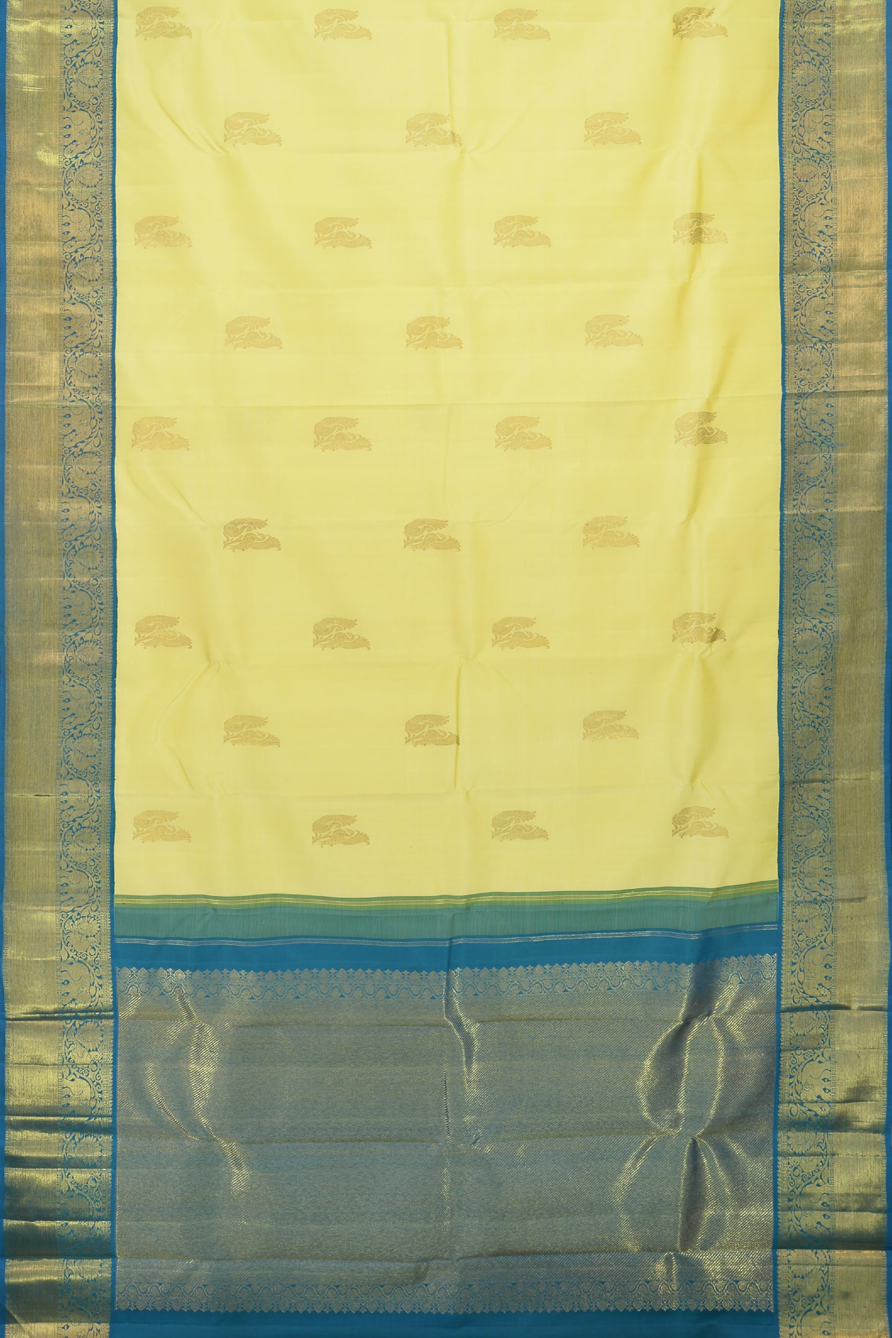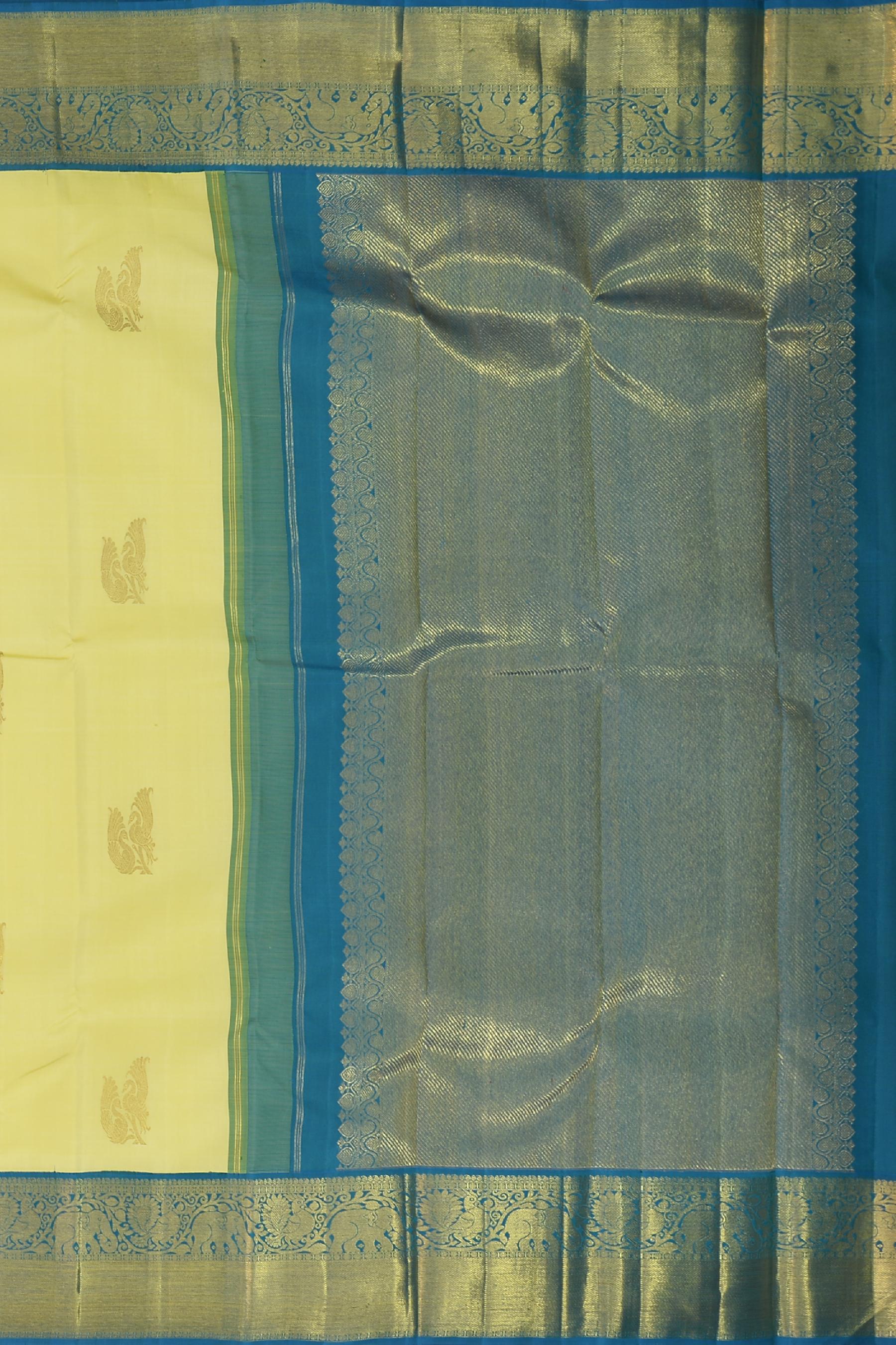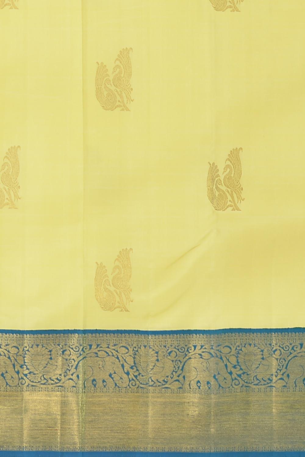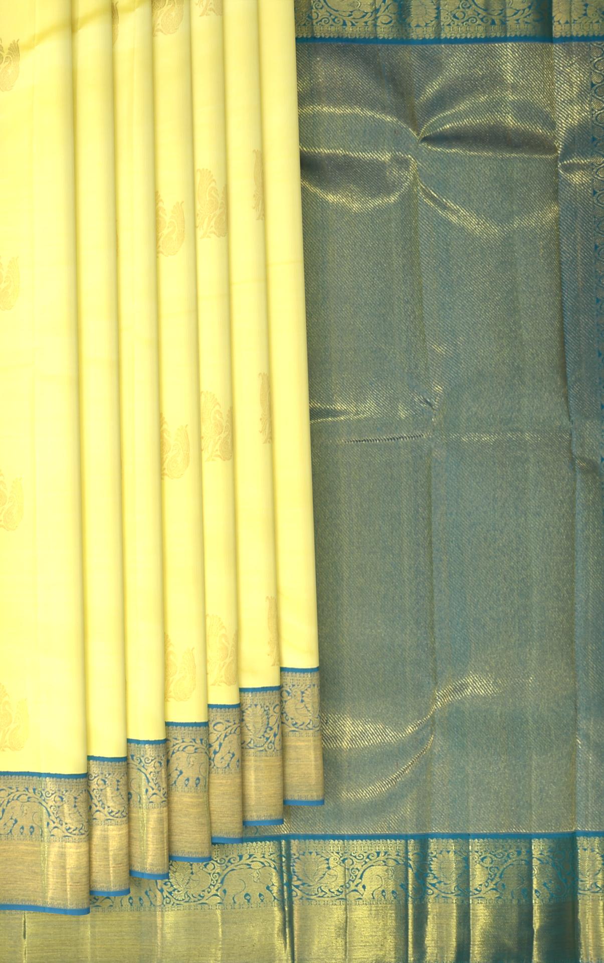 Wrap yourself in the soft embrace of this pale yellow Kancheevaram silk saree, a garment that speaks to the heart of traditional elegance with a whisper of spring. The saree is adorned with large peacock buttas, each meticulously crafted to stand out against the delicate yellow, symbolizing beauty, grace, and the vibrancy of life. The contrast blue border is enriched with Bavanshi motifs featuring elephants and peacocks, a celebration of India’s rich fauna and the historical significance they hold in Indian culture.
