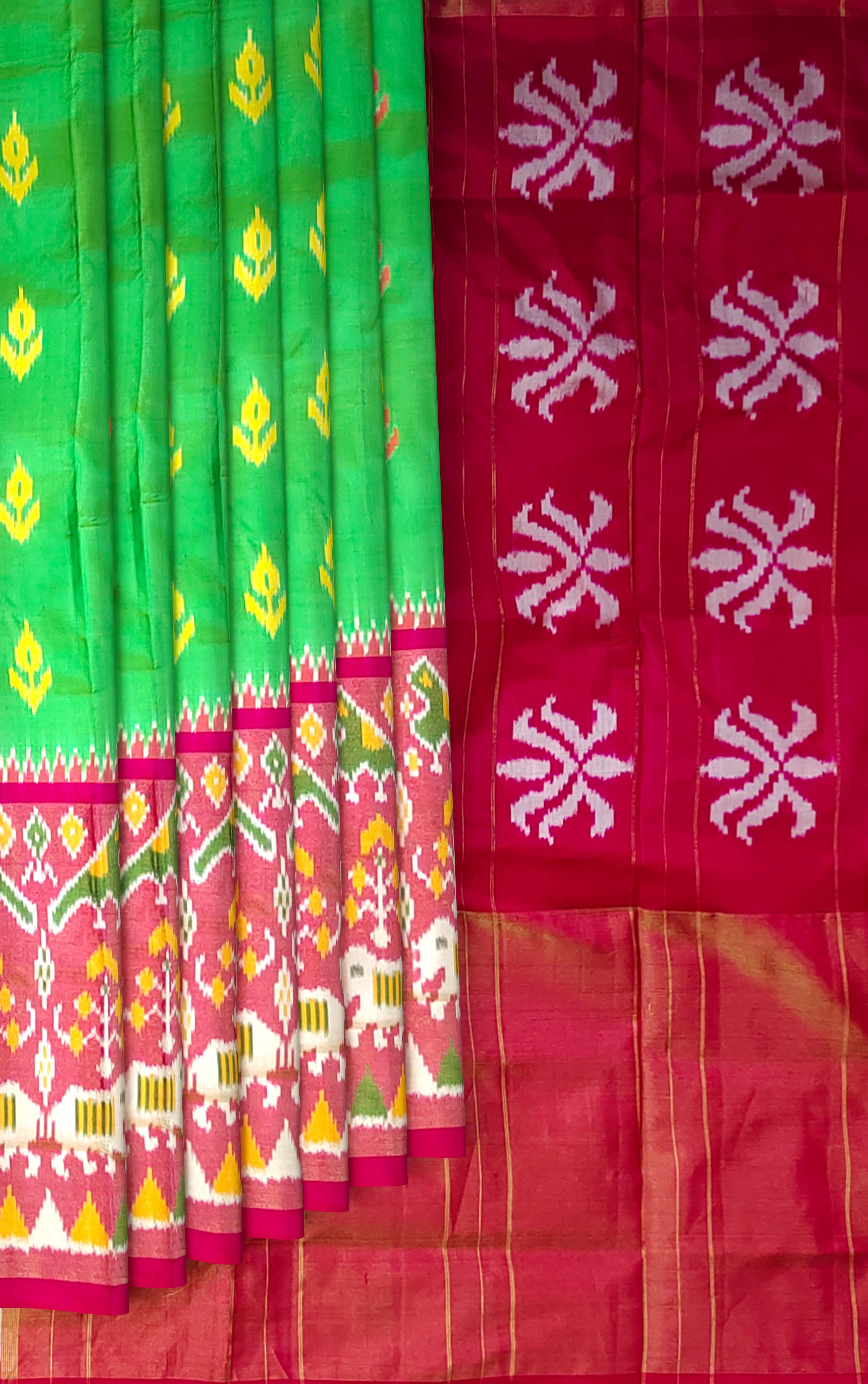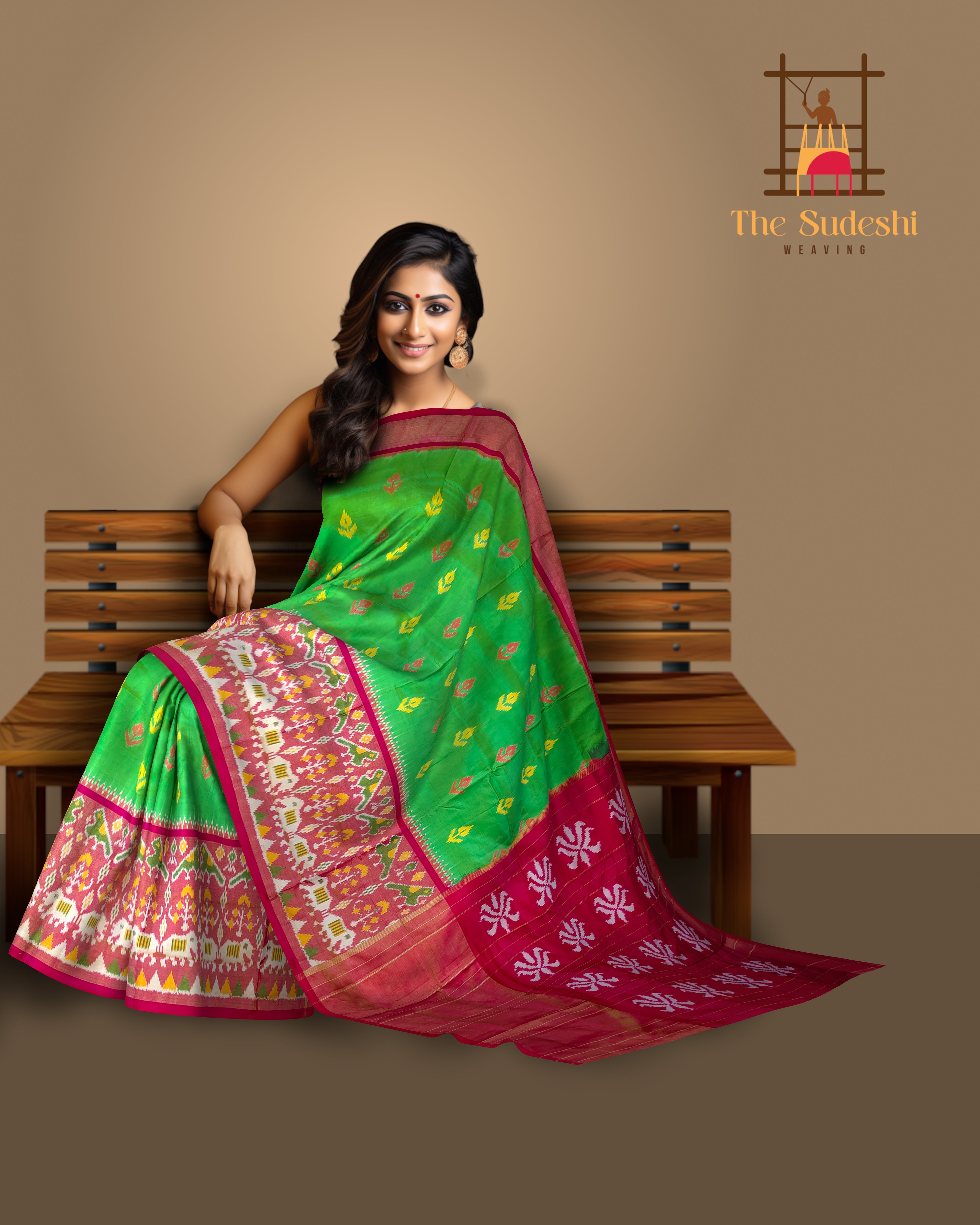 Add a splash of color to your wardrobe with our Parrot Green and Pink Tissue Pochampally Saree. The vibrant parrot green body is beautifully contrasted by a pink pallu and blouse, creating a lively and eye-catching look. Ideal for festivals and social events, this saree features a tissue body design, adding a unique and traditional touch to your ensemble.