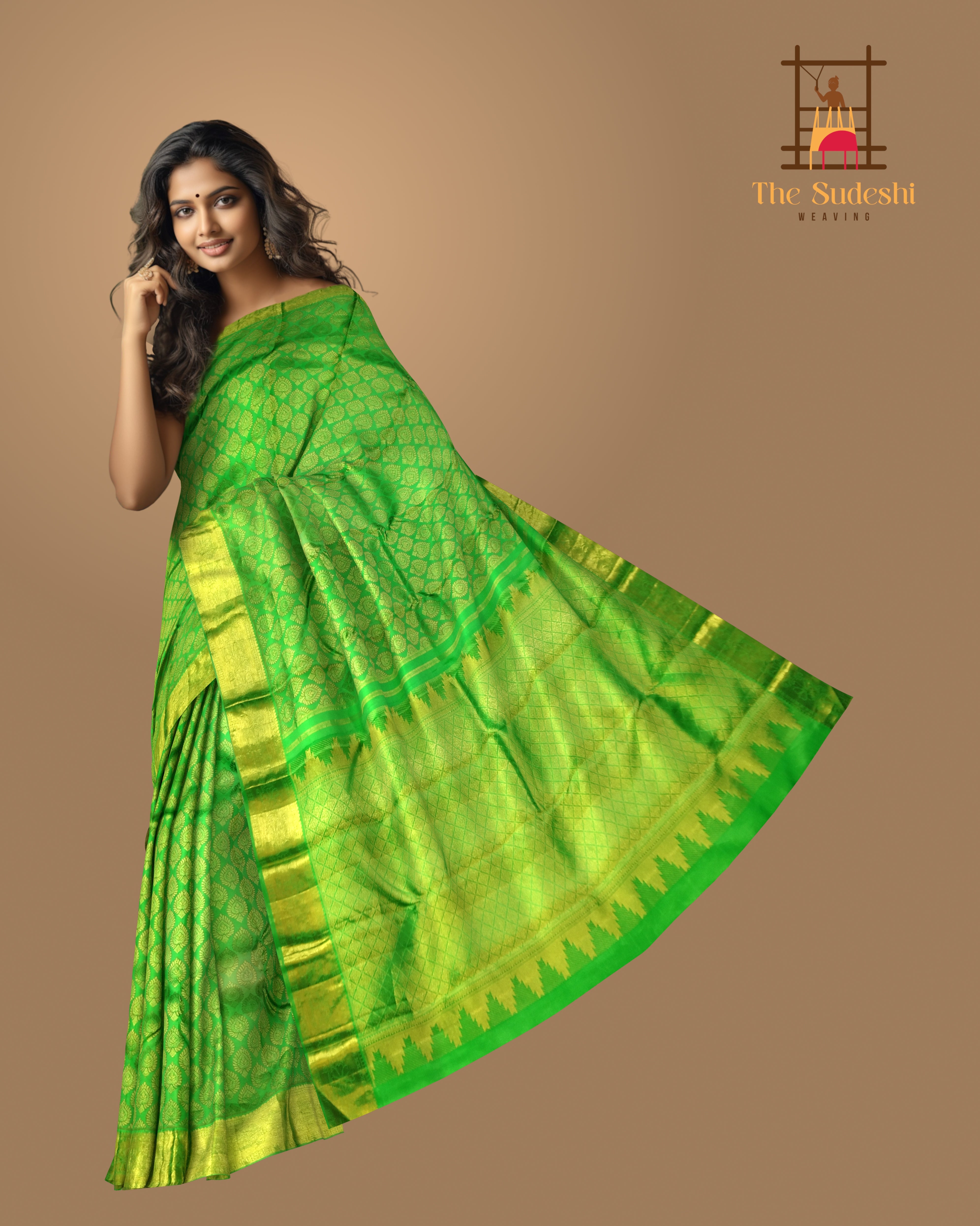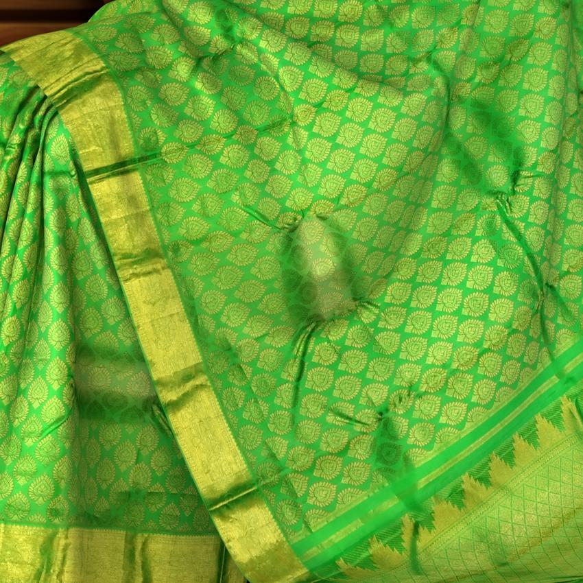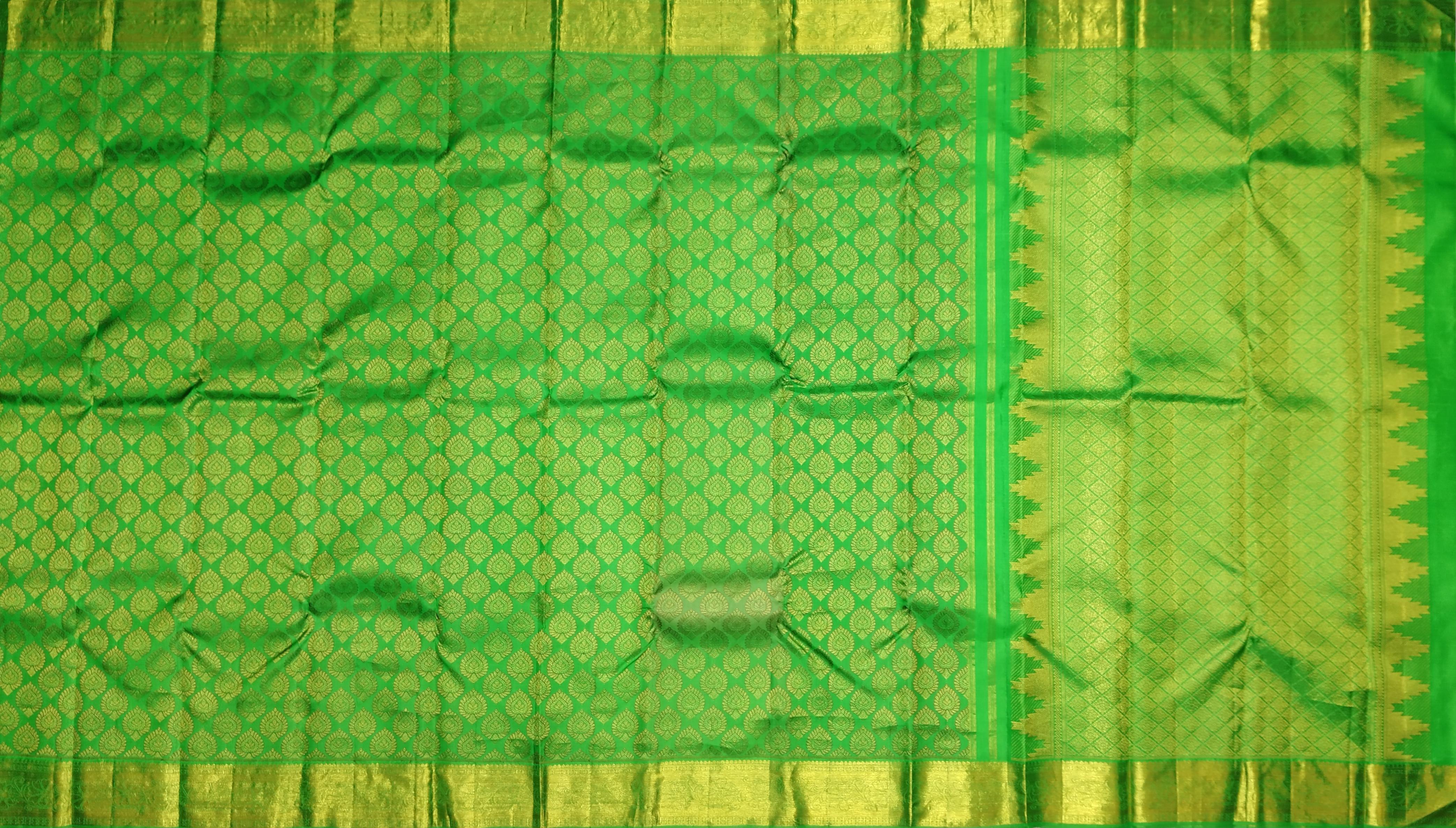 This parrot green Kanchipuram silk saree dazzles with tear-shaped jaquard motifs across the body, creating a vibrant and lively design. The color itself is fresh and festive, ideal for joyous occasions.