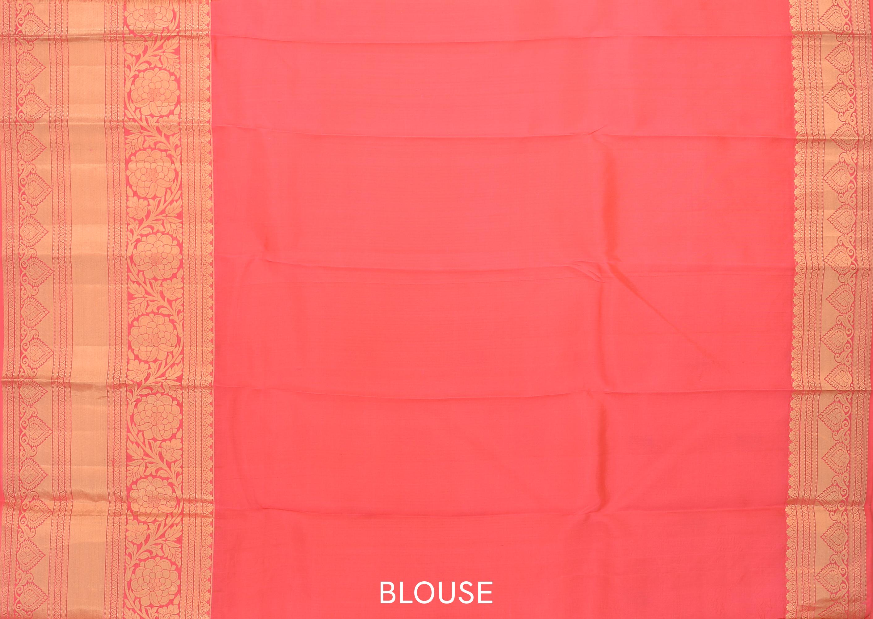 The Pink pallu is a tribute to the weaver’s prowess, meticulously presenting an intricately designed floral pattern. It drapes like a cascade of petals, wrapping the wearer in the artistry of floral narratives woven in silk.