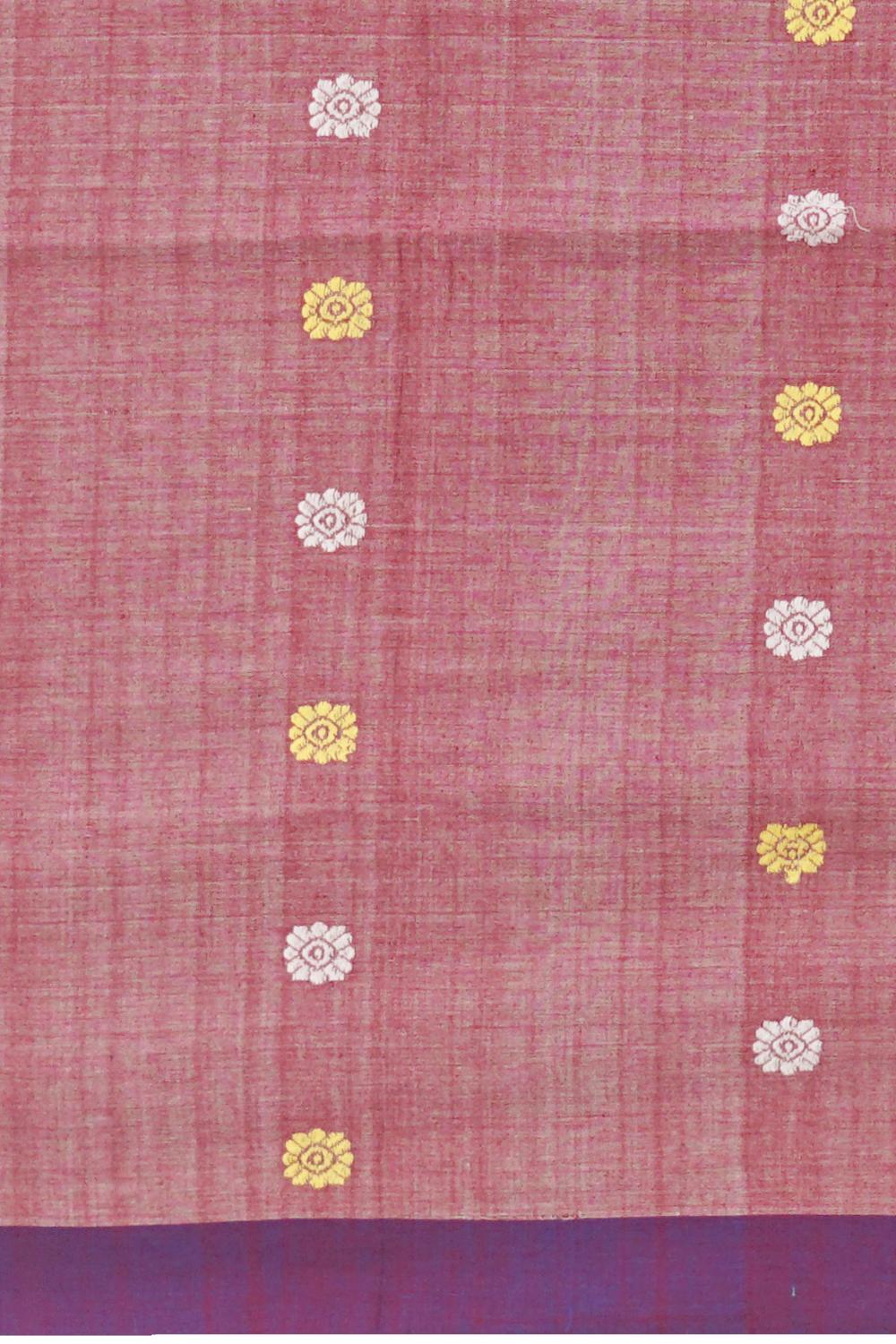 Embrace the elegance of our Peach Cotton Saree with a Purple Border and Intricate Buttis. This saree, woven from pure cotton, offers a soft and breathable drape that is perfect for any occasion. The delicate peach body adorned with intricate buttis creates a beautiful contrast with the vibrant purple border, making this saree both stylish and versatile.