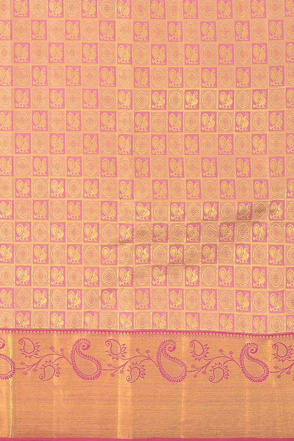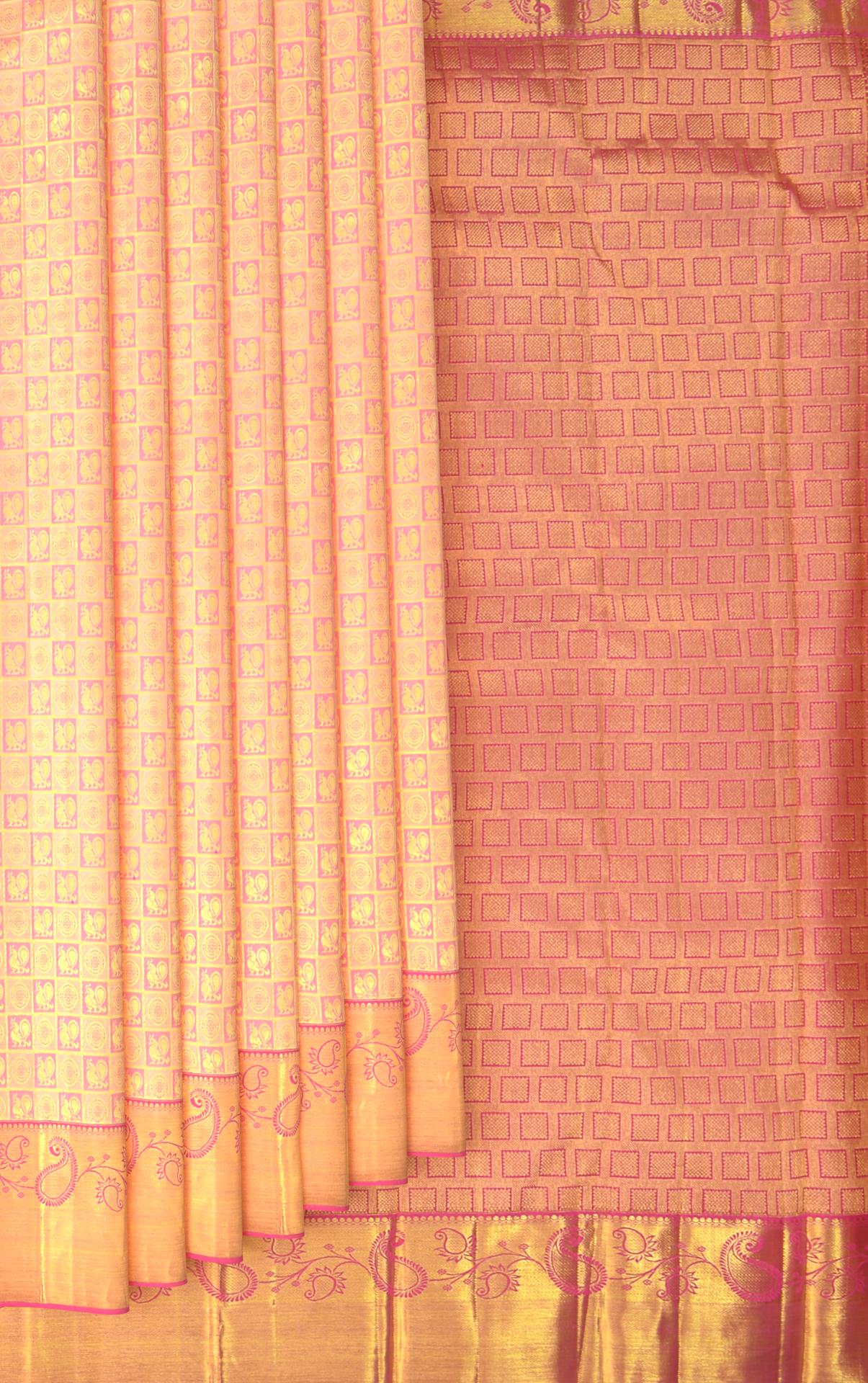 Discover the subtle allure of our Peach Kancheevaram silk saree. This elegant piece features a Jacquard weave with checks, chakram, and Rudraksham, representing the intricate balance of life’s cycles and spiritual enlightenment. The contrast Pink border, adorned with Bavanshi and mango motifs, adds a feminine charm to the saree's soft hue.