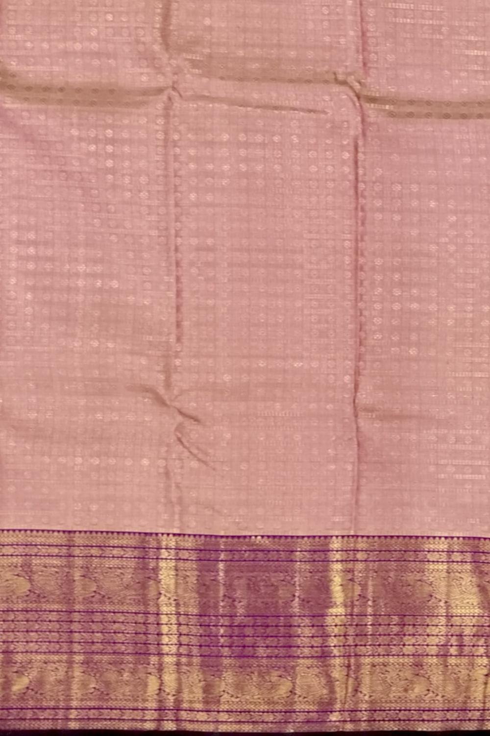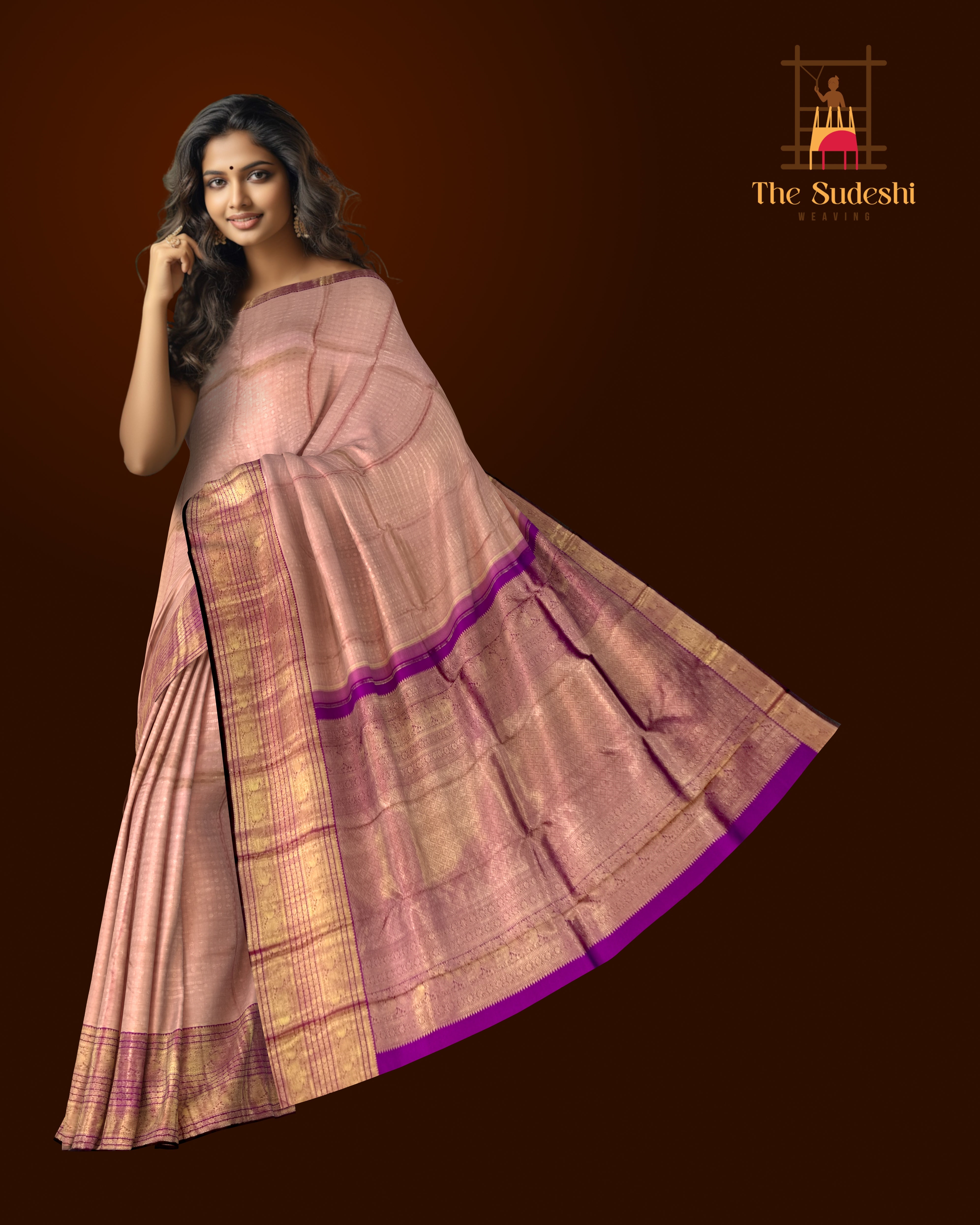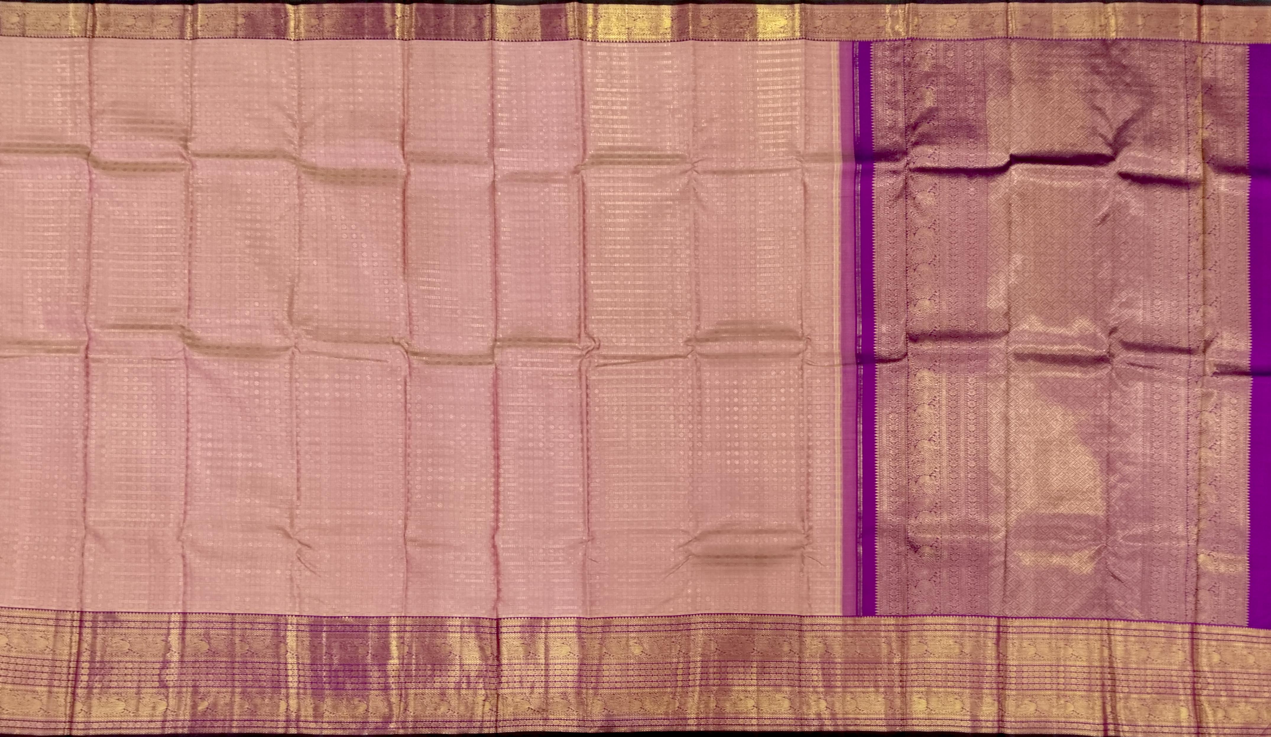 Step into refined elegance with this peach Kanchipuram silk saree, featuring a harmonious blend of checks and butta detailing. The intricately woven checks pattern adds depth and texture, while the butta motifs enhance the traditional appeal. The rich purple pallu and blouse provide a striking contrast, ensuring that this saree makes a statement wherever you go.