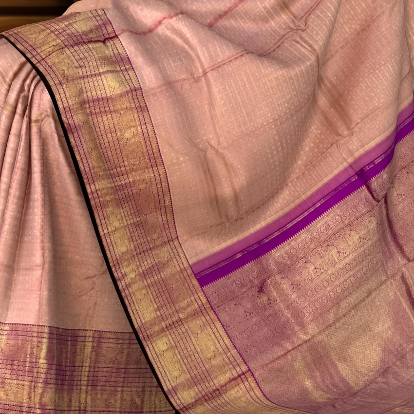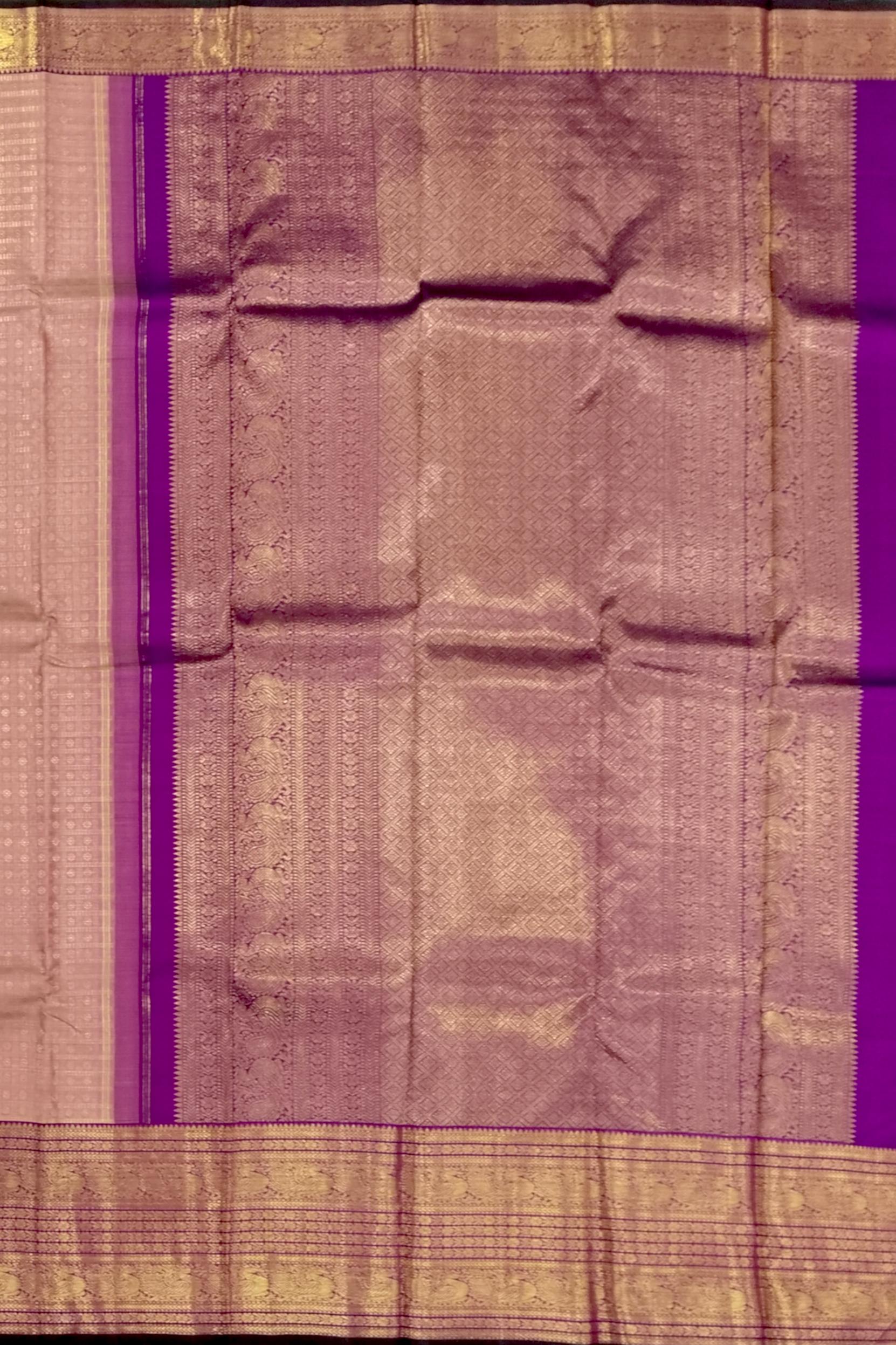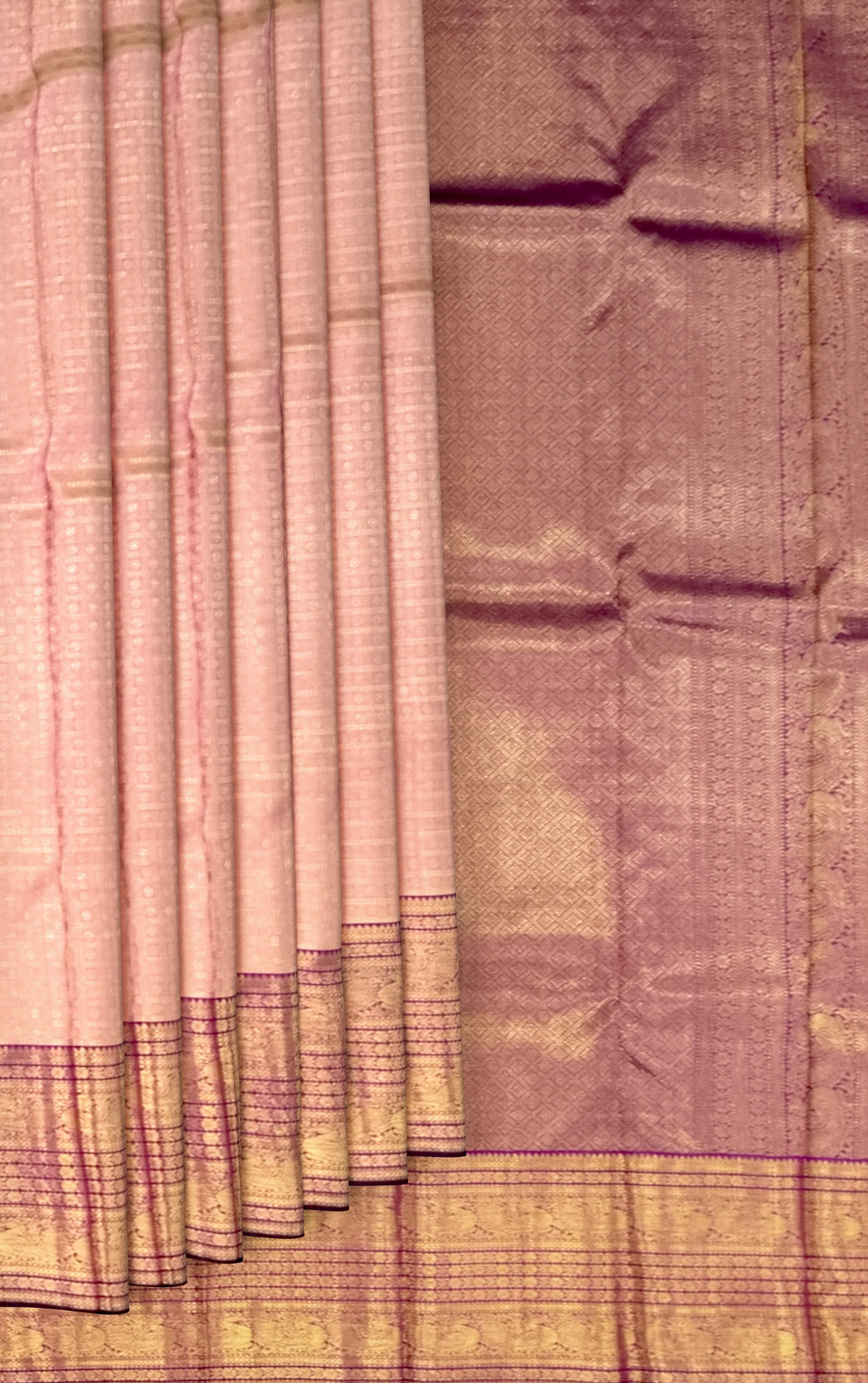 Step into refined elegance with this peach Kanchipuram silk saree, featuring a harmonious blend of checks and butta detailing. The intricately woven checks pattern adds depth and texture, while the butta motifs enhance the traditional appeal. The rich purple pallu and blouse provide a striking contrast, ensuring that this saree makes a statement wherever you go.